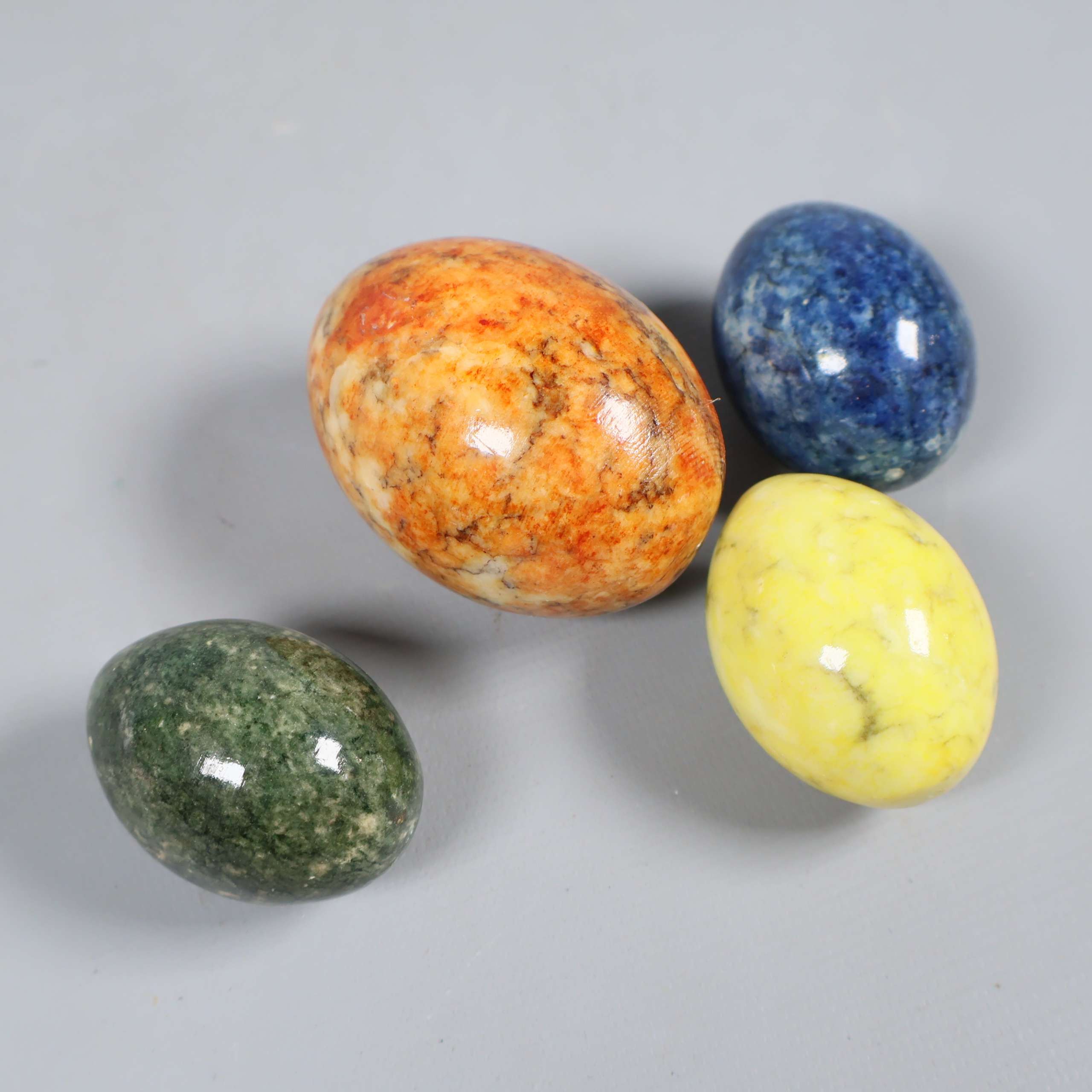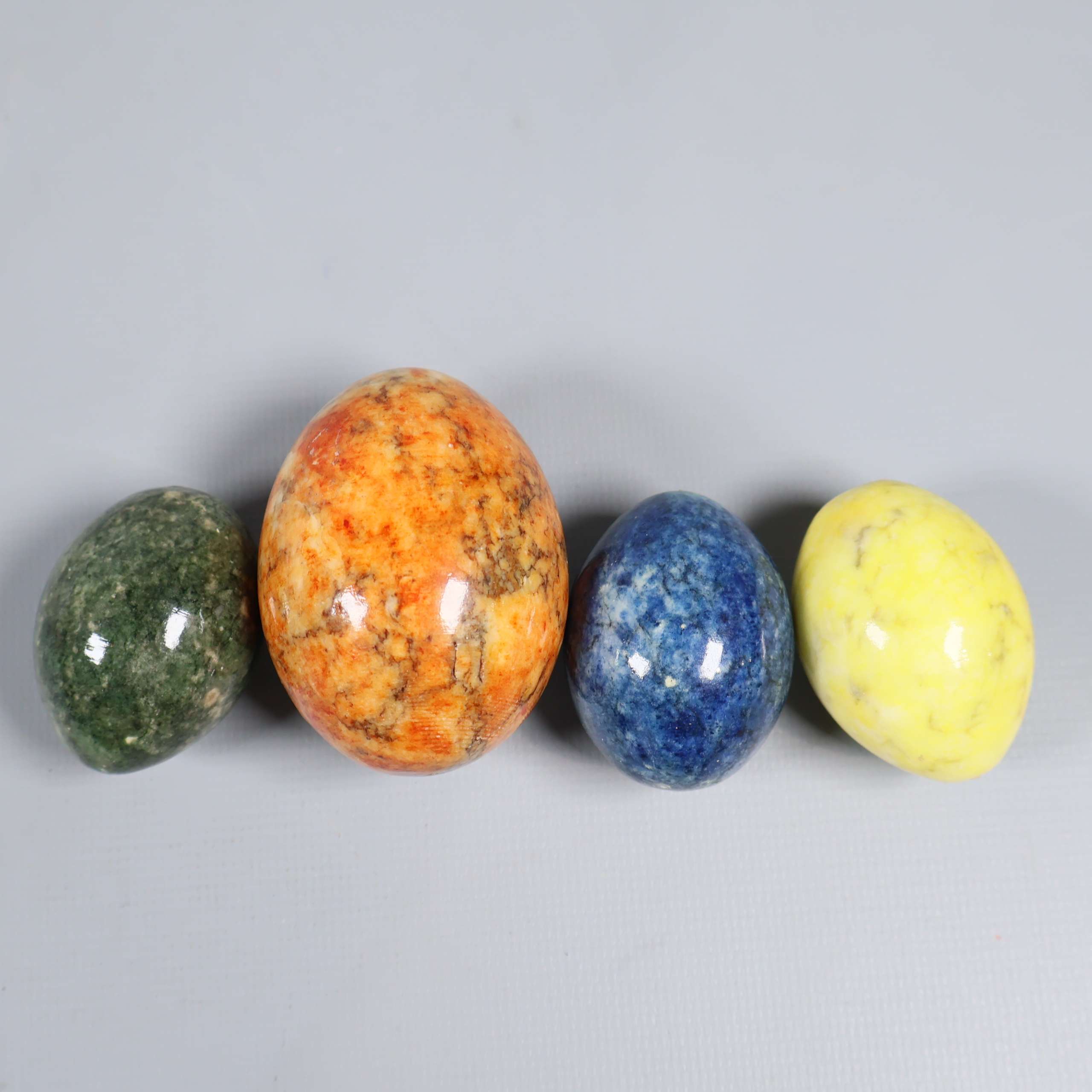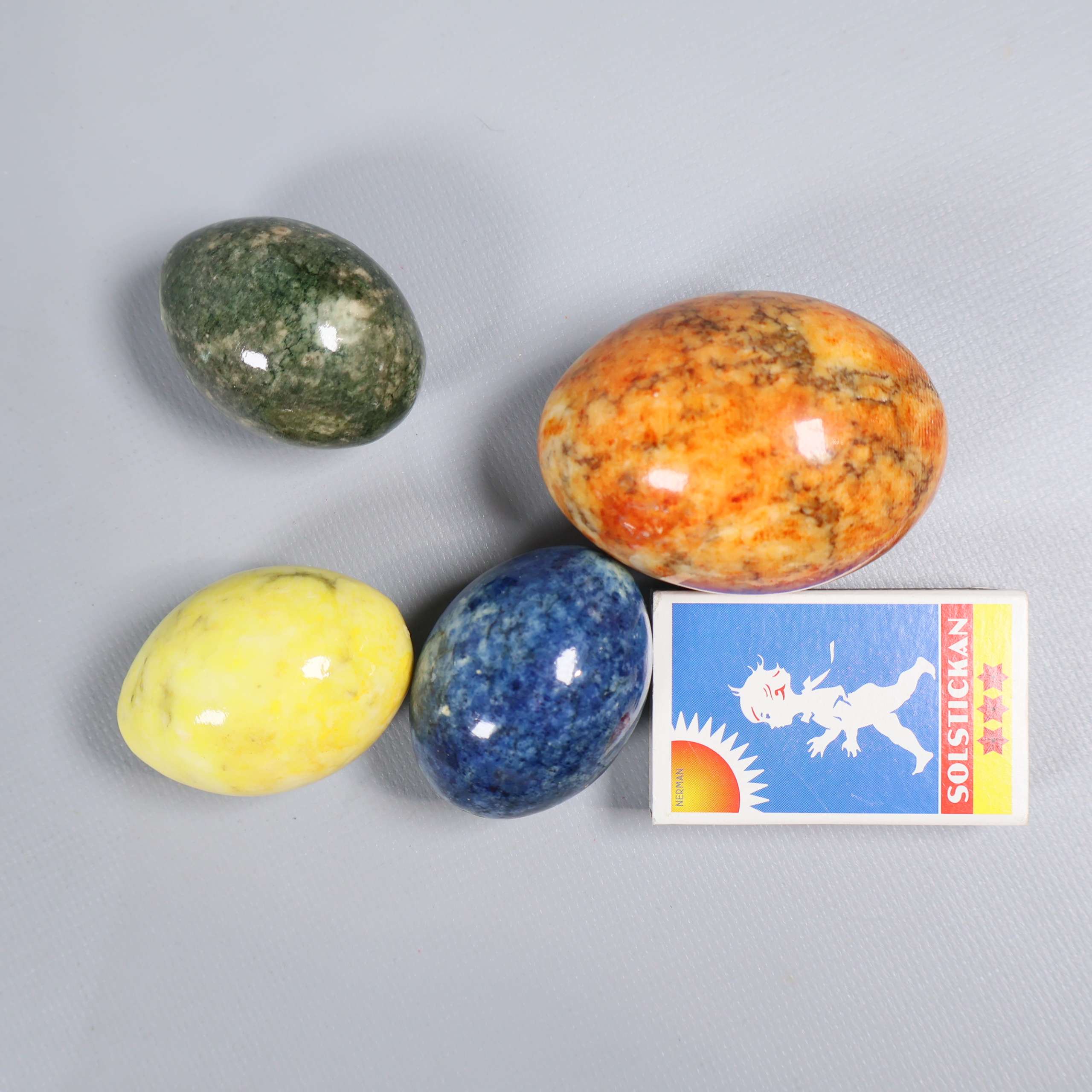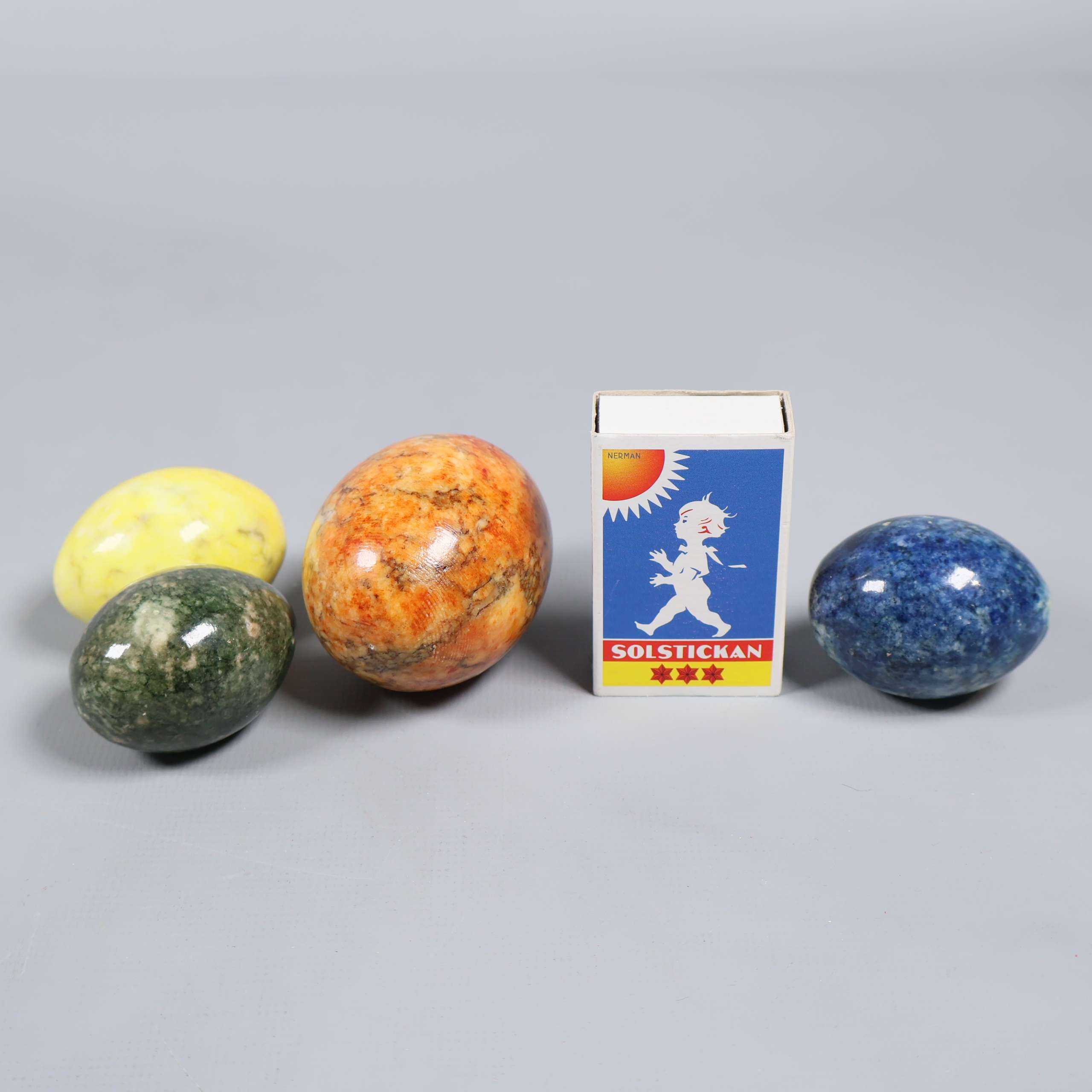 Fyra dekorägg i blankpolerad sten i olika färger med en naturlig, organisk känsla. Varje ägg har unik marmorering och yta, vilket ger en personlig touch och passar perfekt för att dekorera hemmet, hyllan eller skapa färgglada stilleben med en kreativ vibe.