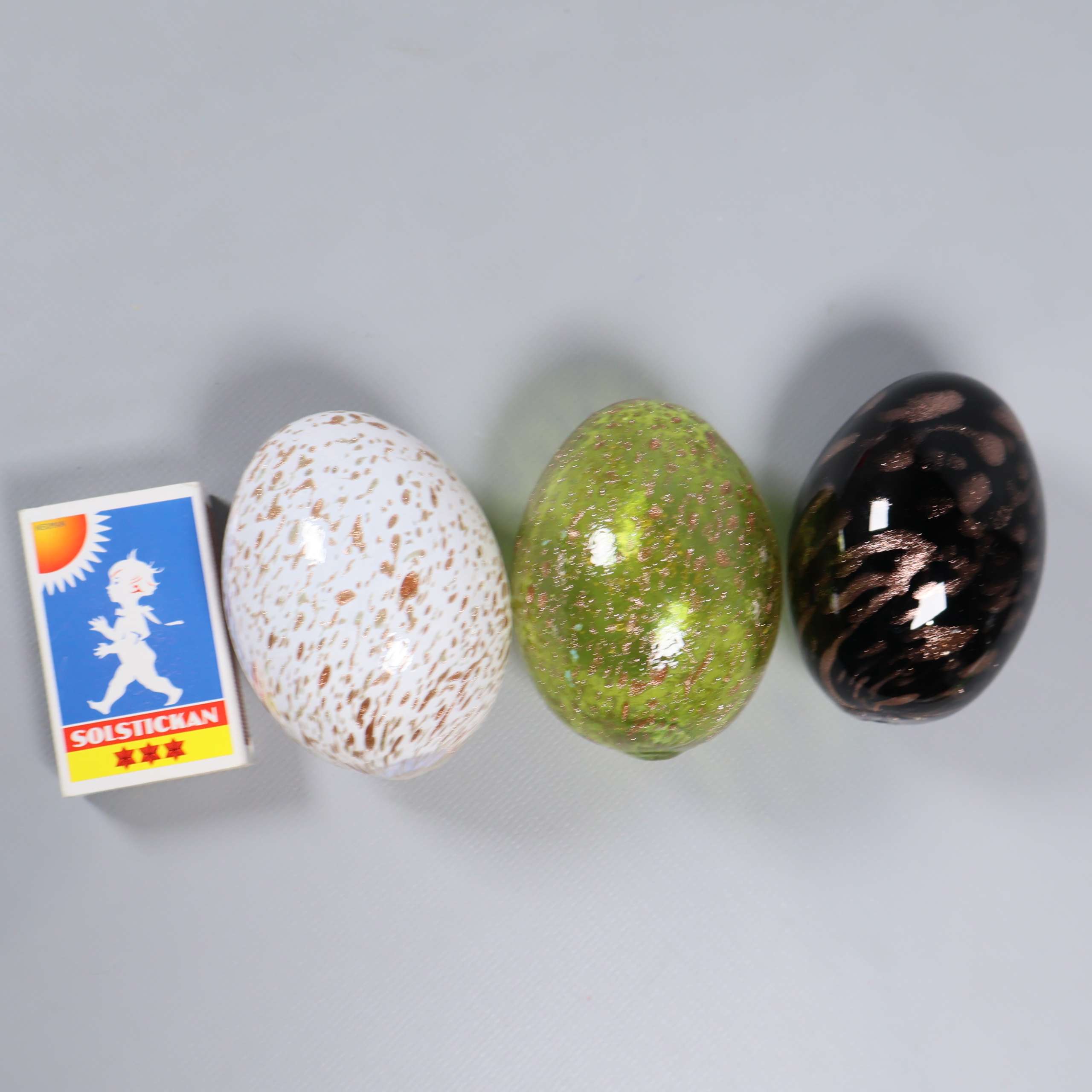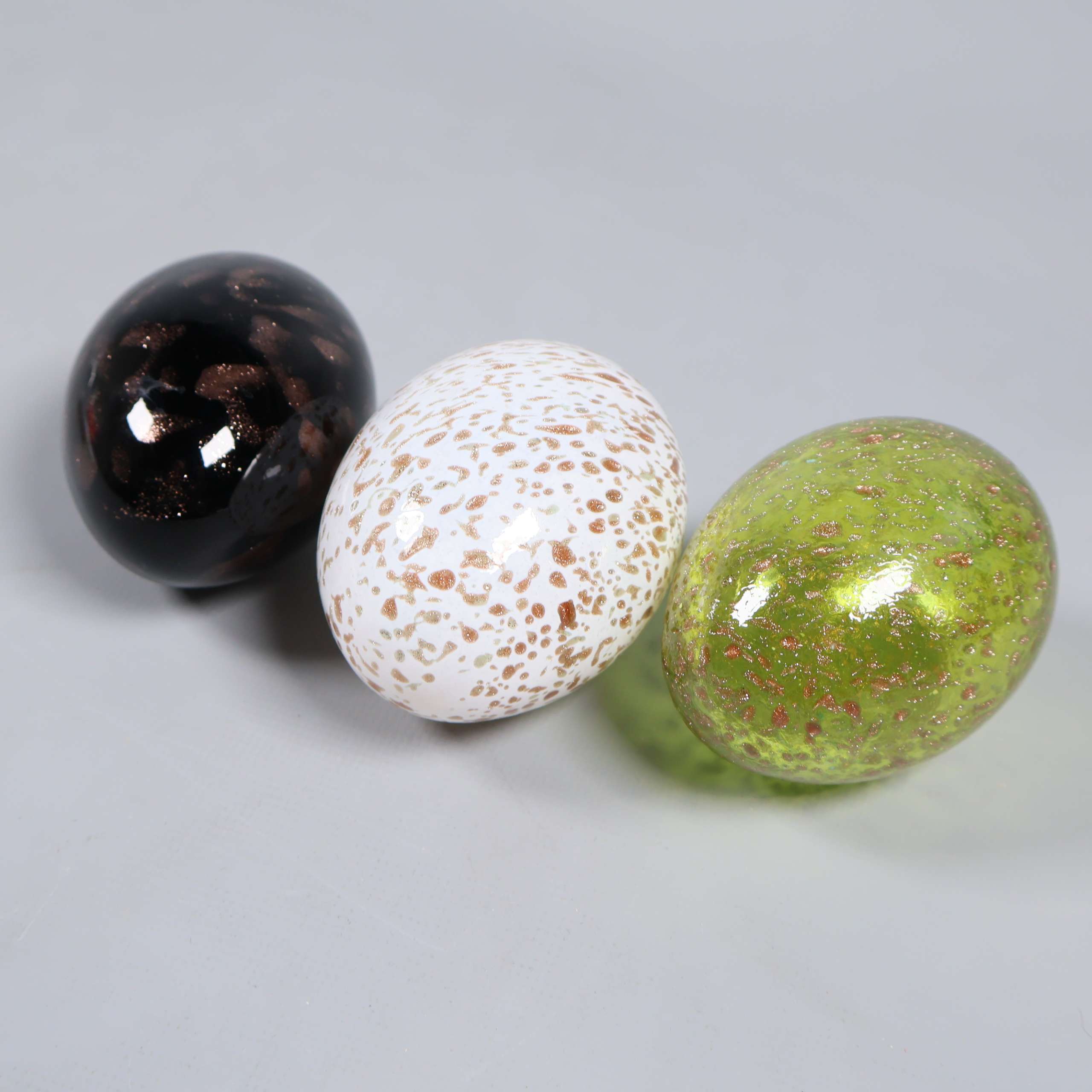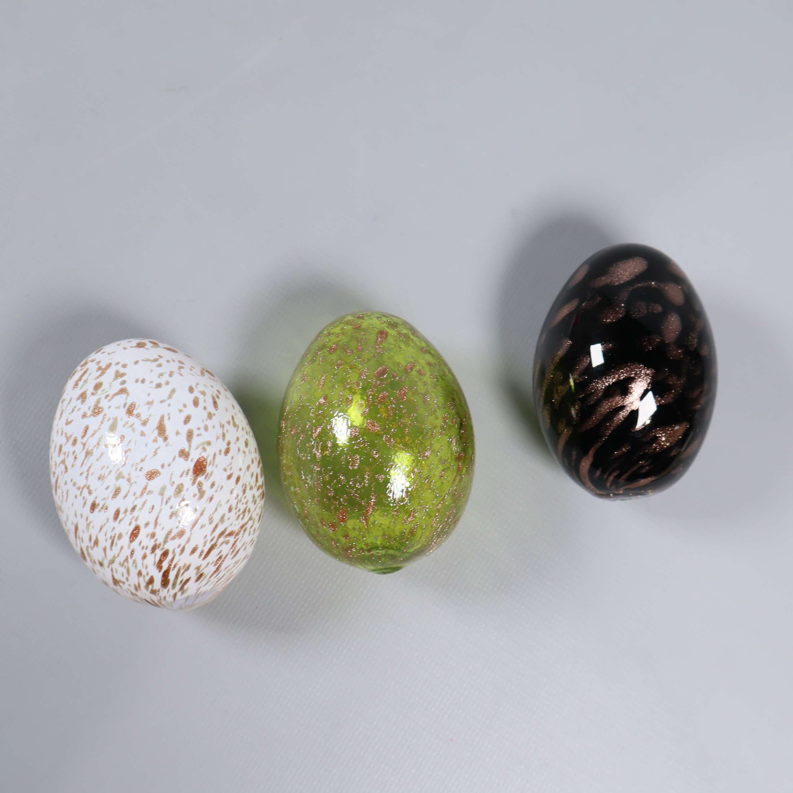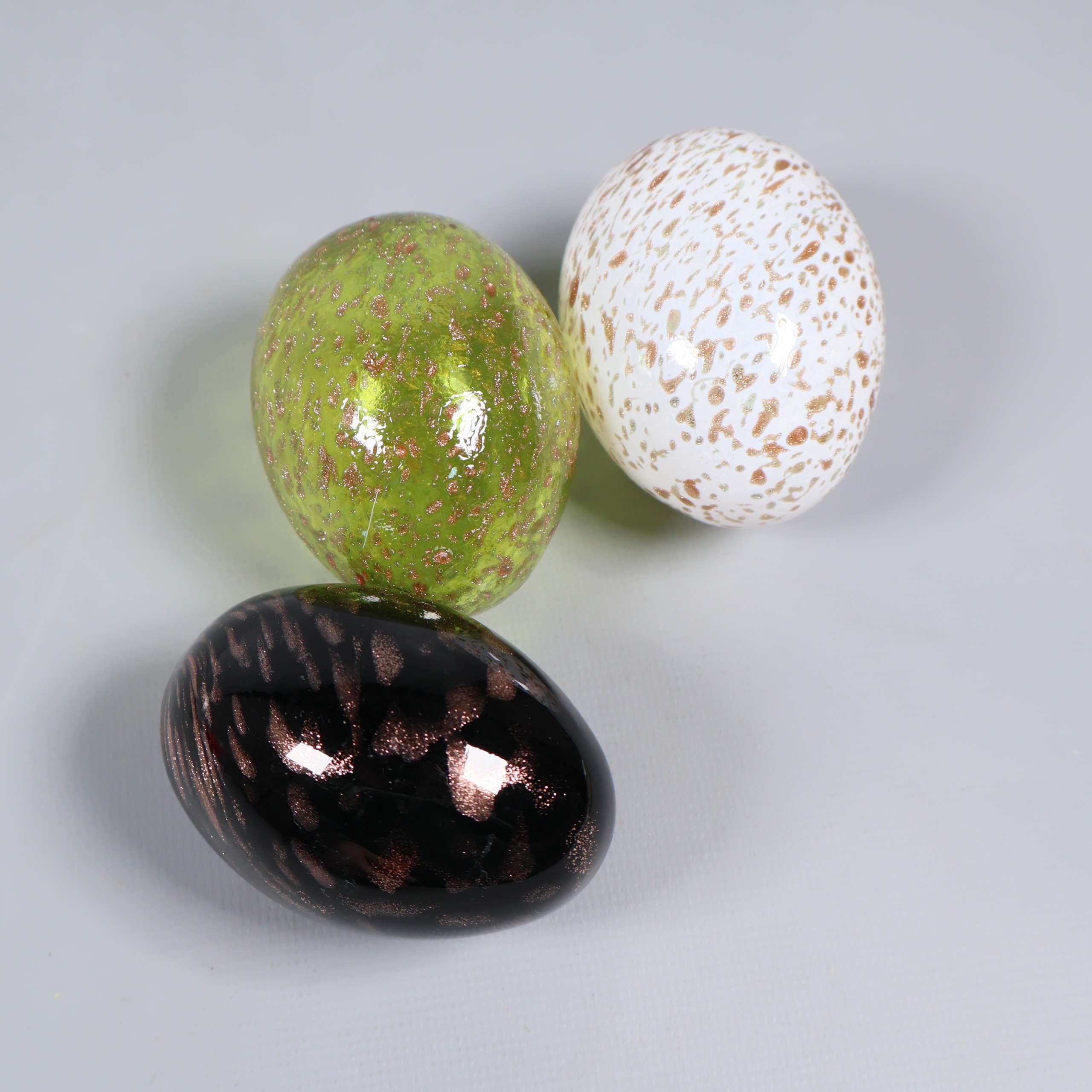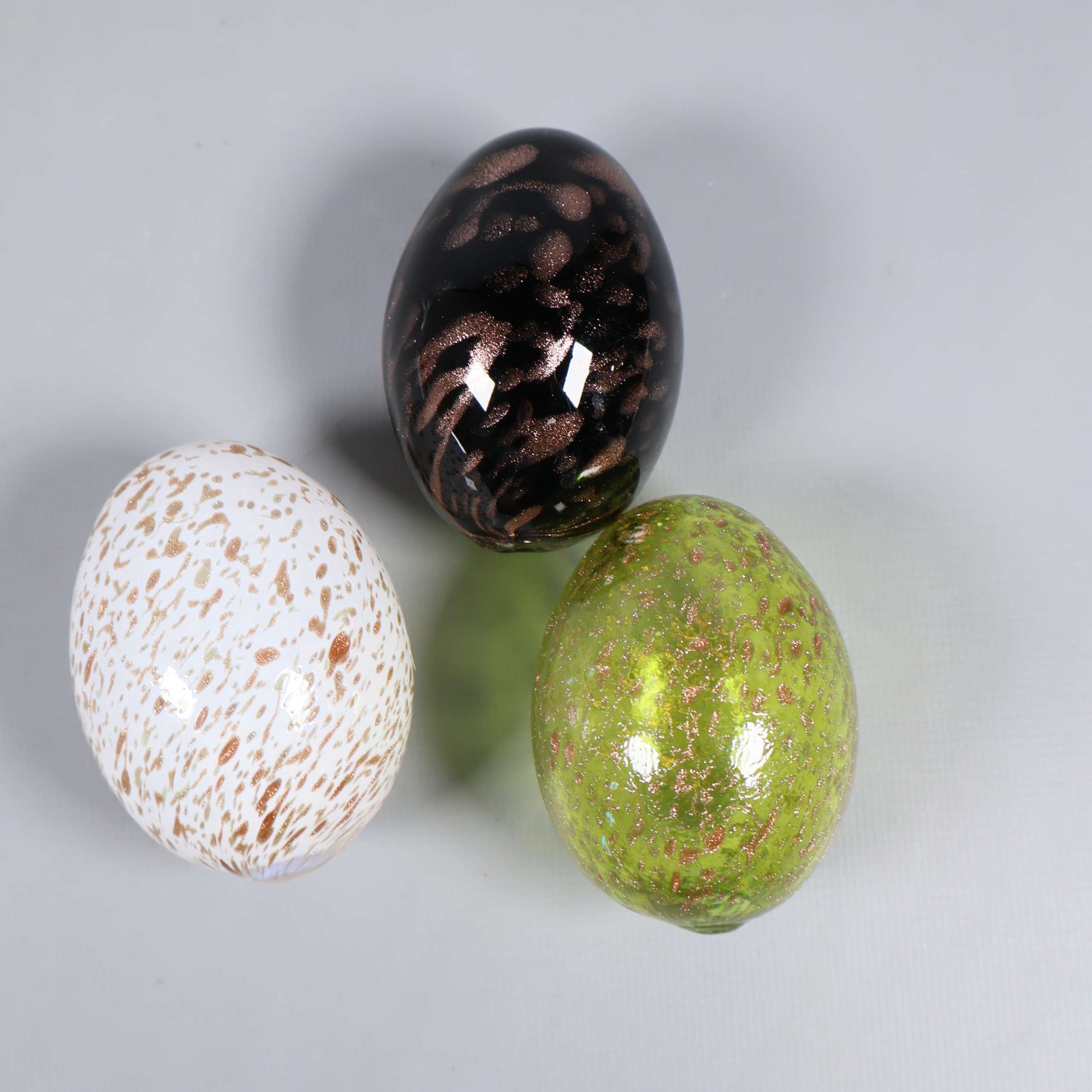Tre glasägg i olika färger och mönster som ger en lekfull touch till ditt hem. Ytan är blank och färgskalan går i grönt, vitt och mörkt med inslag av prickar. Passar perfekt för dig som gillar unik och modern dekoration.
