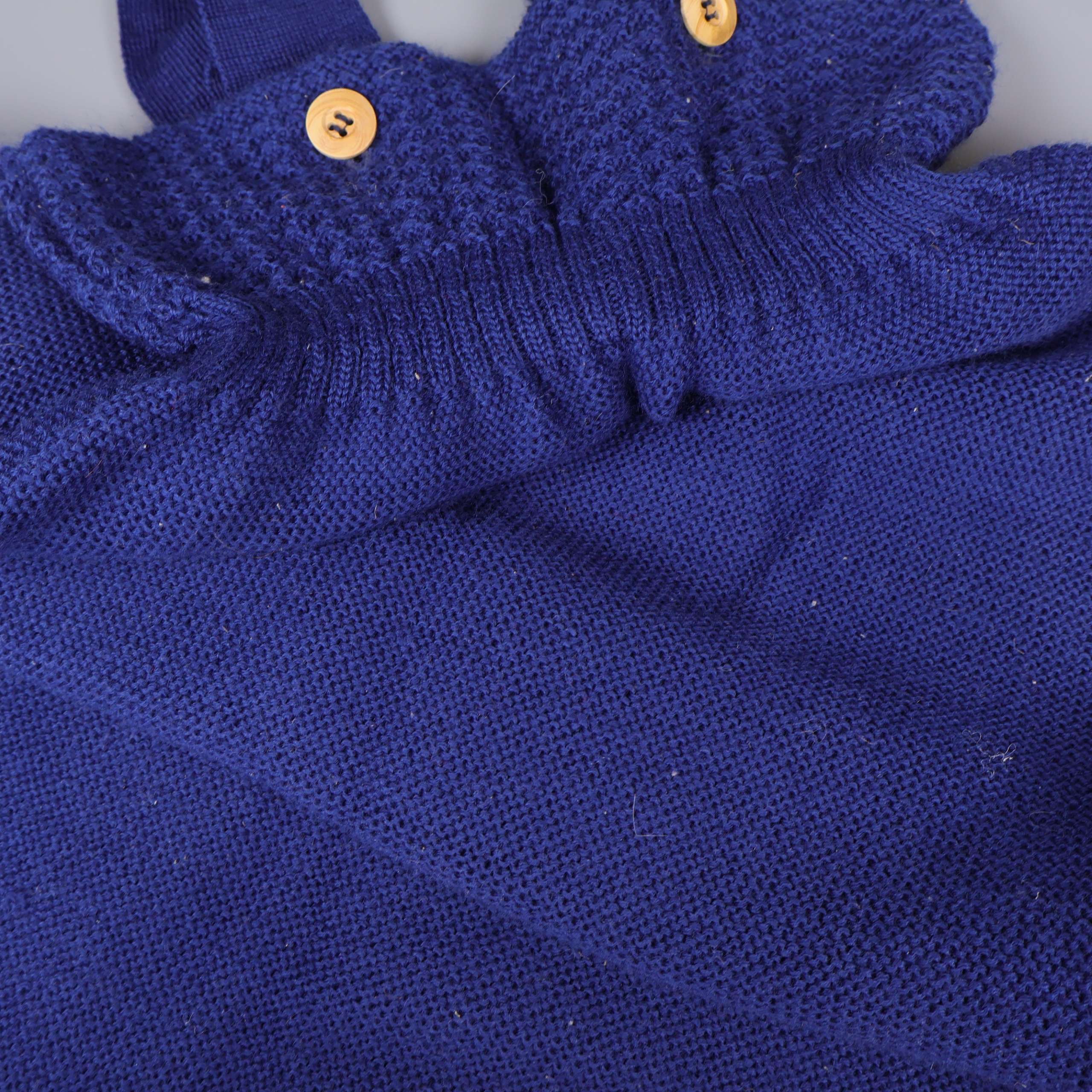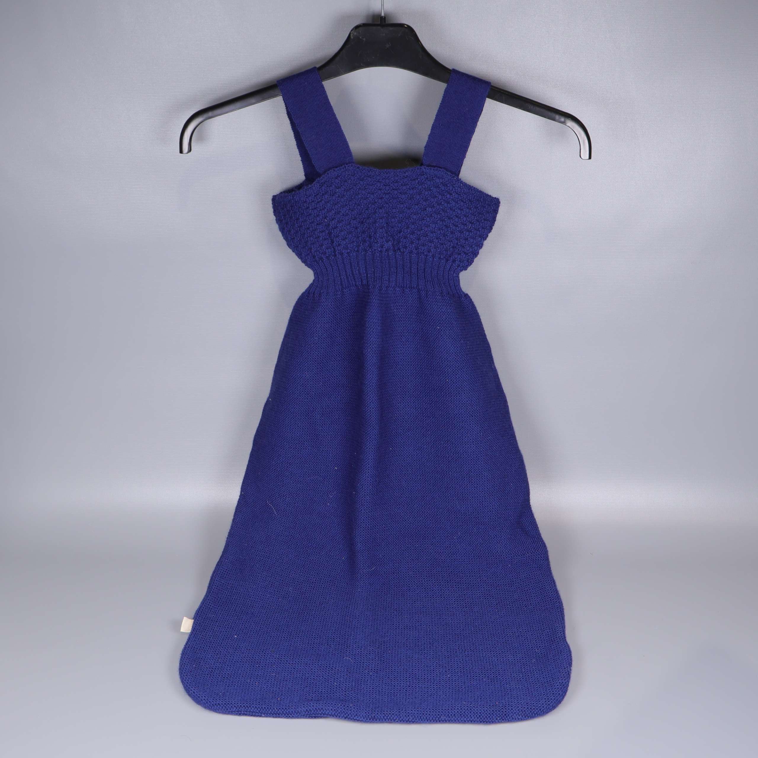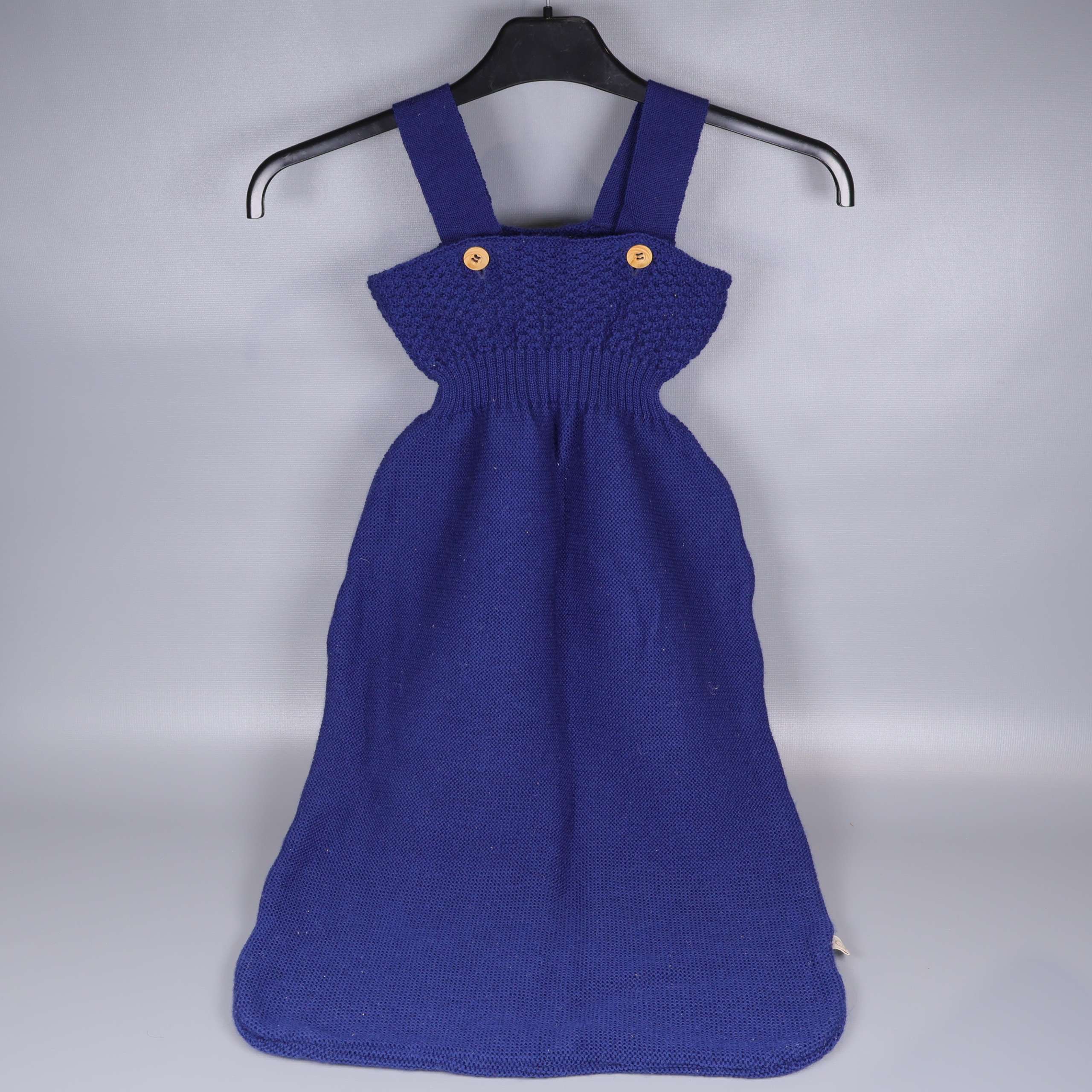 Förekommer ludd i övrigt mycket gott skick. En klassisk stickad sovpåse i av särskilt fin merinoull stickad i ett tidlöst Ajour-mönster i marinblått med två dekorativa träknappar vid axelbanden. Materialet ser mjukt och bekvämt ut, perfekt anpassad för små barn och med en rymlig modell.