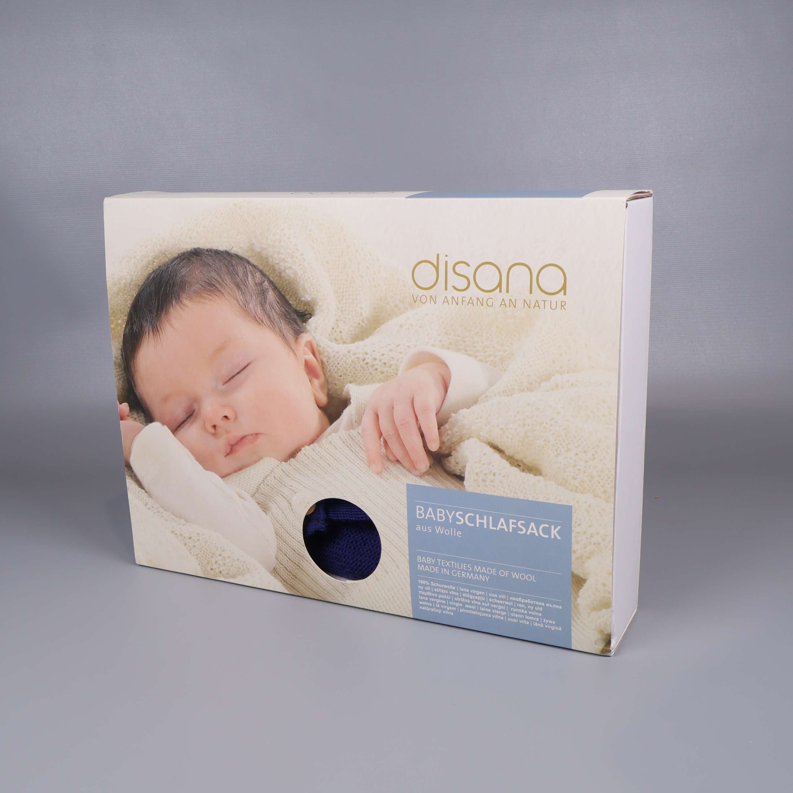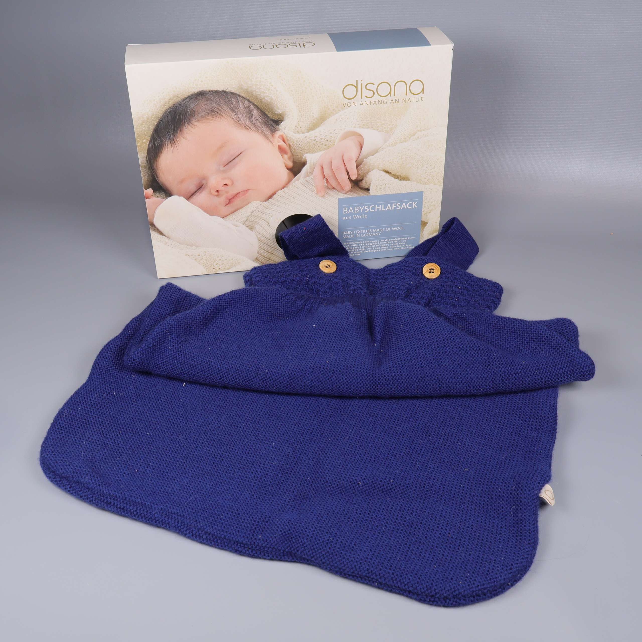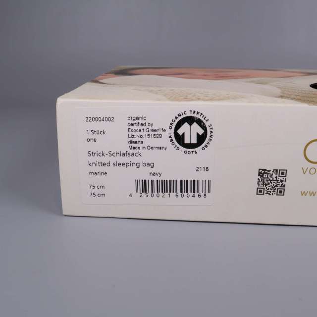 Förekommer ludd i övrigt mycket gott skick. En klassisk stickad sovpåse i av särskilt fin merinoull stickad i ett tidlöst Ajour-mönster i marinblått med två dekorativa träknappar vid axelbanden. Materialet ser mjukt och bekvämt ut, perfekt anpassad för små barn och med en rymlig modell.