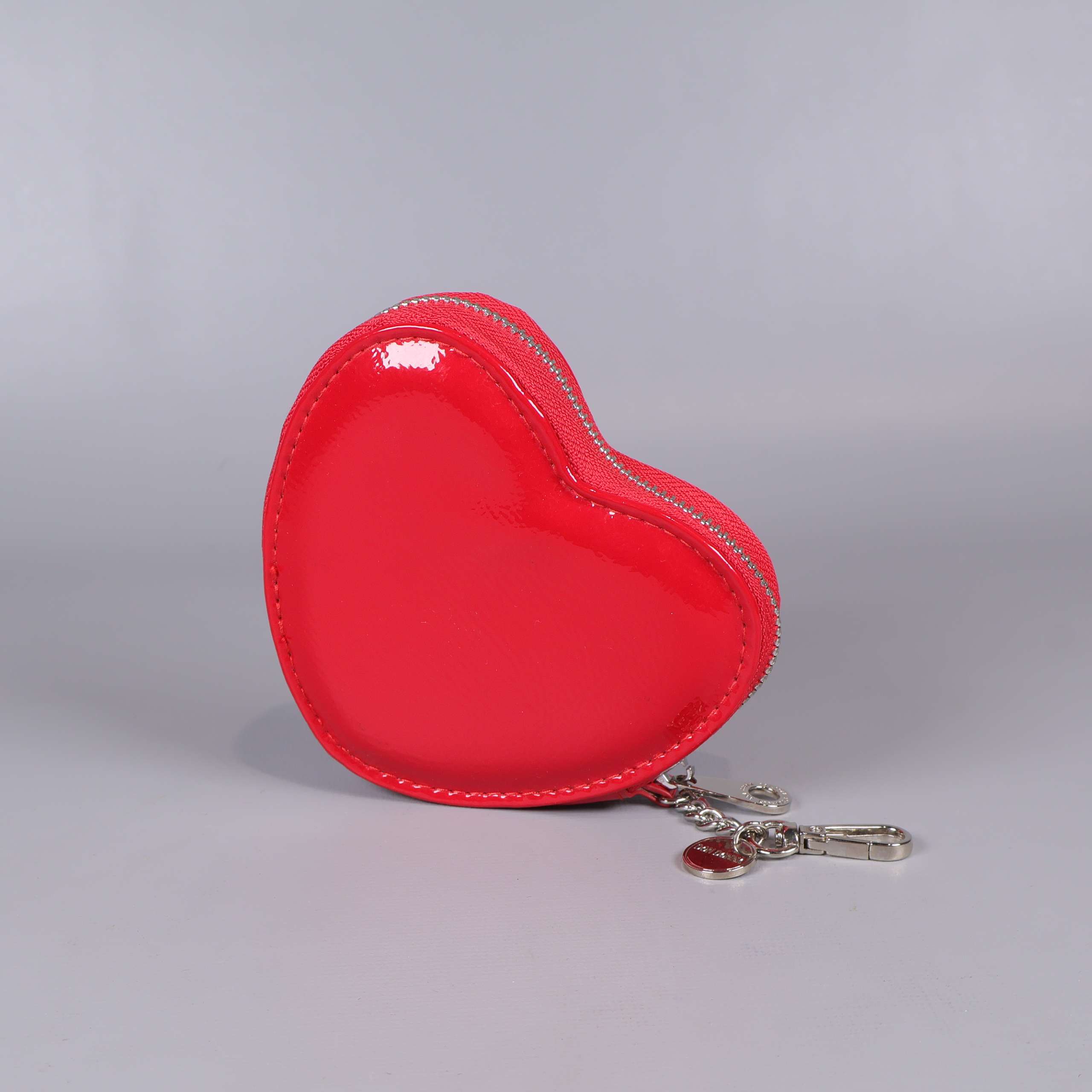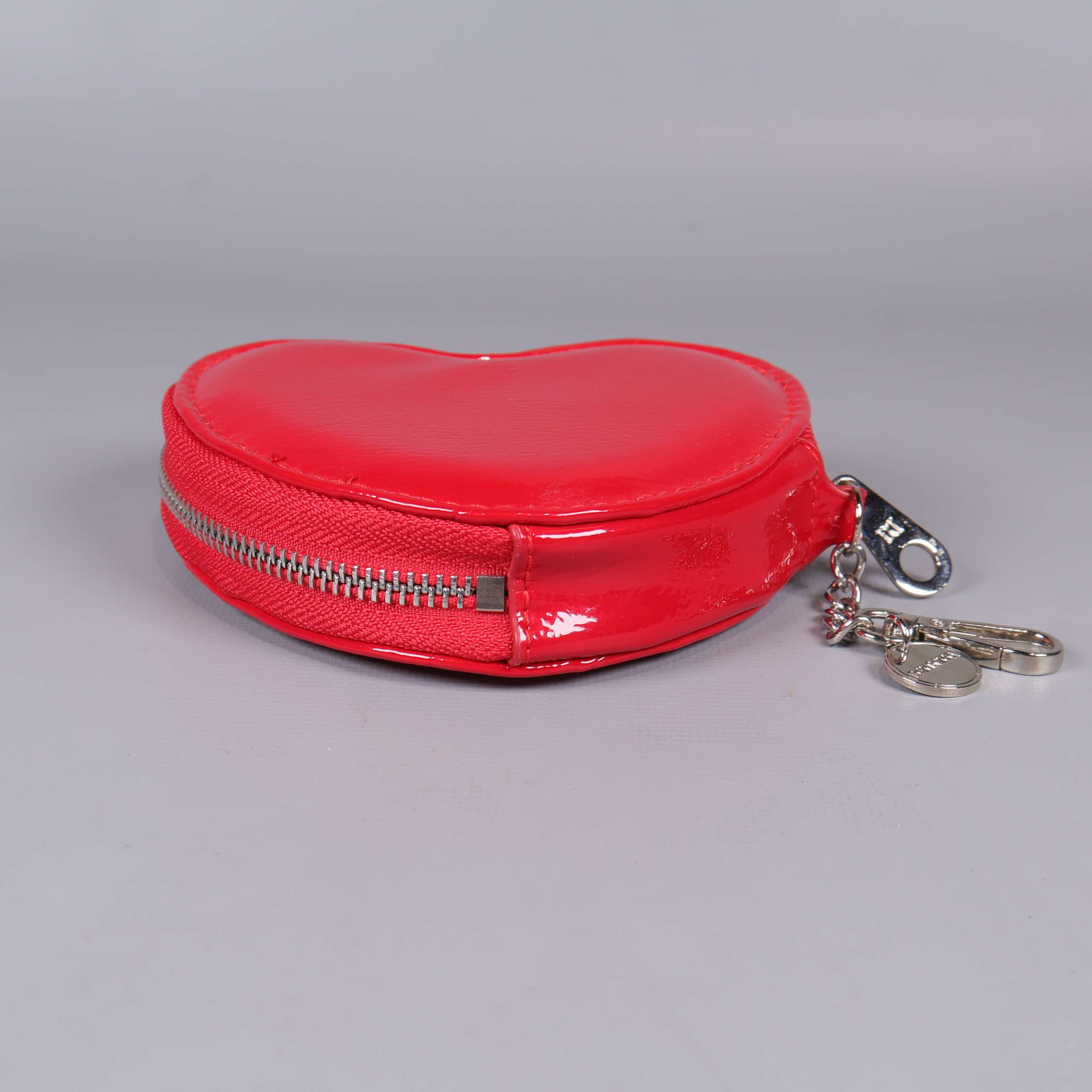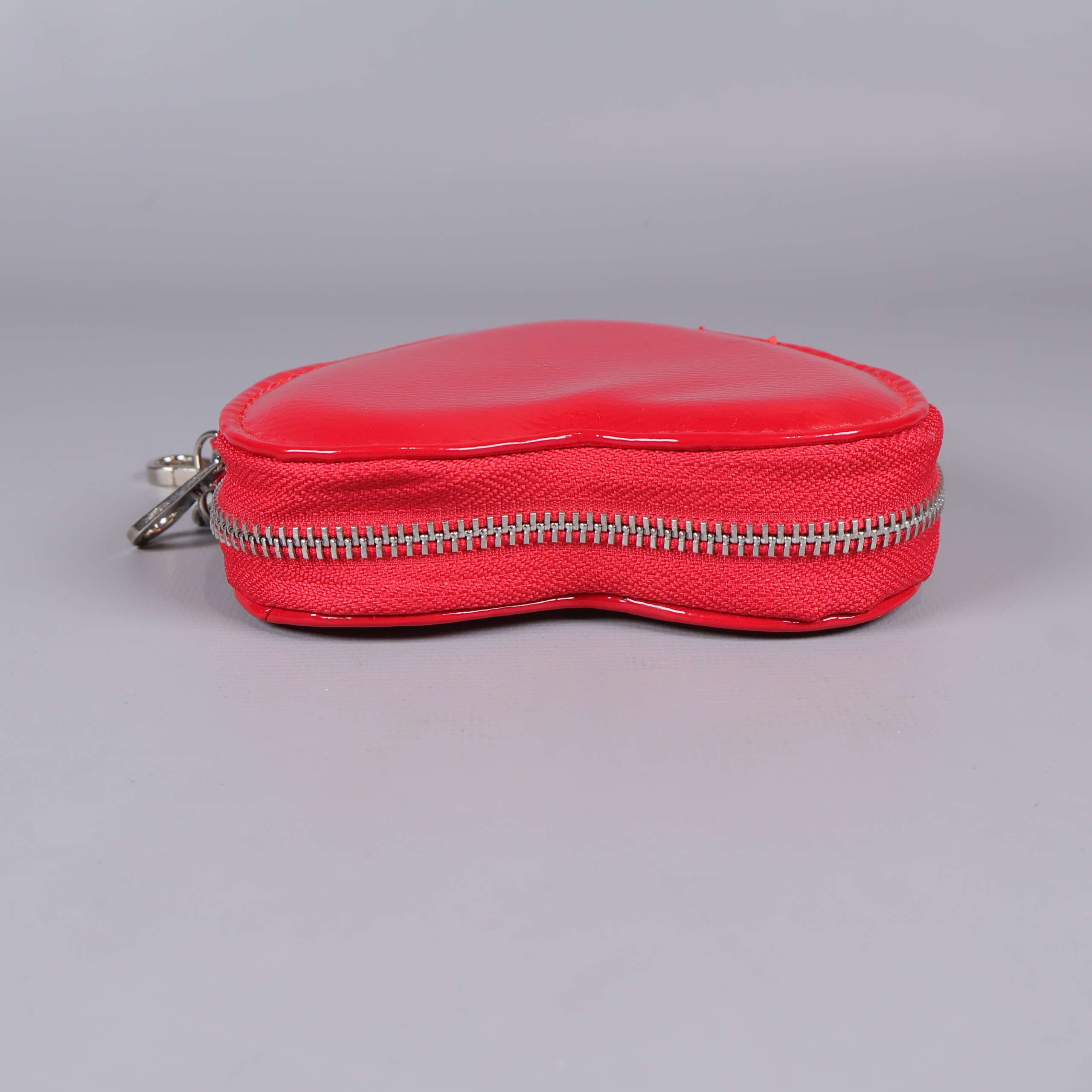 Mått: ca 13 cm. Litet hjärtfodral med skinande röd yta och silvrig dragkedja runtom. Nyckelringsdetaljer med hjärtcharm framtill och mjuk textilinsida i beige nyans. Kompakt och lekfull design som ger en poppig känsla till accessoaren.