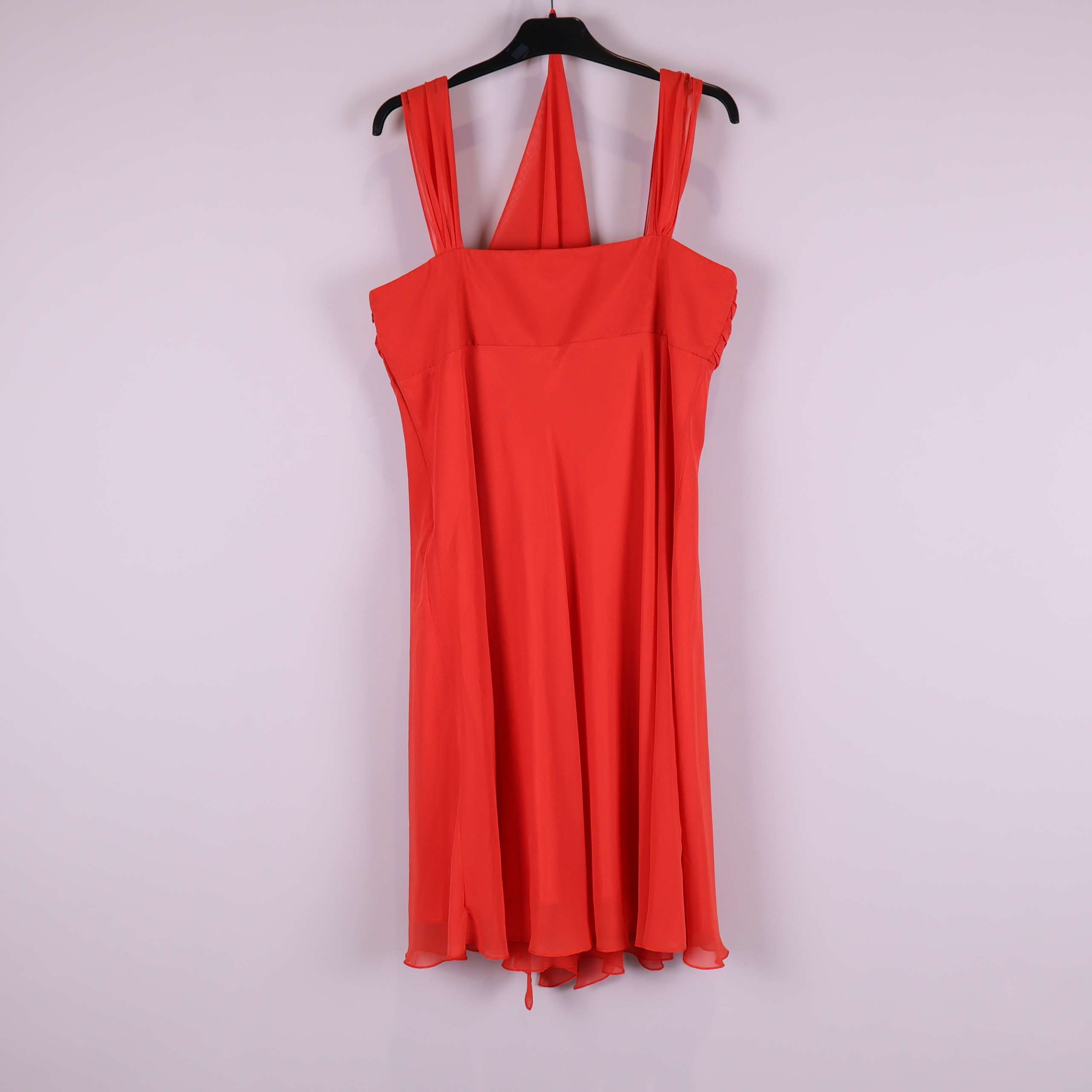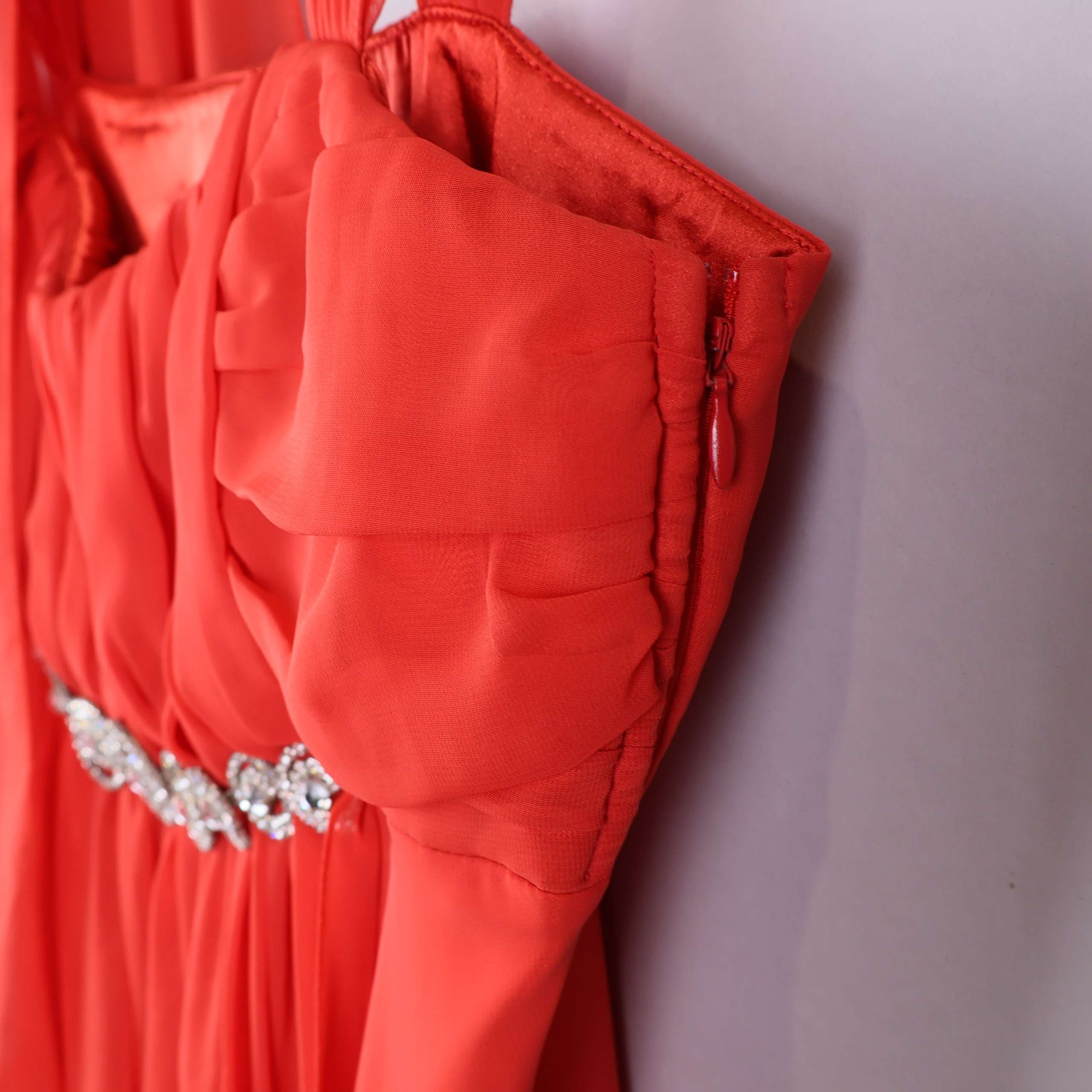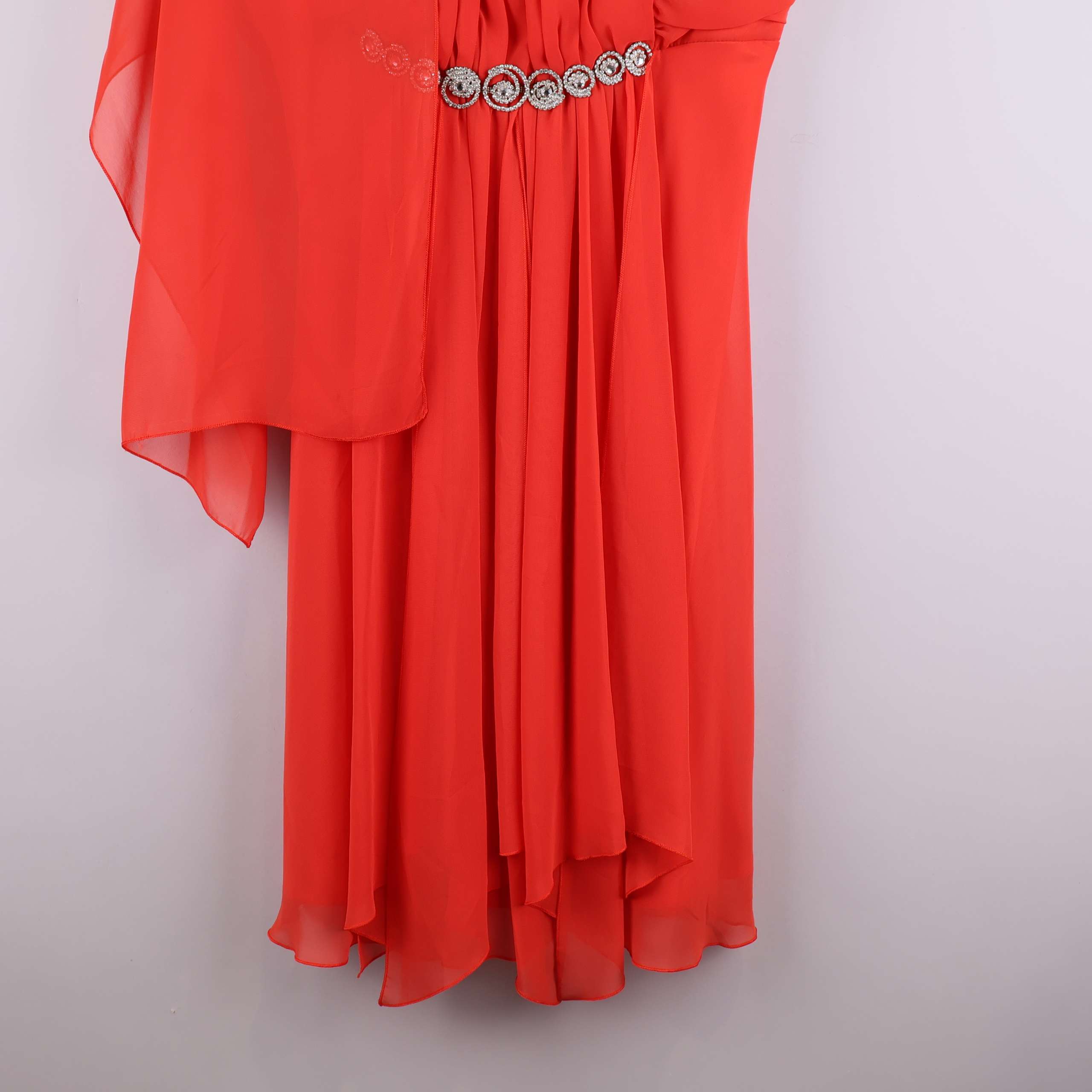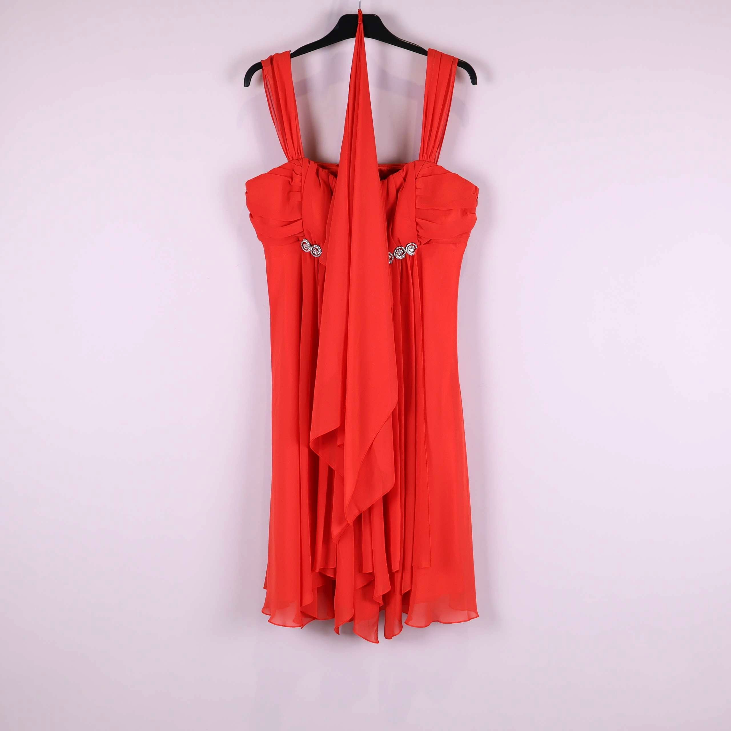 Elegant röd klänning med vackra draperingar och dekorativ strassdetalj i midjan. Modellen har breda axelband och medföljande matchande sjal som ger en festlig känsla. Lätt och flytande material för en bekväm men exklusiv look, perfekt för en chic och glamorös upplevelse. Dold dragkedja i sidan gör klänningen smidig att ta på.