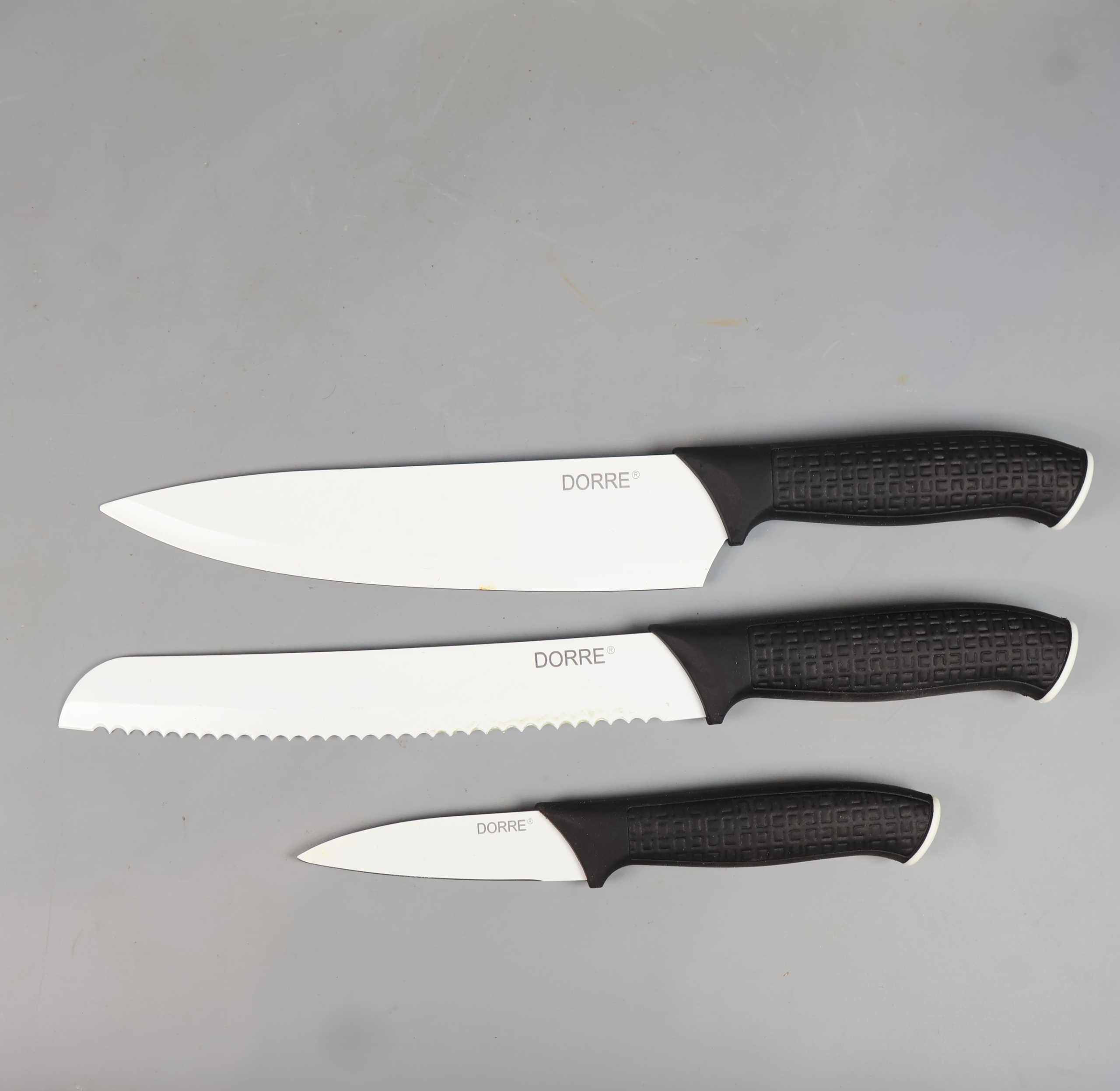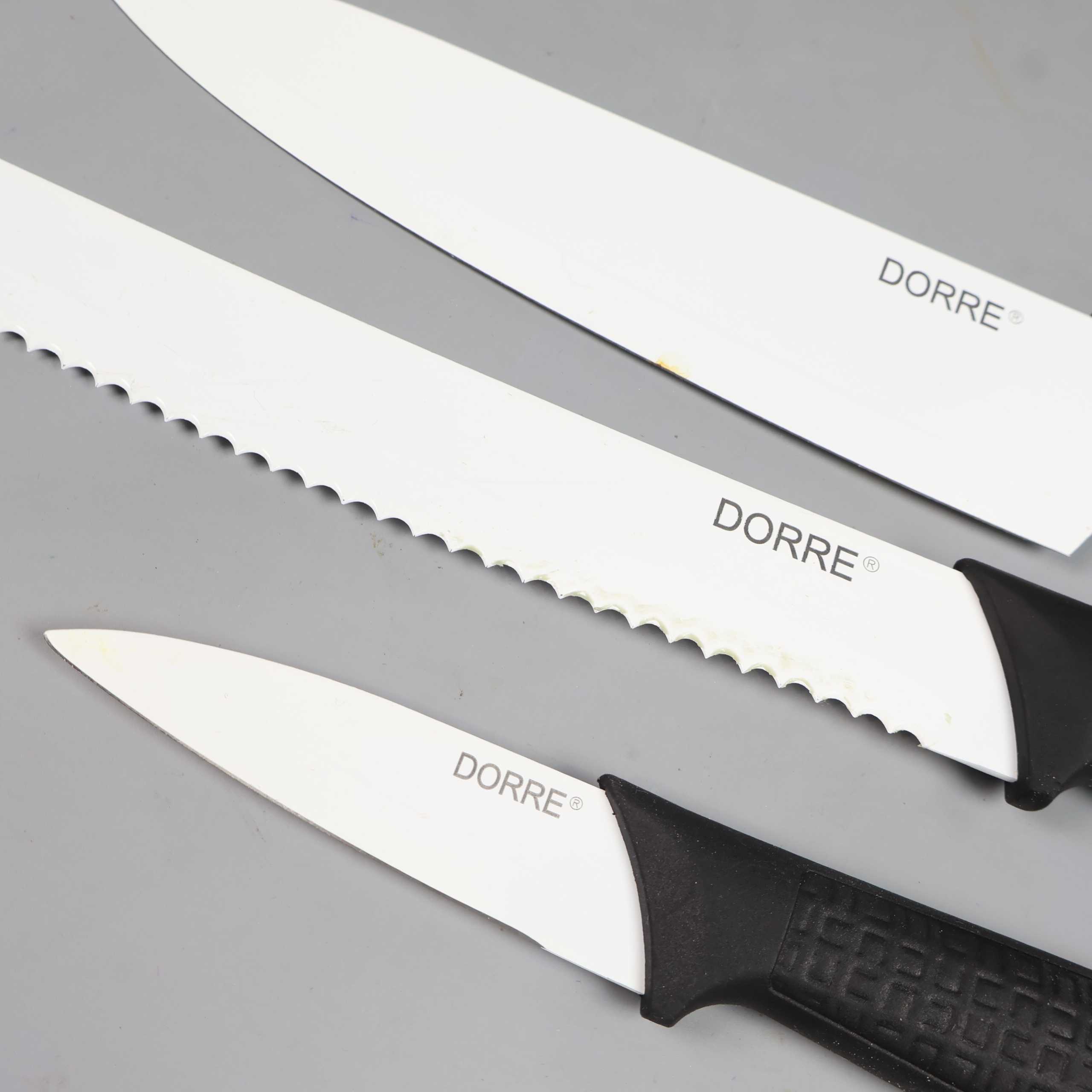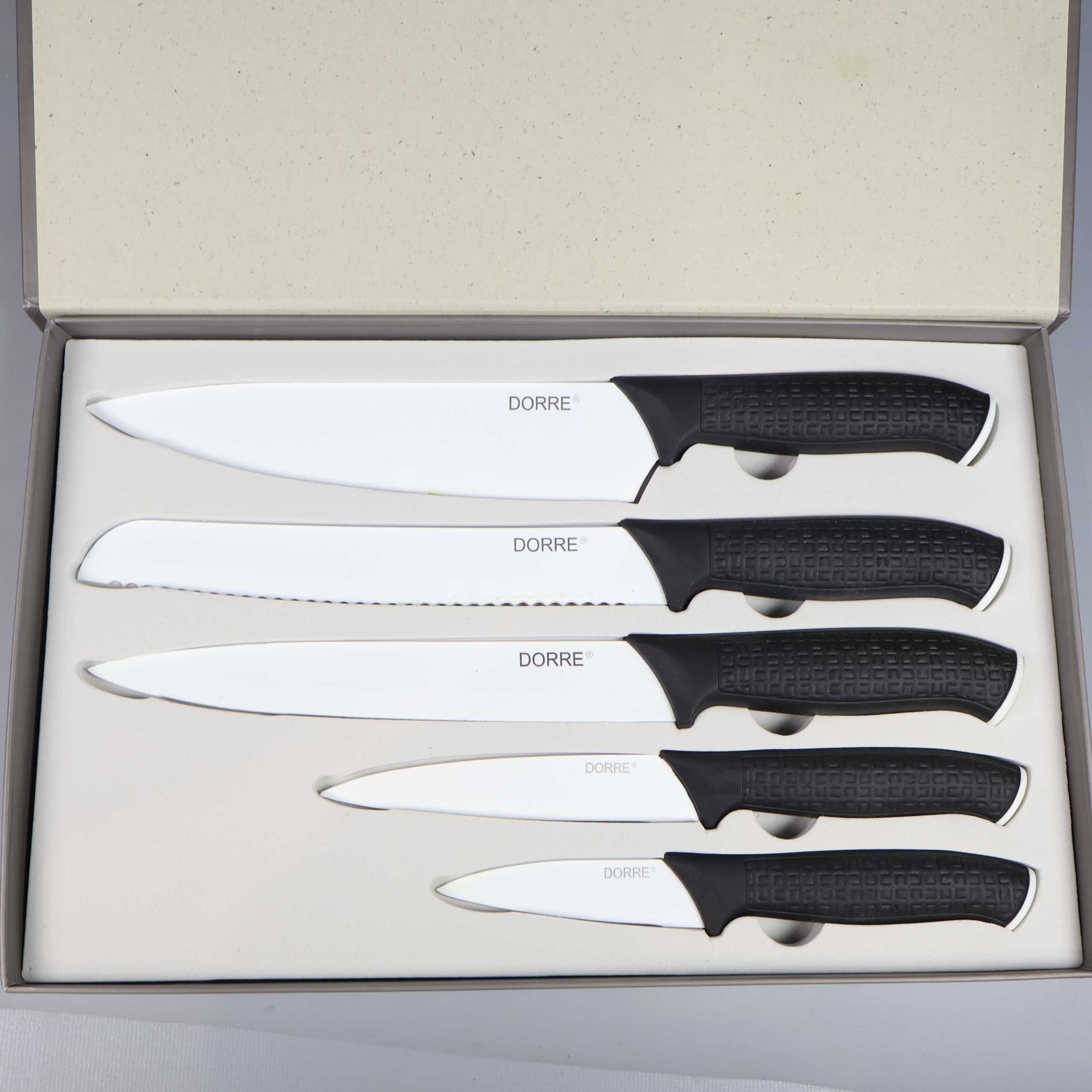 Dorre Dorre - Nakata - Knivset med svarta handtag 259 kr Product variation Antal st Beskrivning Set med fem köksknivar i olika storlekar med vita blad och ergonomiska svarta handtag. Knivarna har en modern design och passar alla kök. Skick: Litet märke på en kniv, se bild 5. Visa all beskrivning Skick Mycket gott skick Produkten är sparsamt använd, är av fin kvalitet och ska inte ha några skador eller förslitningar. Läs mer om hur vi bedömer Dimensions Ca 20-32cm Färg Vit Material Rostfritt stål Varumärke Dorre Produkten är unik och finns enbart som 1 st i lager. Fri frakt på alla köp över 990 kr. 14 dagars ångerrät.
