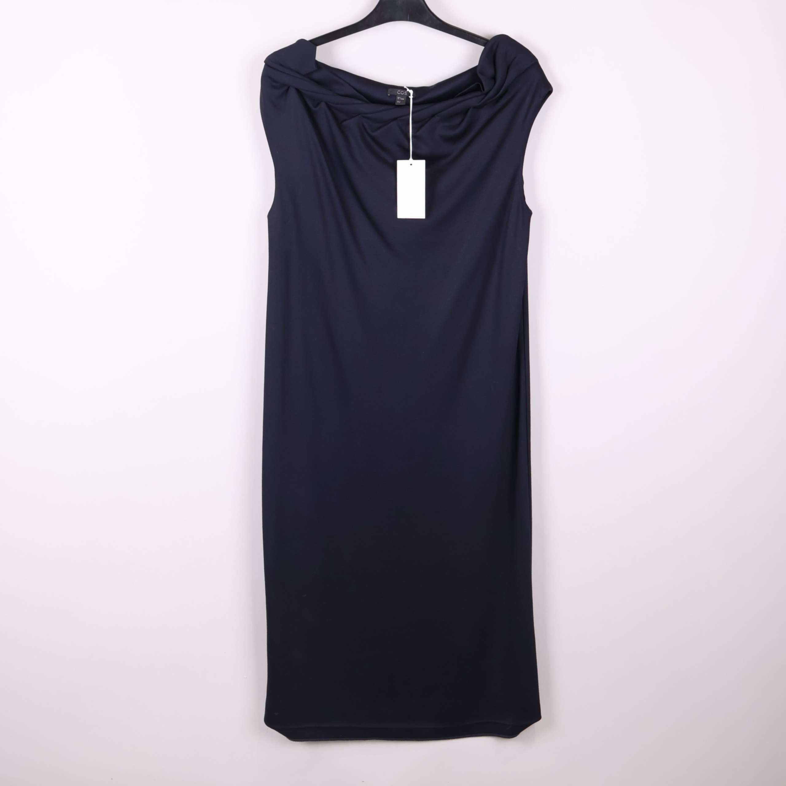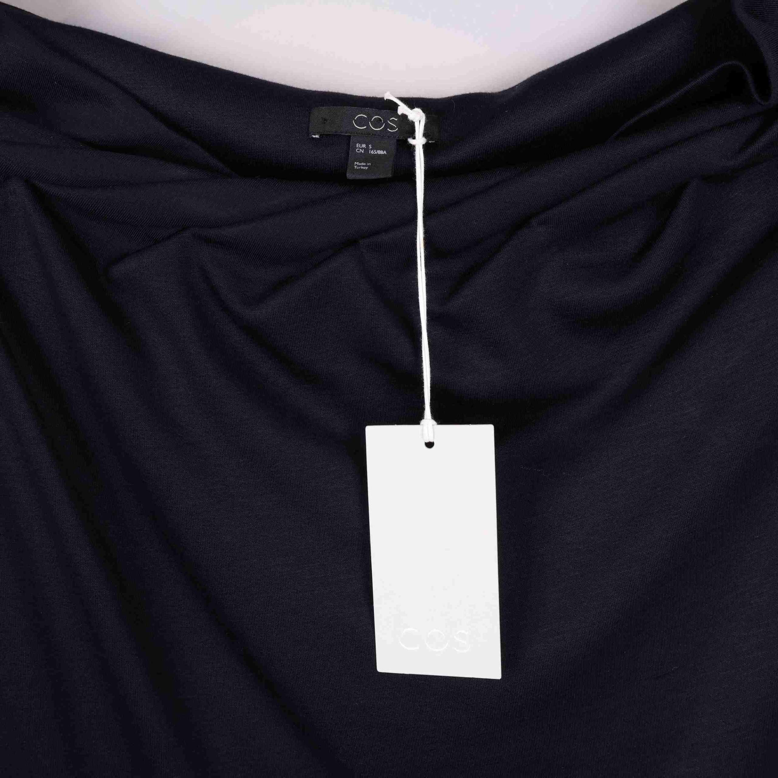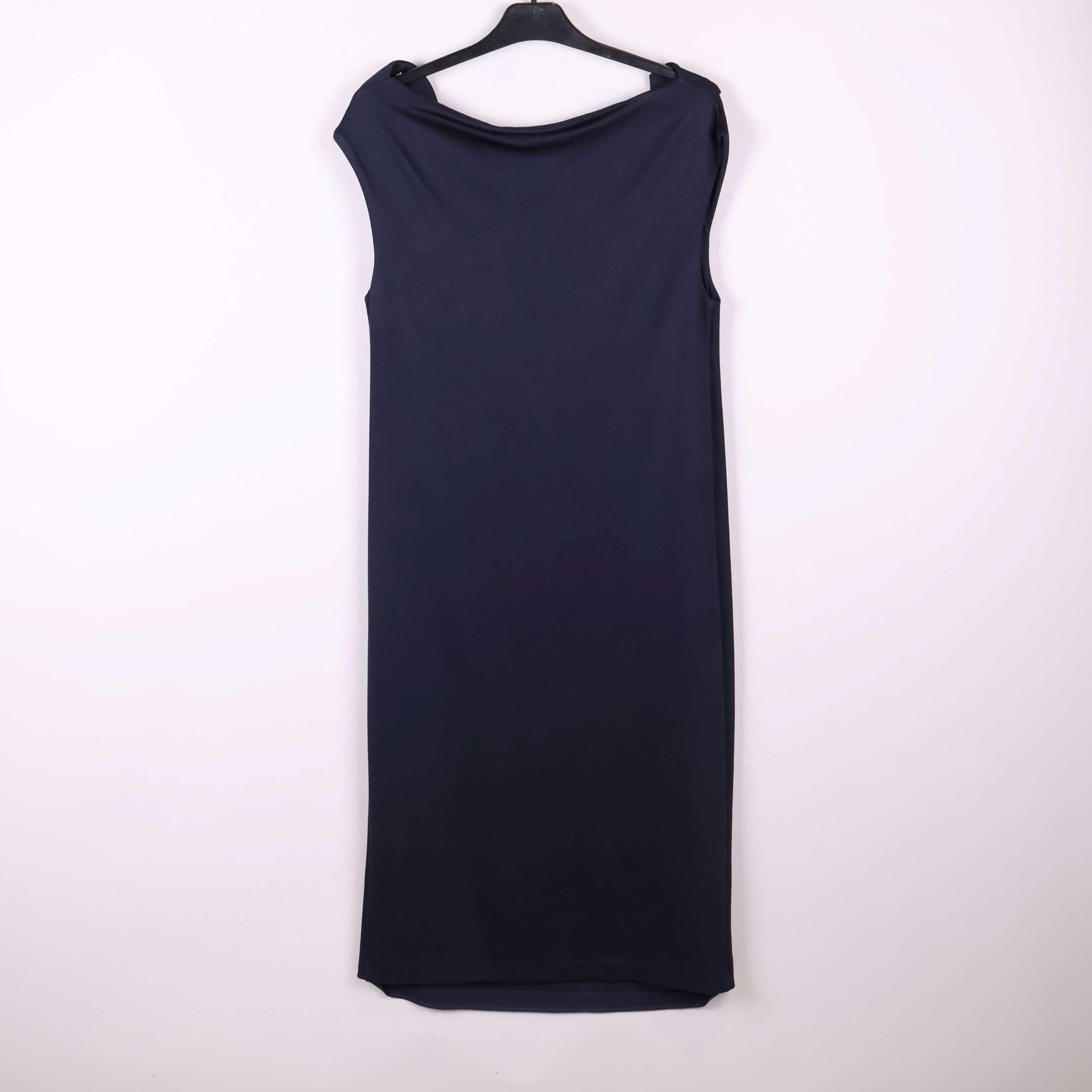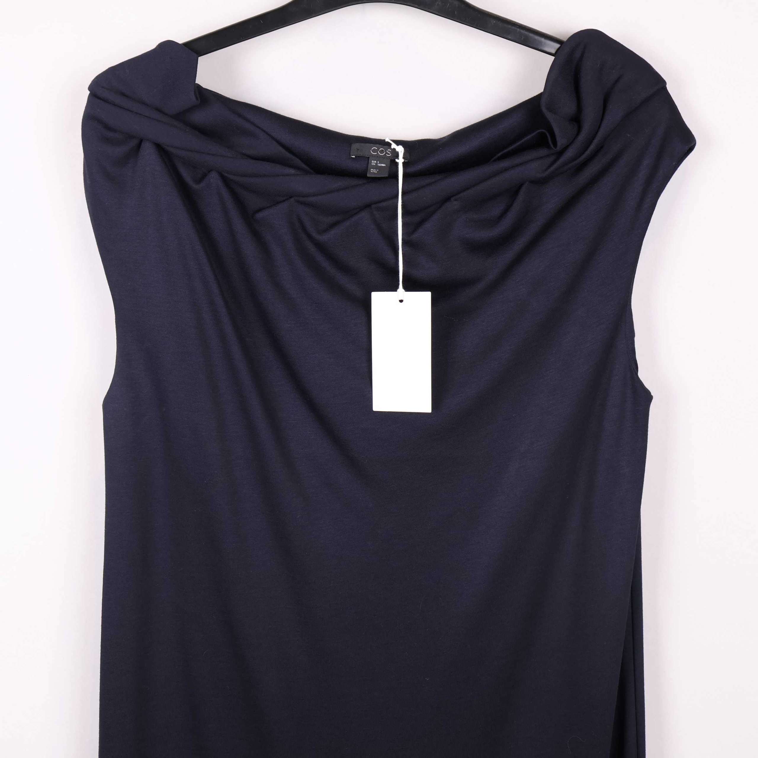 Den här klänningen från COS har en stilren och draperad urringning samt ett ärmlöst snitt som skapar en modern och enkel siluett. Klänningen är enfärgad mörkblå vilket ger en elegant och tidlös känsla. Tillverkad i mjukt tyg med lätt stretch för bekväm passform och faller snyggt baktill.