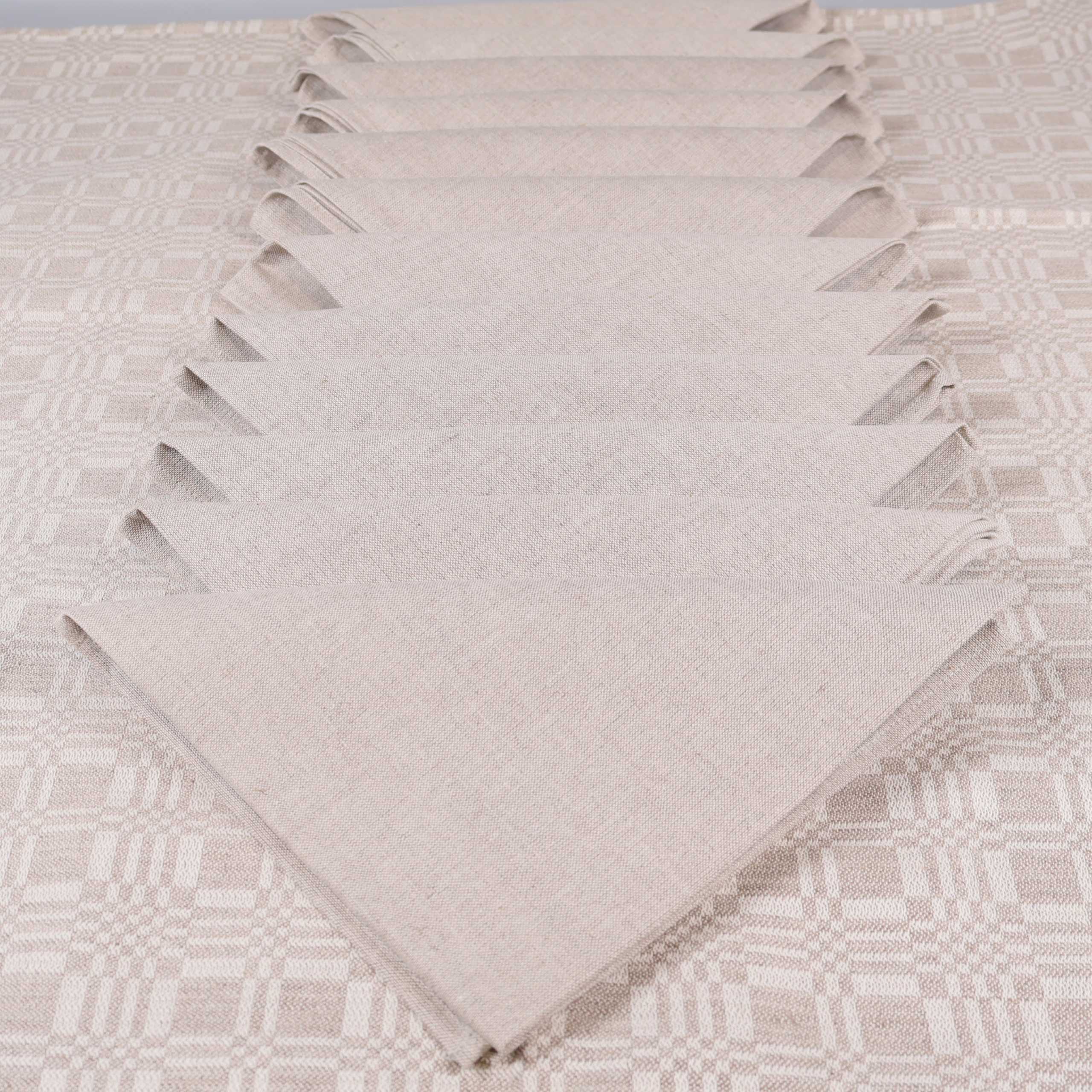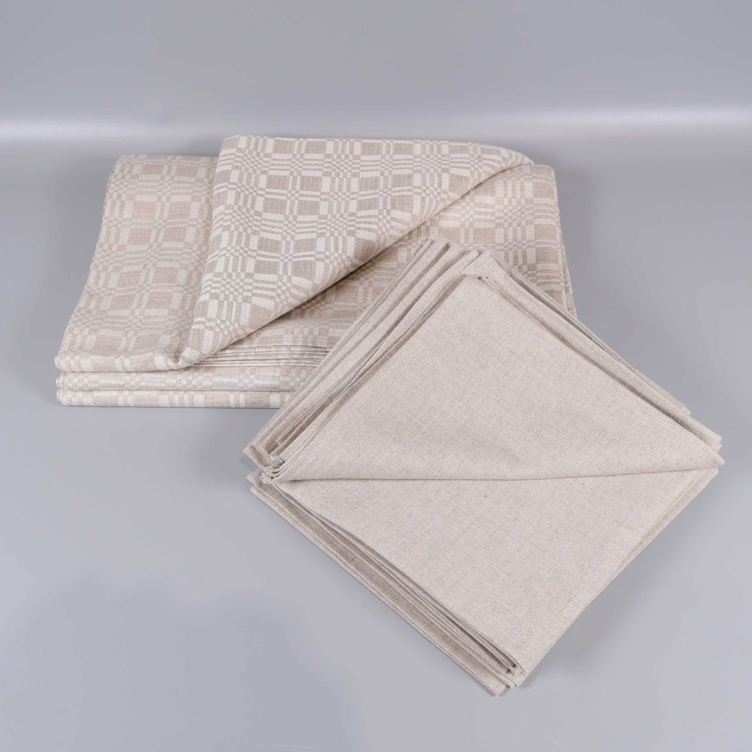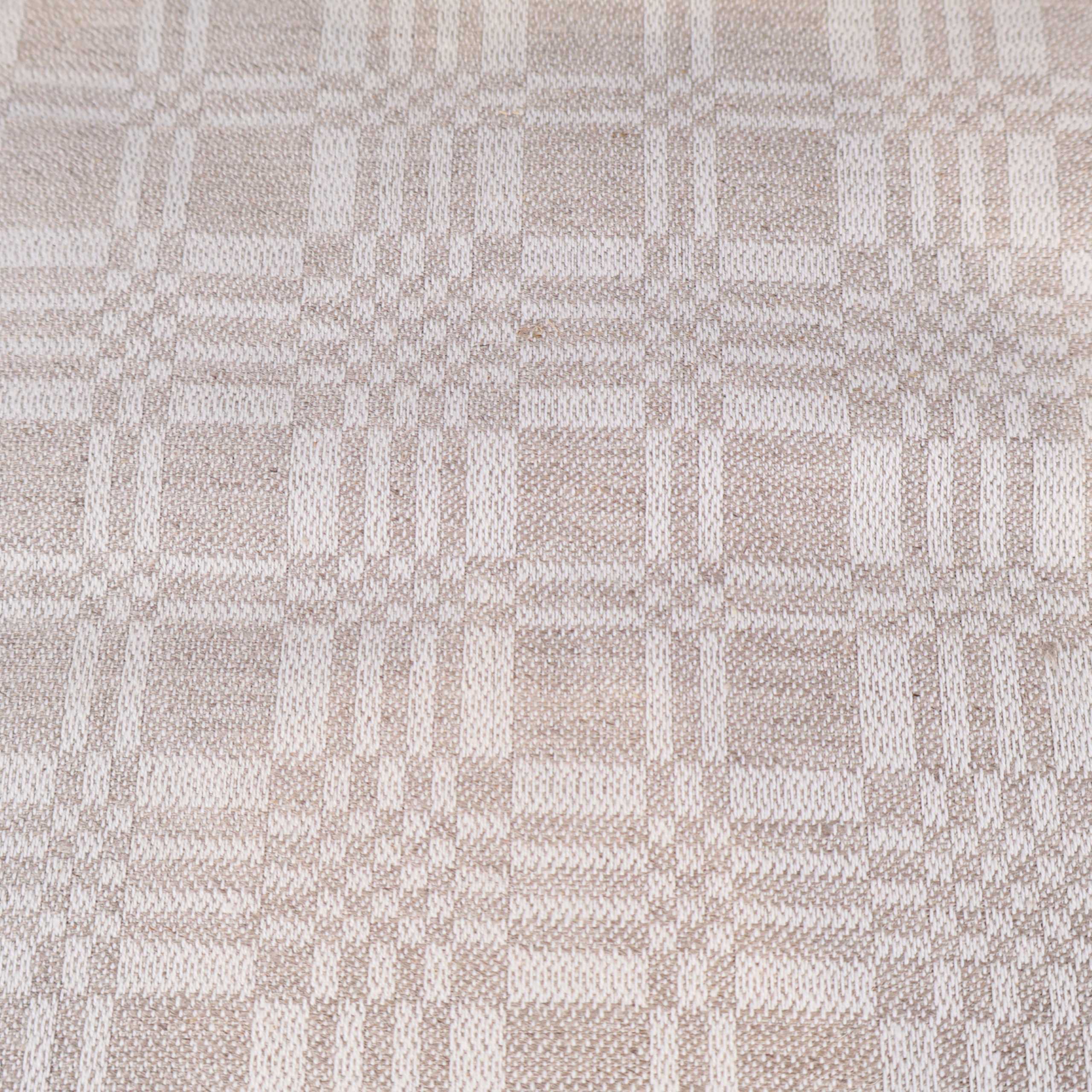 Stilren duk och servetter i harmonisk beige ton, med elegant invävt geometriskt dräll-mönster på duken. Tillverkade i naturmaterial för mjuk känsla och snygg struktur. Duken och servetterna levereras i matchande tygpåse med knytband. Brynäs Konsult Exodus Collection