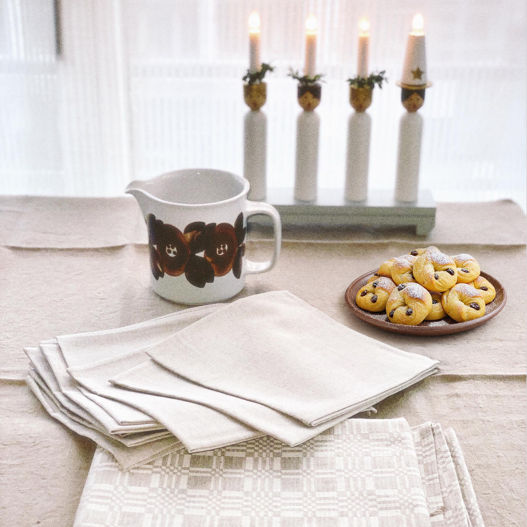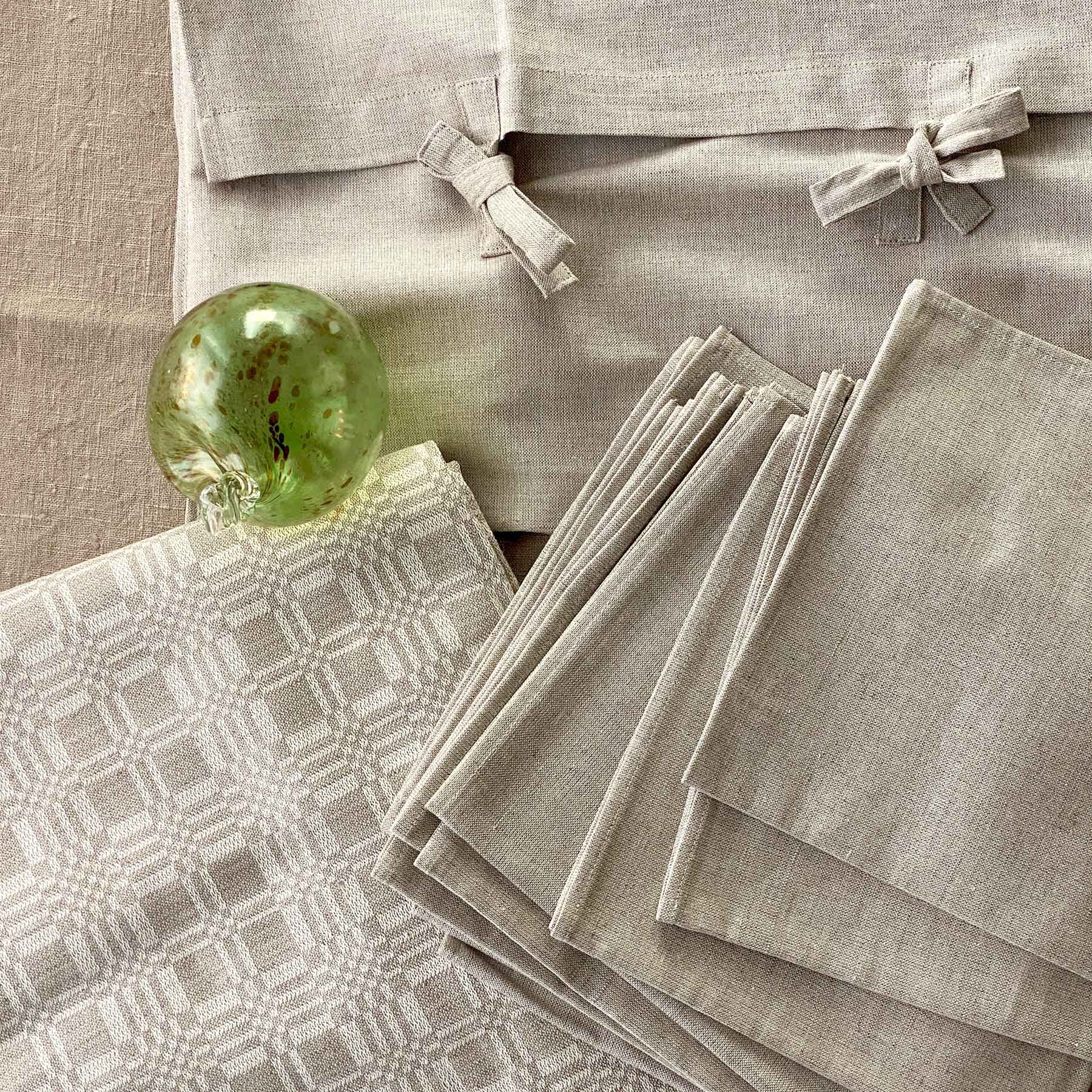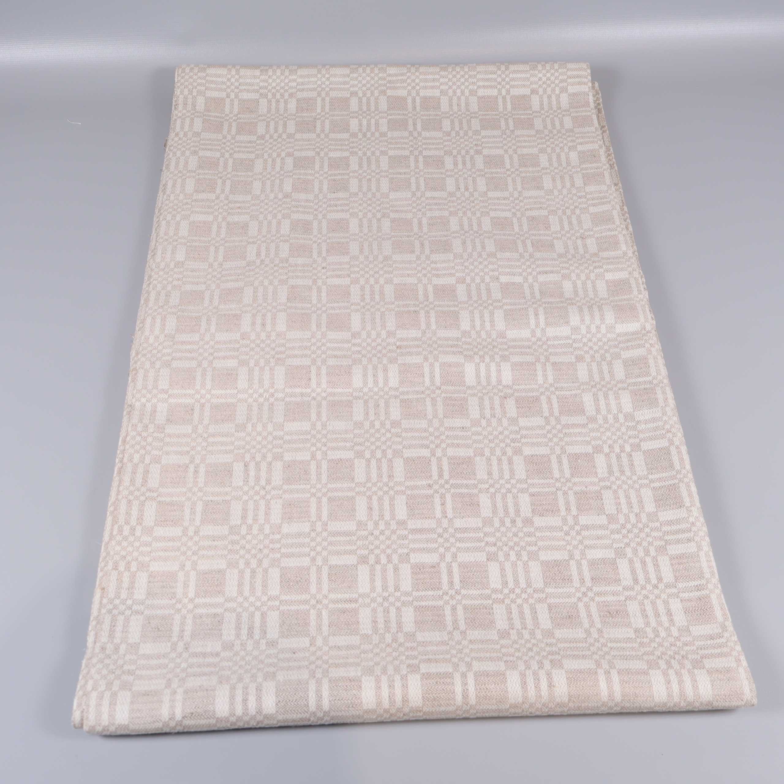 Stilren duk och servetter i harmonisk beige ton, med elegant invävt geometriskt dräll-mönster på duken. Tillverkade i naturmaterial för mjuk känsla och snygg struktur. Duken och servetterna levereras i matchande tygpåse med knytband. Brynäs Konsult Exodus Collection