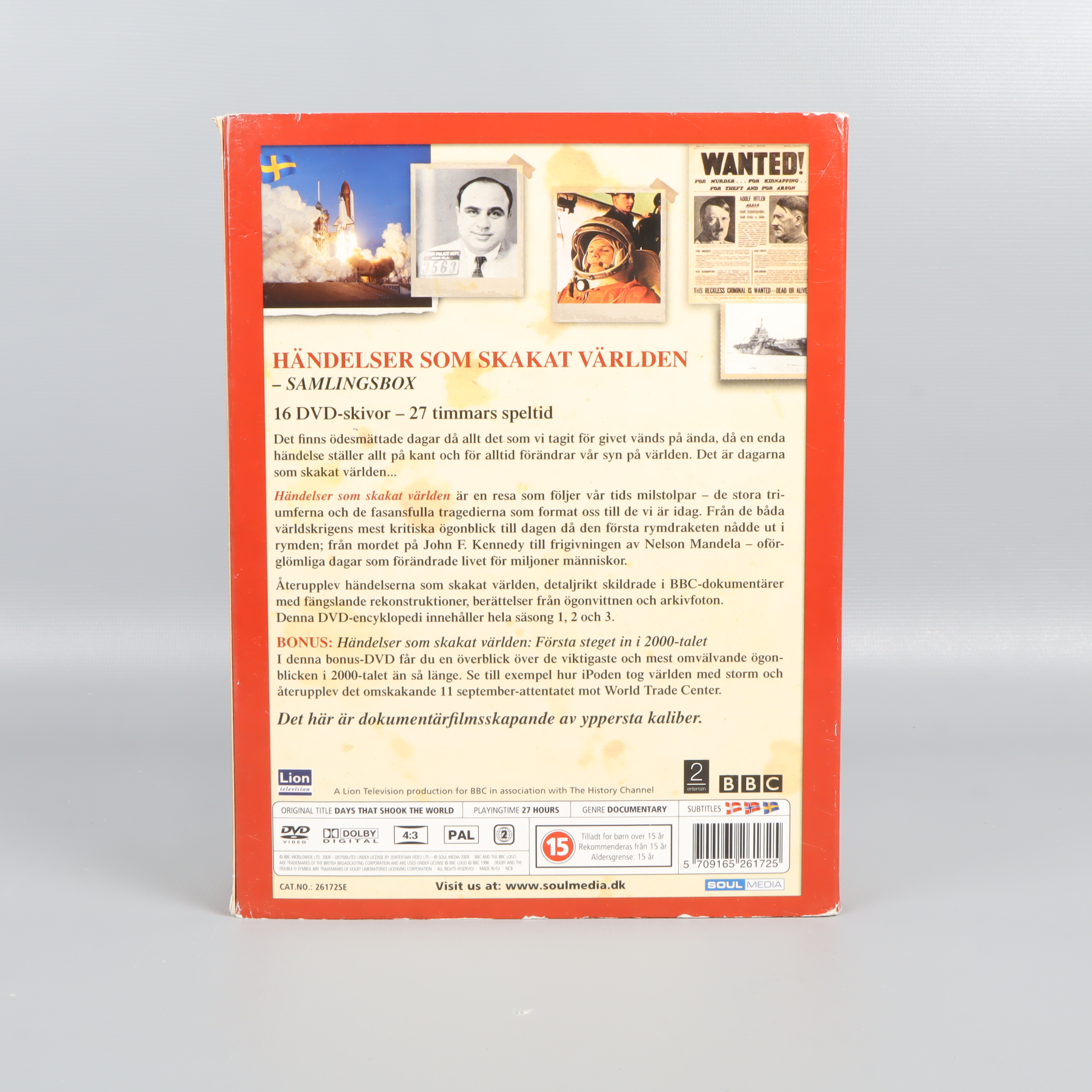 Upptäck en unik DVD-encyklopedi som tar dig genom några av de mest betydelsefulla händelserna i världshistorien. Händelser som skakat världen är ett omfattande samlingspaket som samlar fascinerande dokumentära inslag från BBC, med starkt visuellt berättande, autentiska bilder och engagerande inslag om allt från politiska revolutioner till naturkatastrofer. Förpackningen i en robust box med röd ram gör den till en idealisk present eller samlarobjekt för dig som gillar historia eller bara vill få större förståelse för världen vi lever i. Med 16 DVD-skivor får du flera timmars kunskap och insikter, sorterade tematiskt och enkelt att navigera mellan. DVD-boxens design är tydlig med tidslösa fotografier och smart illustration som passar hemmabion lika bra som skolundervisningen. Perfekt för dig som söker informativa, verklighetsbaserade berättelser i pedagogiskt format.