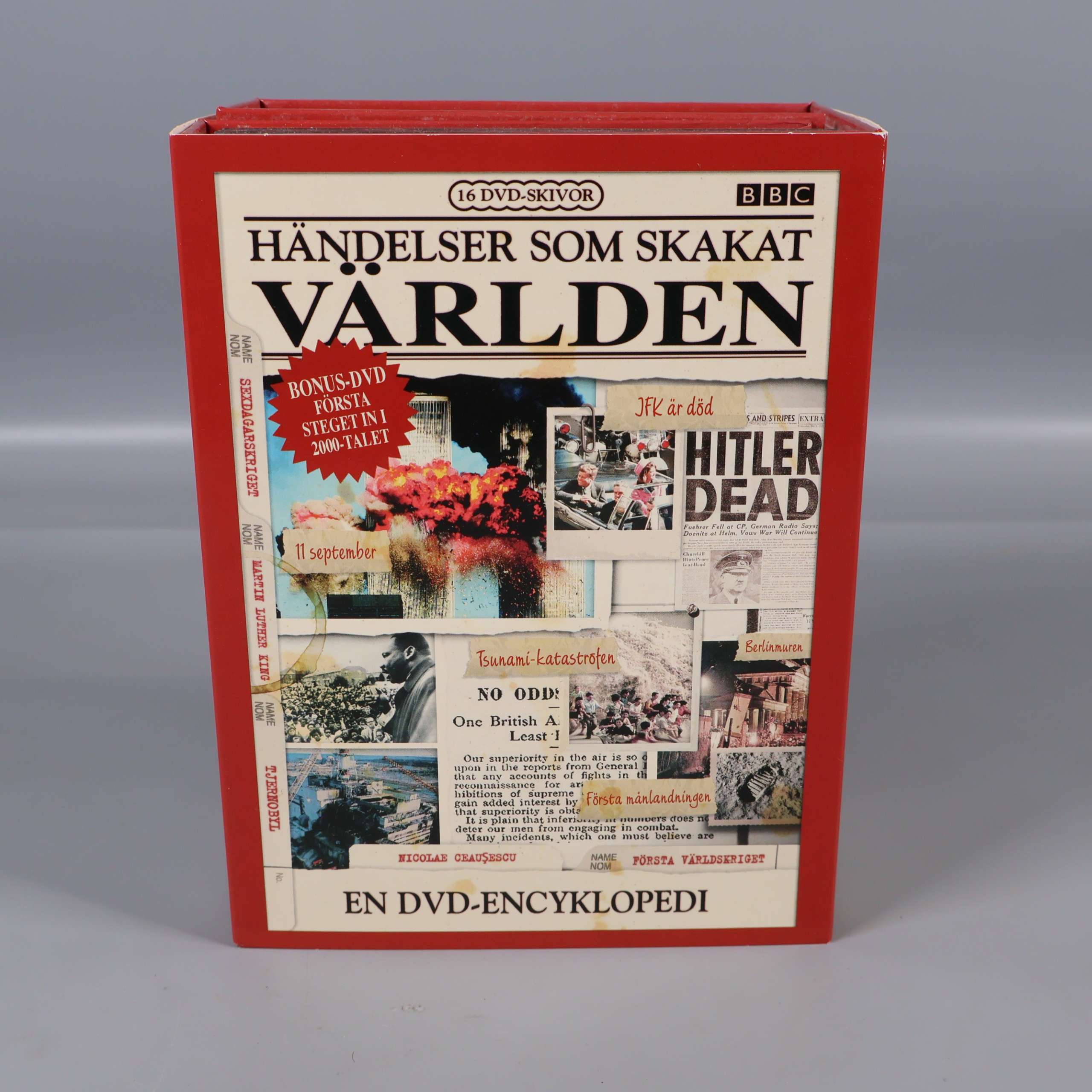 DVD-box - Händelser som skakat världen - 16 skivor 199 kr Product variation Antal st Beskrivning Upptäck en fascinerande DVD-encyklopedi med händelser som skakat världen – perfekt för dig som älskar historia och dokumentärer. Visa all beskrivning Skick Mycket gott skick Produkten är sparsamt använd, är av fin kvalitet och ska inte ha några skador eller förslitningar. Läs mer om hur vi bedömer Format DVD Genre Dokumentär Publisher BBC Language Engelska text på svenska Age limit Rek. 15år Produkten är unik och finns enbart som 1 st i lager. Fri frakt på alla köp över 990 kr. 14 dagars ångerrät.