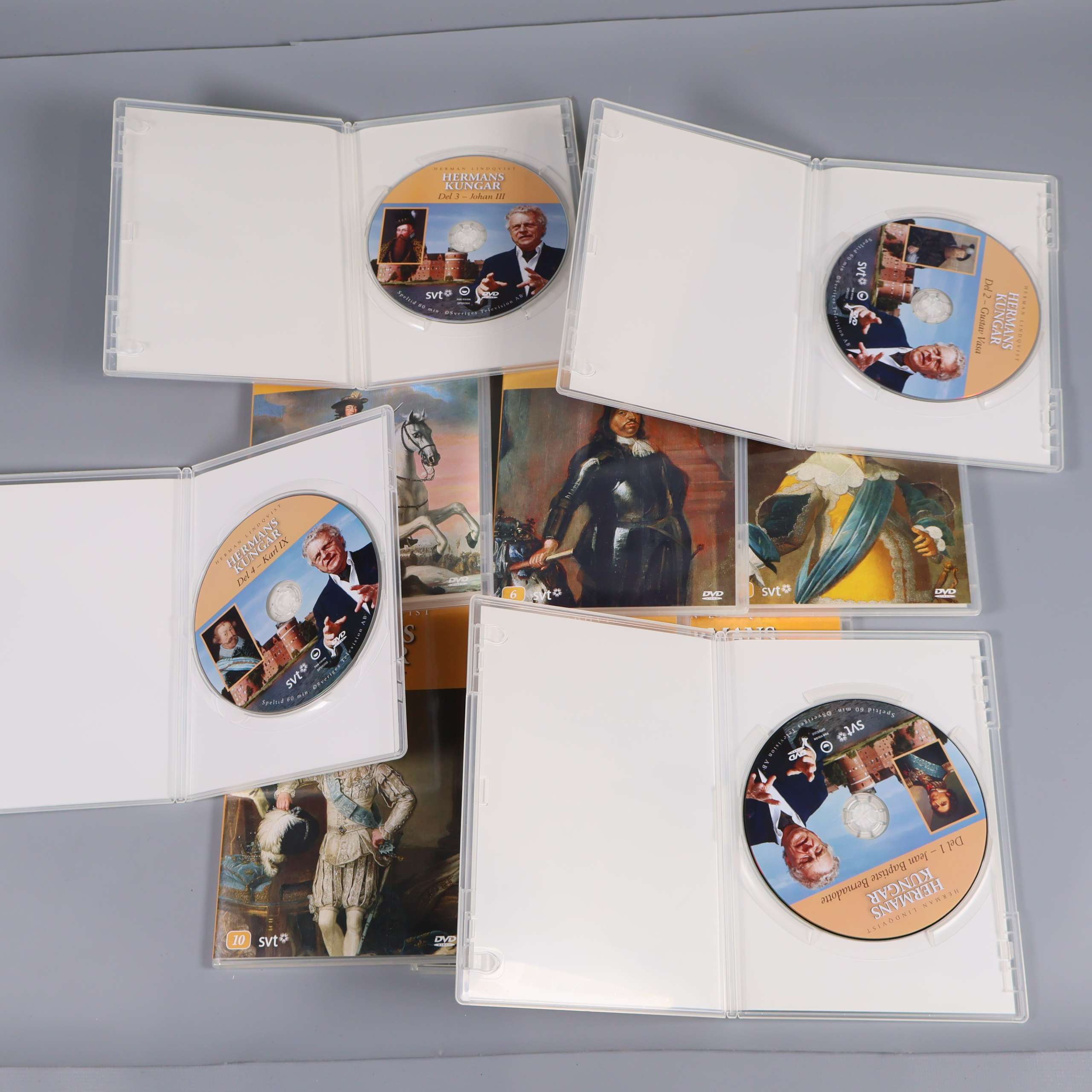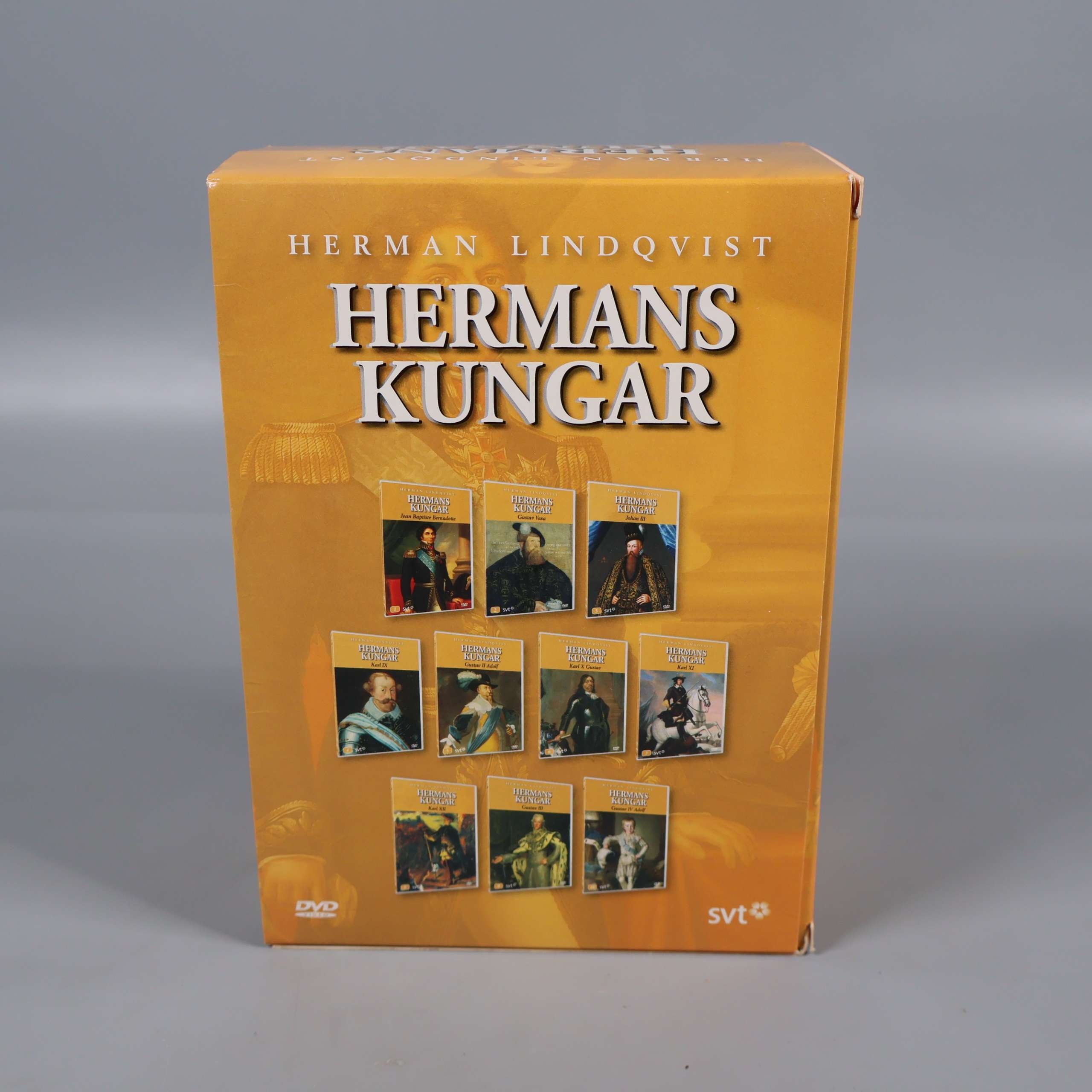 Den här DVD-boxen innehåller hela dokumentärserien Hermans Kungar med Herman Lindqvist, där vi får en spännande och lärorik inblick i några av Sveriges mest kända kungars liv och historia. Boxen består av tio separata DVD-fodral, var och en med eget omslag och unika avsnitt om olika regenter från Gustav Vasa till Karl XII. Serien är producerad av SVT och är perfekt för dig som är historieintresserad eller vill lära dig mer om Sveriges monarki på ett underhållande och tillgängligt sätt.