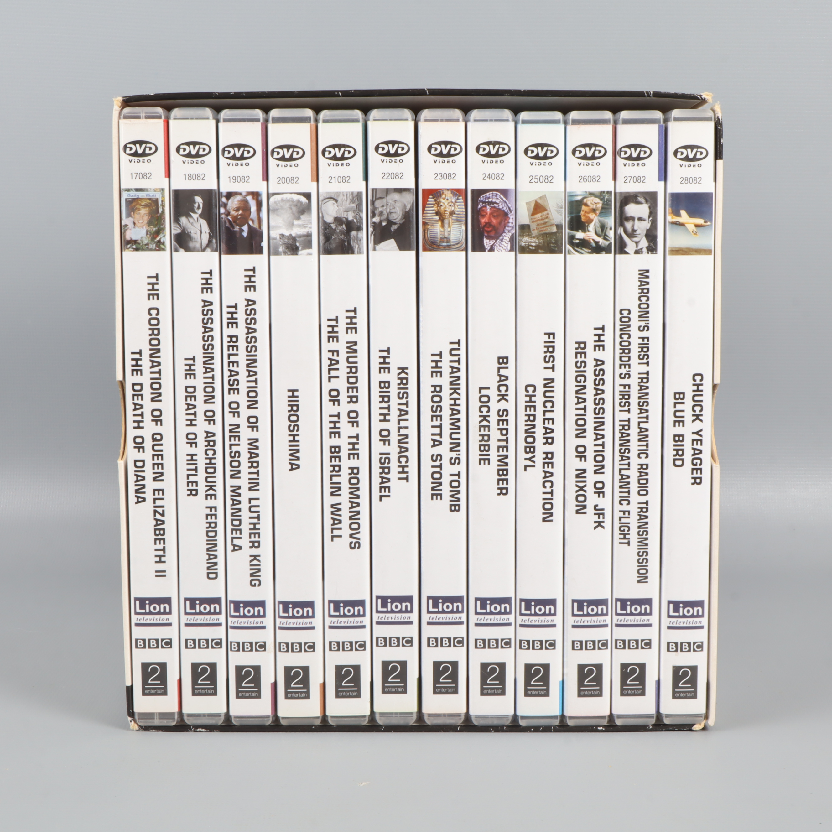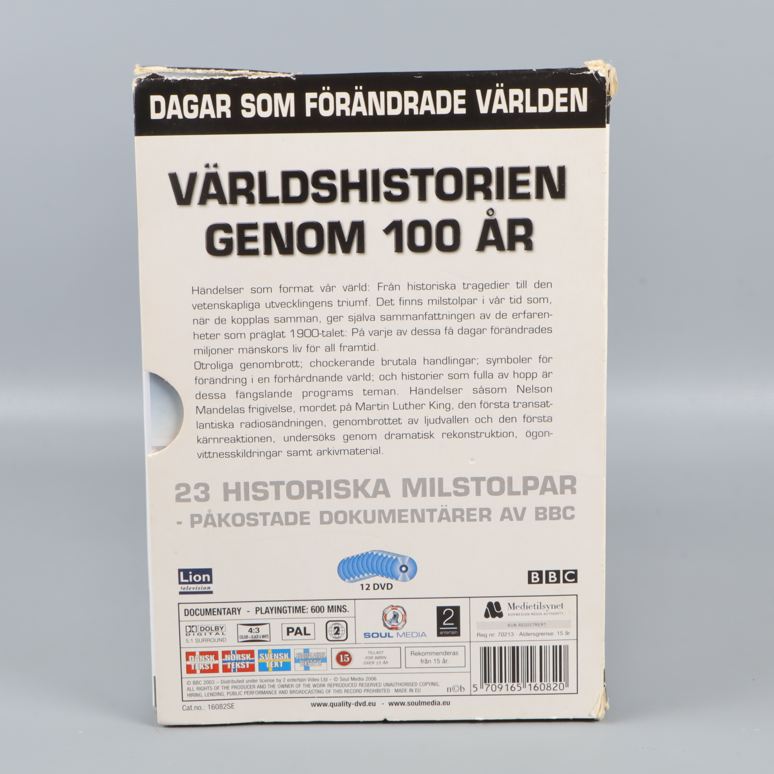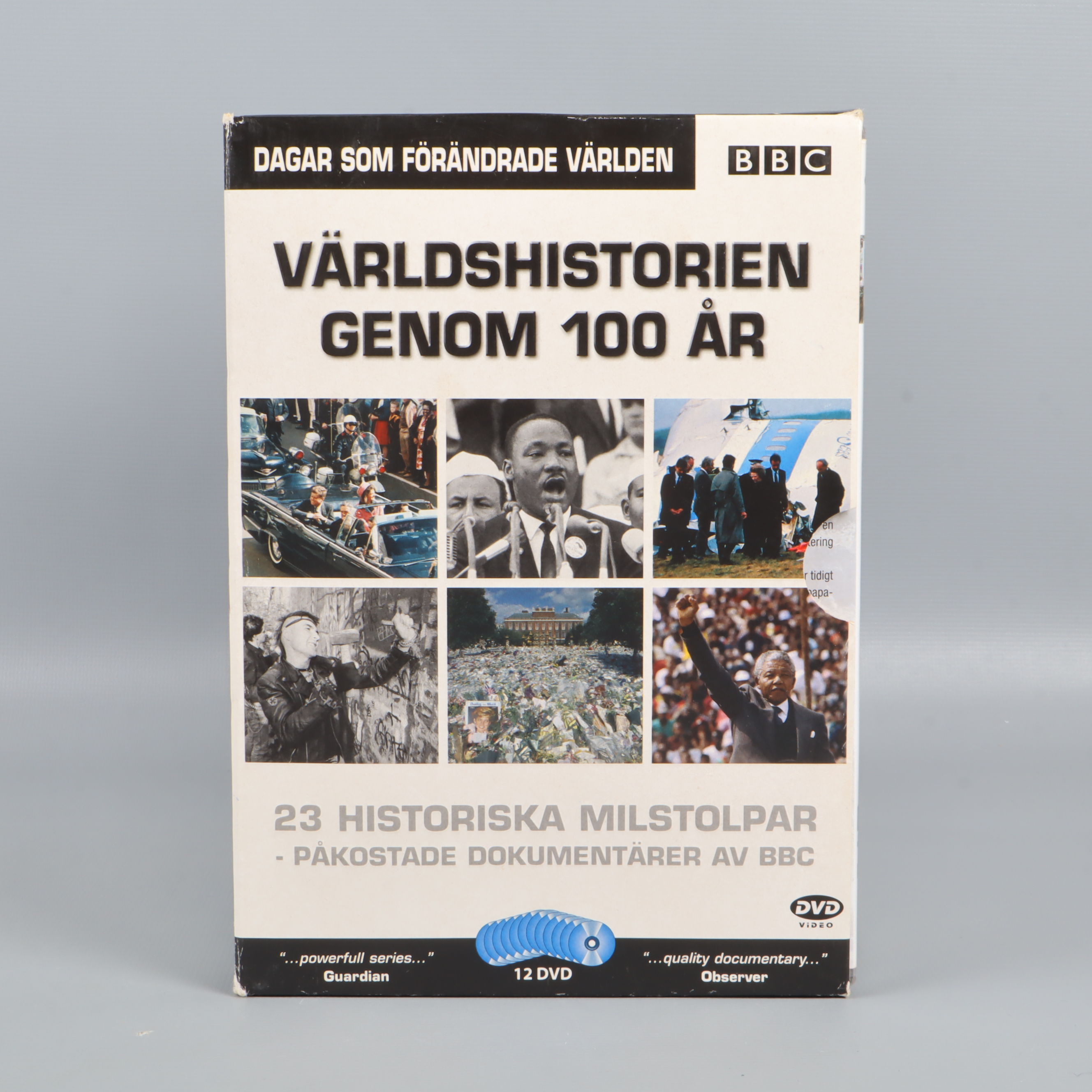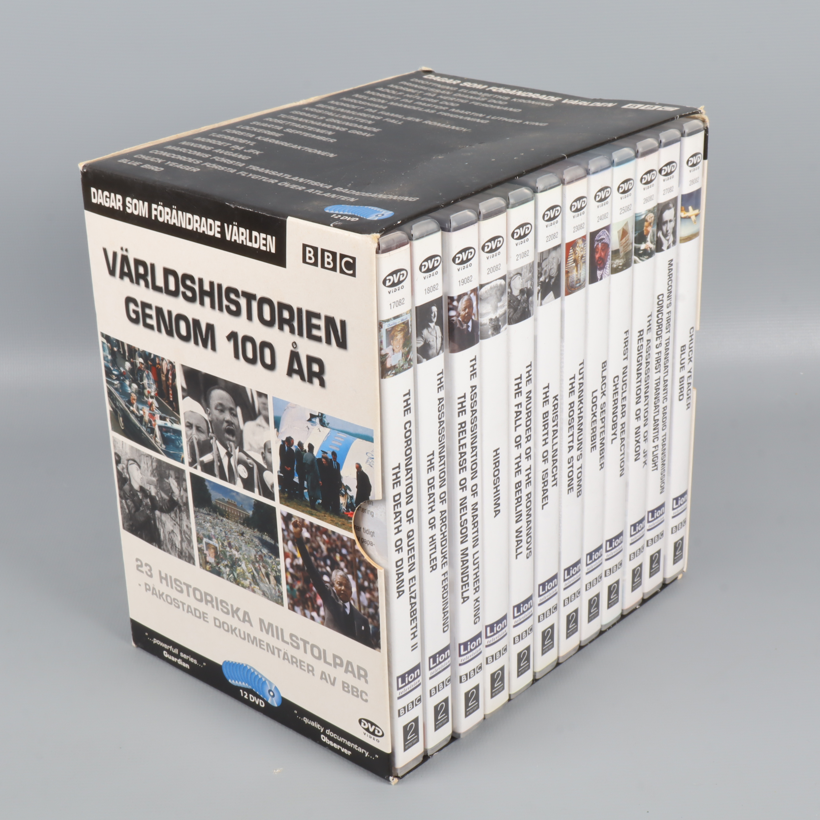 Denna DVD-box, 'Världshistorien genom 100 år', bjuder på en samling av 23 milstolpar som format vår värld, samlade i 12 skivor. Perfekt för dig som är nyfiken på världshistoria och vill fördjupa dig i dokumentärer, där viktiga händelser presenteras på ett inspirerande och pedagogiskt sätt. Boxen innehåller BBC:s omtalade dokumentärserie och ger dig möjlighet att uppleva stunder som drottning Elizabeths kröning, Nelson Mandelas frigivning, Berlinmurens fall och mycket mer – allt samlat i en och samma kartong.