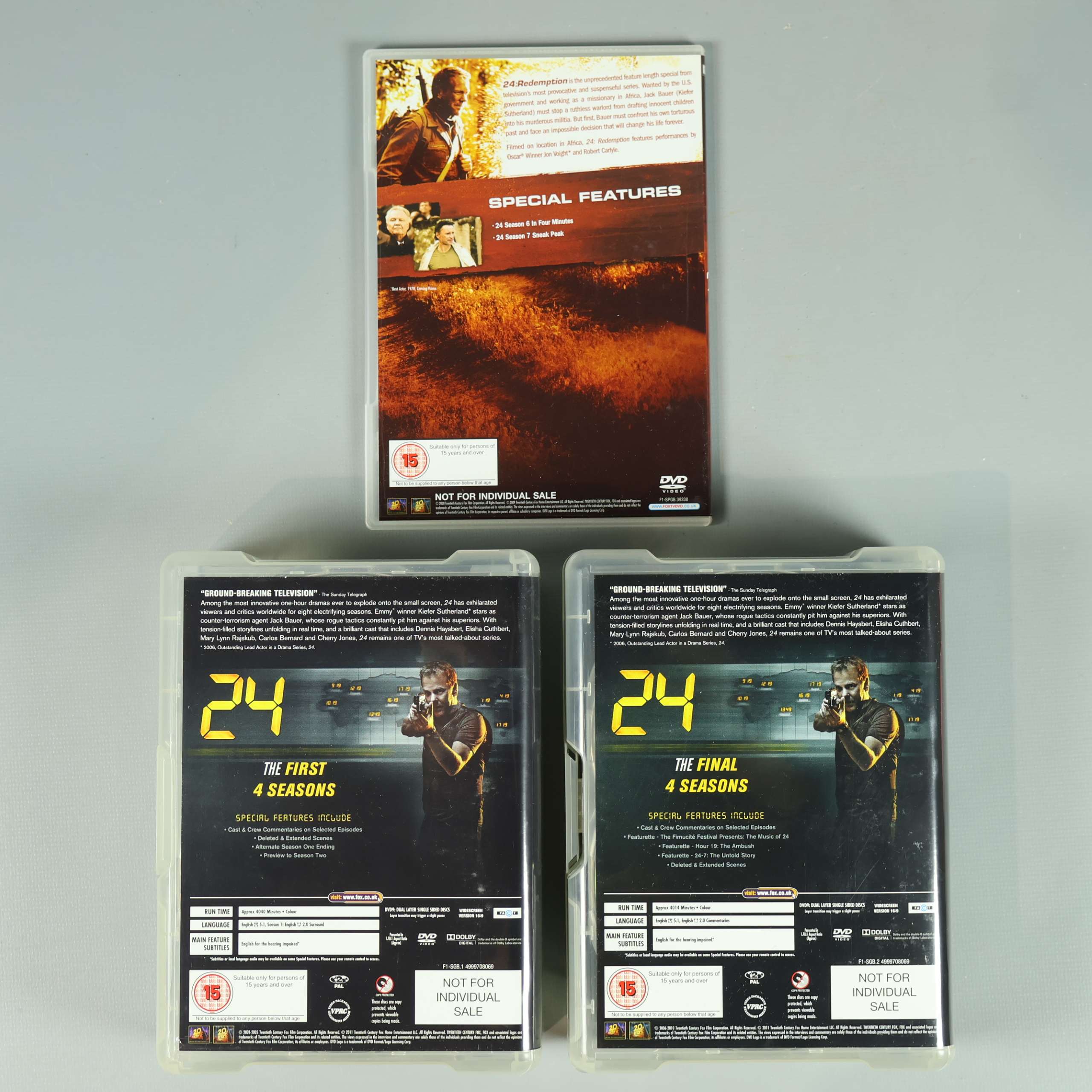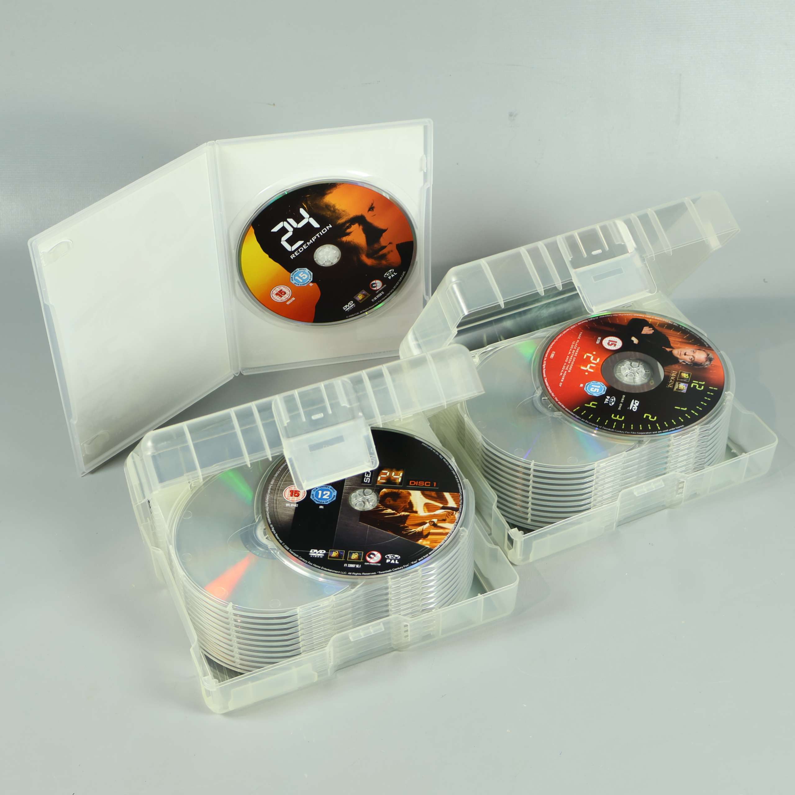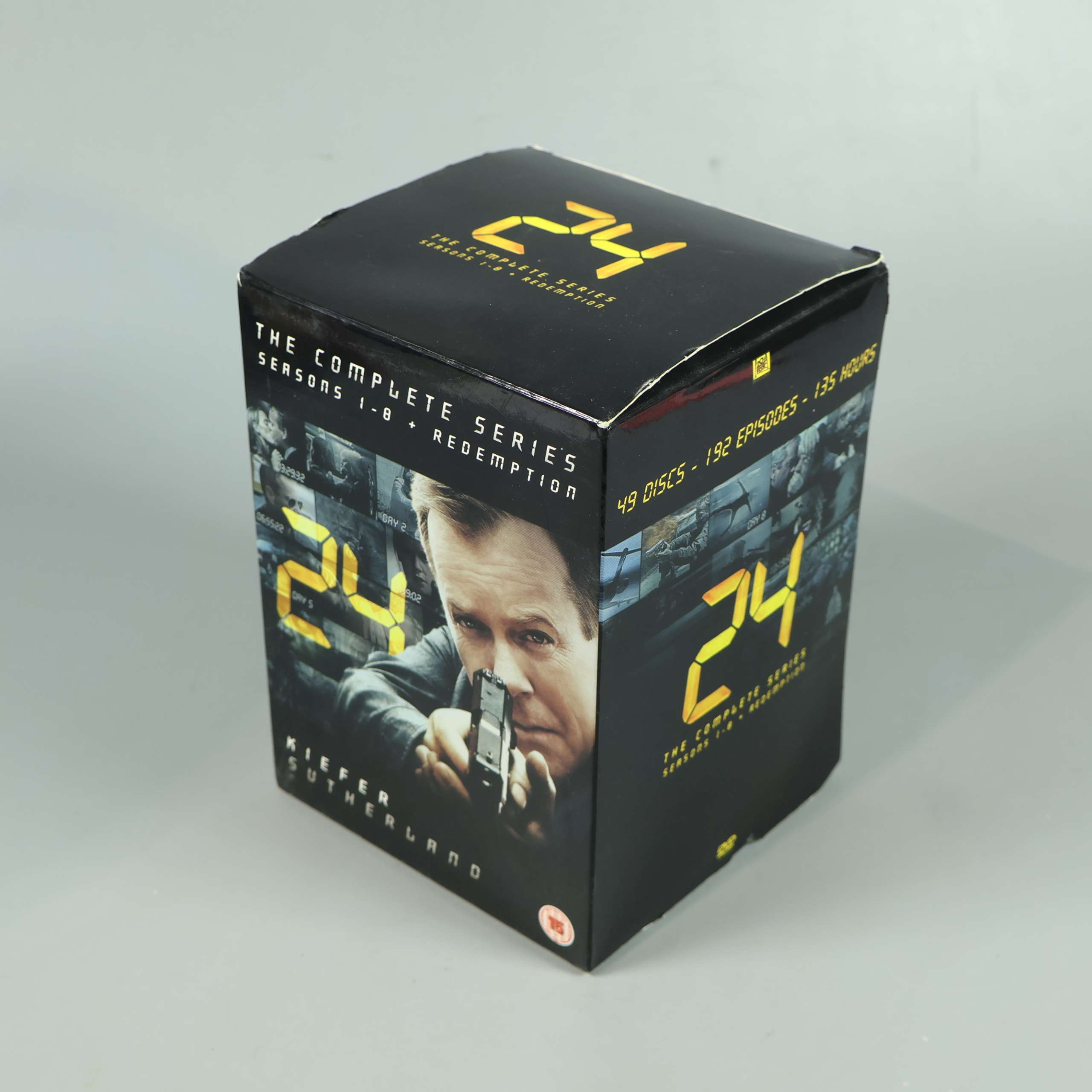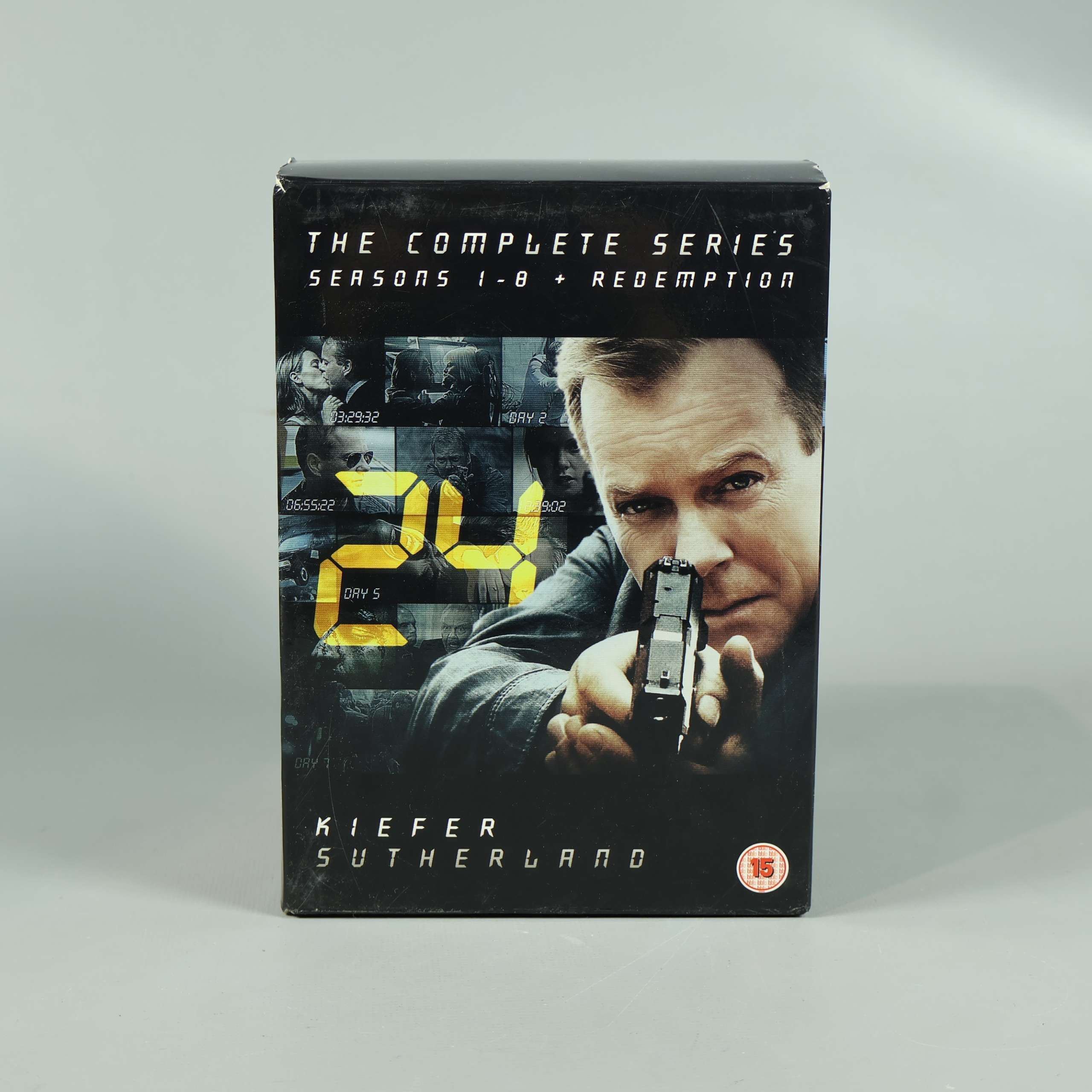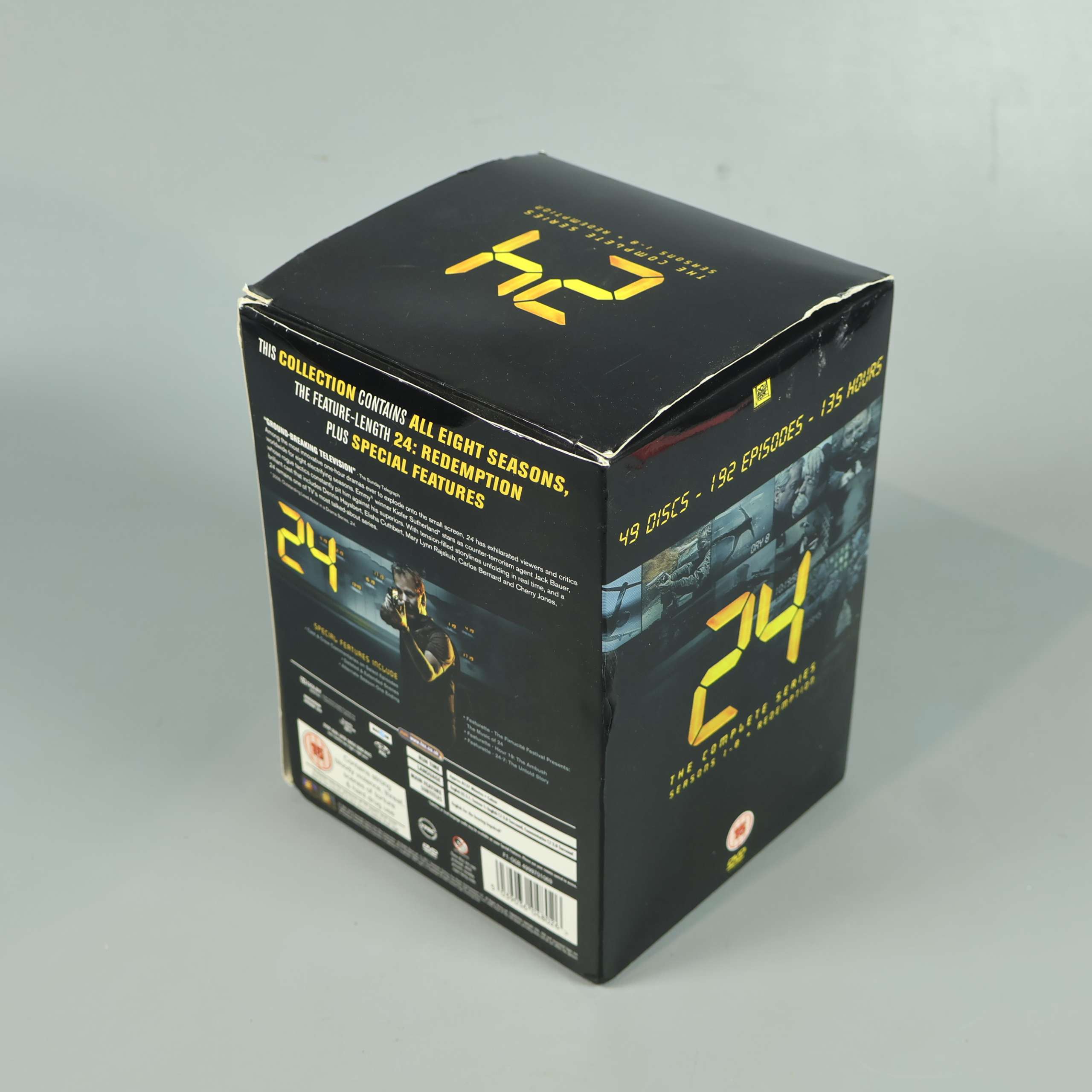 Upptäck alla åtta säsonger av den prisbelönta tv-serien 24, samt specialfilmen Redemption, samlade i denna kompletta DVD-box. Boxen innehåller hela serien med spännande avsnitt som följer den intensiva vardagen för Jack Bauer, spelad av Kiefer Sutherland. Förpackningen är robust och består av två plastfodral och ett separat fodral för filmen Redemption, vilket ger en praktisk och organiserad förvaring av skivorna. Fodralets design har tydliga, kontrasterande färger och stark grafik med klara gula siffror mot en mörk bakgrund, vilket ger en modern och actionfylld känsla. Detta set innehåller 49 DVD-skivor, vilket ger många timmars underhållning för alla fans av action, spänning och drama. Serien är perfekt att se om eller upptäcka för första gången, och boxen blir ett snyggt tillskott till dvd-hyllan – både för samlare och nya tittare.