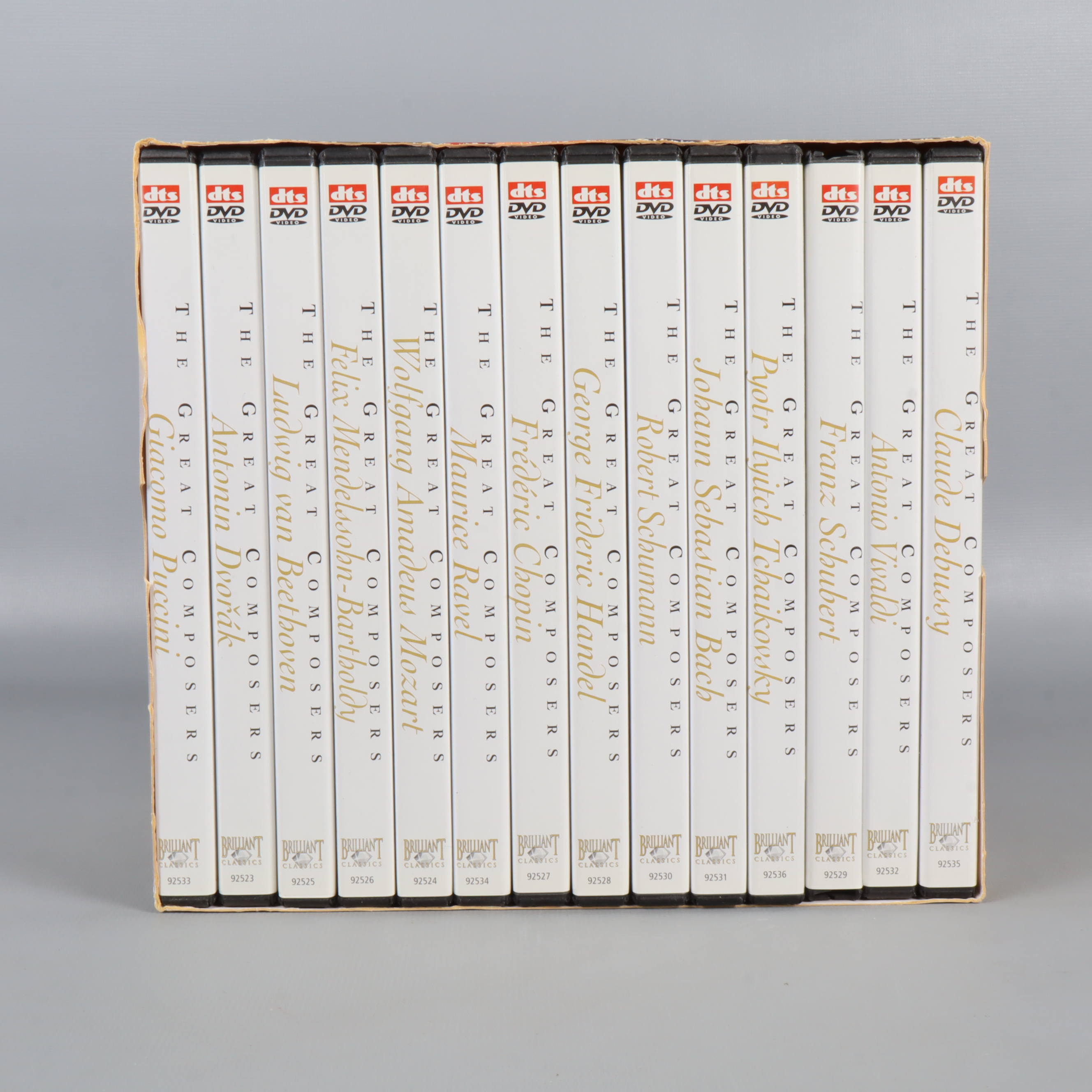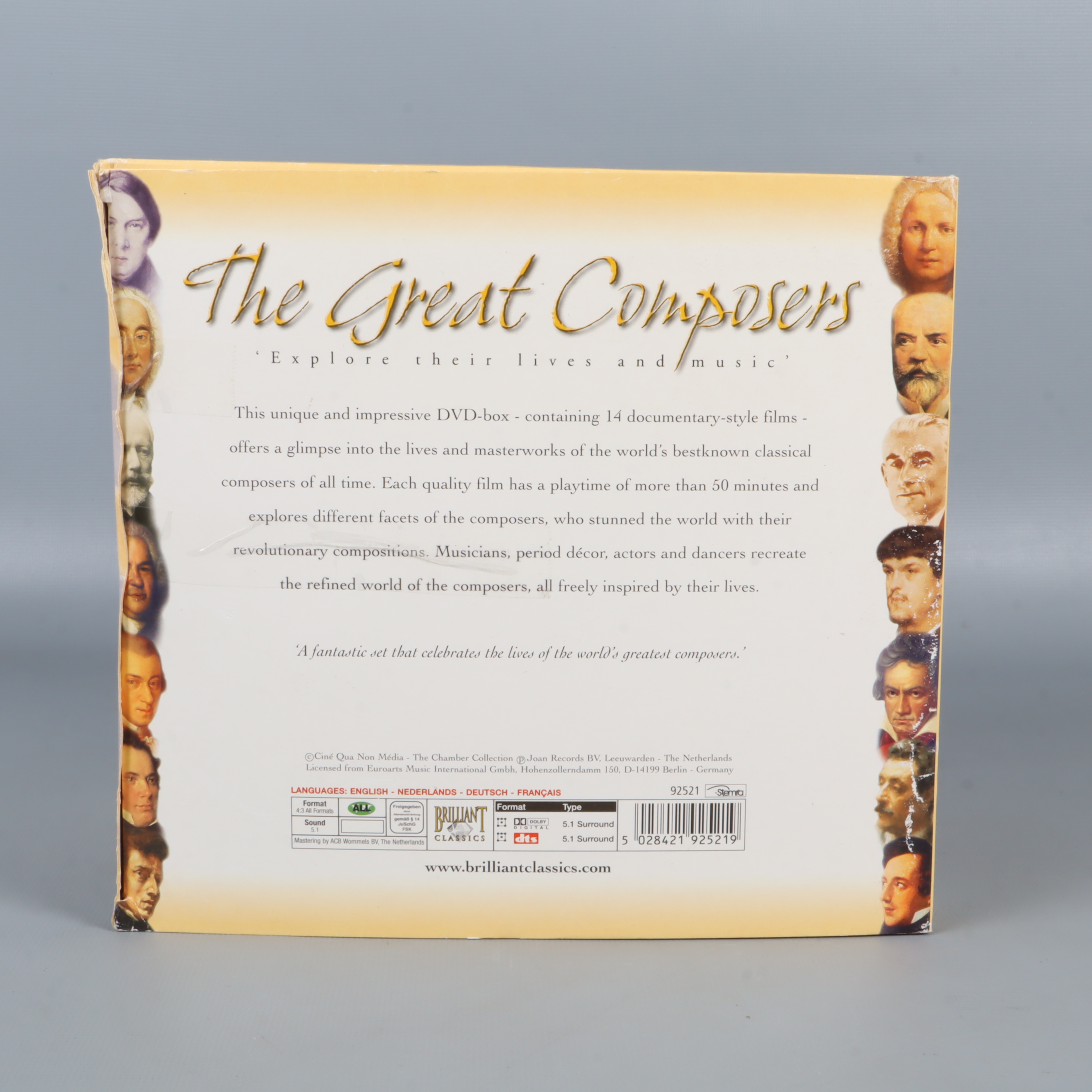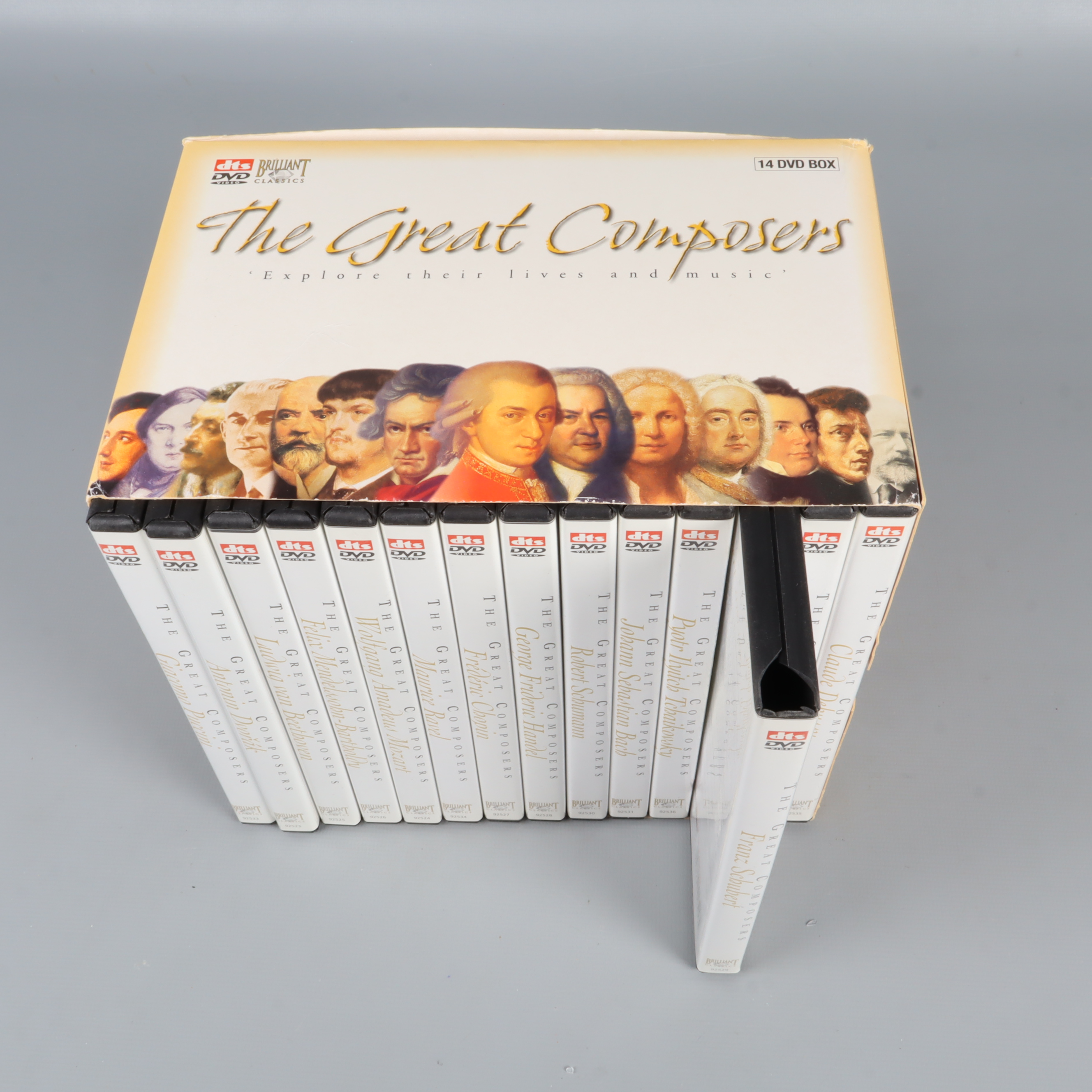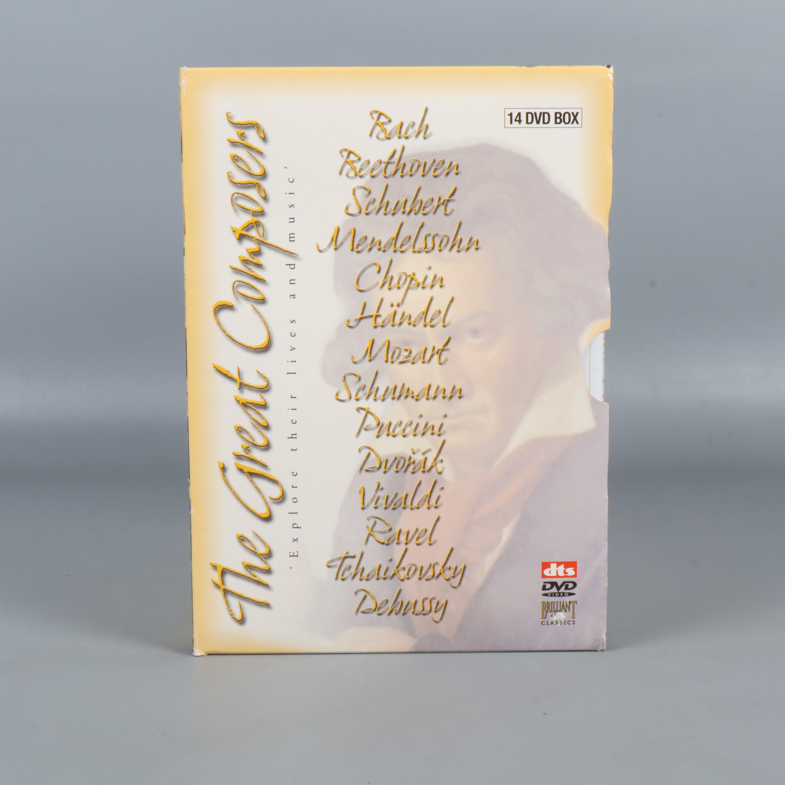 DVD-paket - The Great Composers - 14 DVD Set 449 kr Product variation Antal st Beskrivning Upptäck liv och verk hos världens mest kända klassiska kompositörer med denna imponerande DVD-box. Boxen innehåller 14 dokumentärfilmer, där varje film fördjupar sig i en specifik kompositörs historia och musikaliska arv. Visa all beskrivning Skick Mycket gott skick Produkten är sparsamt använd, är av fin kvalitet och ska inte ha några skador eller förslitningar. Läs mer om hur vi bedömer Produkten är unik och finns enbart som 1 st i lager. Fri frakt på alla köp över 990 kr. 14 dagars ångerrät.