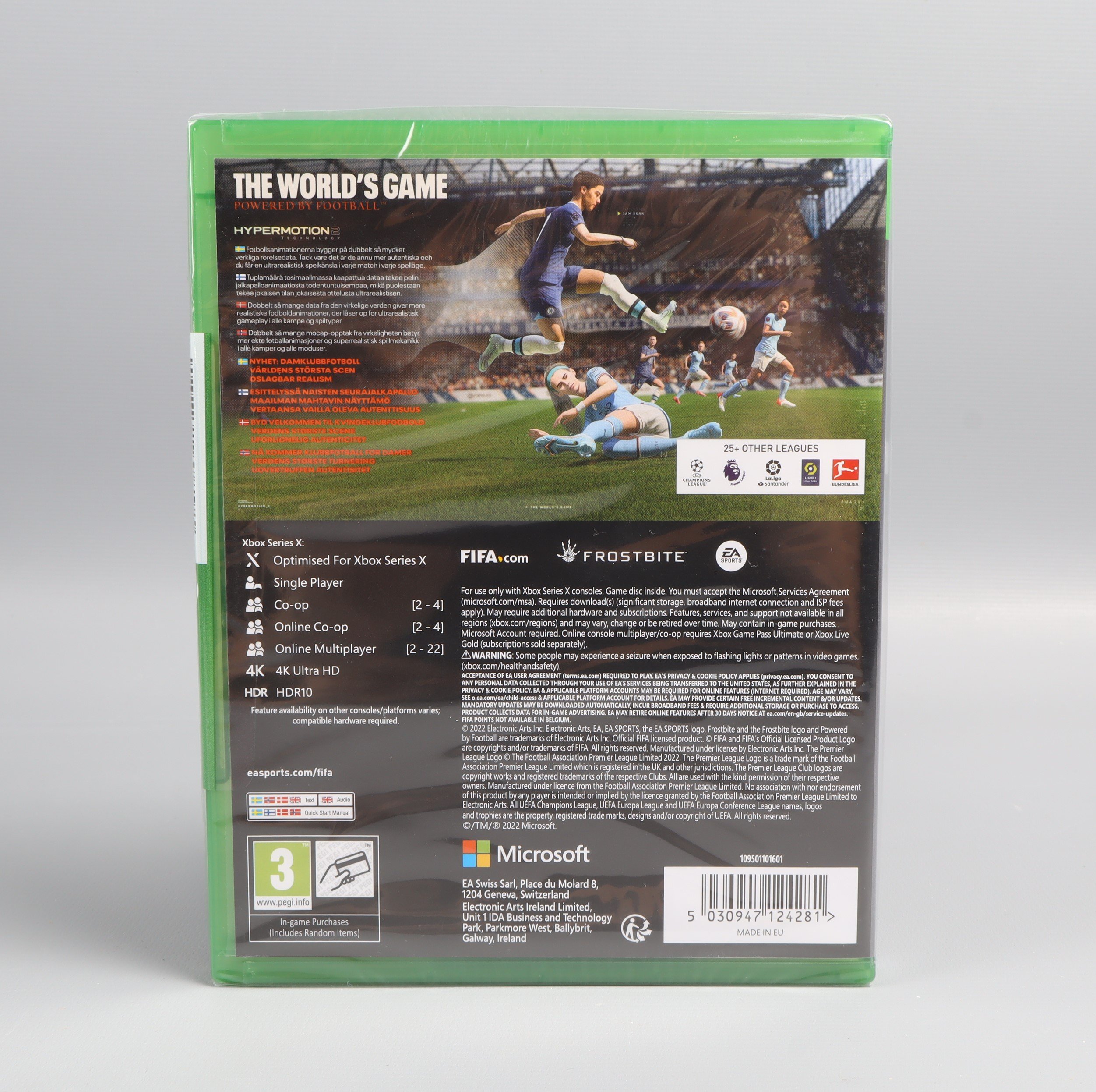Upplev den senaste fotbollsupplevelsen med FIFA 23 för Xbox Series X. Omslaget har modern sportdesign och spelaren i rörelse ger ett dynamiskt intryck. Hård plastfodral med klassiskt Xbox-grönt och tydliga märkningar för officiell FIFA-licens och HyperMotion-teknik. Perfekt för dig som gillar autentiska matcher och snygg grafik.