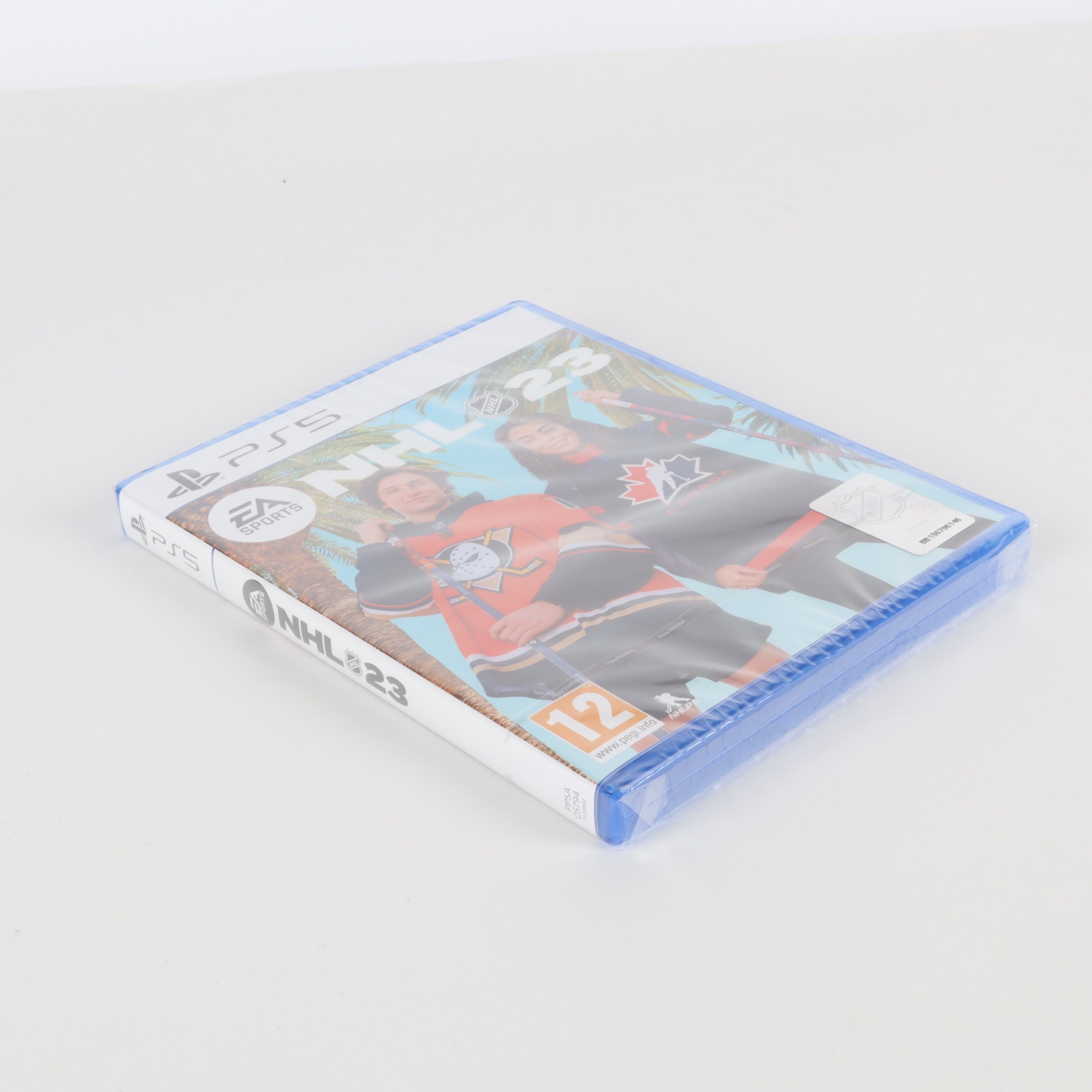NHL 23 är ett ishockeyspel till PlayStation 5 med modern grafik och autentisk känsla. Omslaget visar två hockeyspelare i officiella tröjor och baksidan lyfter fram dynamiskt gameplay och realistiskt lagspel. Spelets förpackning har en blå plastkant och tydliga PS5-märkningar för snabb igenkänning.