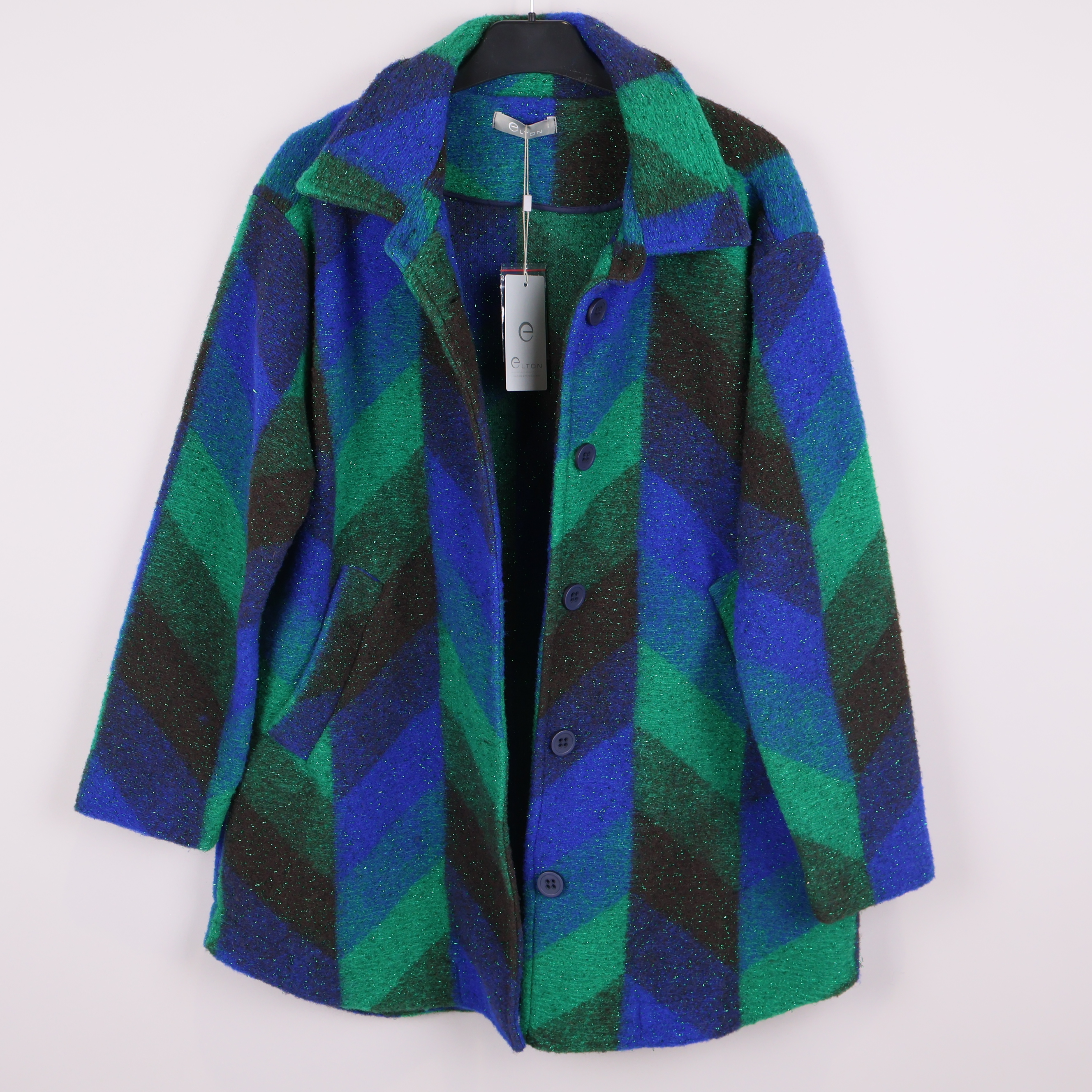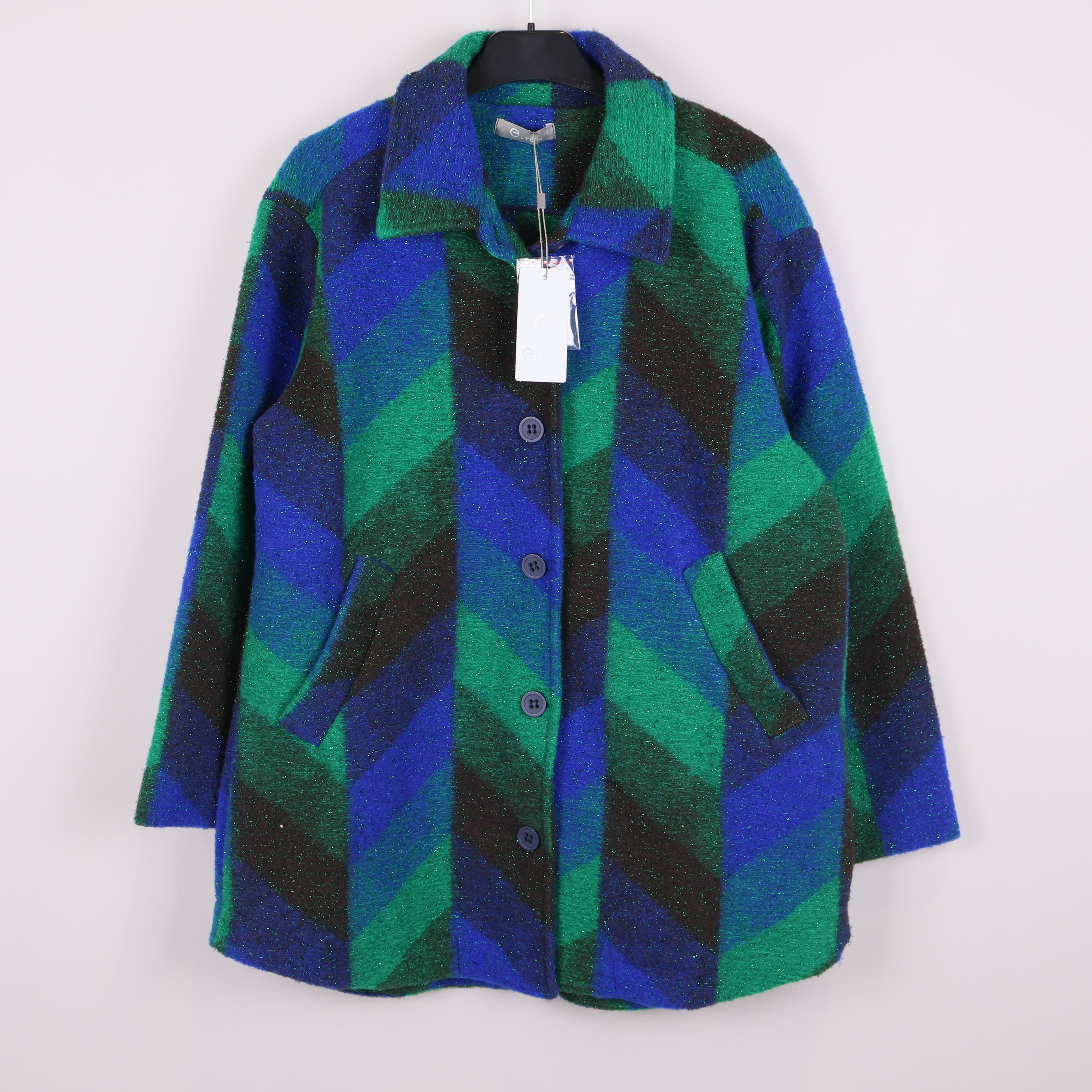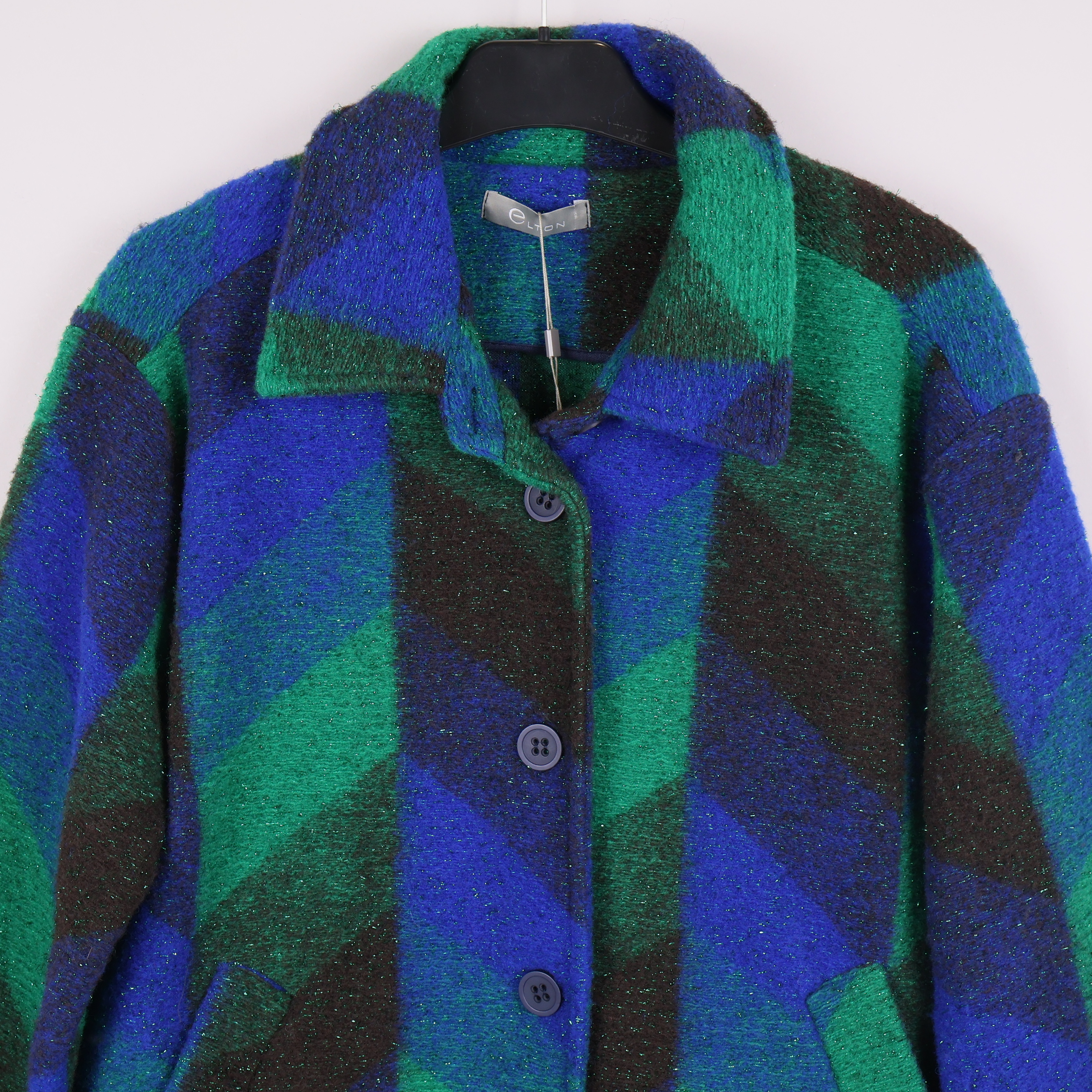 Färgstark jacka med ett grafiskt mönster i blått, grönt och svart. Jackan har en klassisk krage, raka ärmar och knäppning fram med stora knappar med två fickor framtill.