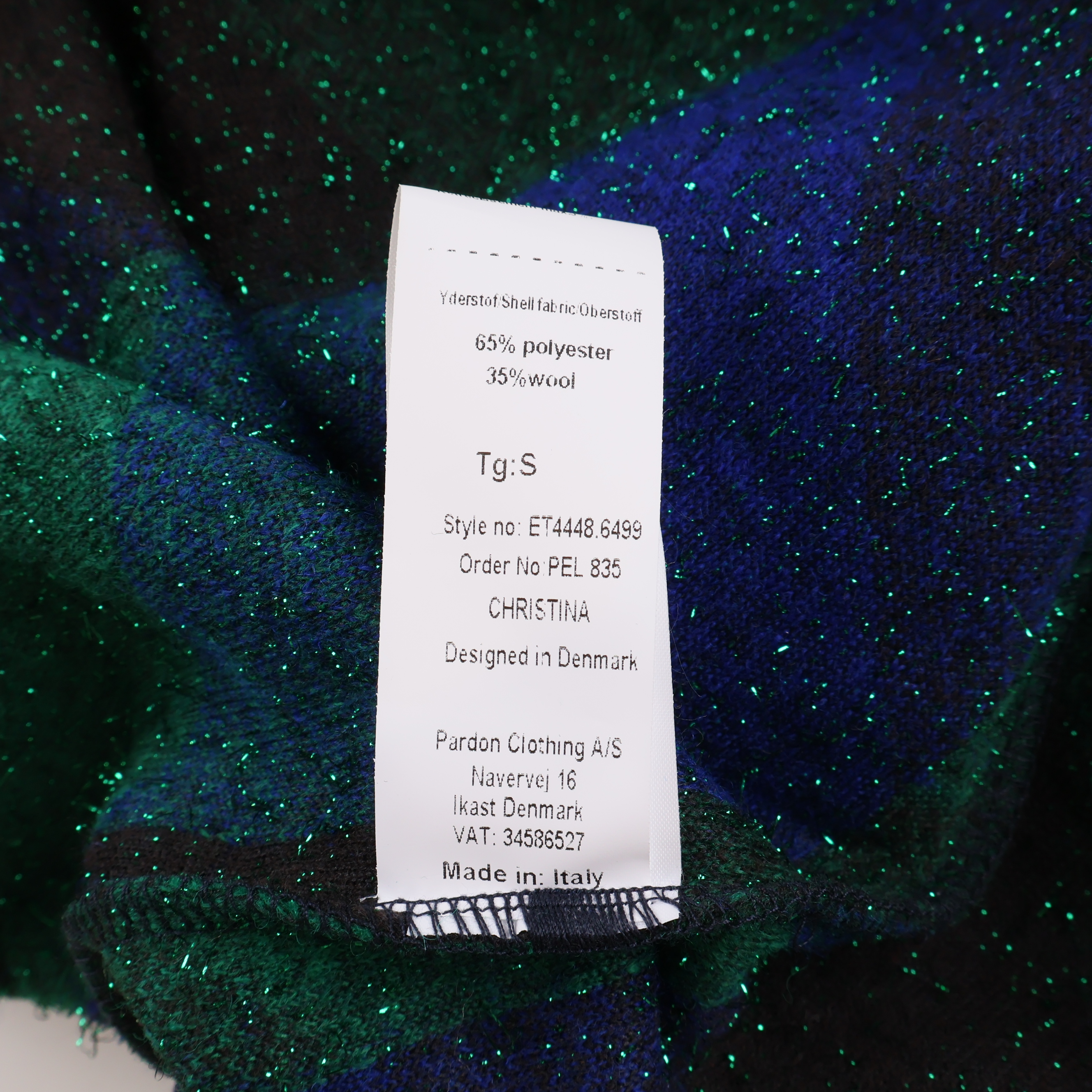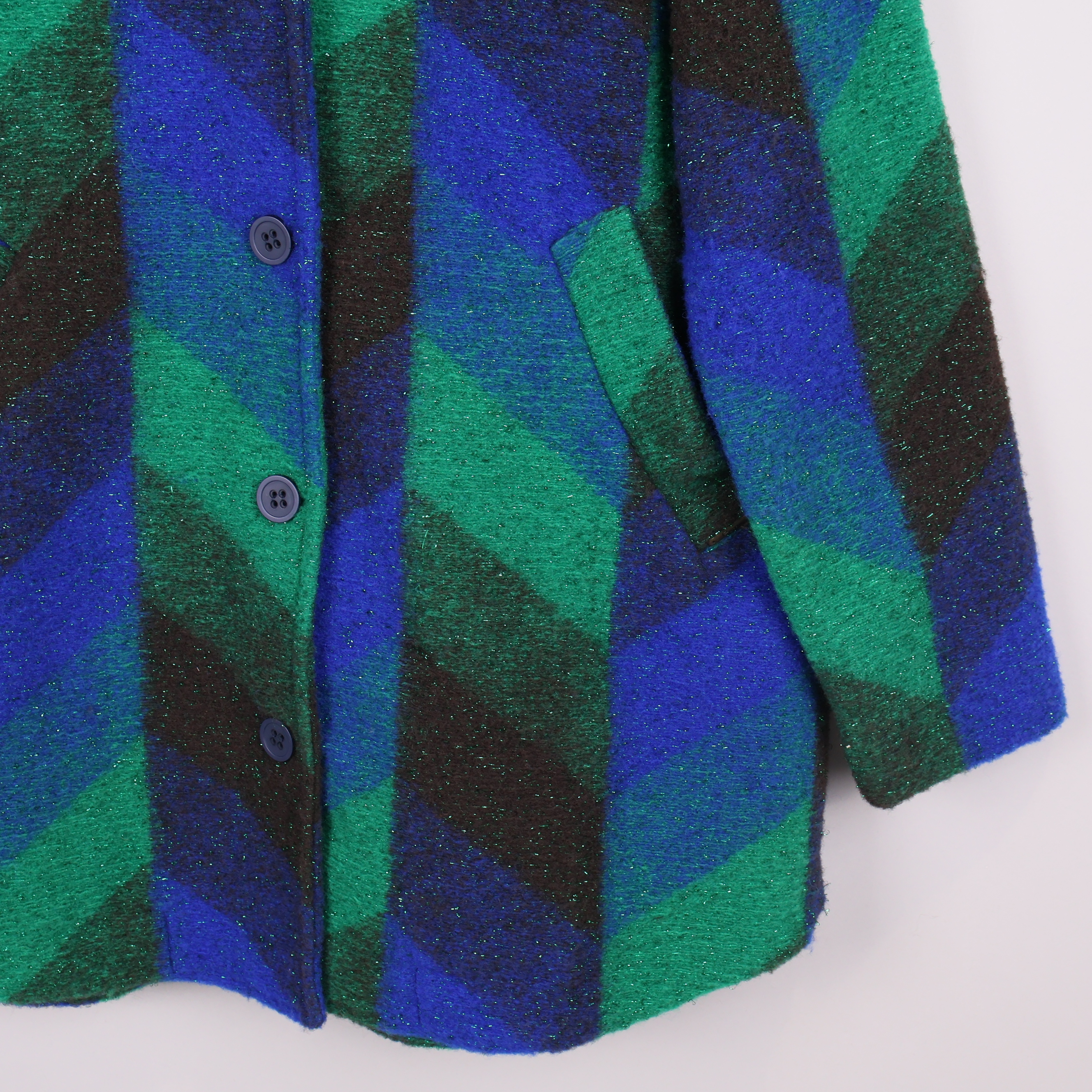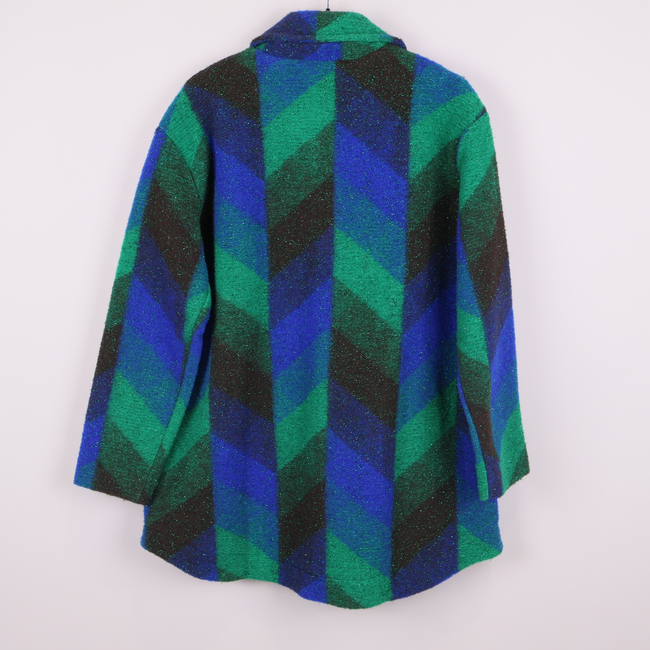 Färgstark jacka med ett grafiskt mönster i blått, grönt och svart. Jackan har en klassisk krage, raka ärmar och knäppning fram med stora knappar med två fickor framtill.
