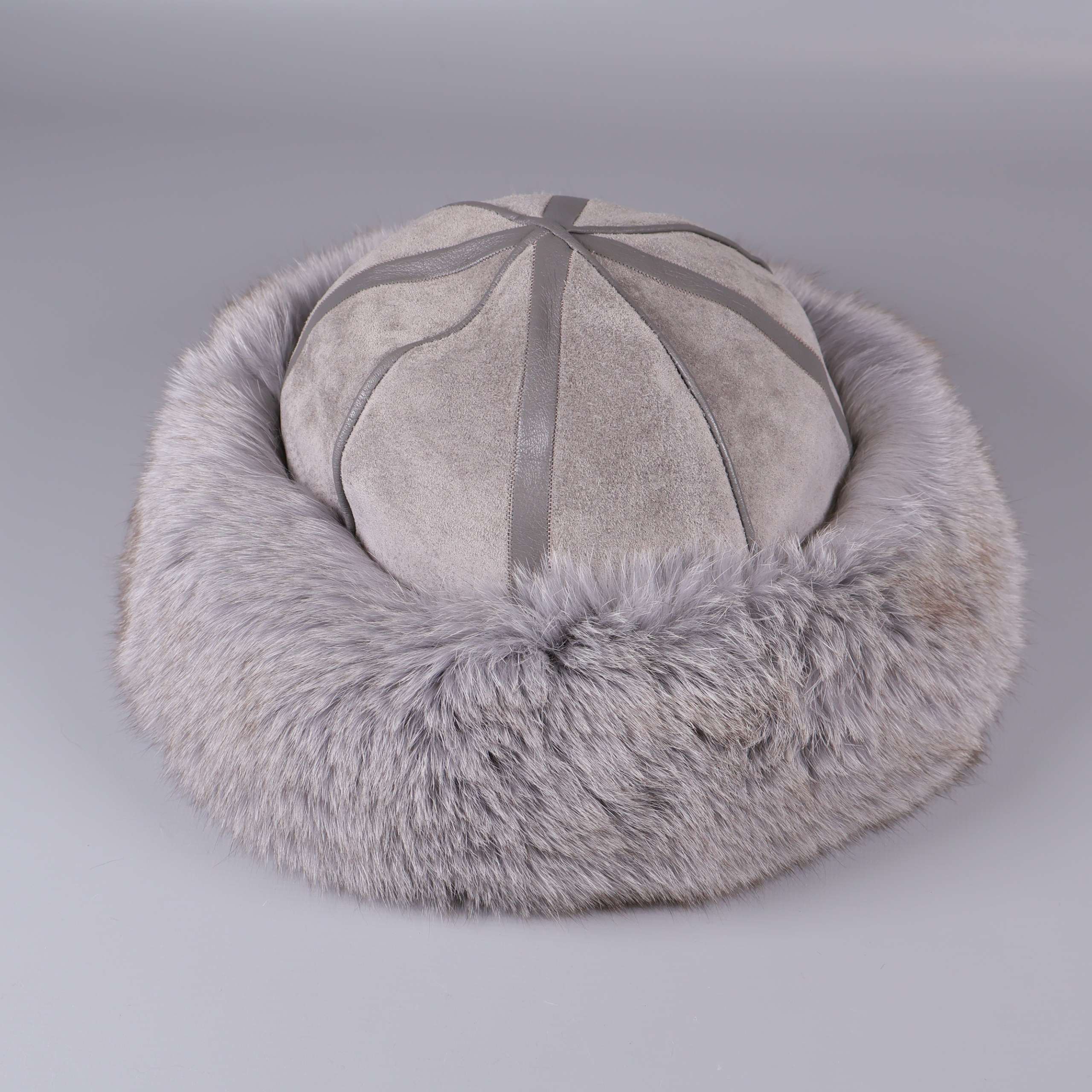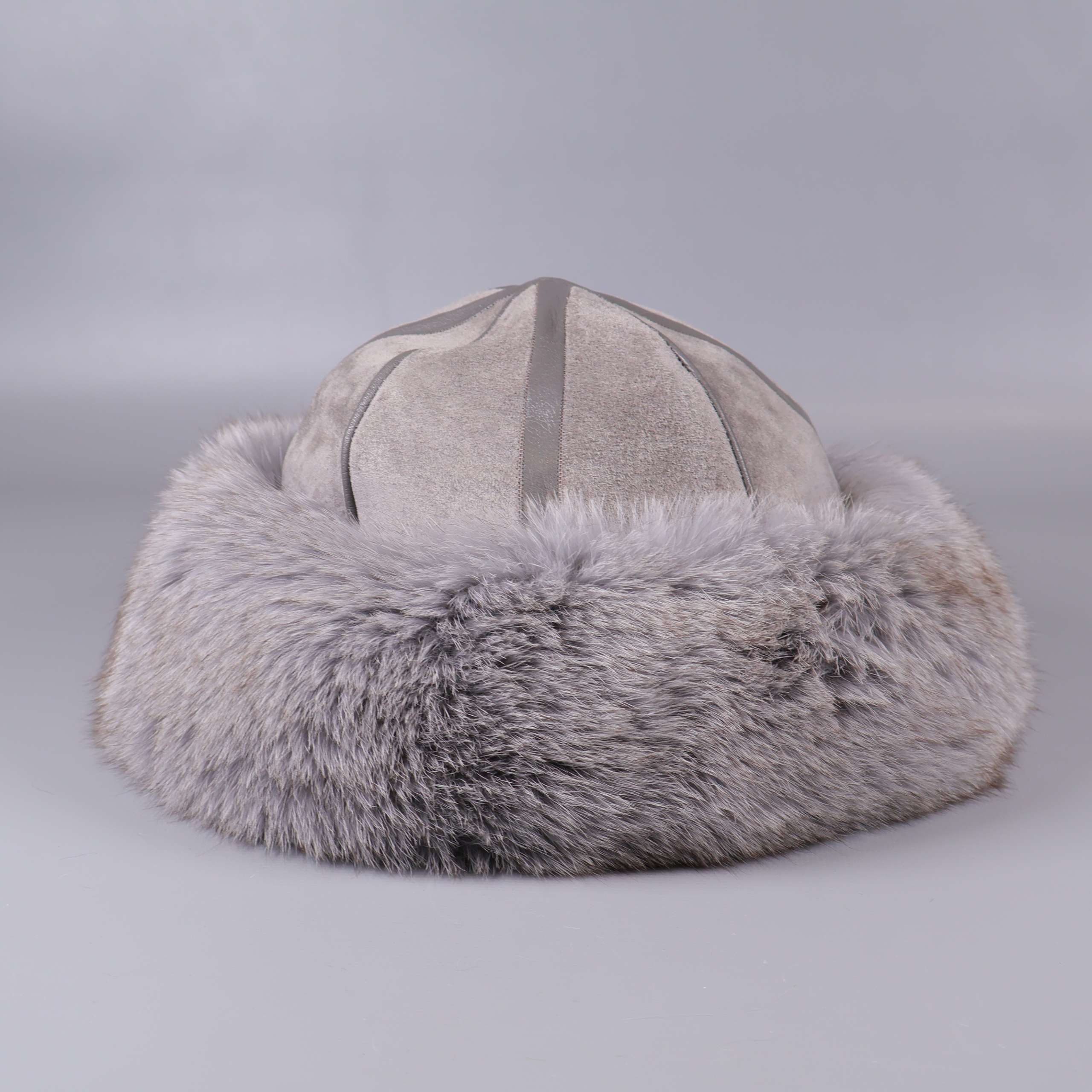 Stilren mössa med mjuk pälskant i ljusgrå nyans och paneler i mockaliknande material. Sitter bekvämt med glansigt innerfoder och bred pälsbräm som ger en klassisk och varm känsla. Passar dig som gillar tidlös design och en lyxig look.