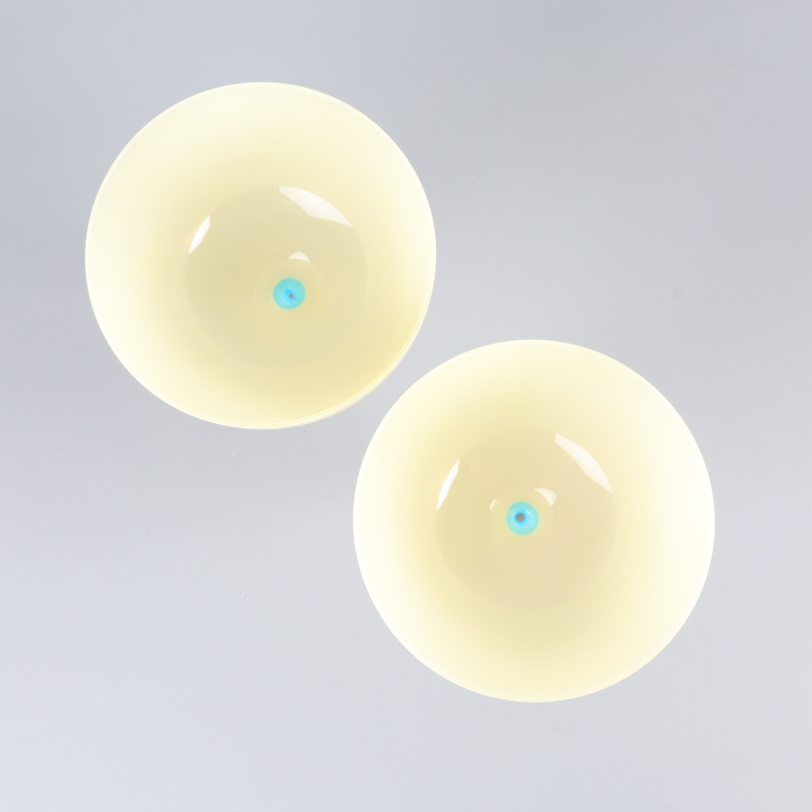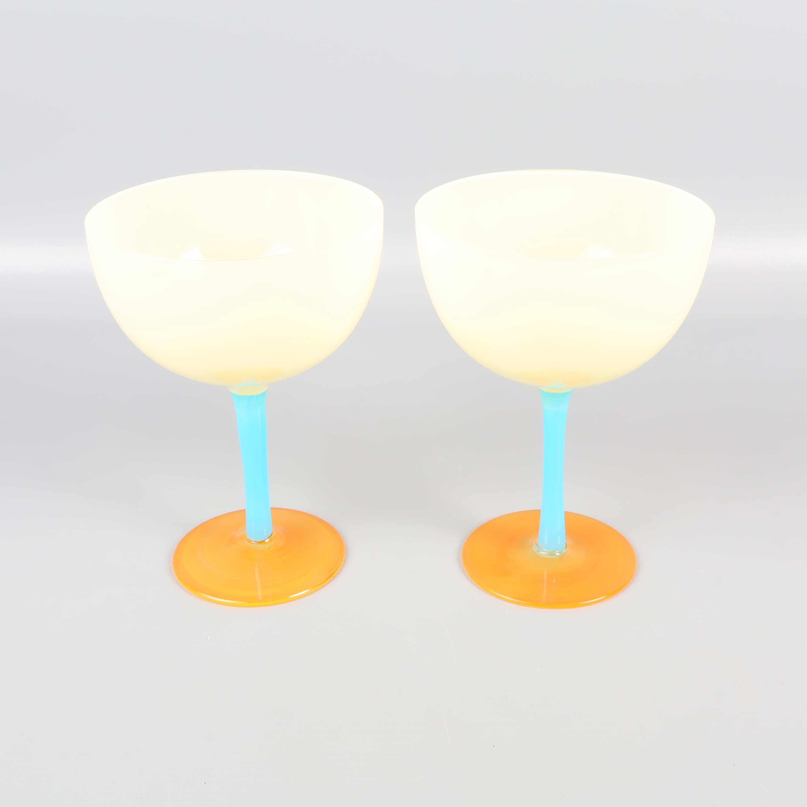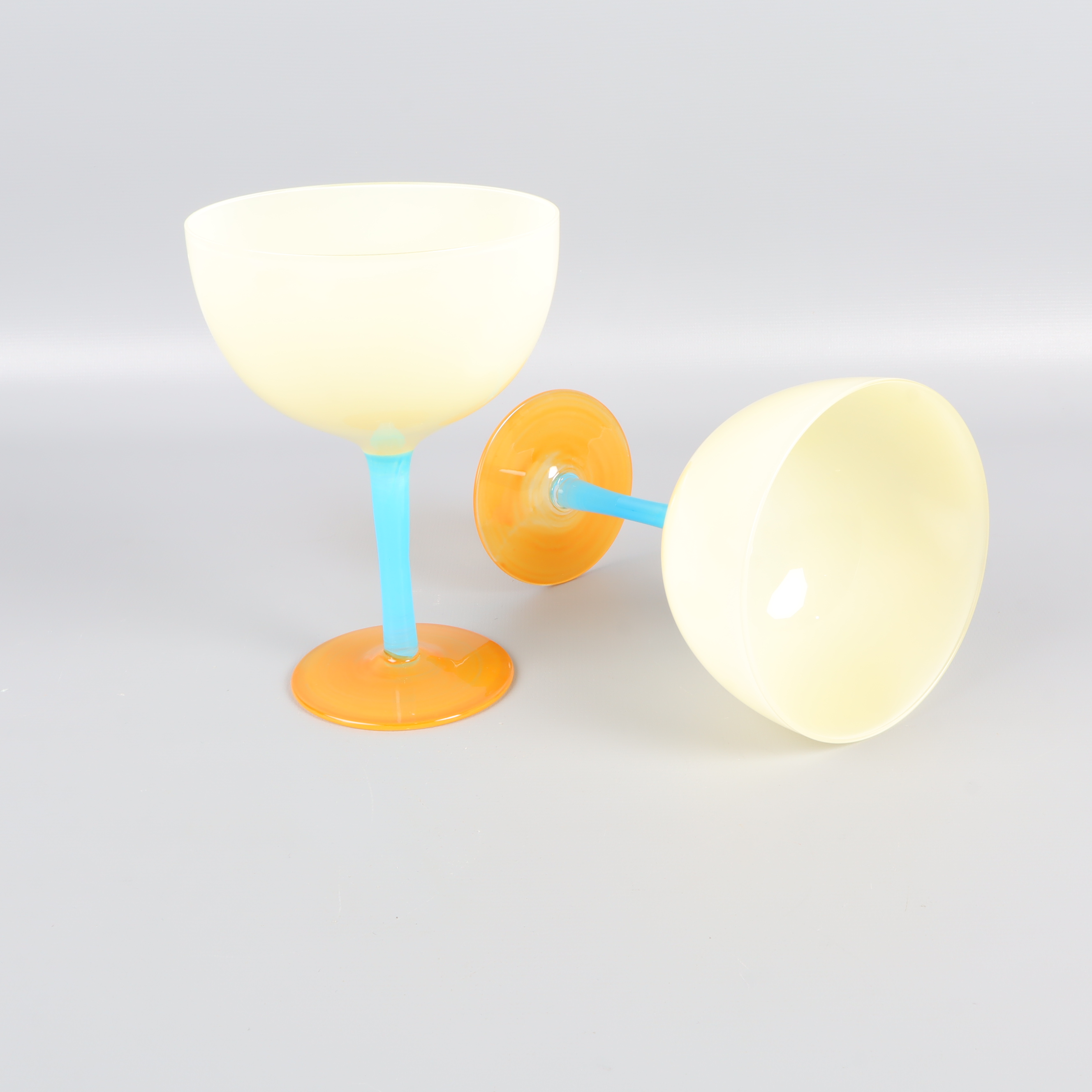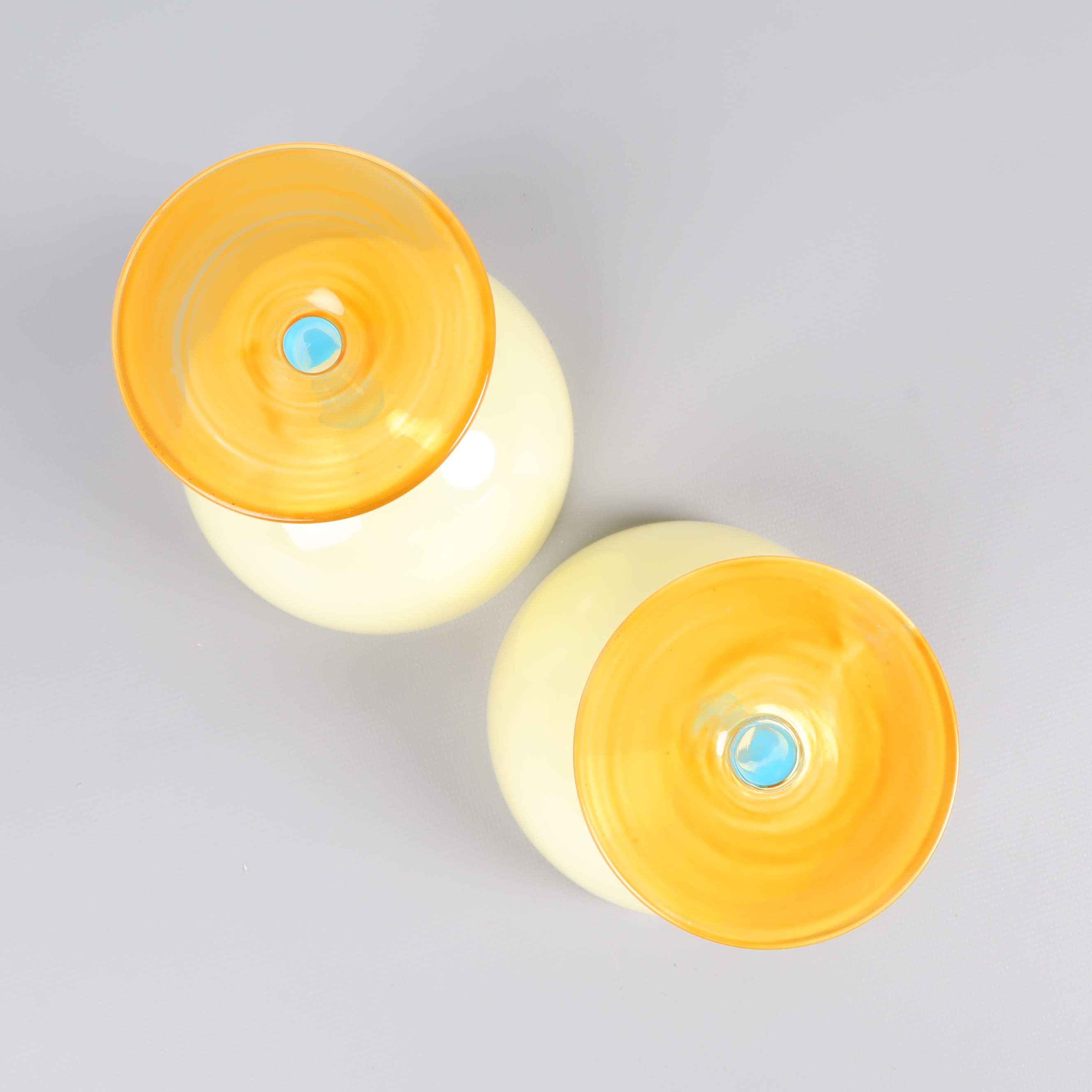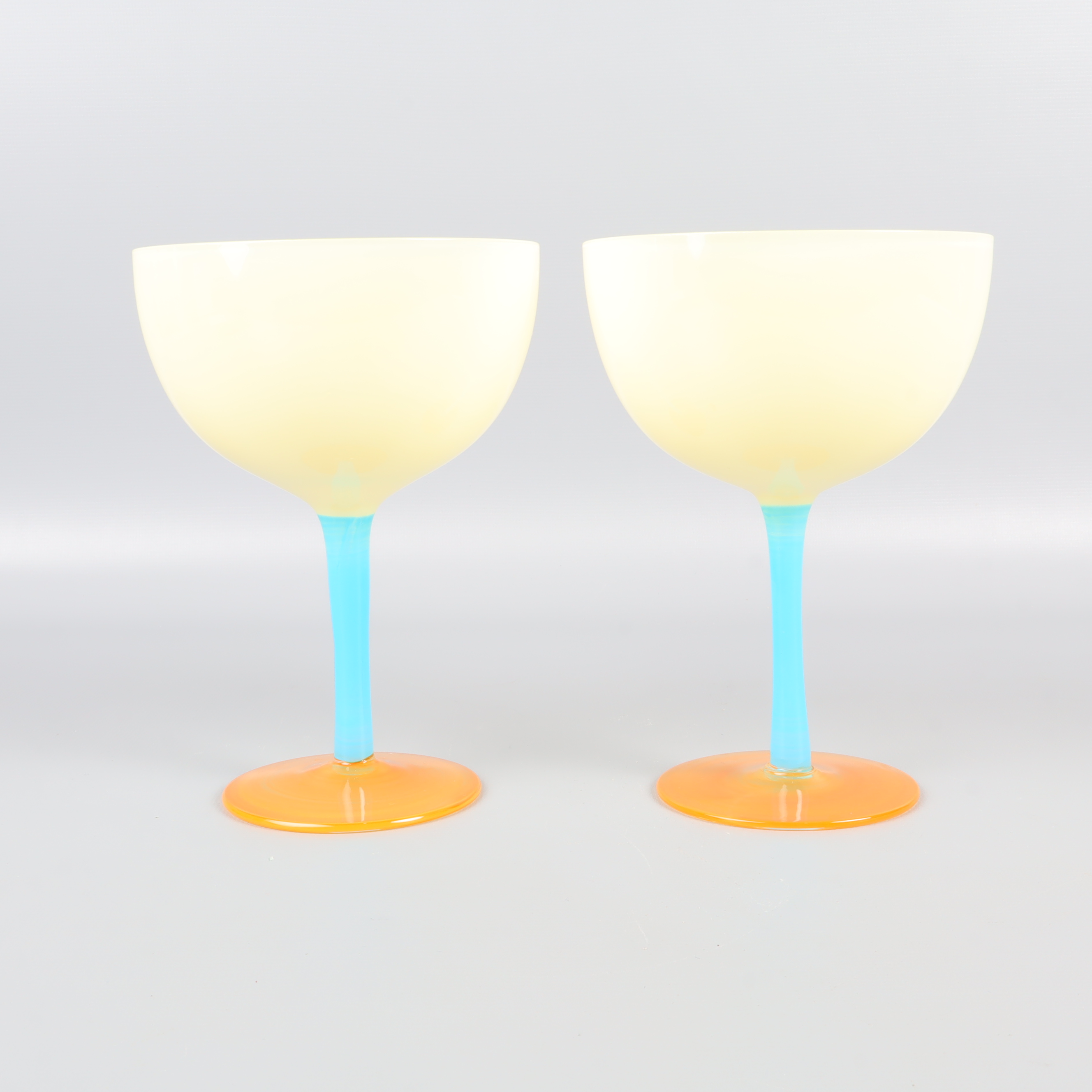Två unika cocktailglas med bred, ljusgul kupa som vilar på en turkos fot och en orange bas. Skapar ett lekfullt uttryck på bordet och ger en retro-inspirerad känsla. Perfekt för dig som gillar både färg och modern stil.