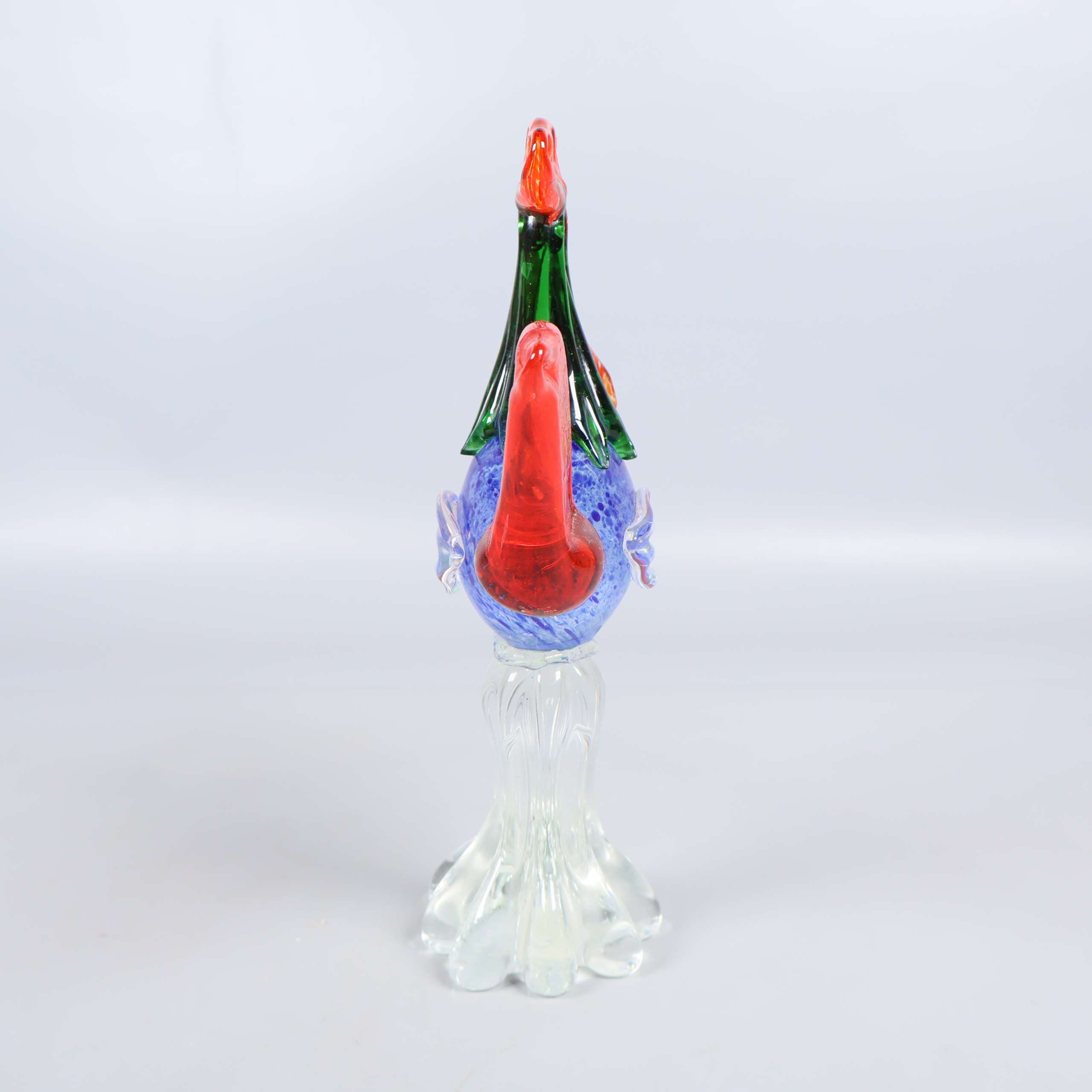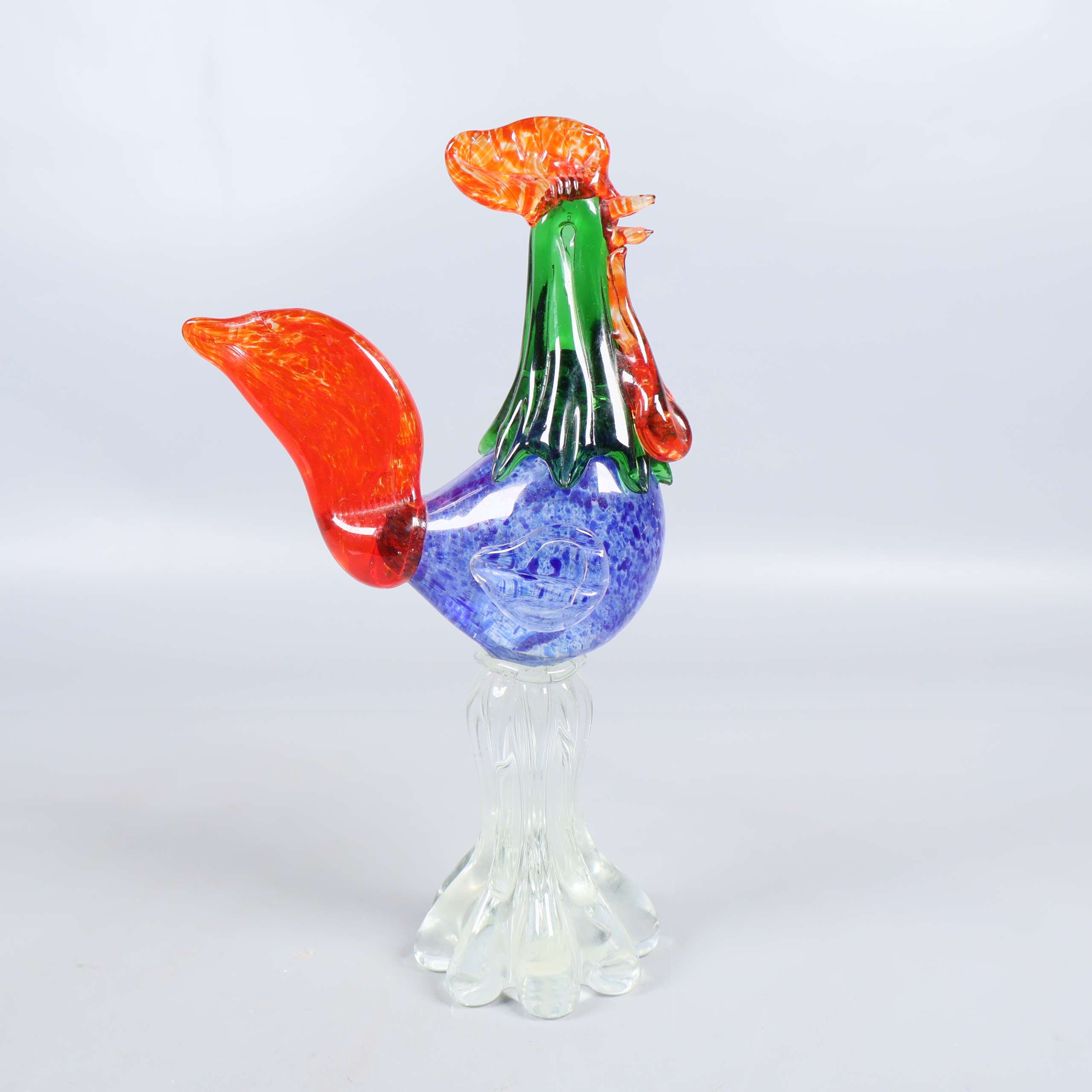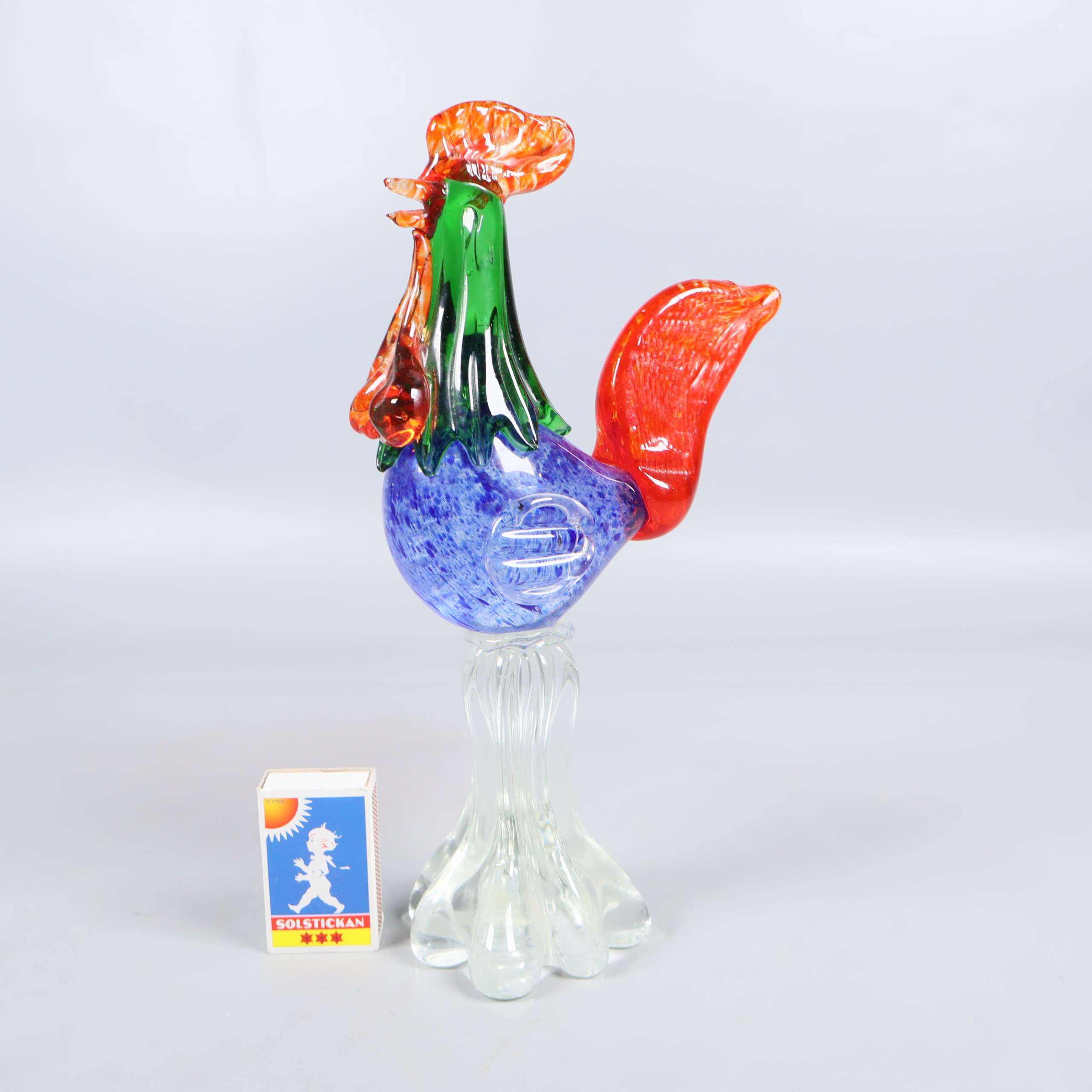 Unik och färgstark dekorationsfigur i glas, formad som en tupp med detaljer i orange, grön, röd och blå. Den transparenta foten ger ett lekfullt och samtida uttryck, perfekt för dig som gillar konstnärliga accentdetaljer hemma. Tunga dekorationen står stadigt tack vare sin breda bas.