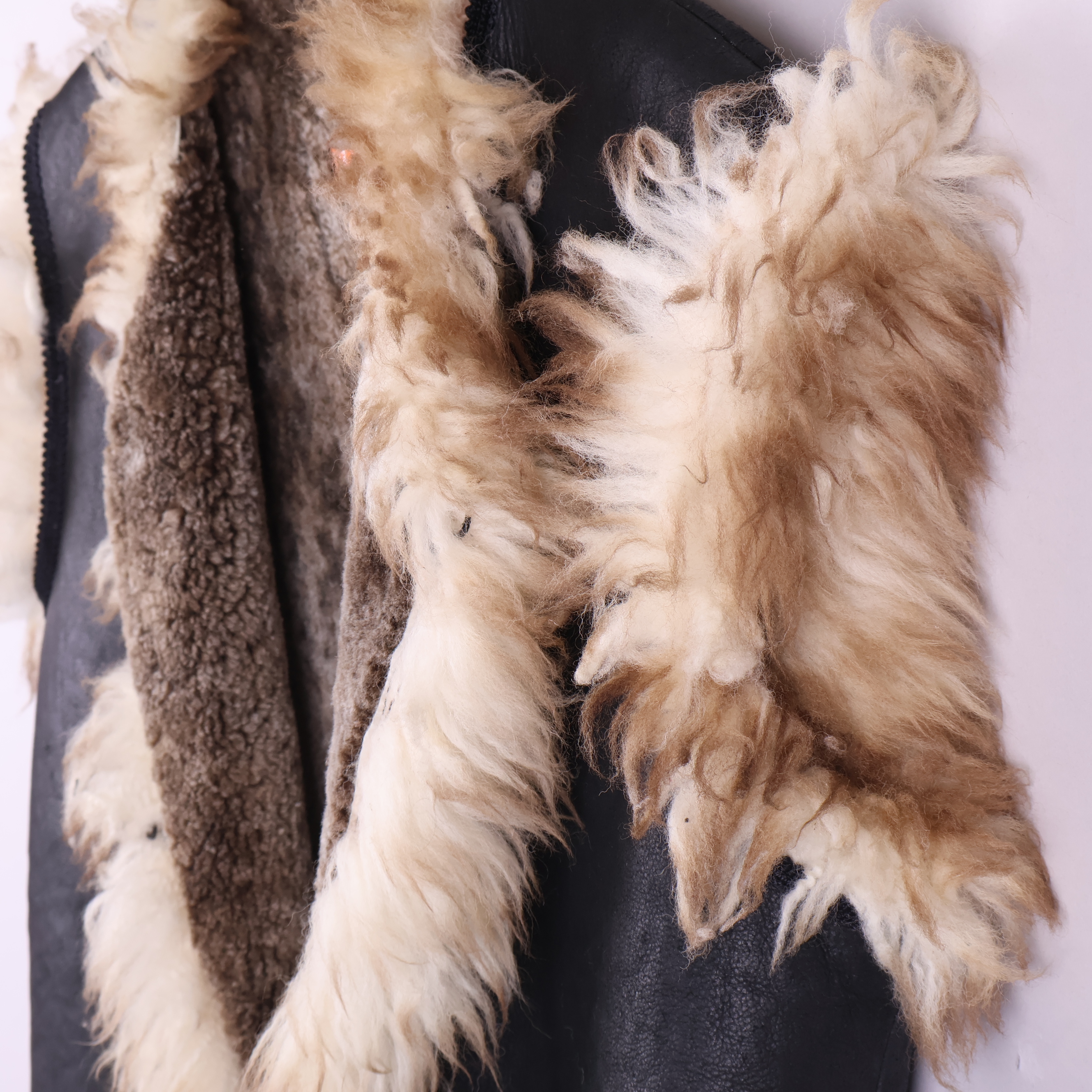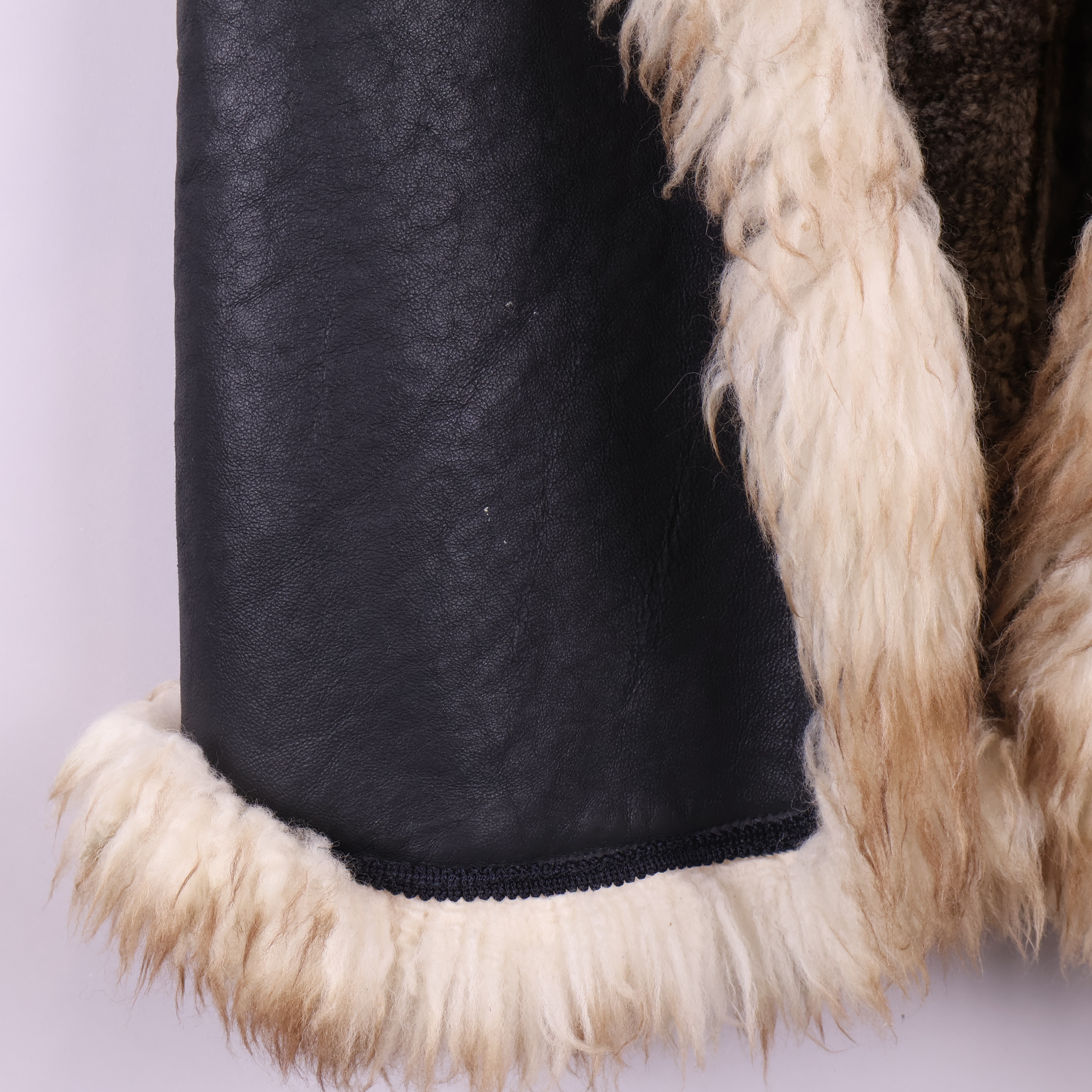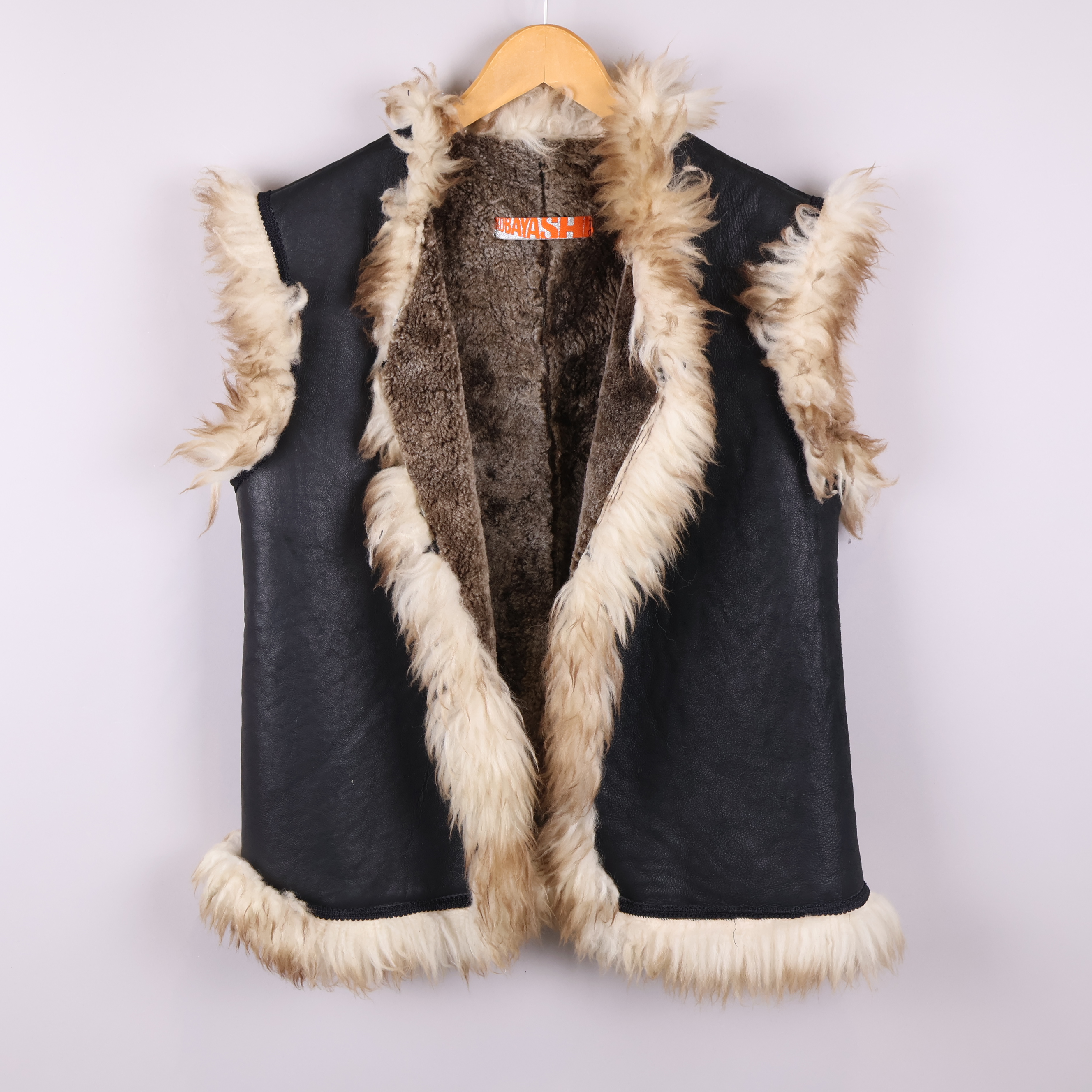 Unik väst i mörk nyans med mjuk, äkta fårskinnskant som ger en ombonad och trendig känsla. Insidan är fodrad med lammull för extra komfort. Öppna kanter utan knäppning och tydlig vintage vibe tack vare kombinationen av brun imitation mocka och kontrasterande ljus päls.