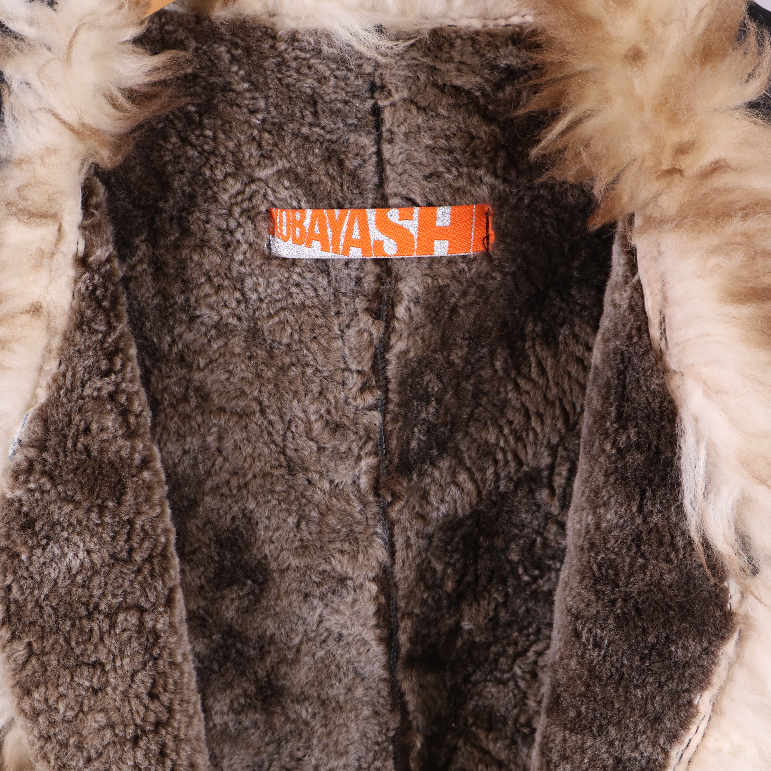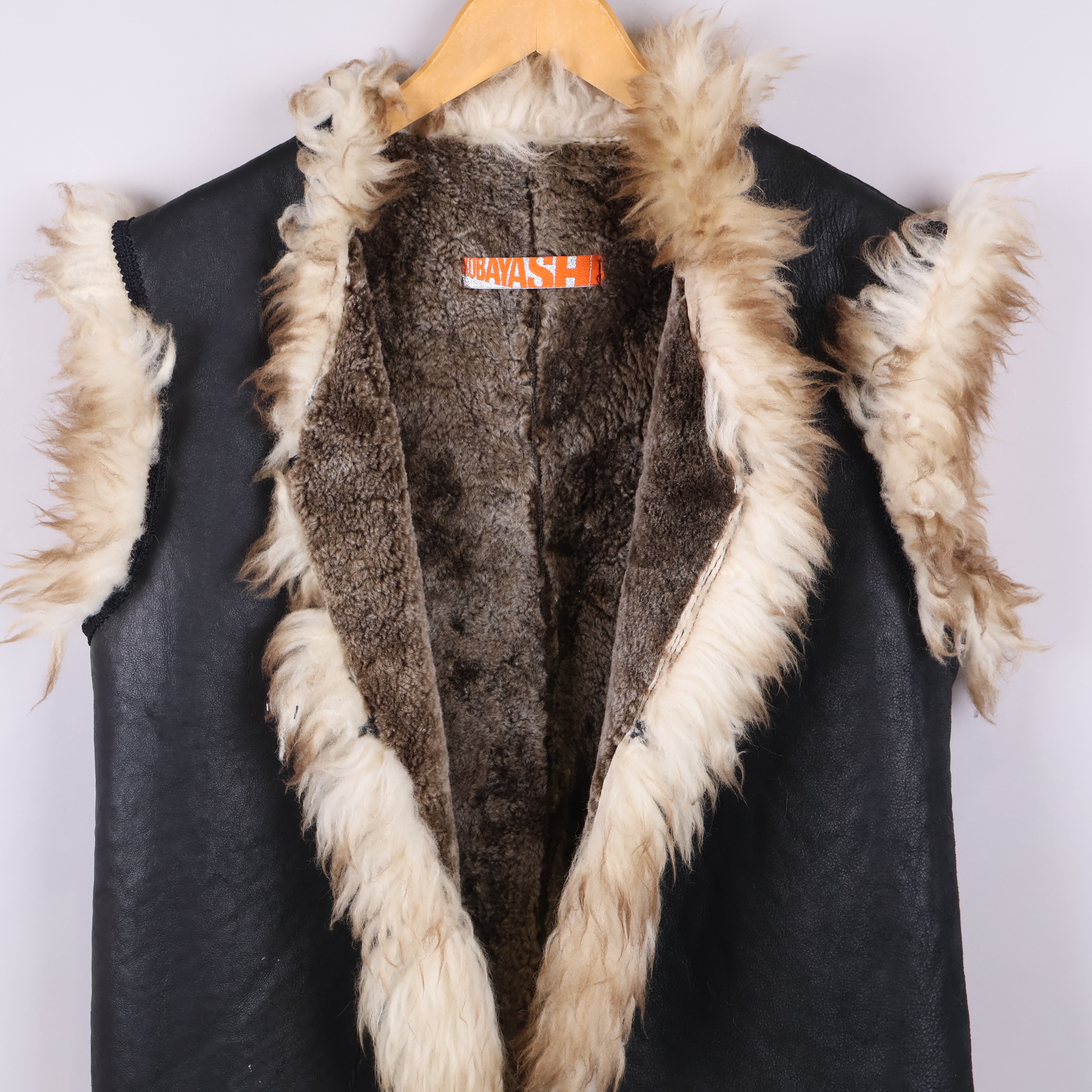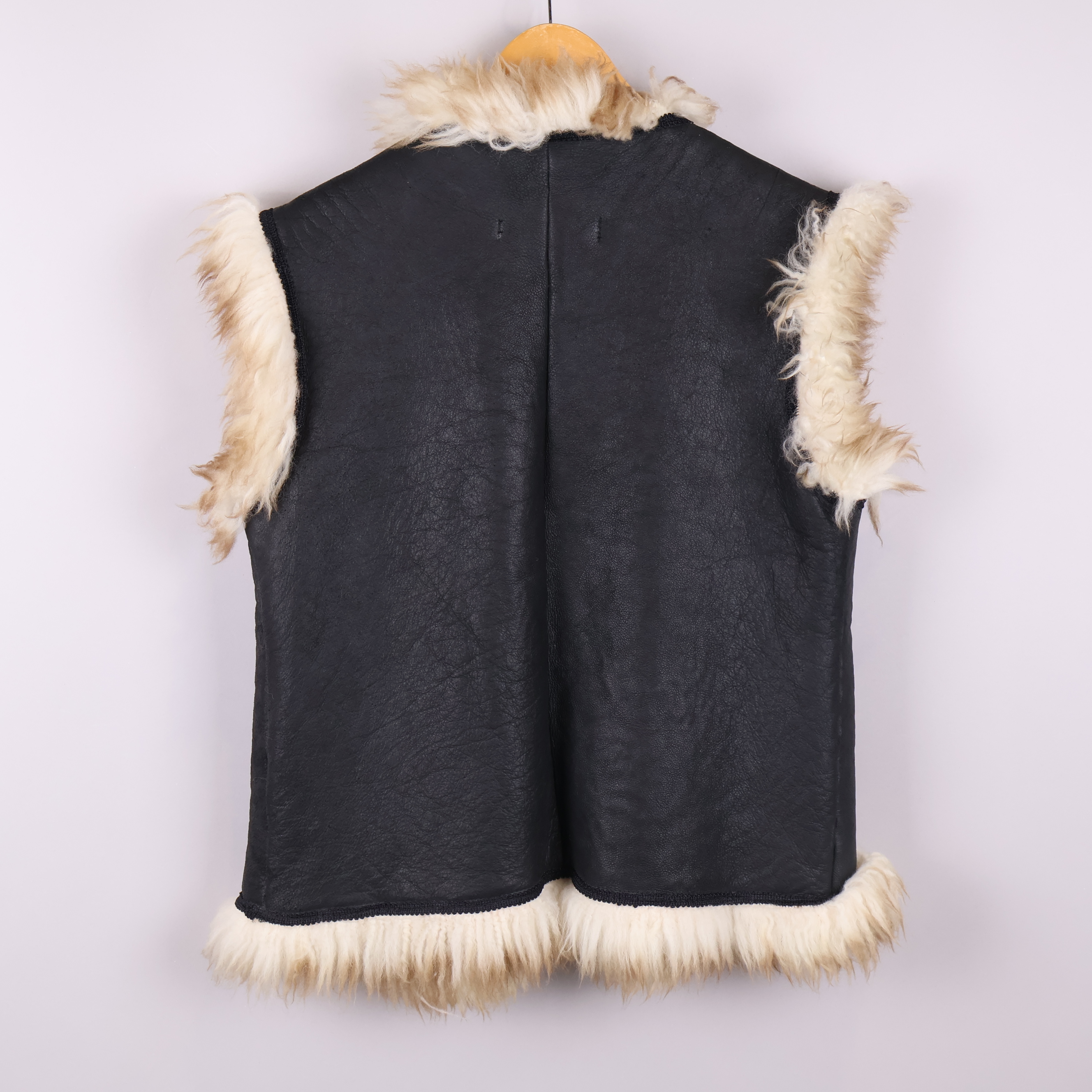 Unik väst i mörk nyans med mjuk, äkta fårskinnskant som ger en ombonad och trendig känsla. Insidan är fodrad med lammull för extra komfort. Öppna kanter utan knäppning och tydlig vintage vibe tack vare kombinationen av brun imitation mocka och kontrasterande ljus päls.