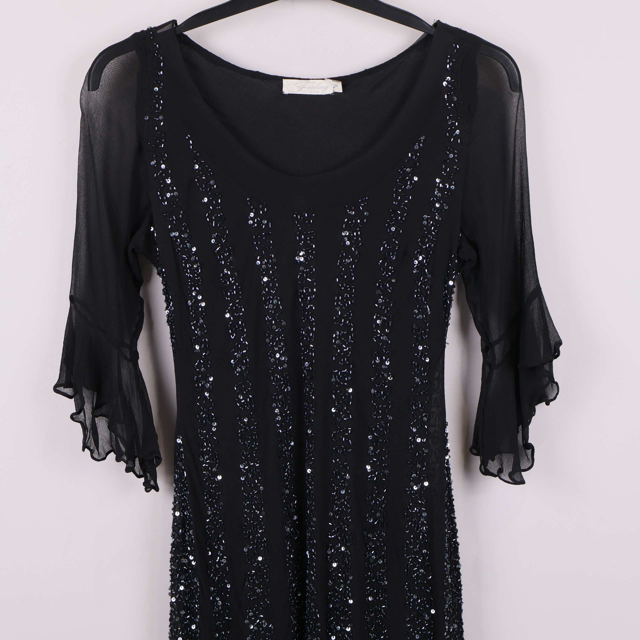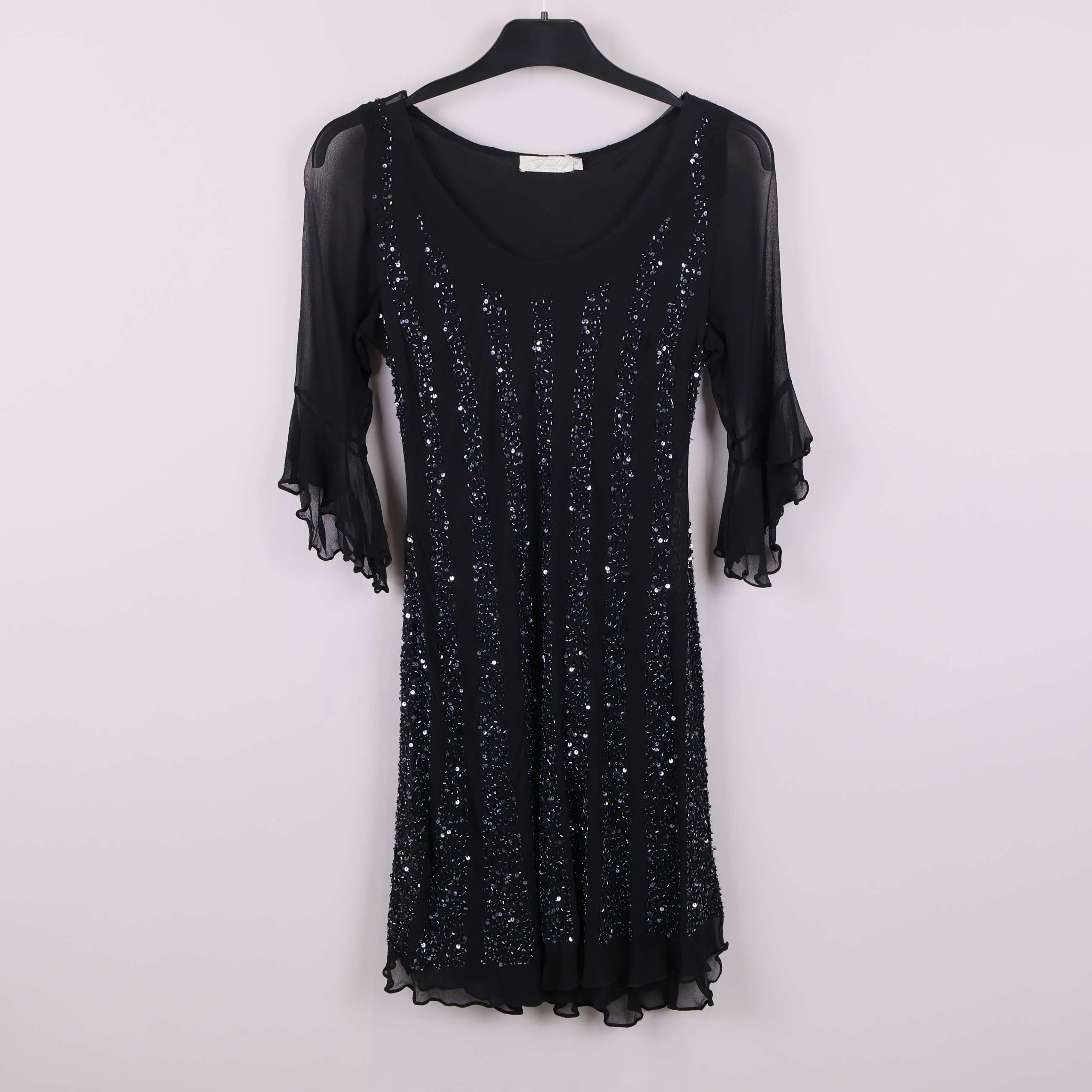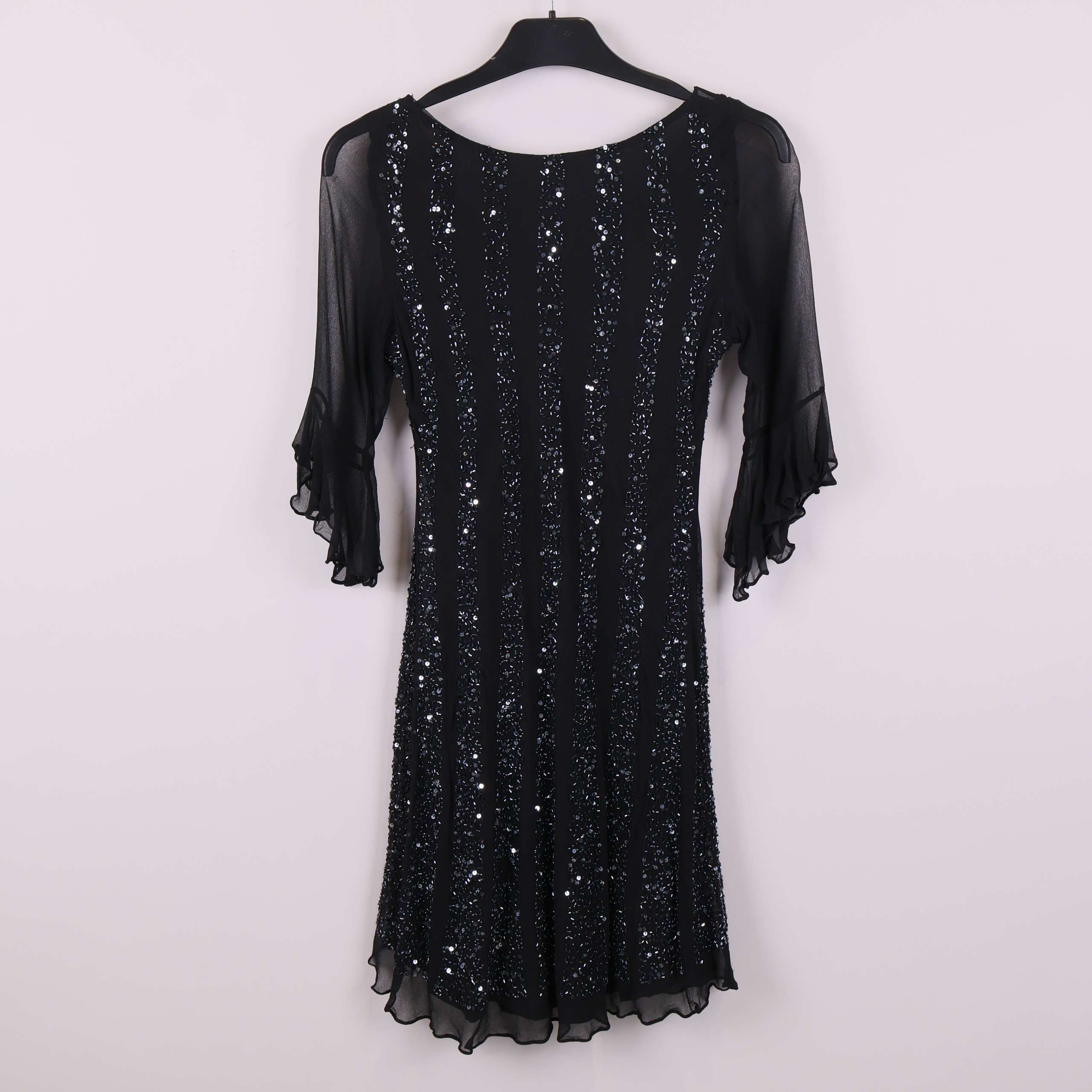 Svart klänning med halvtransparenta volangärmar och glittriga paljettränder som ger ett festligt intryck. Tyget faller fint och sömmarna är diskreta, medan den stretchiga överdelen ger en bekväm passform.