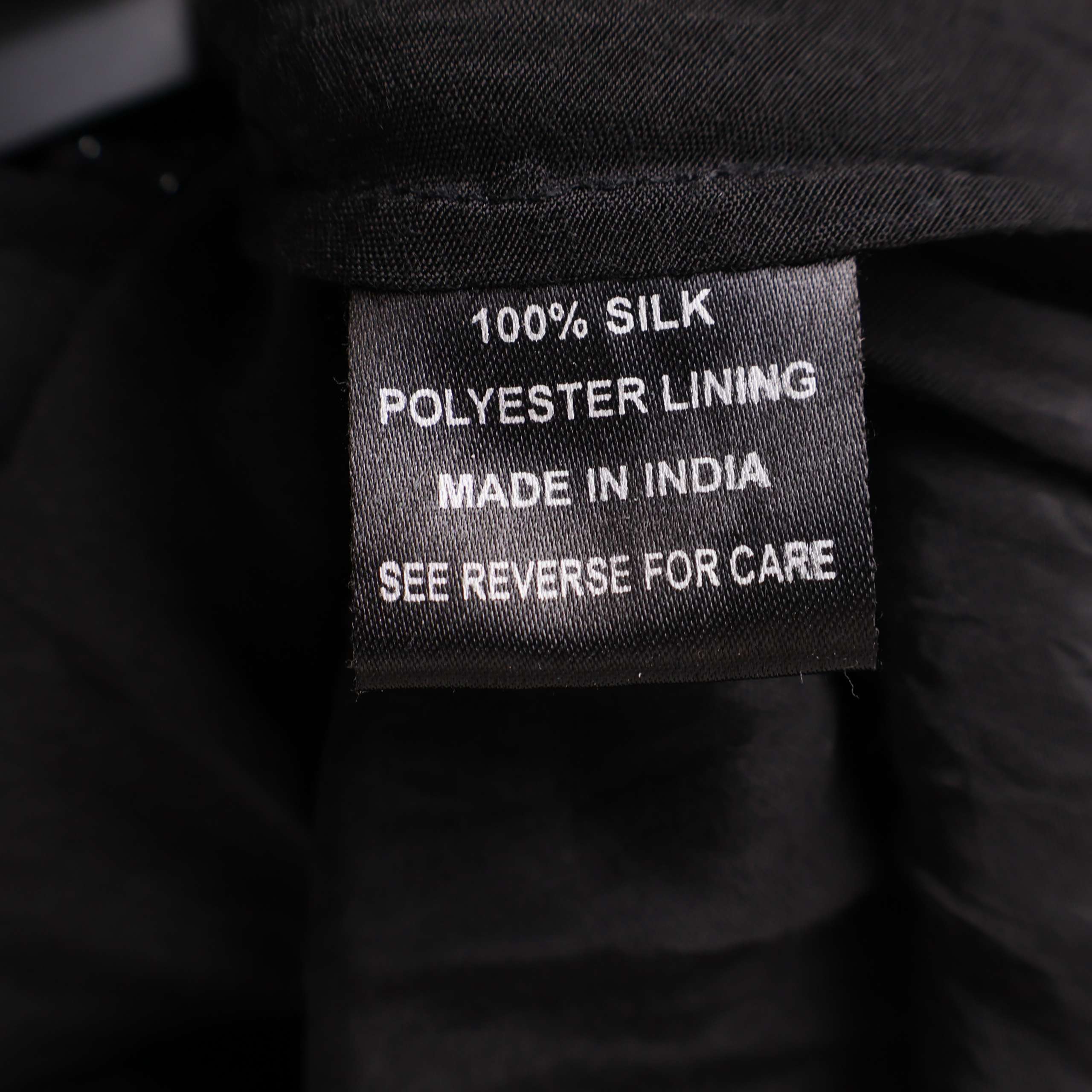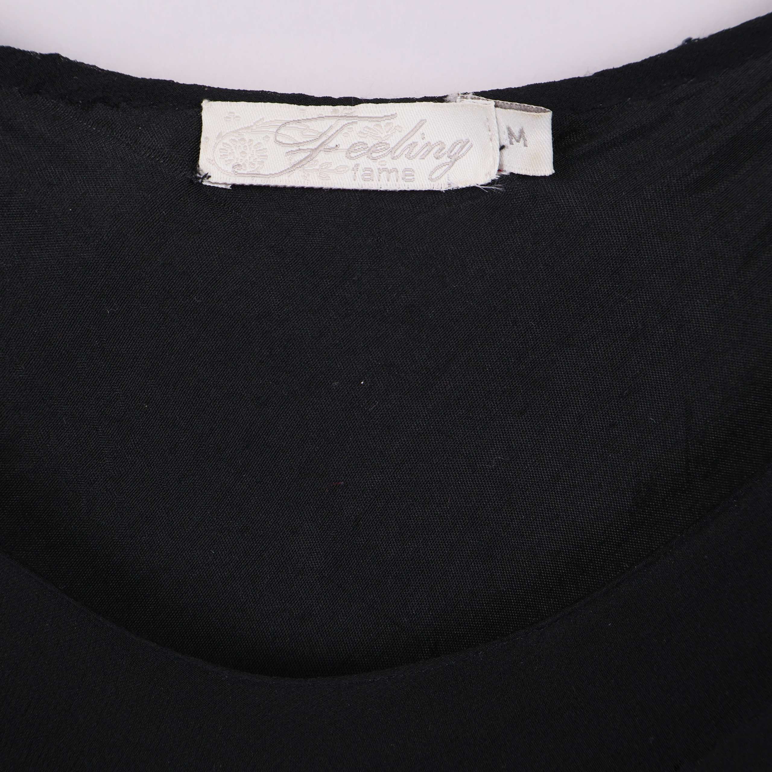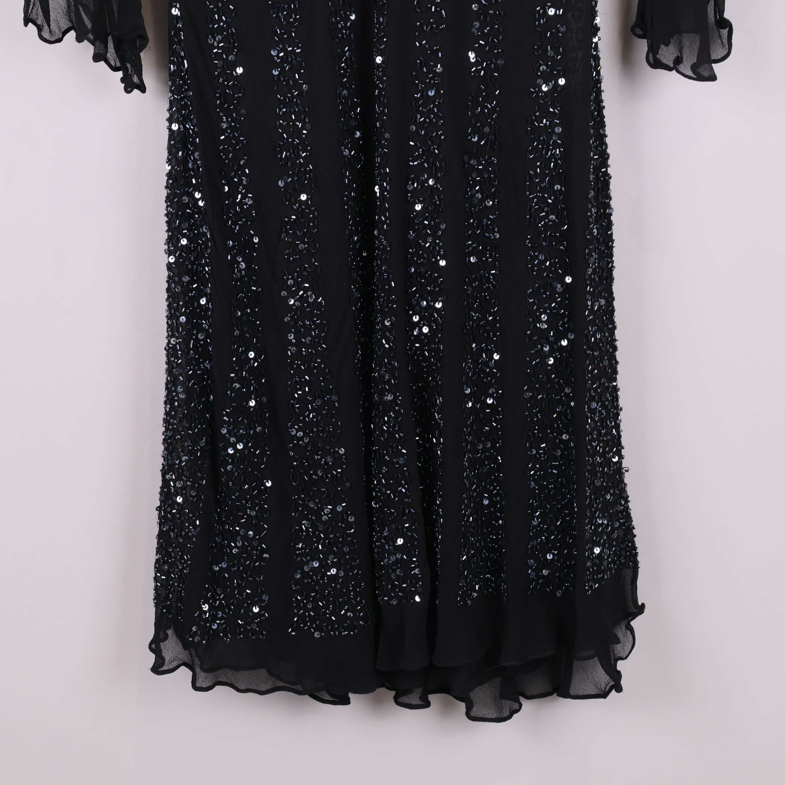 Svart klänning med halvtransparenta volangärmar och glittriga paljettränder som ger ett festligt intryck. Tyget faller fint och sömmarna är diskreta, medan den stretchiga överdelen ger en bekväm passform.
