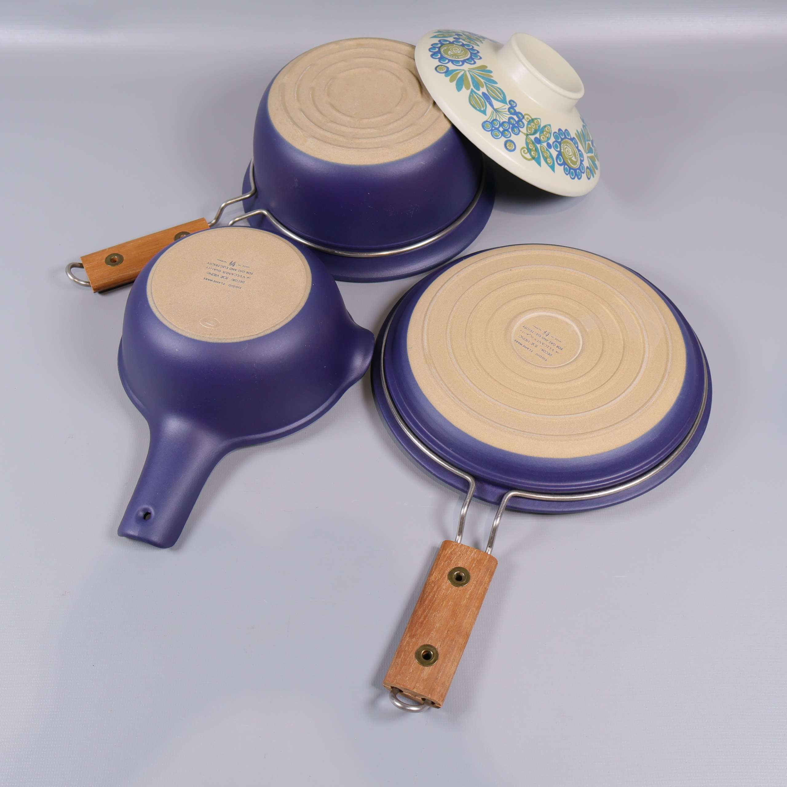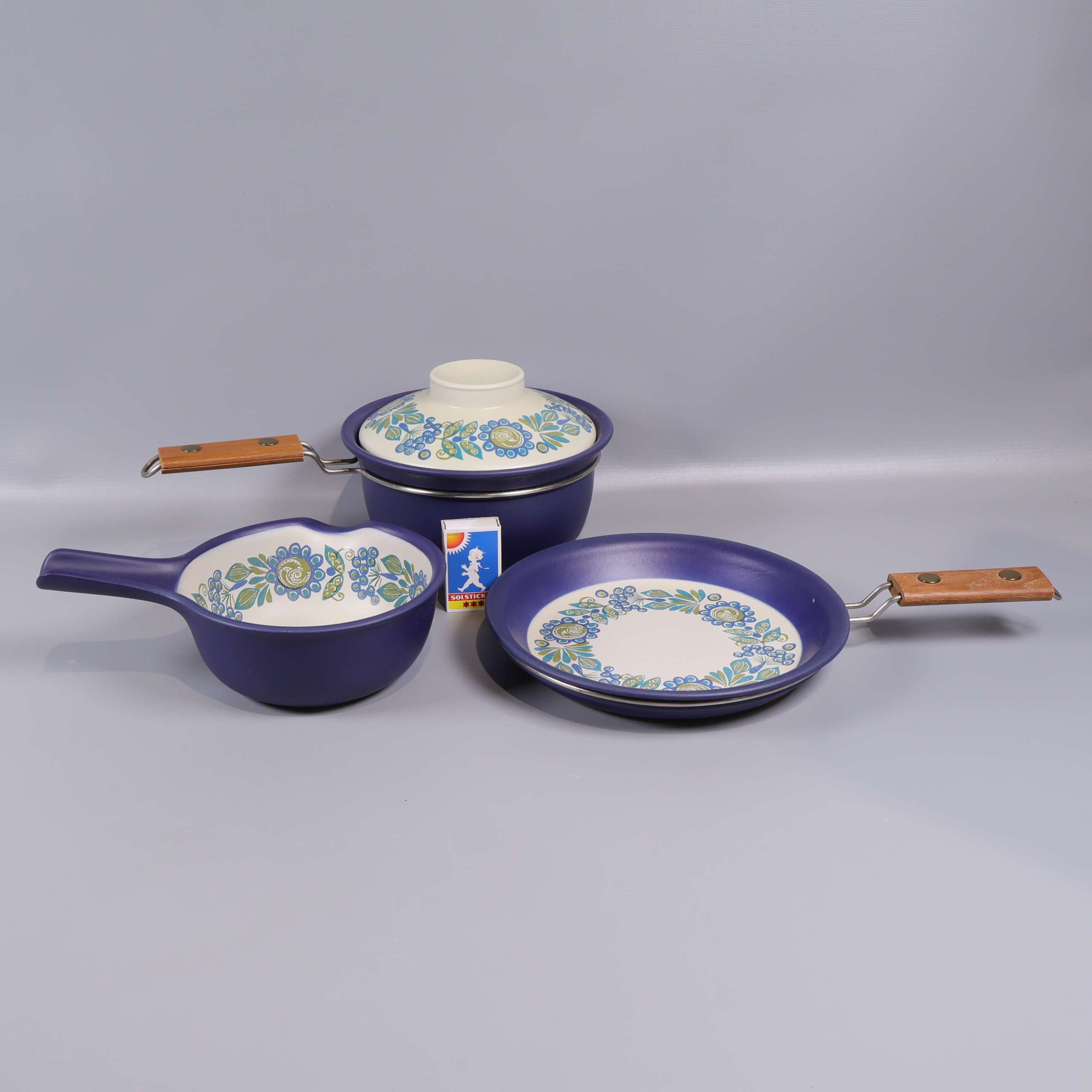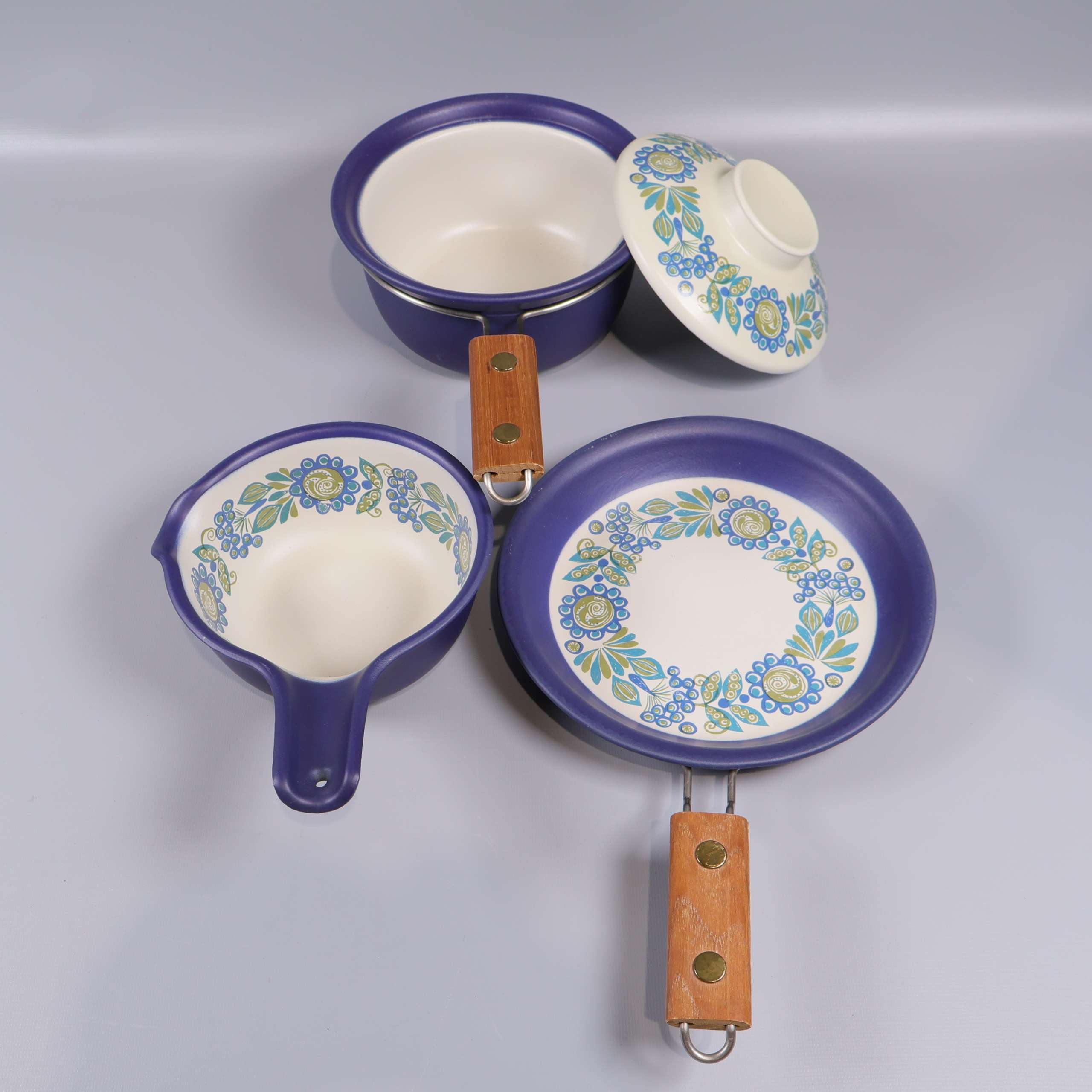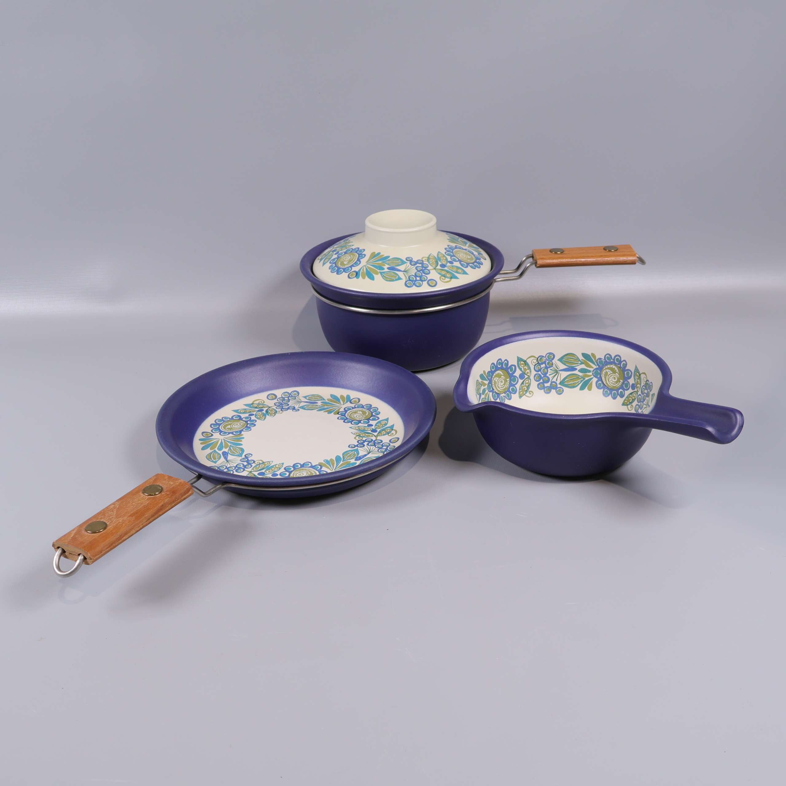 Unikt set med tre delar från Figgjo Tor Viking, med snygga trähandtag och ett färgglatt retro-blommönster i blått, grönt och gult. Mjukt rundade former och matt blå utsida, perfekt för att ge ett lekfullt och vintage vibe till köket.