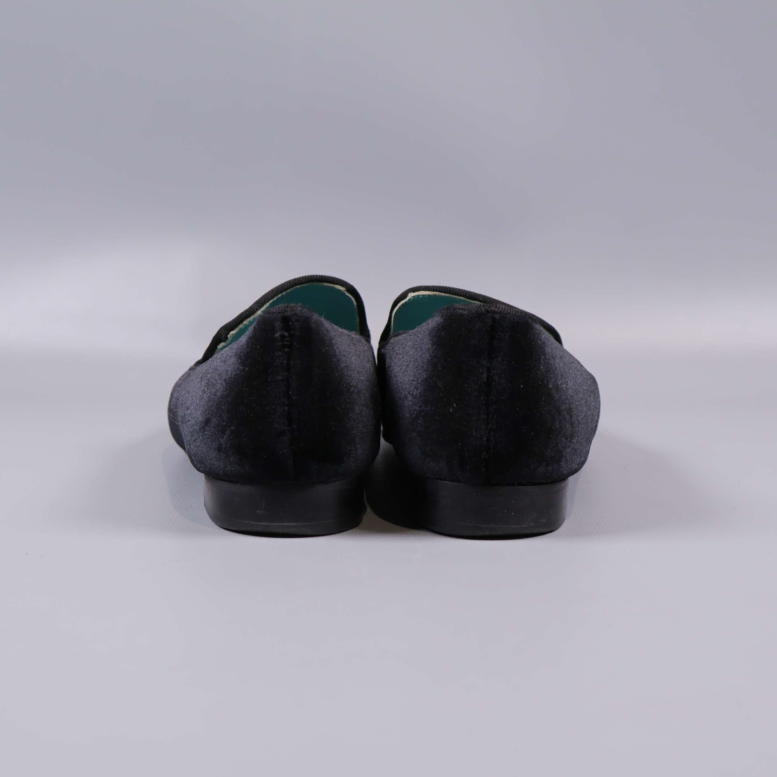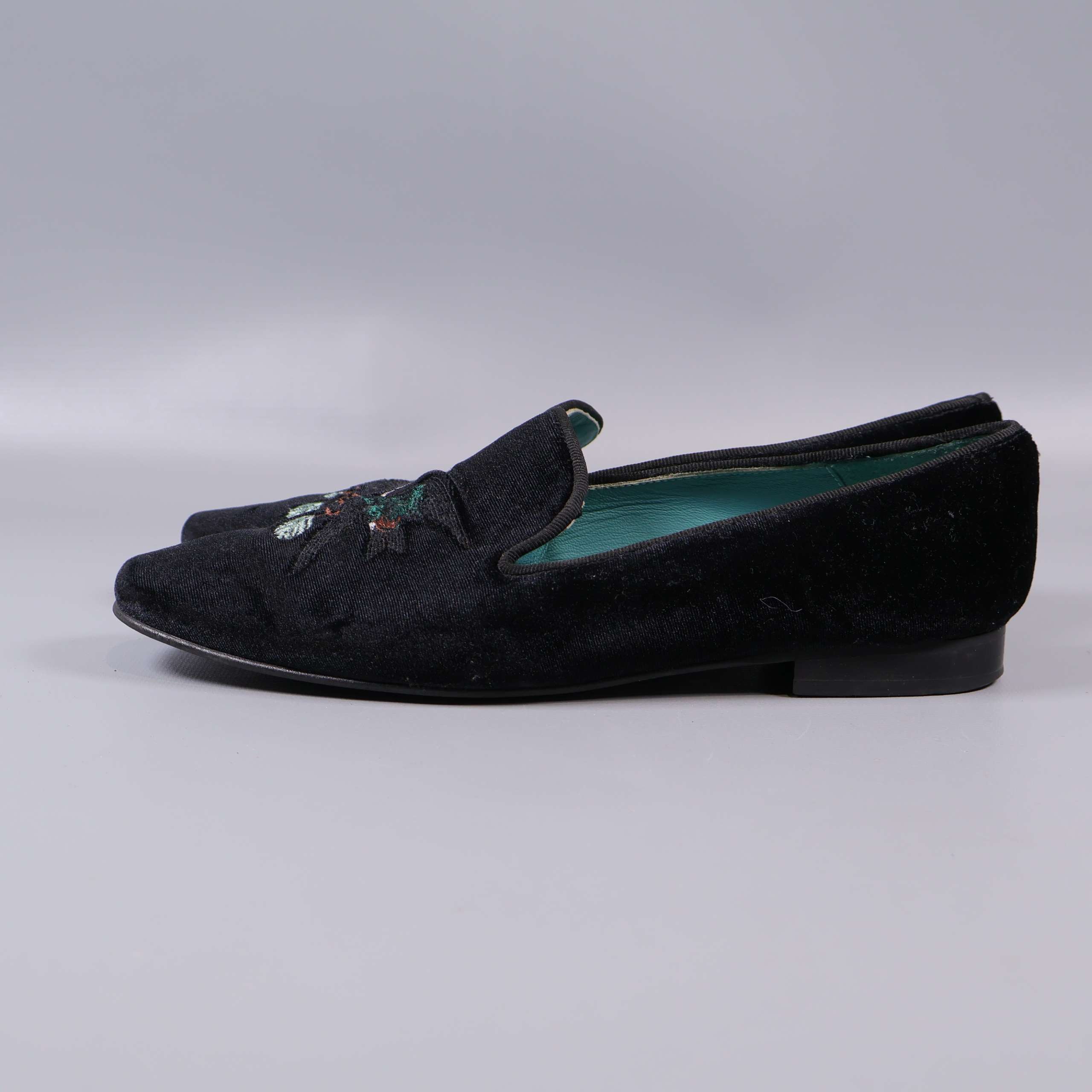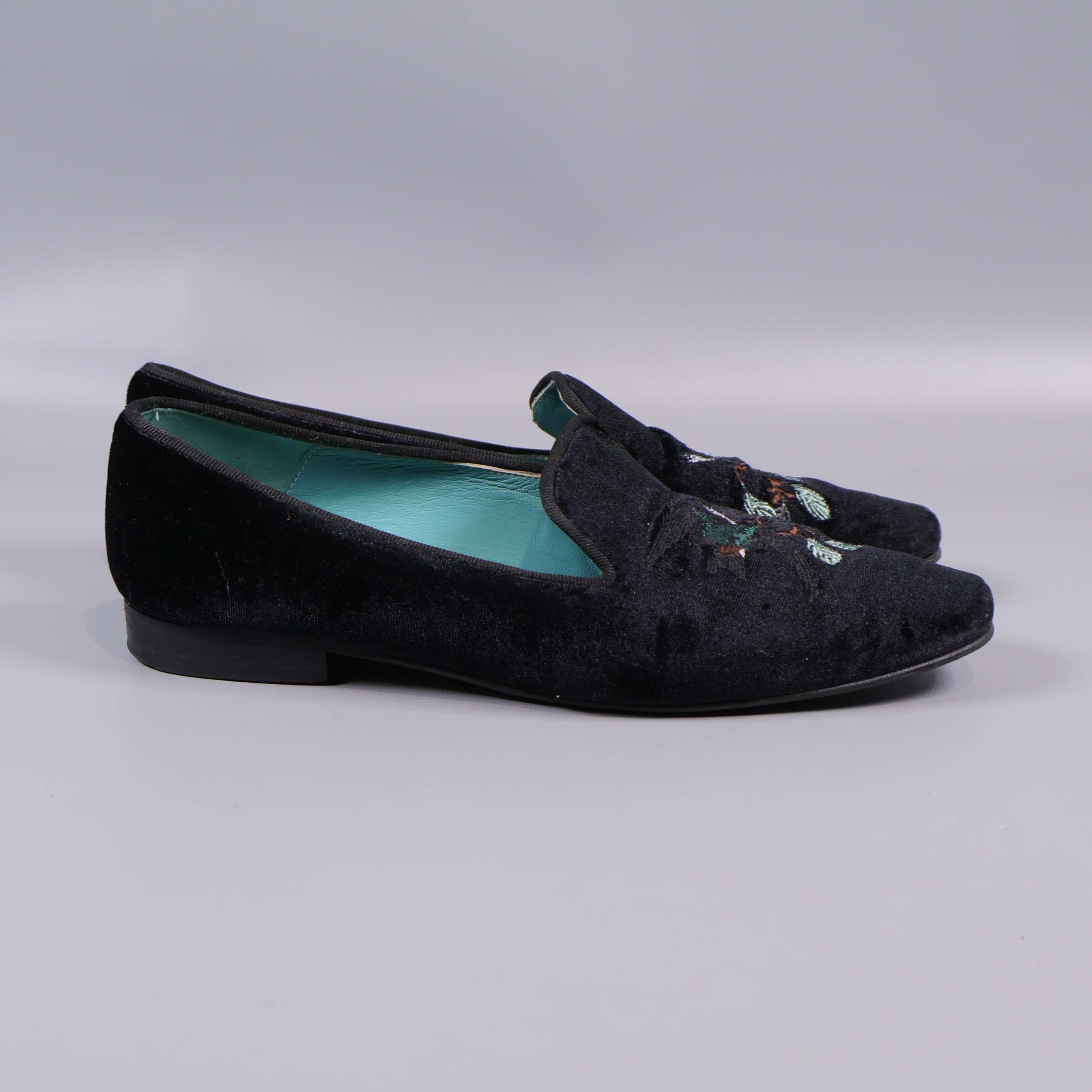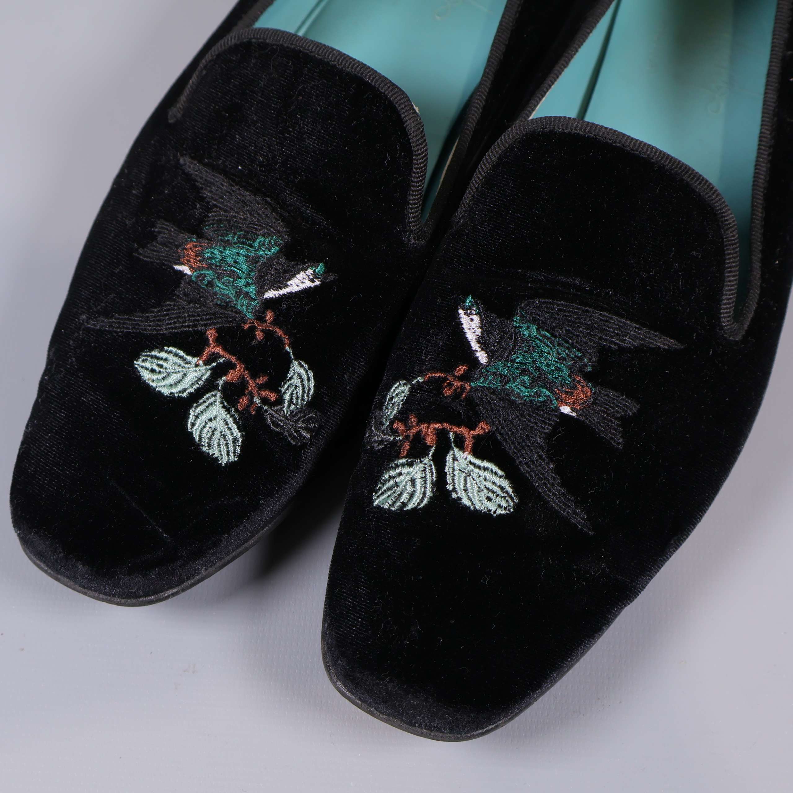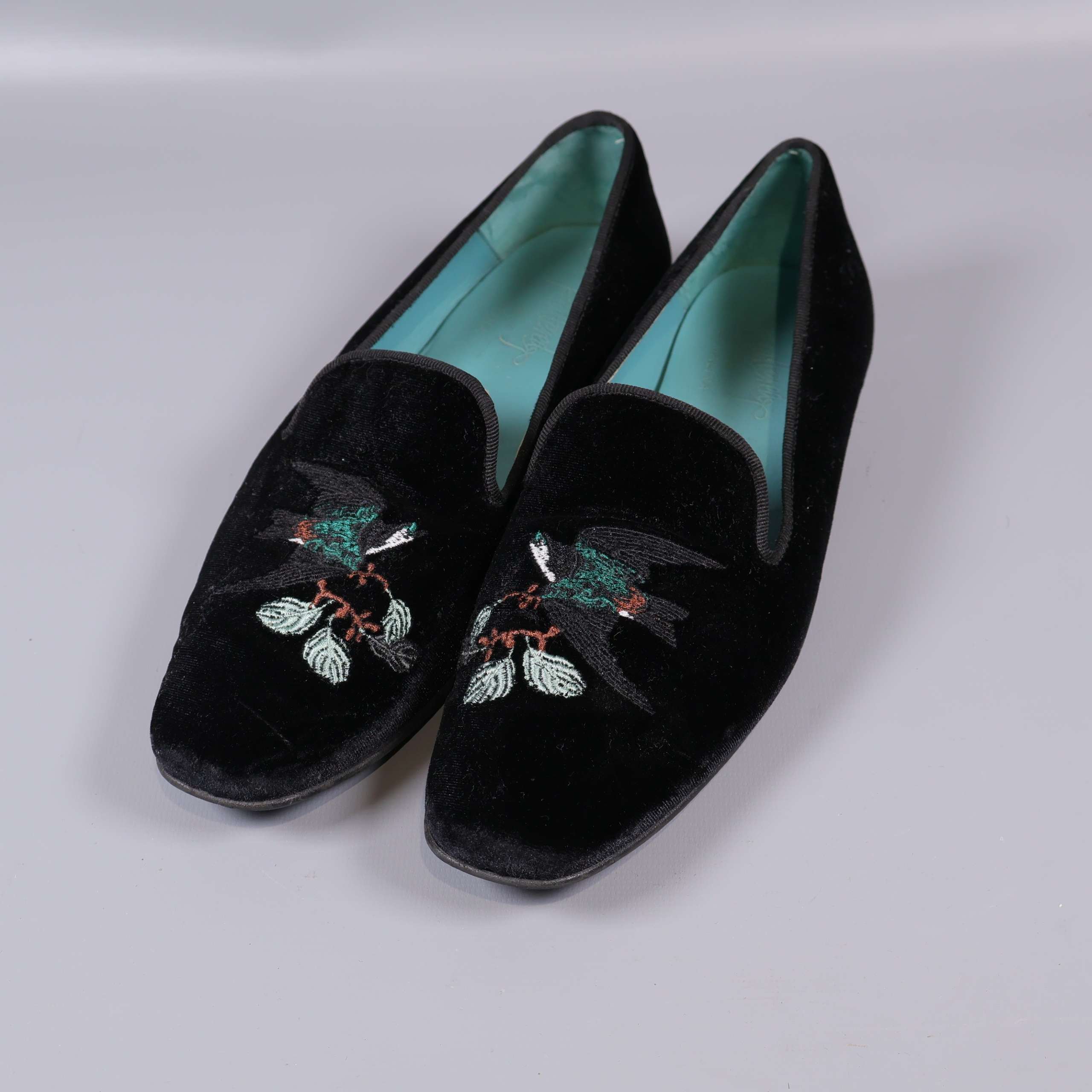 Stilrena svarta sammetsskor med broderat fågelmotiv upptill som ger en unik och detaljrik känsla. Skorna har en låg klassisk klack och turkosblå innersula som skapar en modern kontrast. Detaljrik brodyr framtill sätter en personlig touch till din outfit och modellen passar till både dressat och vardag. Designen känns både chic och tidlös.