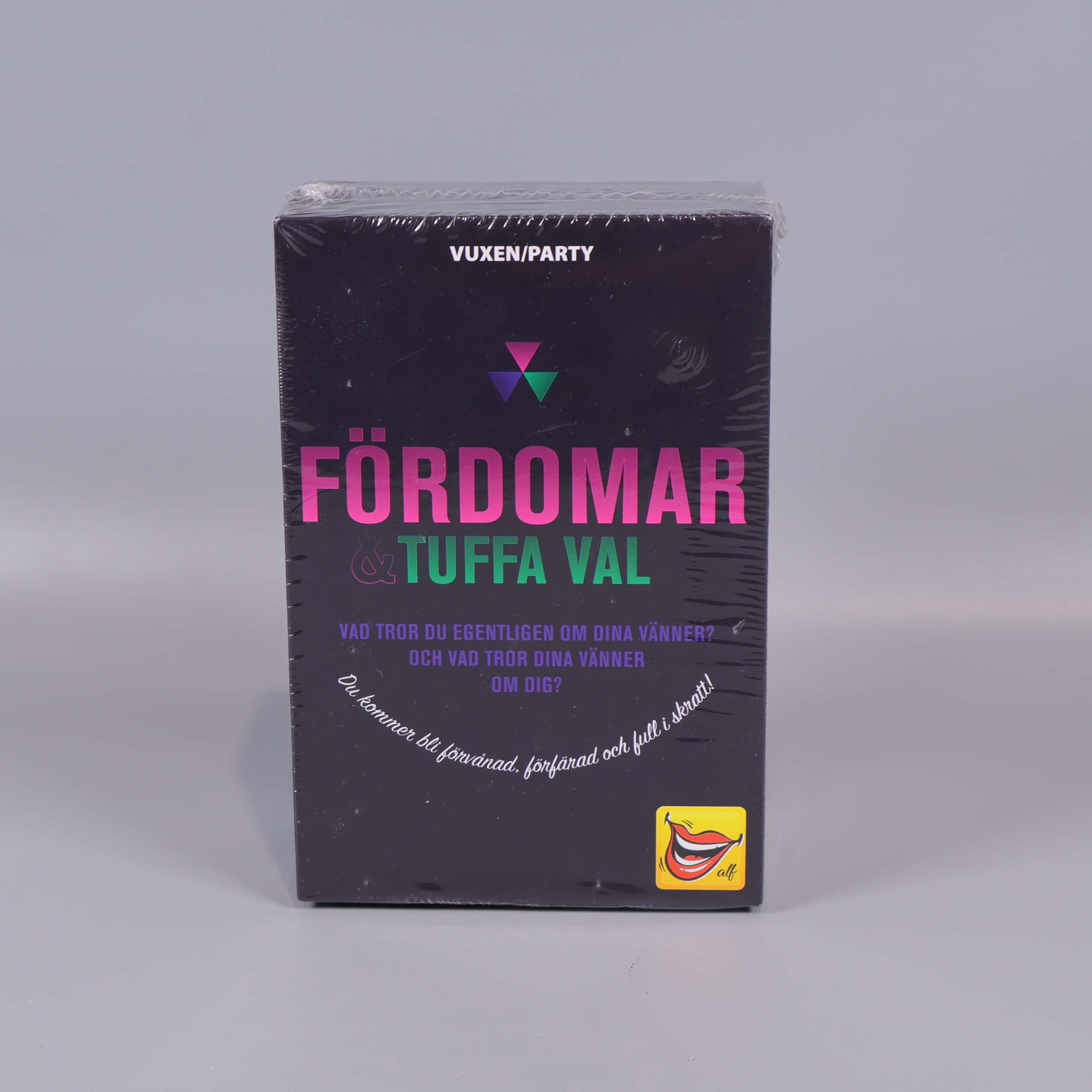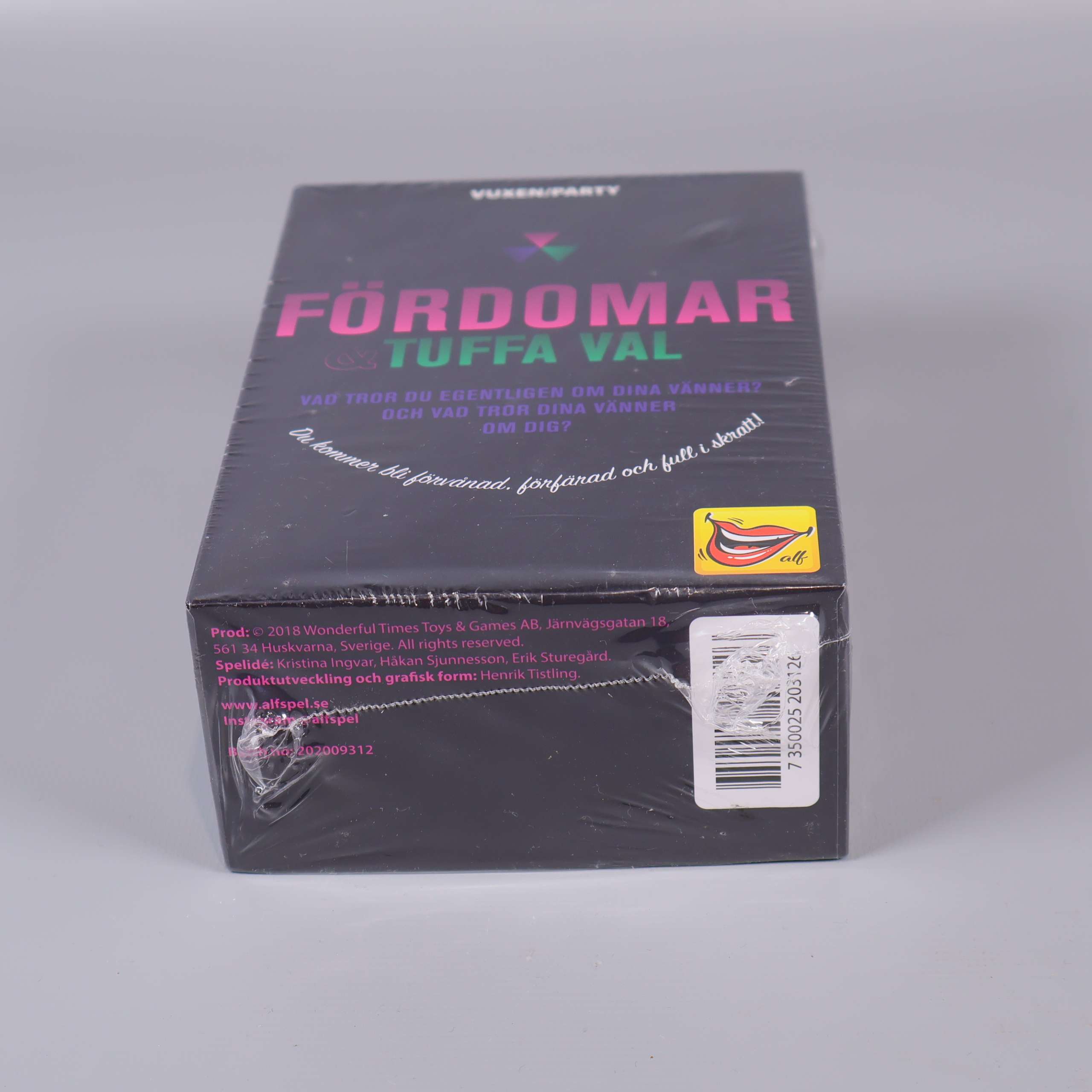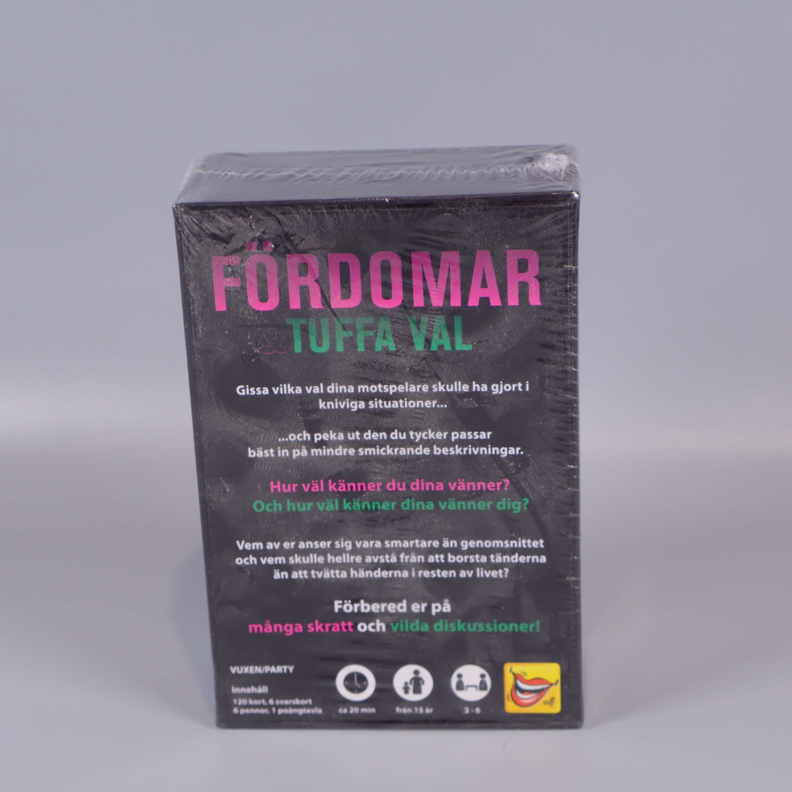 ALF Fördomar & tuffa val Partyspel 79 kr Product variation Antal st Beskrivning Fördomar & Tuffa Val är ett vuxenspel för party med vänner tack vare sitt upplägg med många skratt och direkta frågor. Visa all beskrivning Skick Nytt skick Produkten är som ny. Kan till och med ha orginalprislapp kvar eller ligga i originalförpackning. Läs mer om hur vi bedömer Number of players 3-6 Age limit 15 Varumärke ALF Produkten är unik och finns enbart som 1 st i lager. Fri frakt på alla köp över 990 kr. 14 dagars ångerrät.