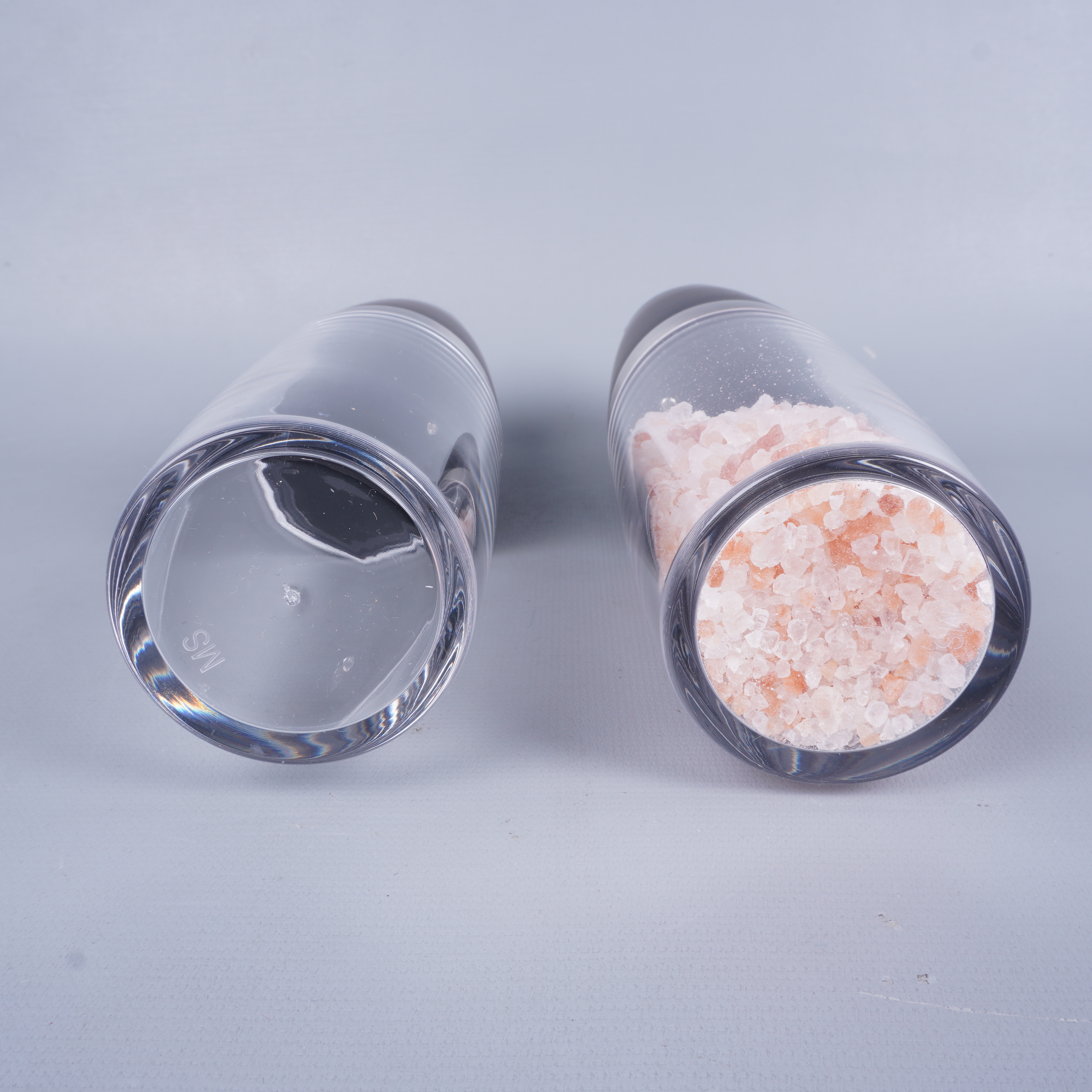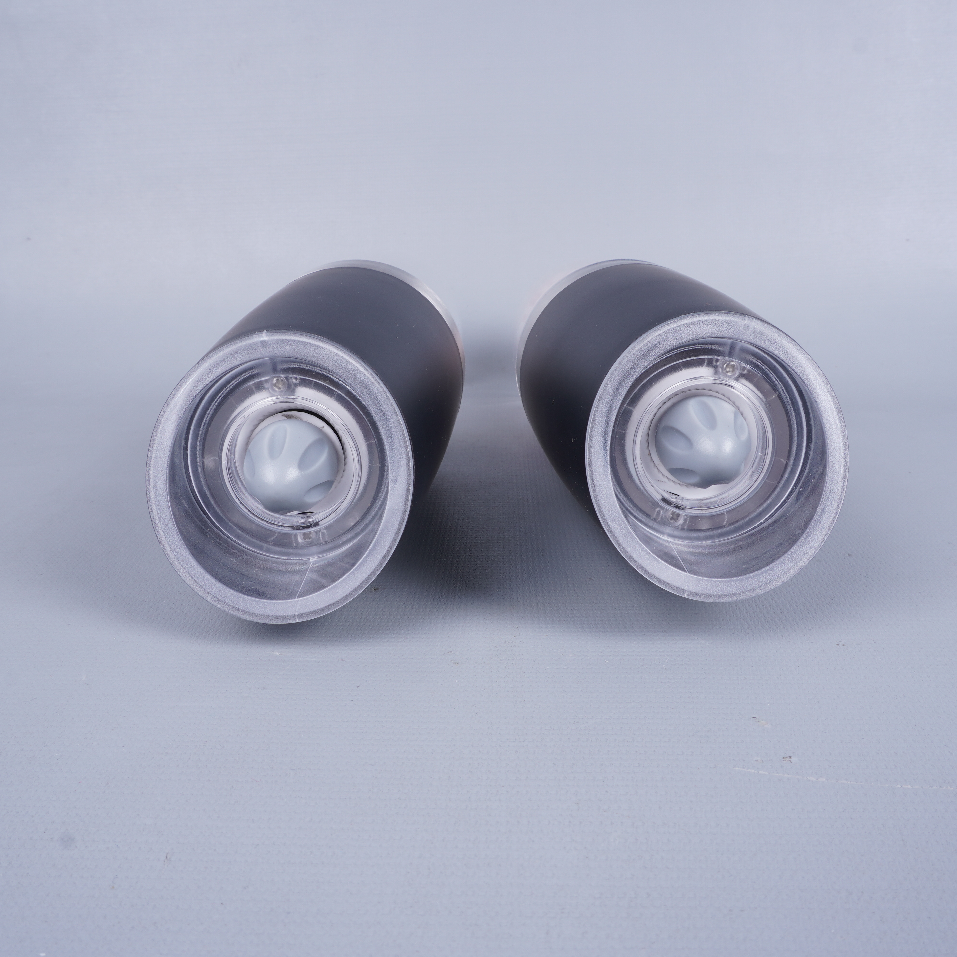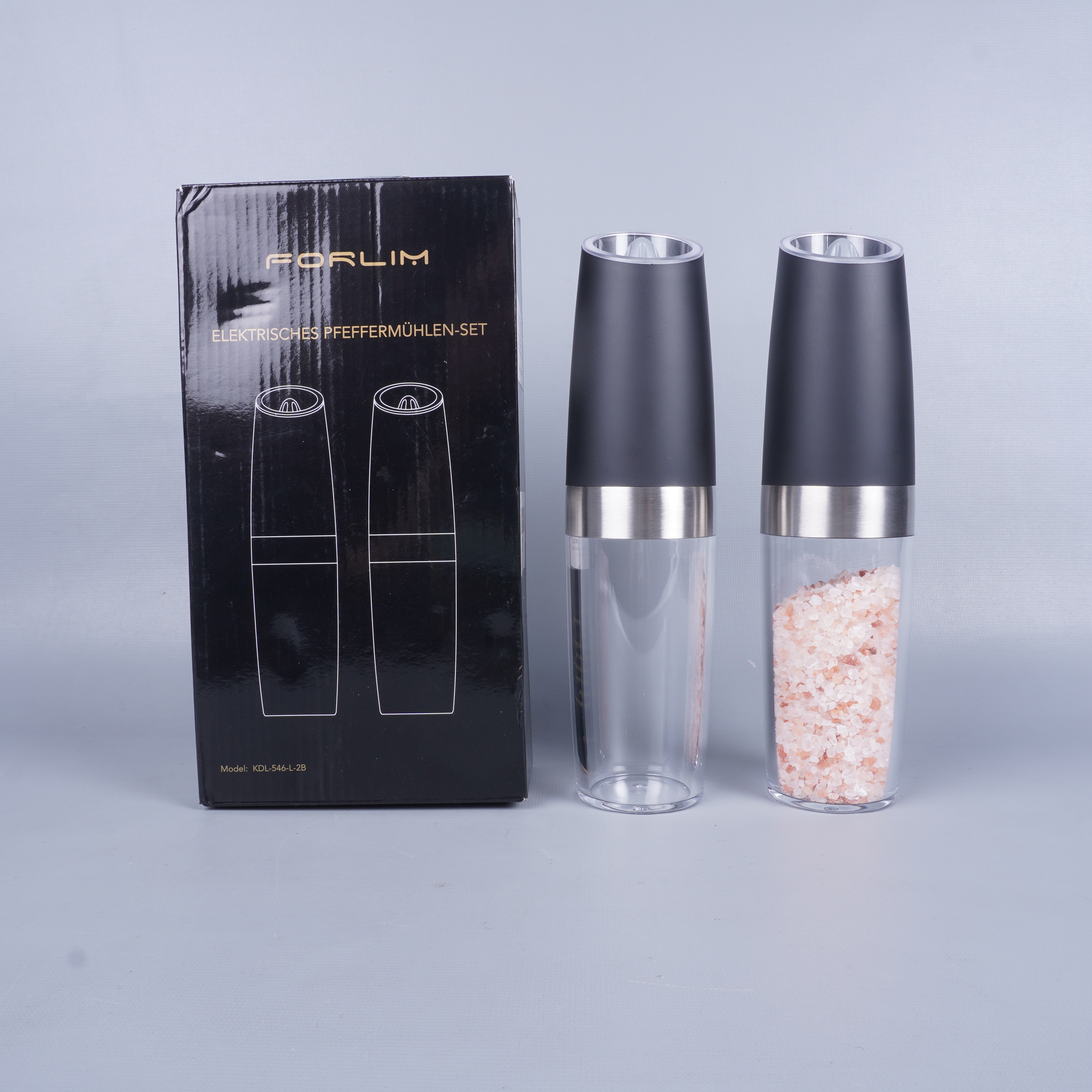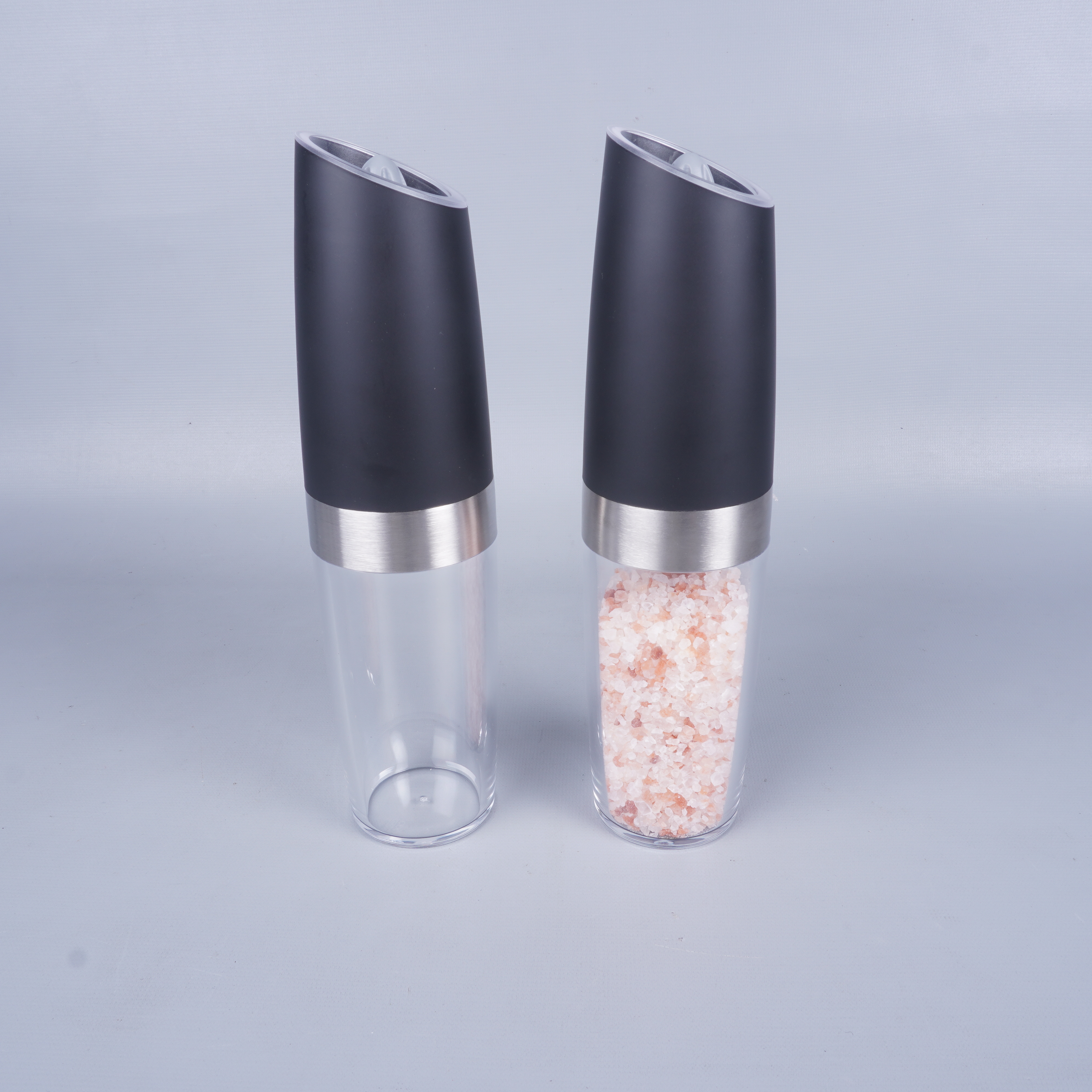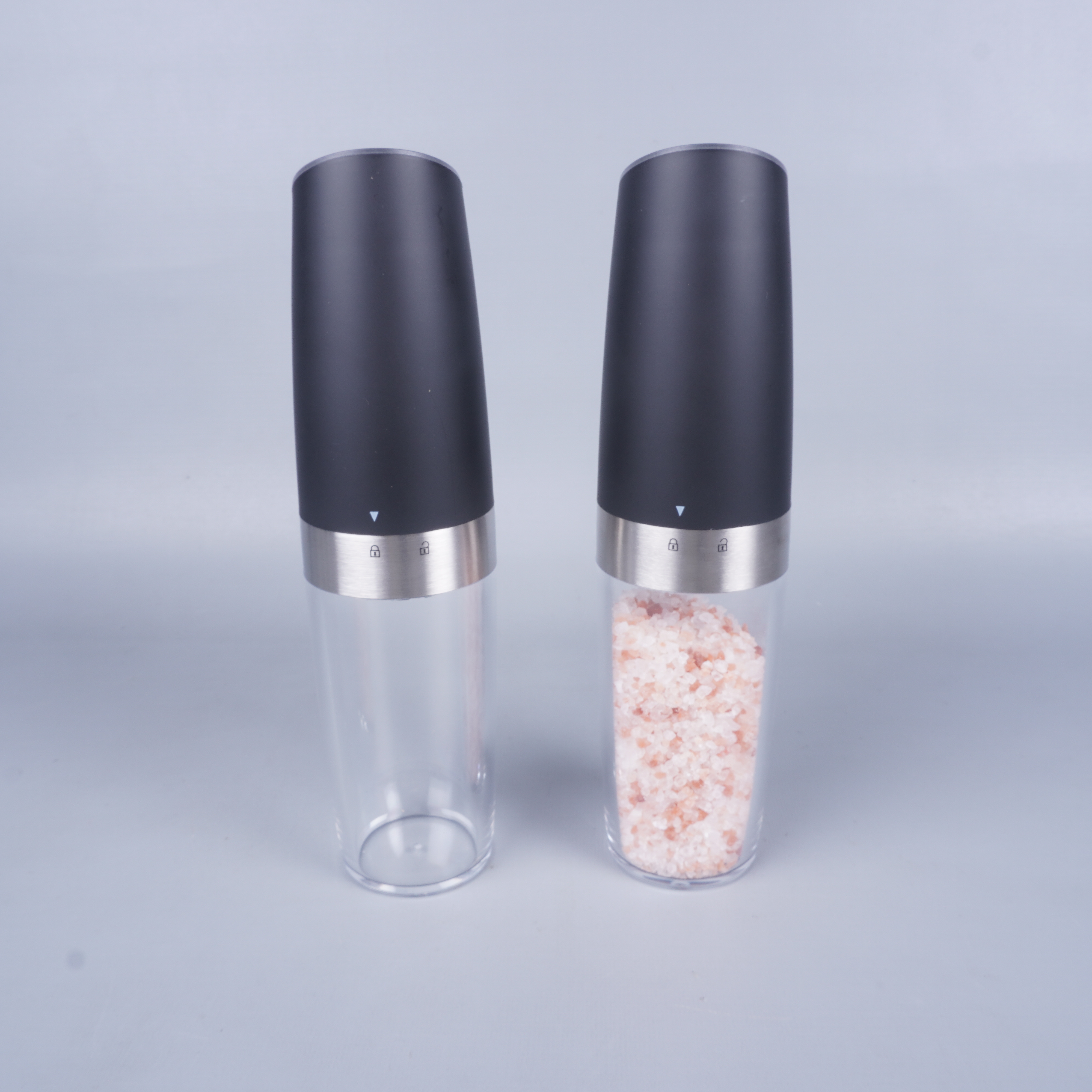 Stilrent set med två elektriska kryddkvarnar i svart och transparent design, perfekta för både salt och peppar. Kvarnarnas mattsvarta ovandel kombineras snyggt med rostfritt stål och tydlig behållare, vilket ger en smart och modern look till köket. Batterier måste köpas till