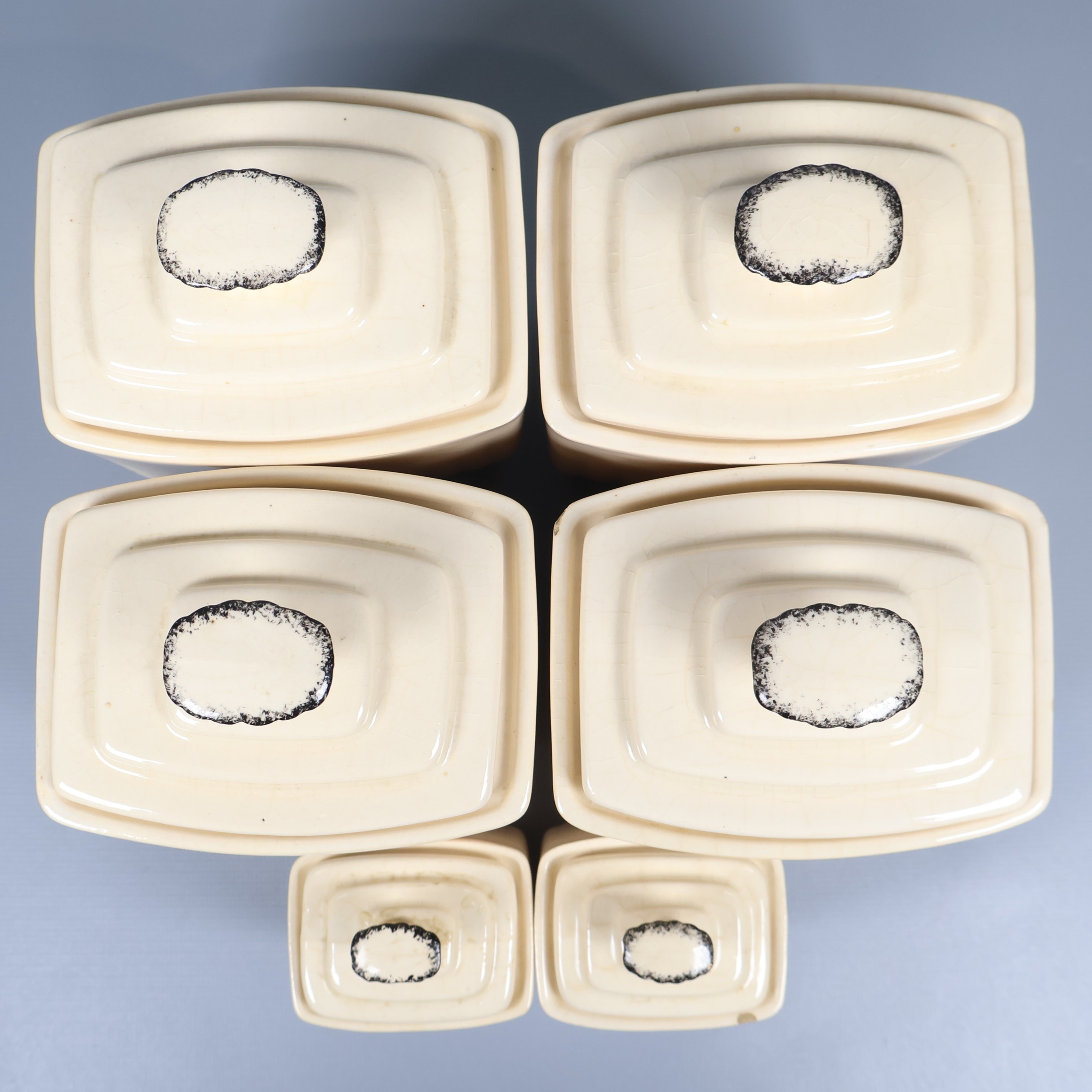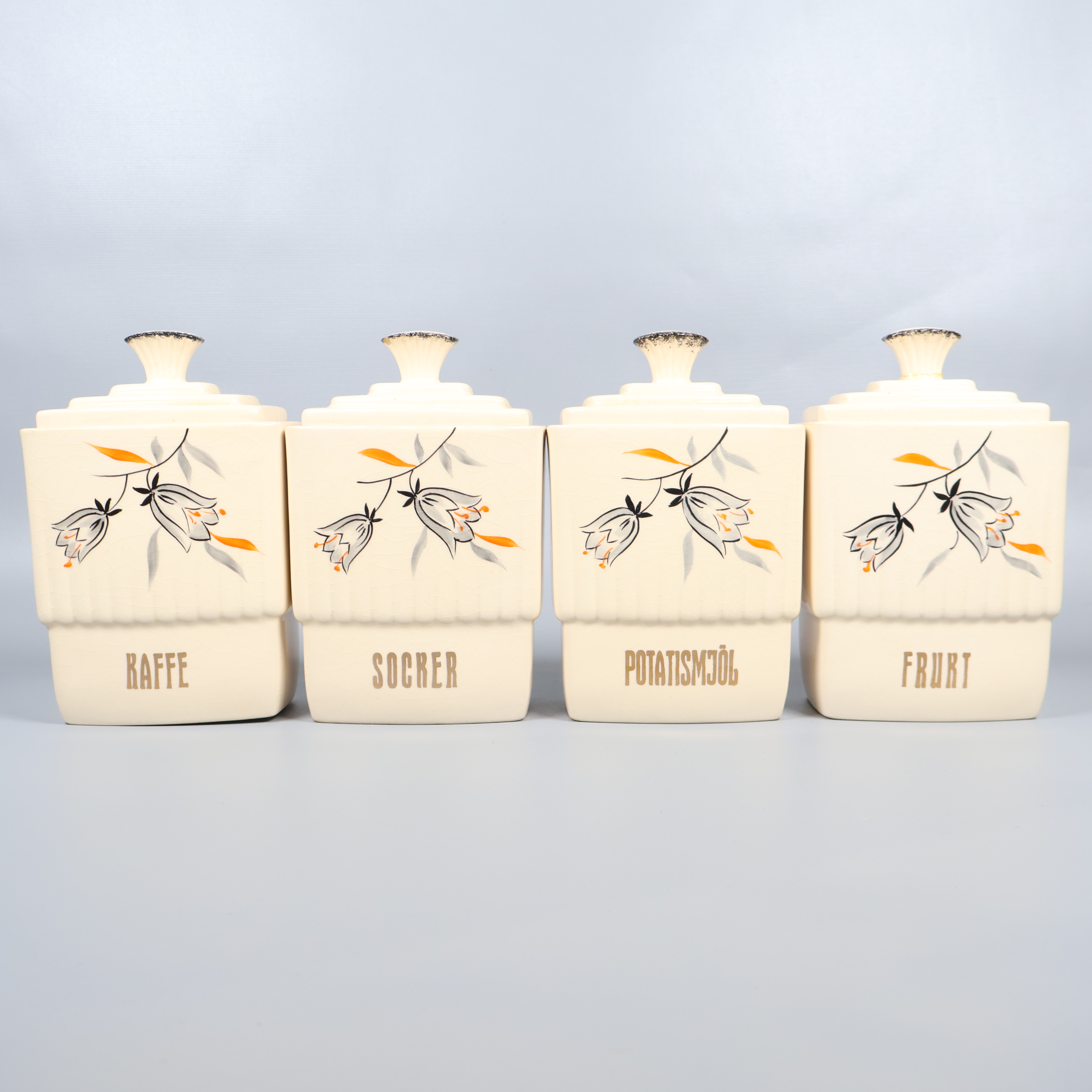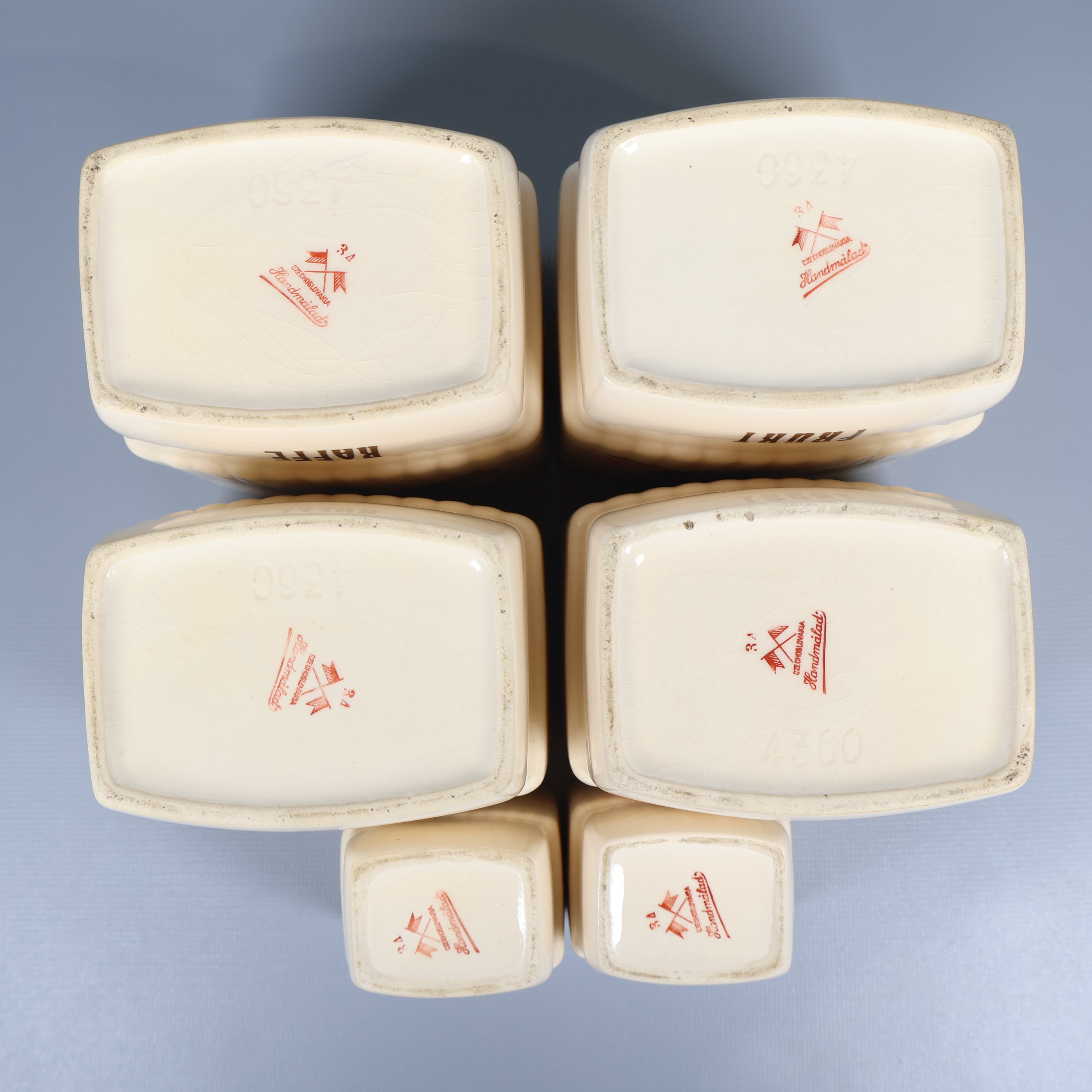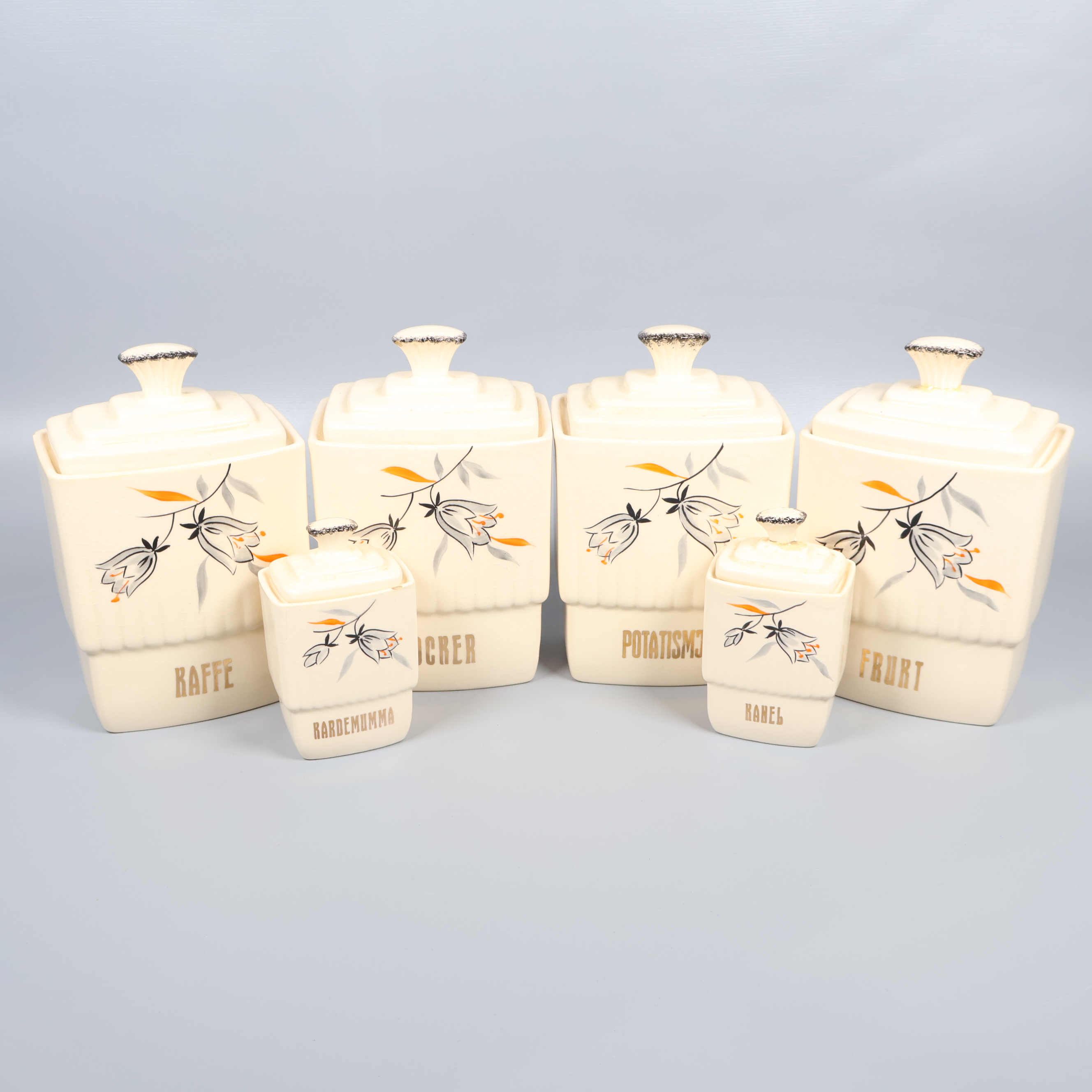 Sätt personlig prägel i köket med dessa sex rektangulära förvaringsburkar i krämig ton, dekorerade med handmålade blommor. Handtagen på två lock har blivit lagade. Det förekommer krackelering på och fläckar i flera av burkarna.