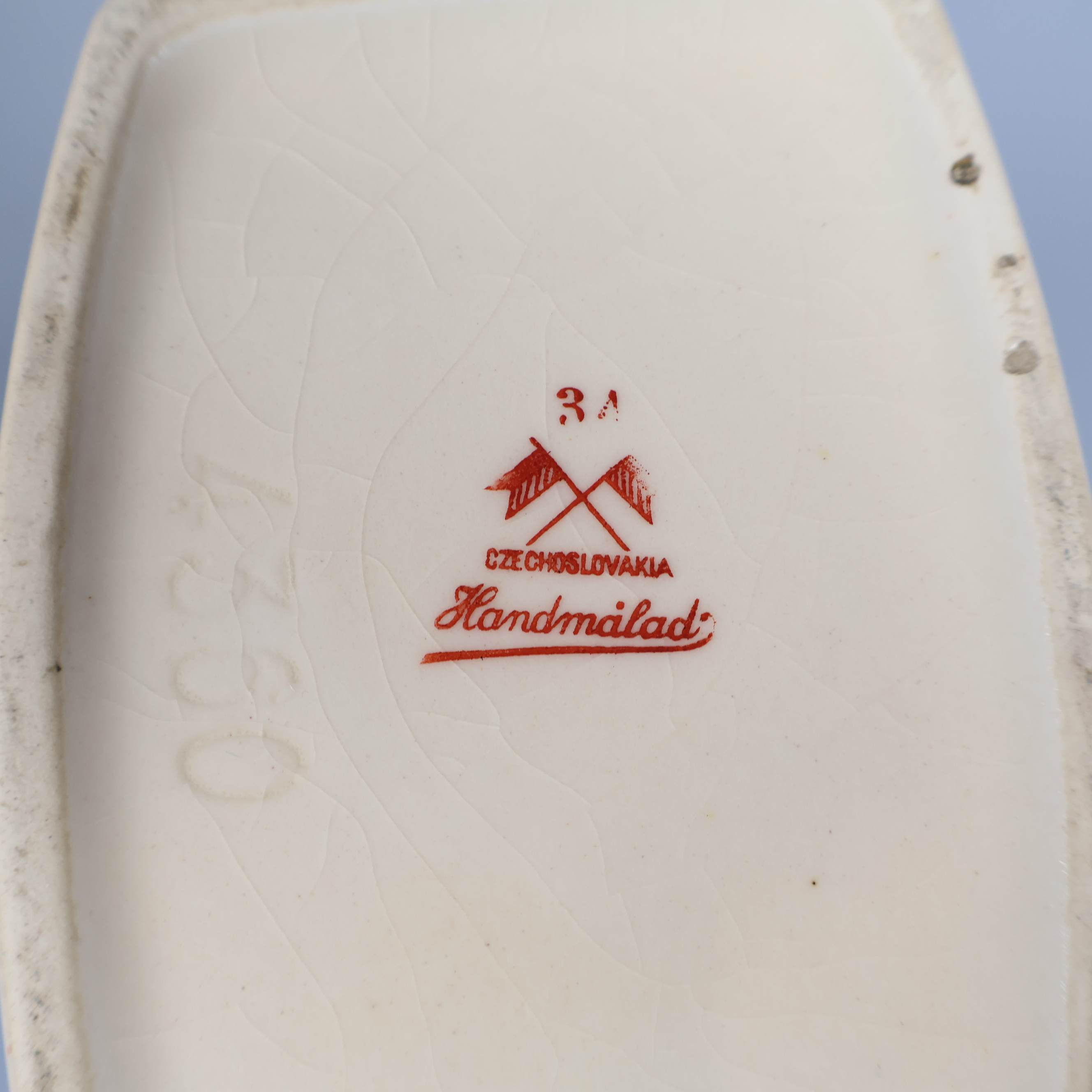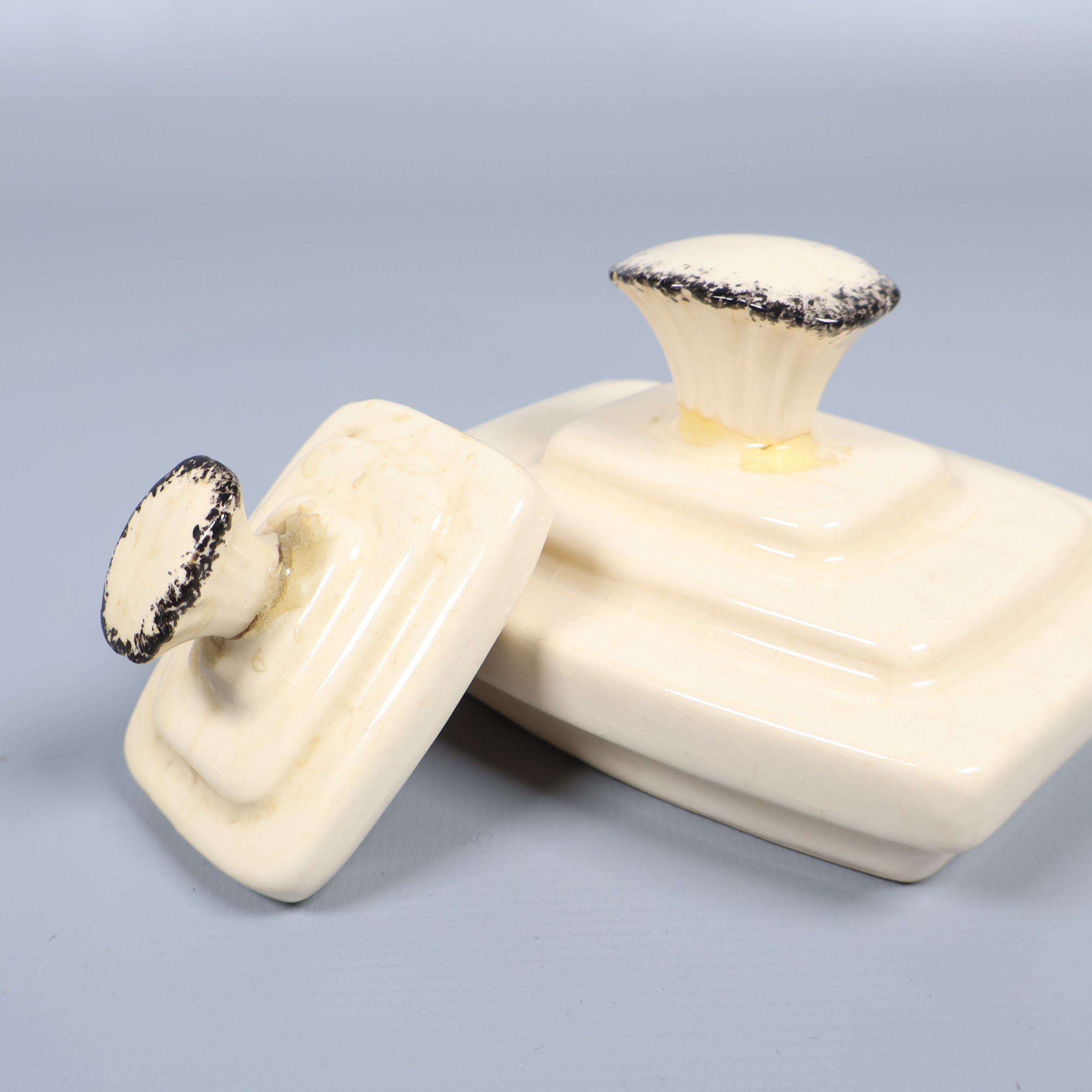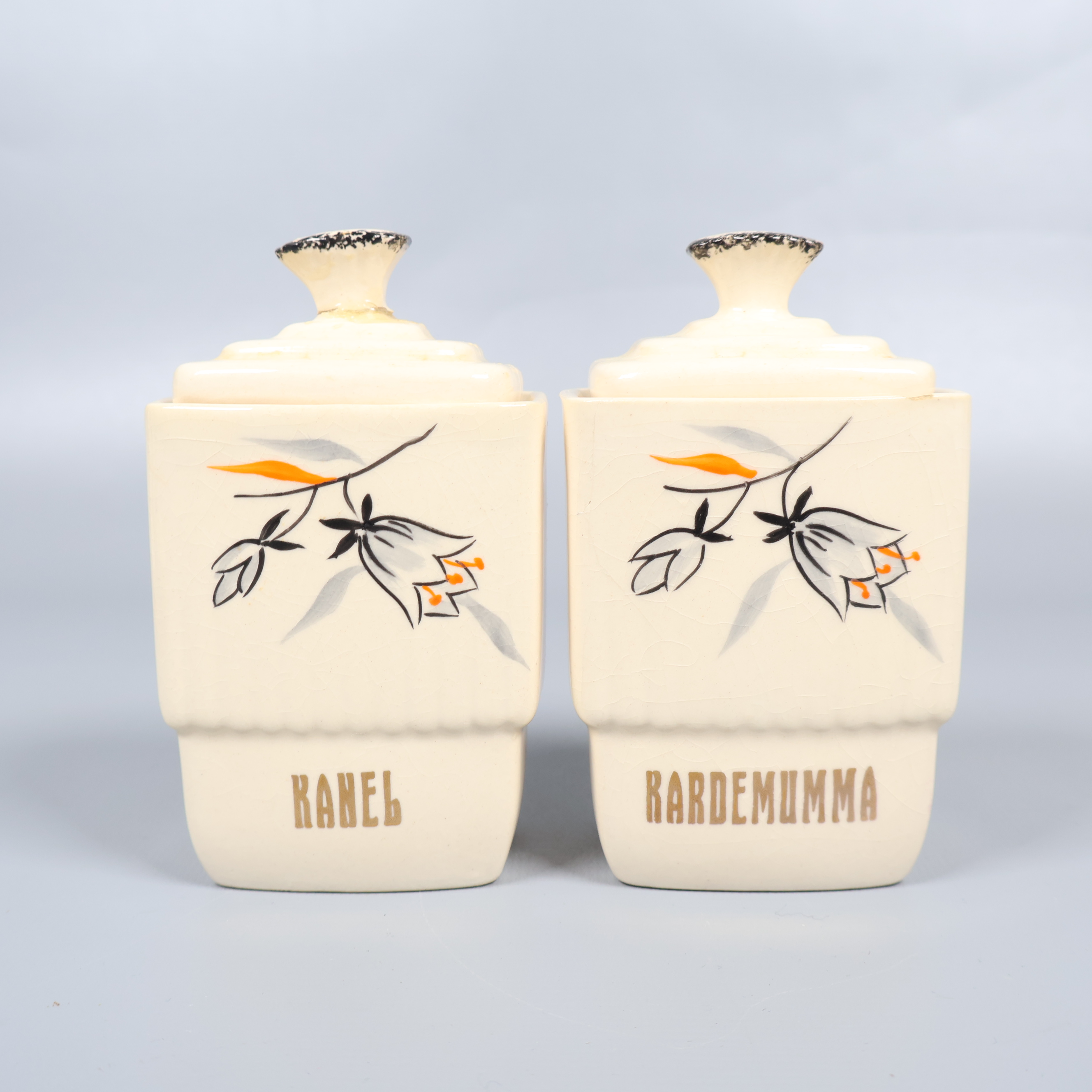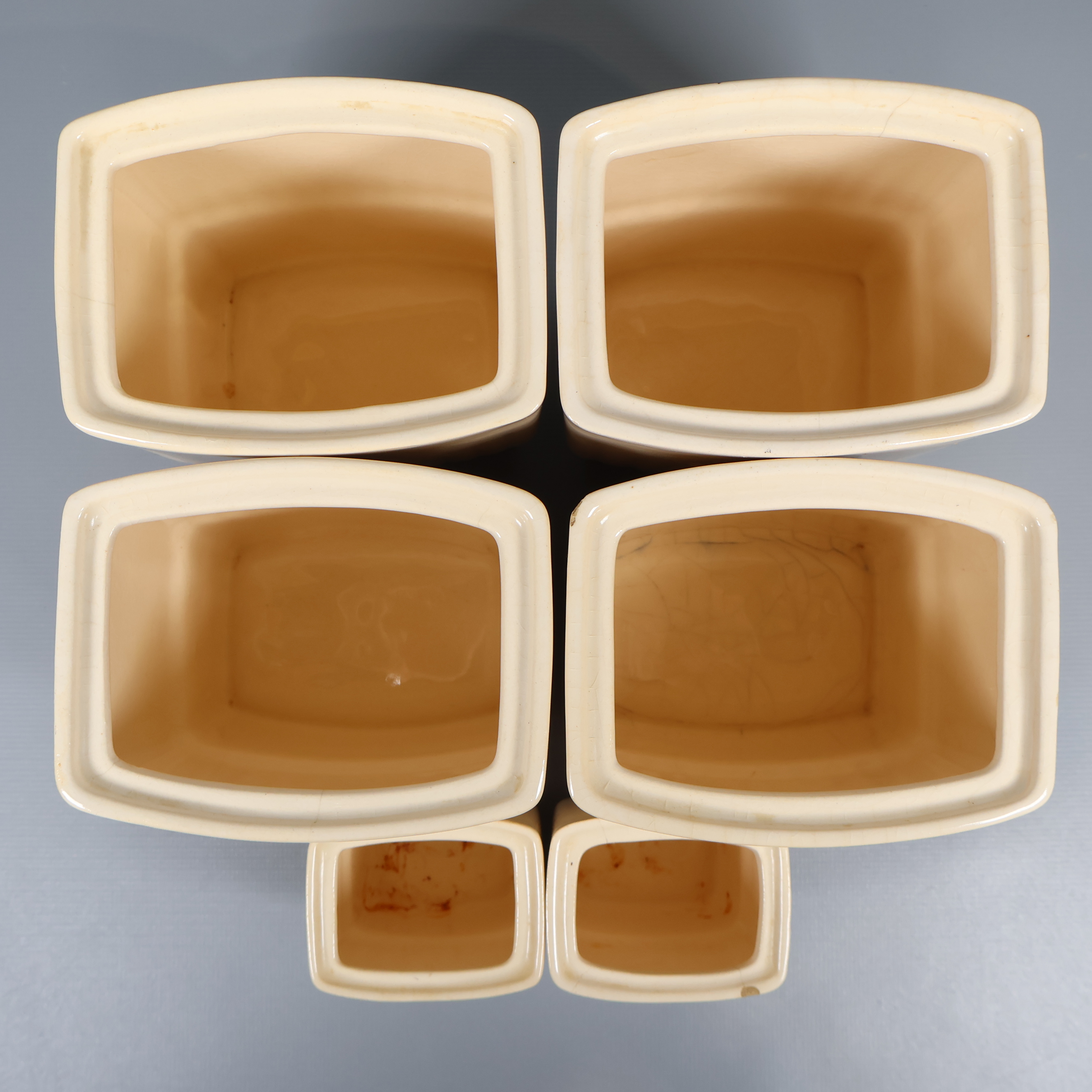 Sätt personlig prägel i köket med dessa sex rektangulära förvaringsburkar i krämig ton, dekorerade med handmålade blommor. Handtagen på två lock har blivit lagade. Det förekommer krackelering på och fläckar i flera av burkarna.