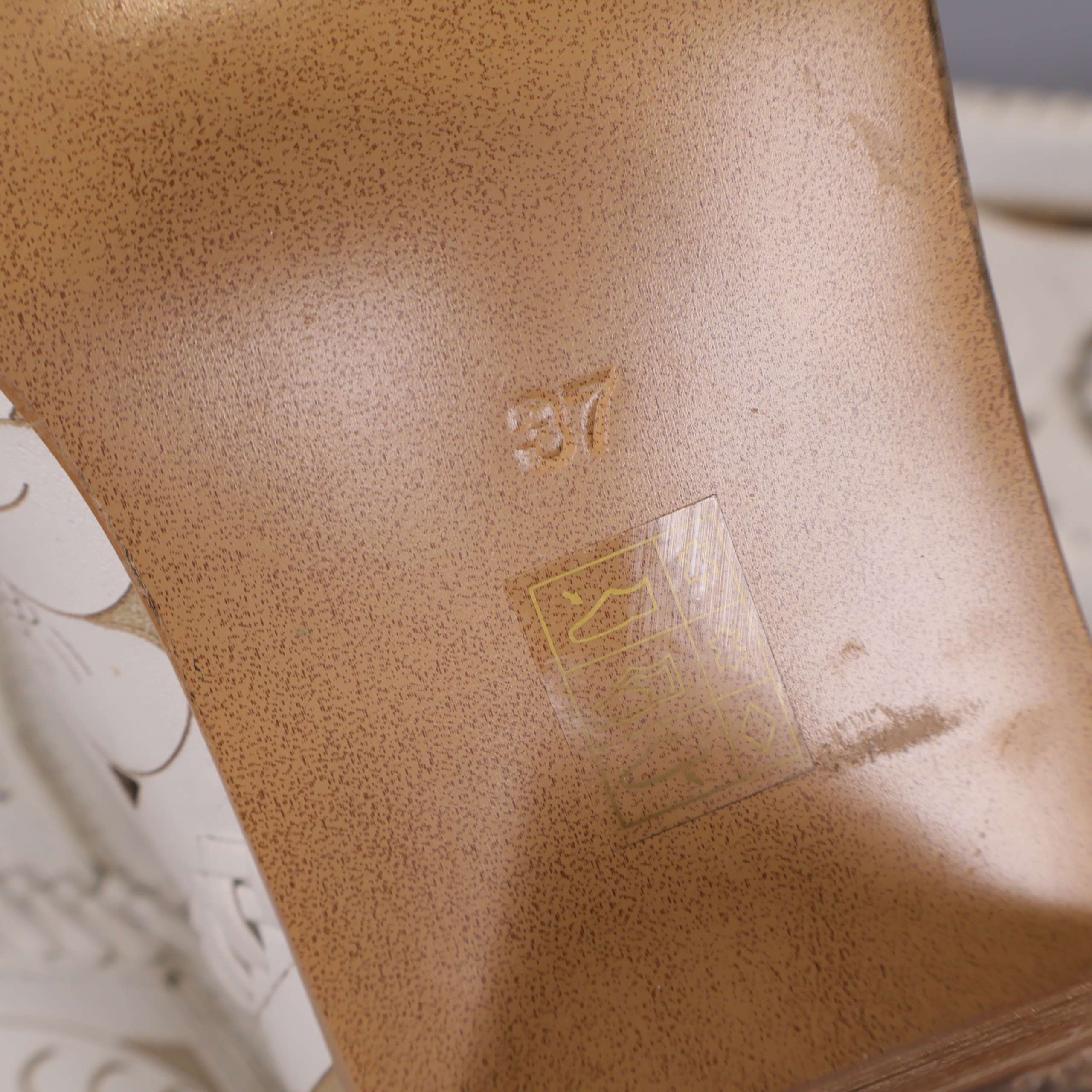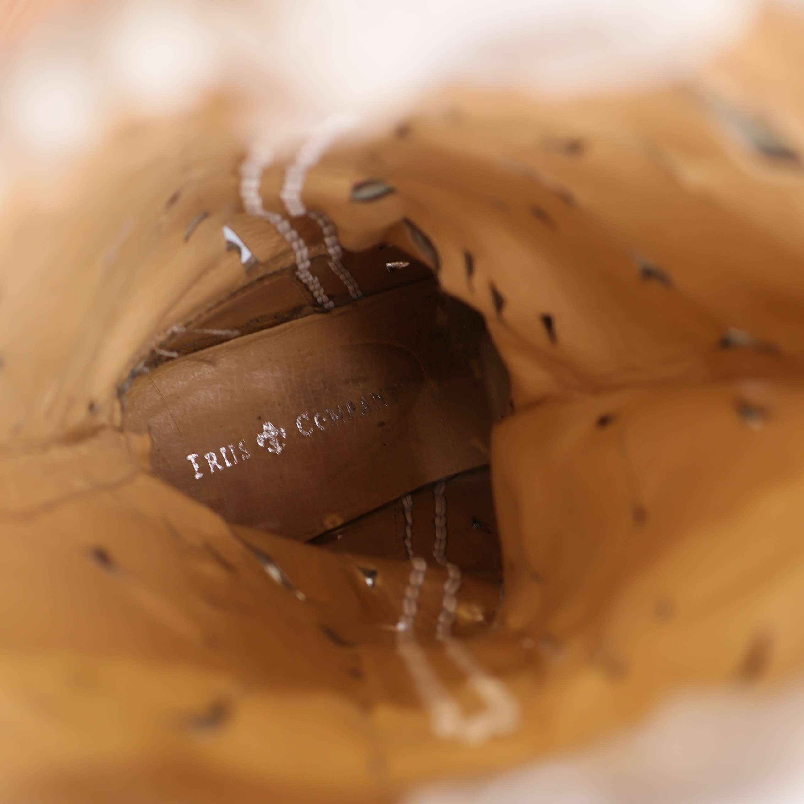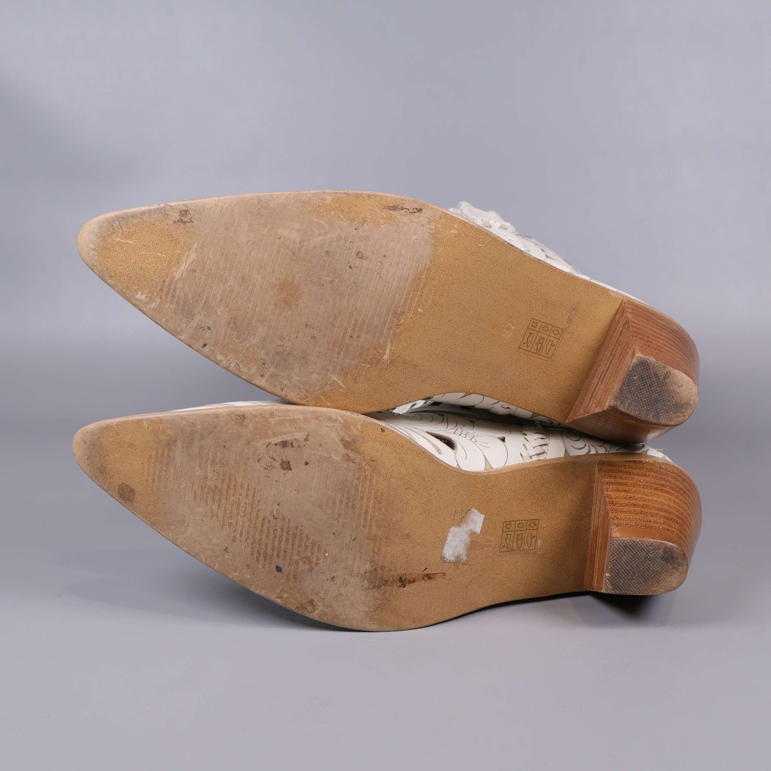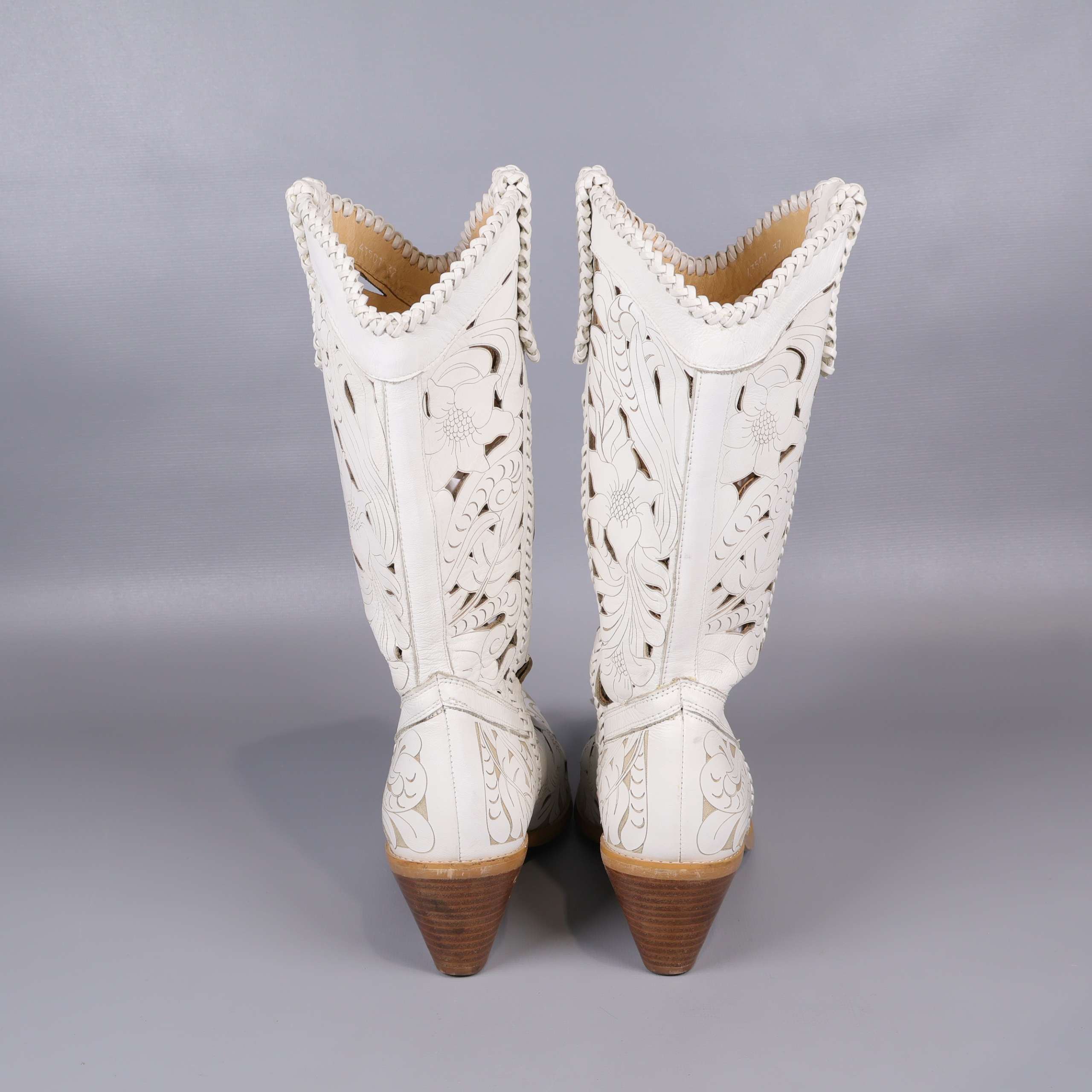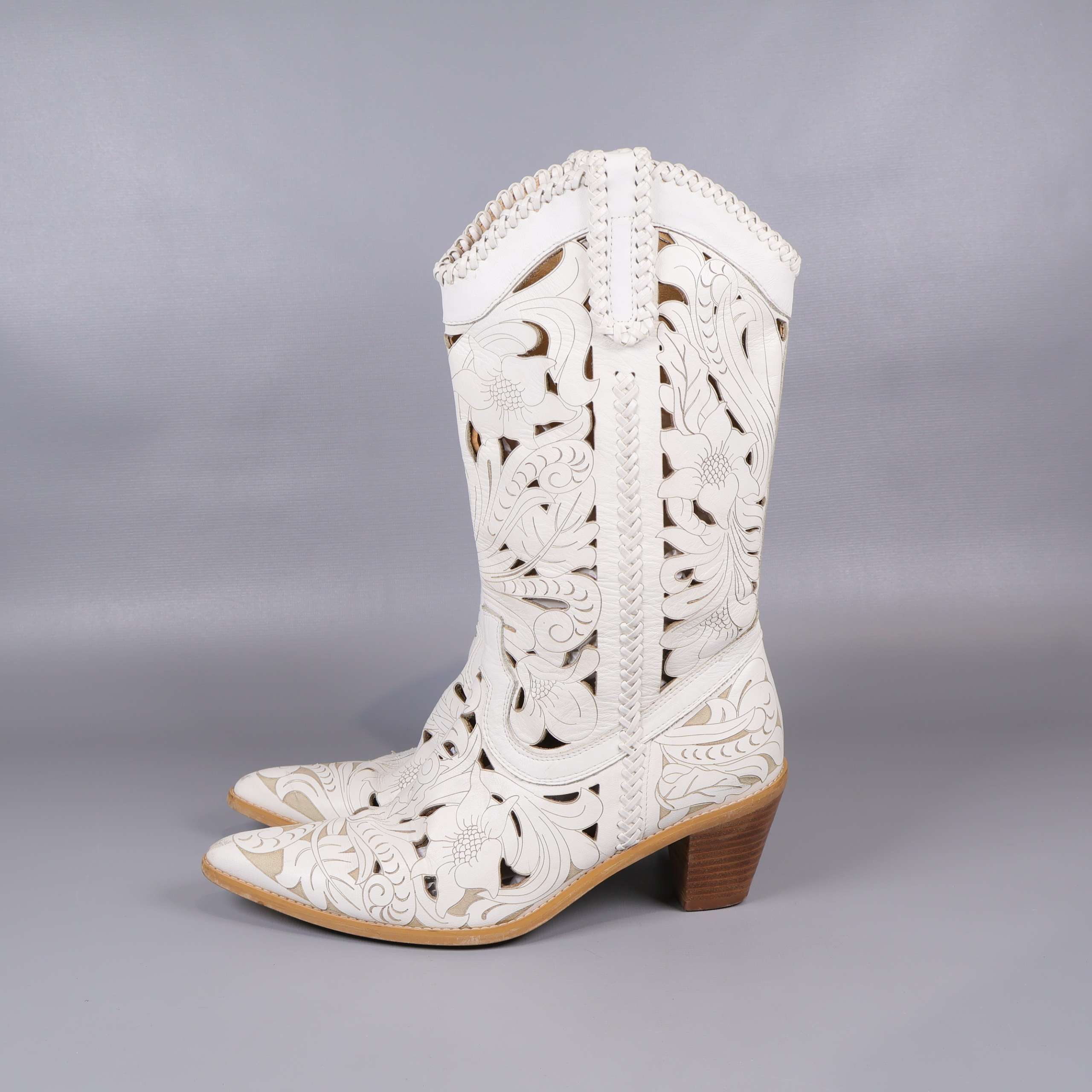 Stilrena boots med hög skaft och unikt utskuret blommönster över hela skon, som verkligen sticker ut. Den spetsiga tåformen och den bruna klacken ger en modern western-vibe. Materialet har en matt, vit look och detaljer längs kanten på skaftet. Perfekta för dig som gillar statement footwear och unik design.