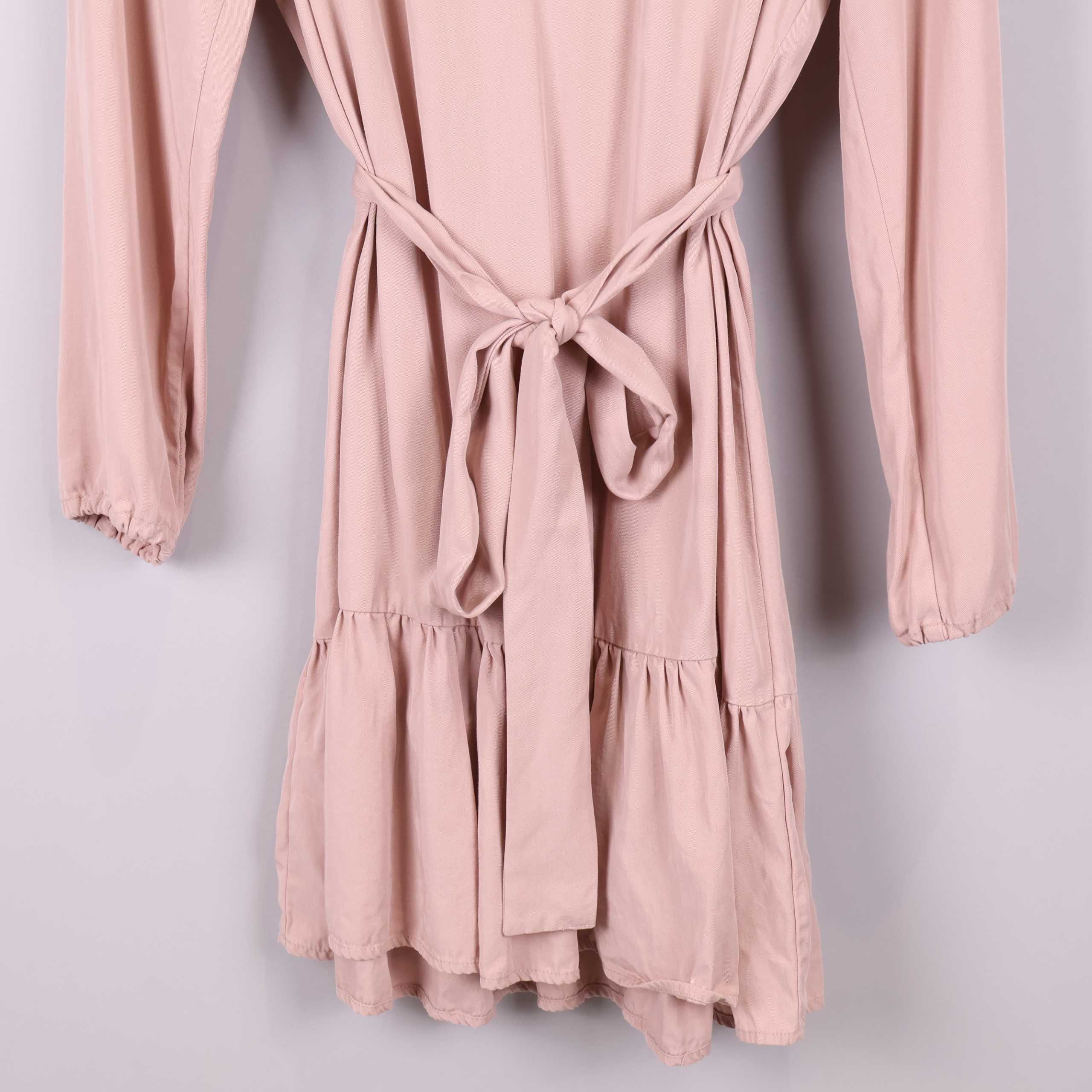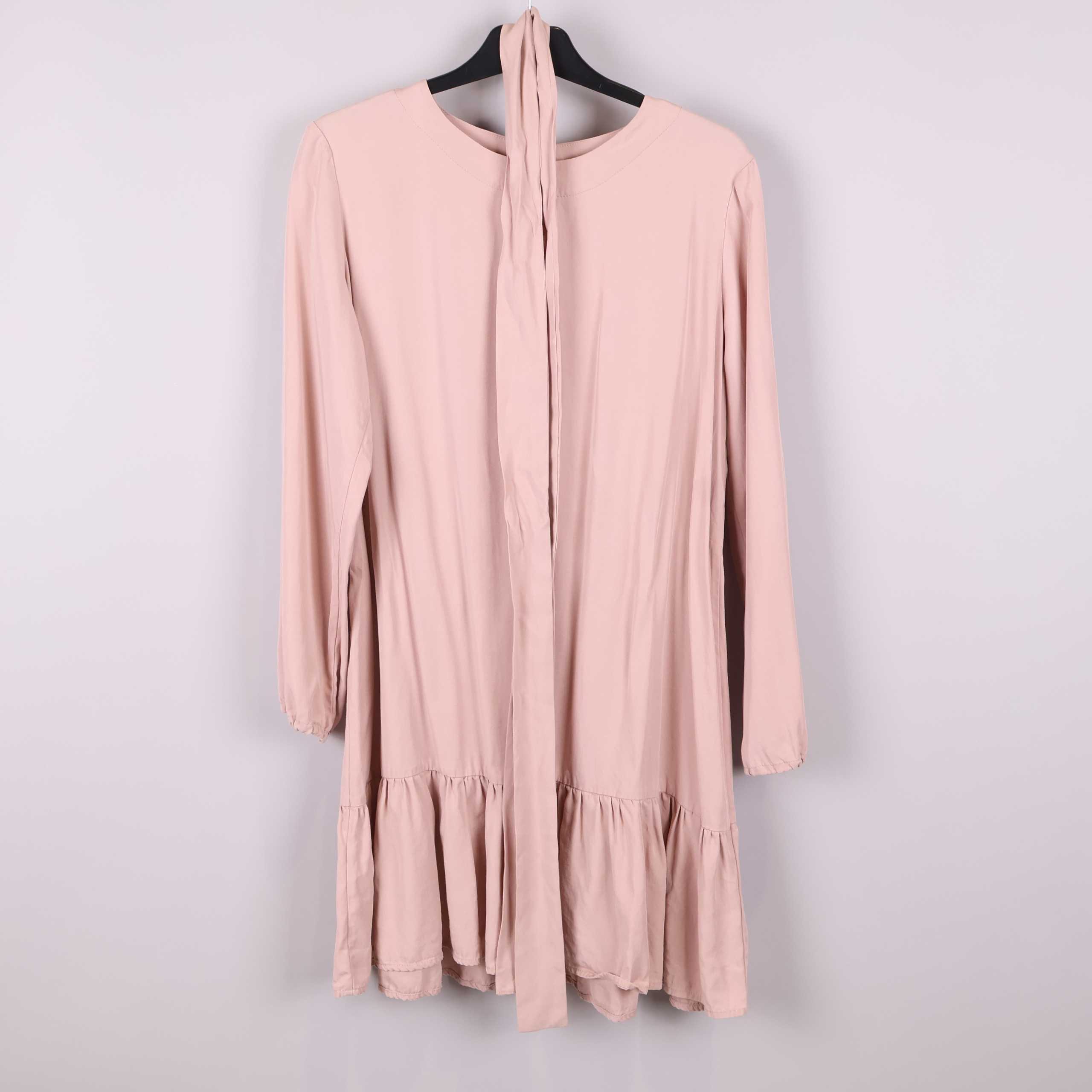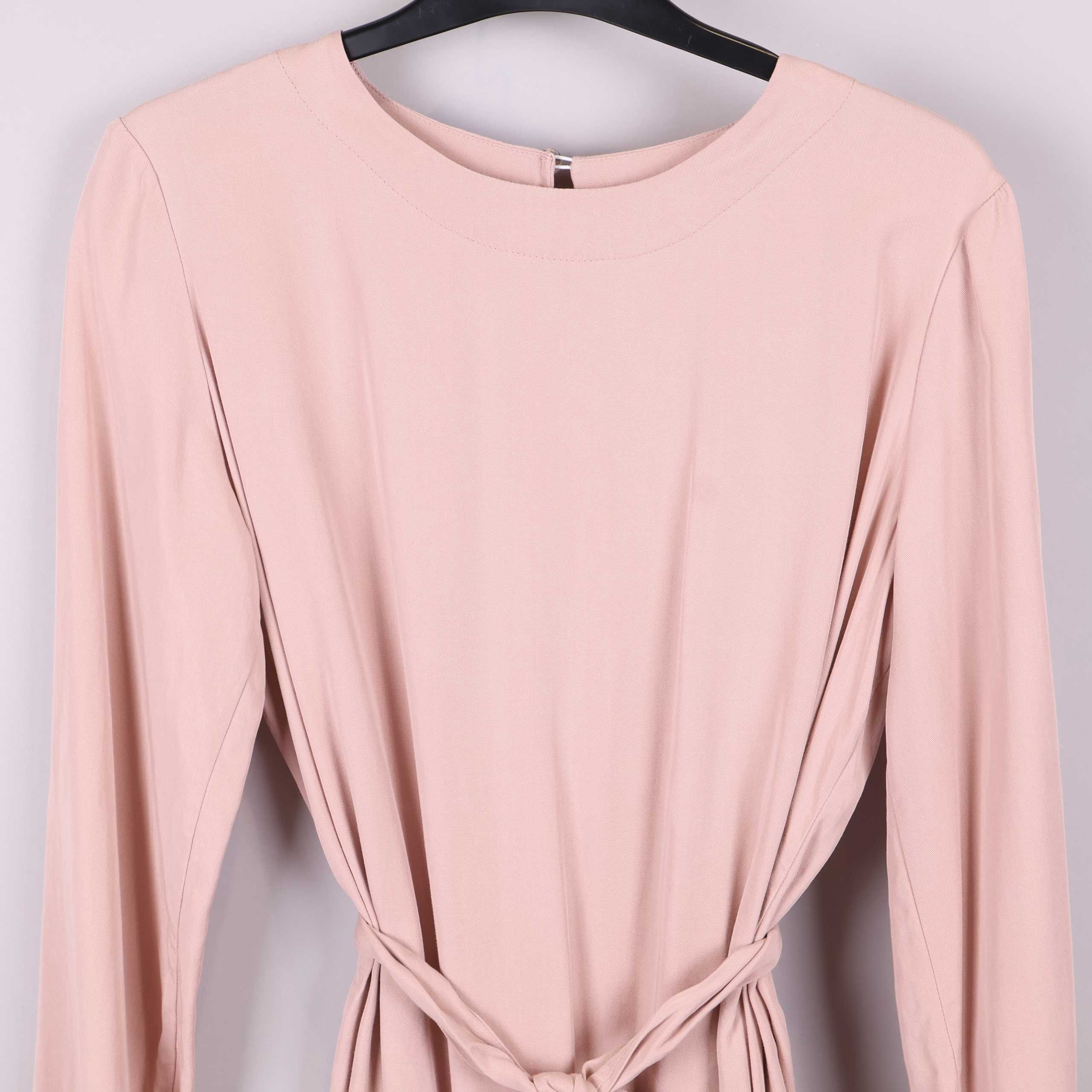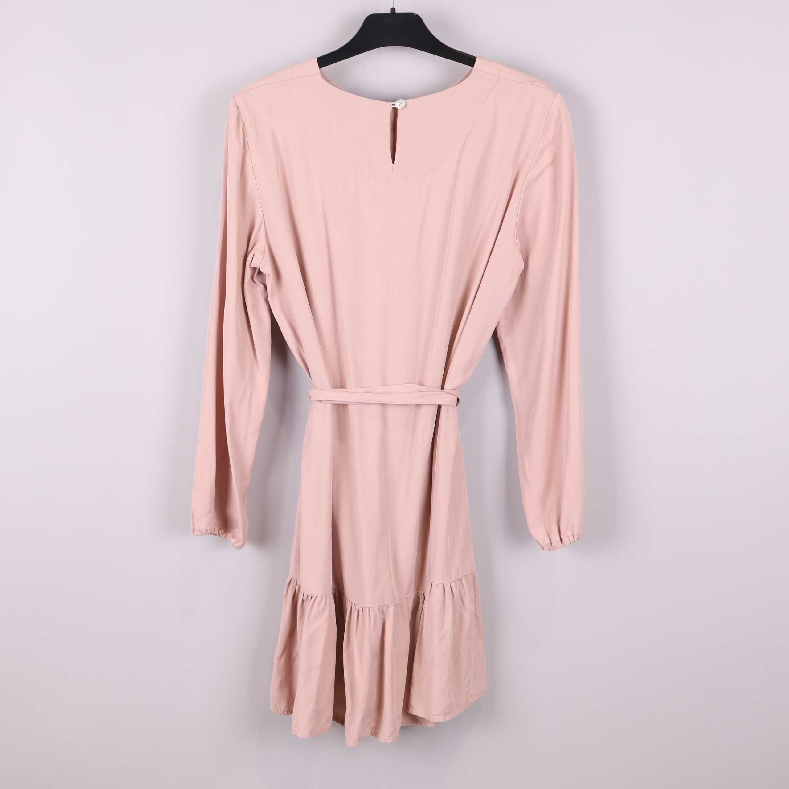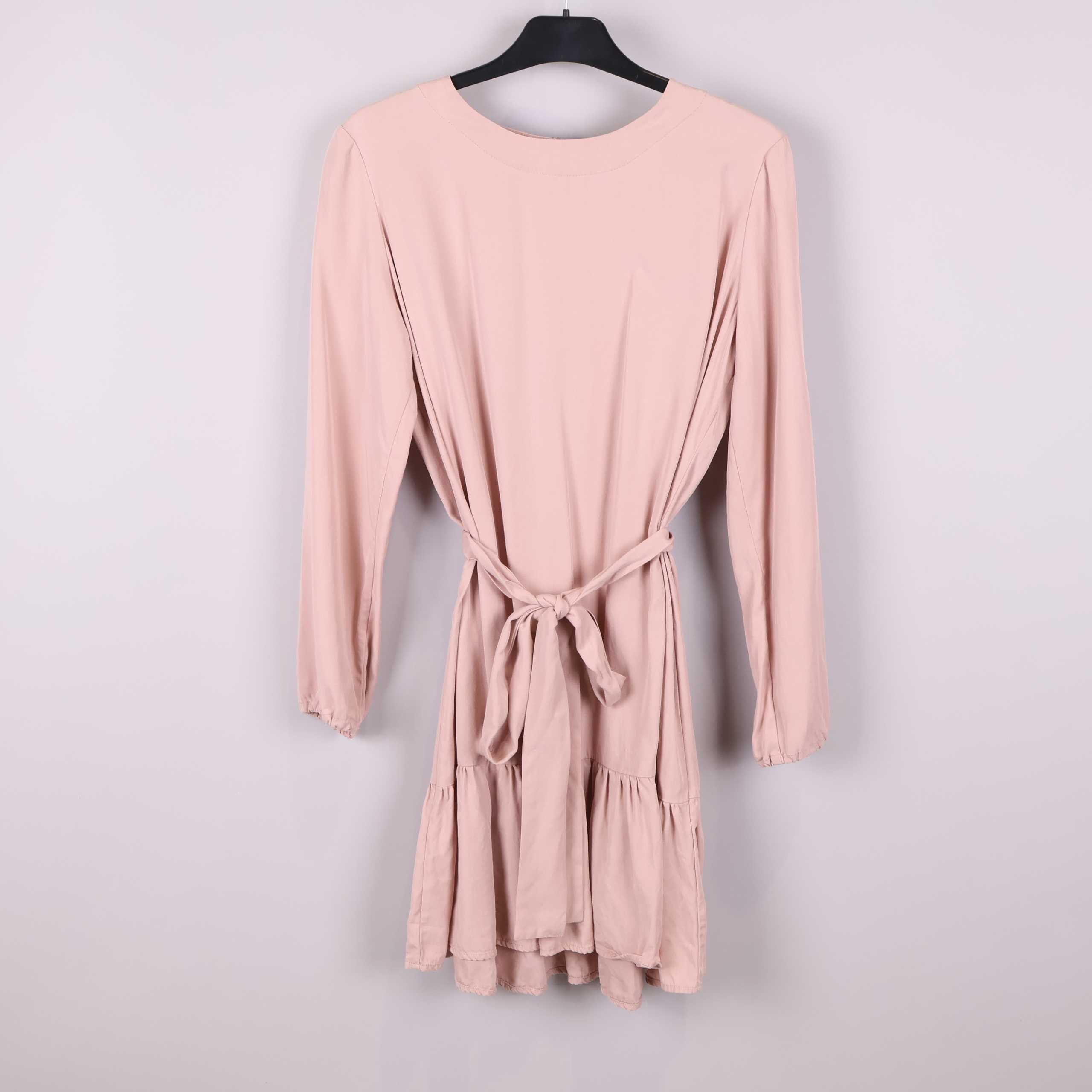Den här klänningen har en mjuk, ljusrosa ton och avslappnad passform med rund halsringning och långa ärmar. Det breda knytbandet i midjan framhäver siluetten och volangdetaljen längst ner ger en lätt och lekfull känsla. Tillverkad i 100% Tencel för en smidig och bekväm känsla. E