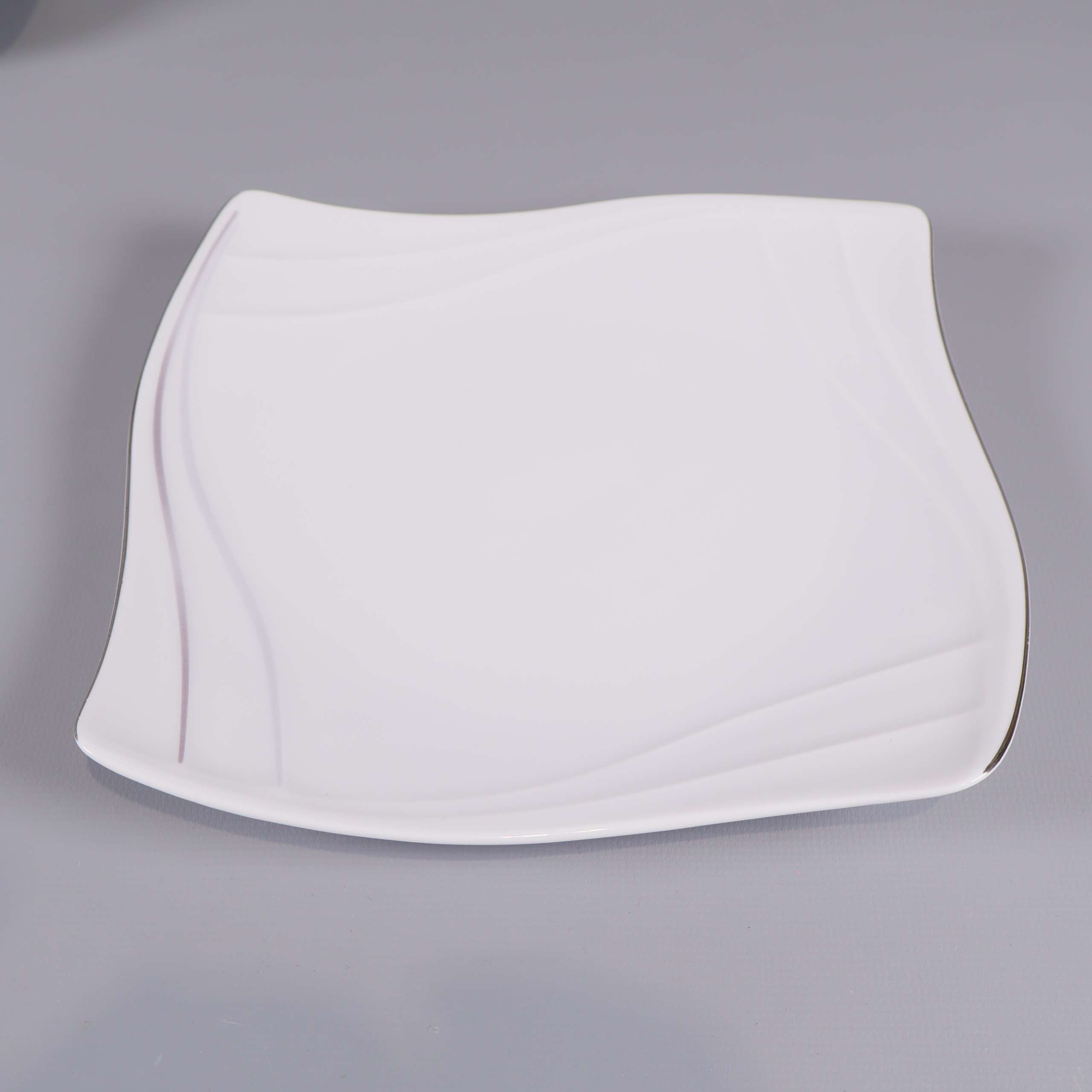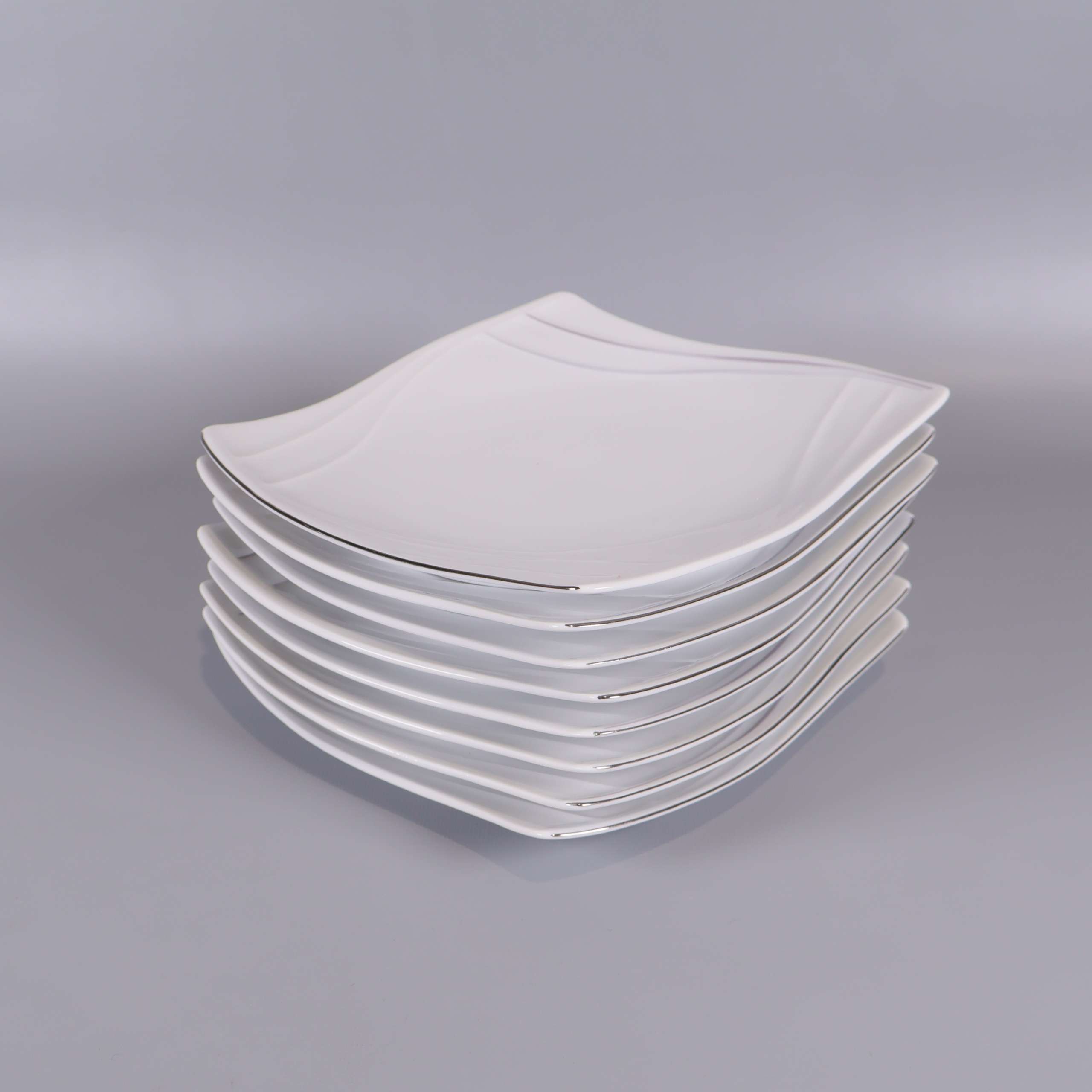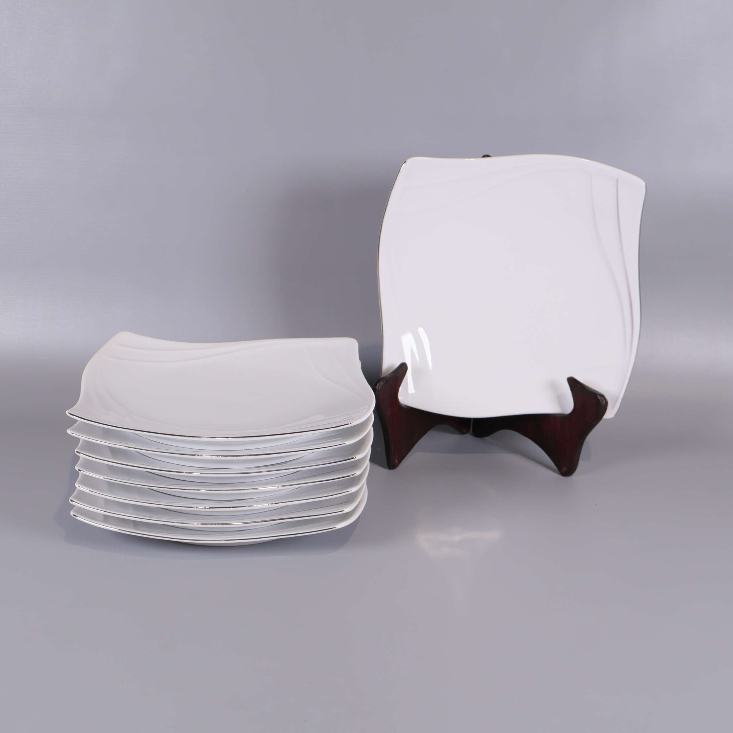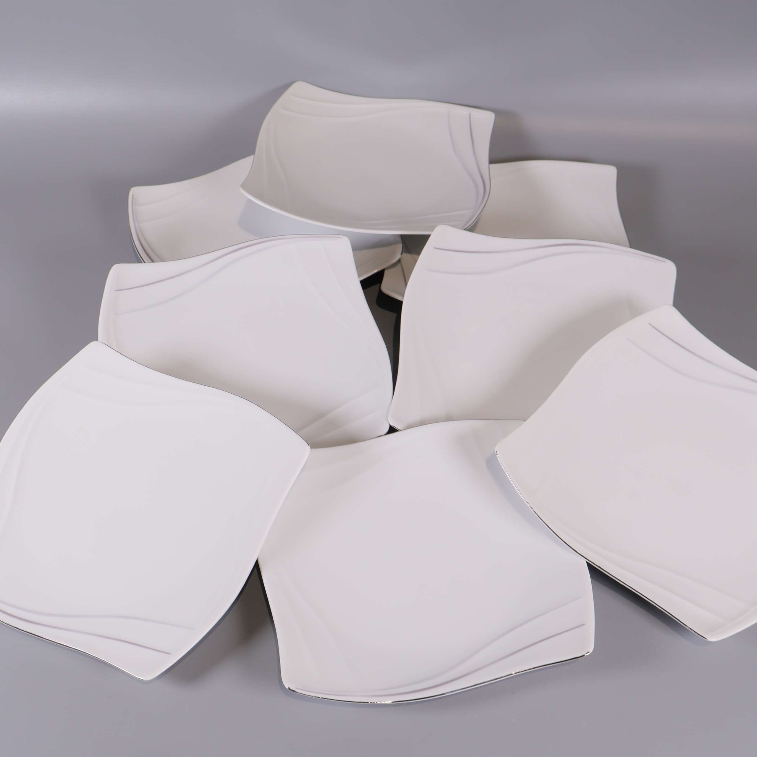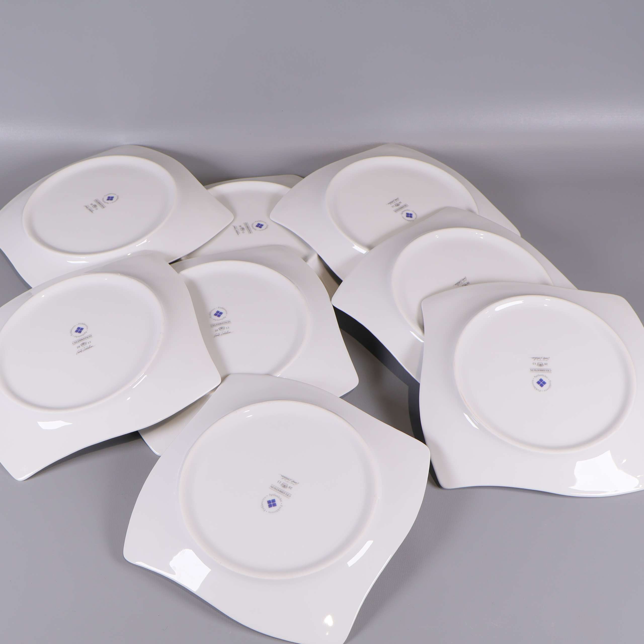 Set om åtta fyrkantiga assietter i modern vågformad design. Den blanka vita ytan ger en fräsch och stilren känsla som passar både till vardag och fest. En dekorativ detalj på varje dukning, och stapelbara för enkel förvaring.