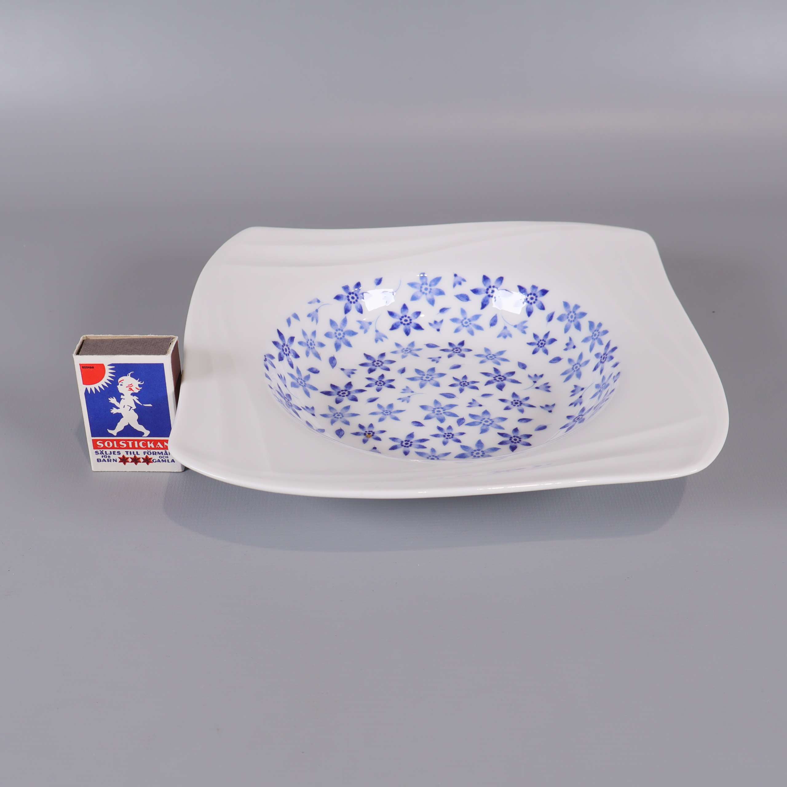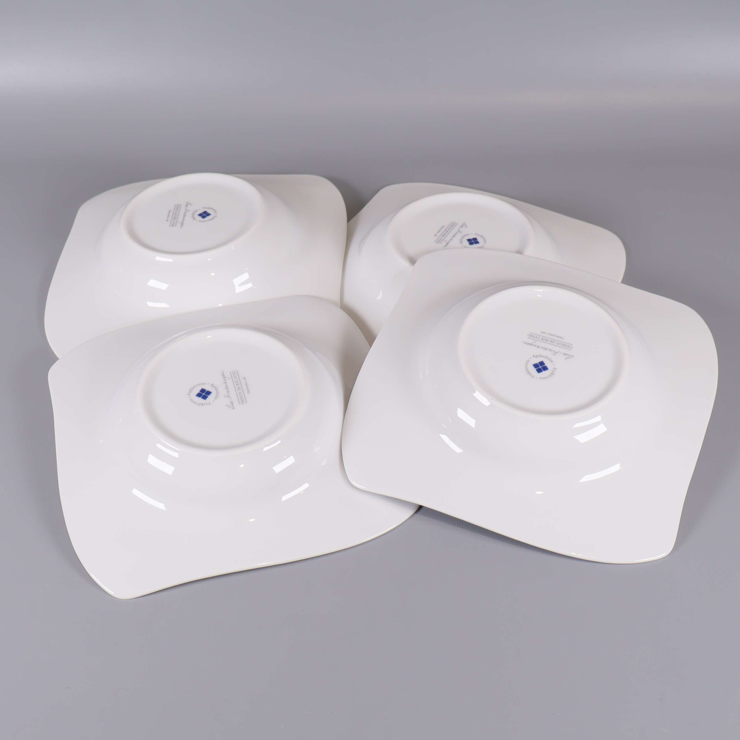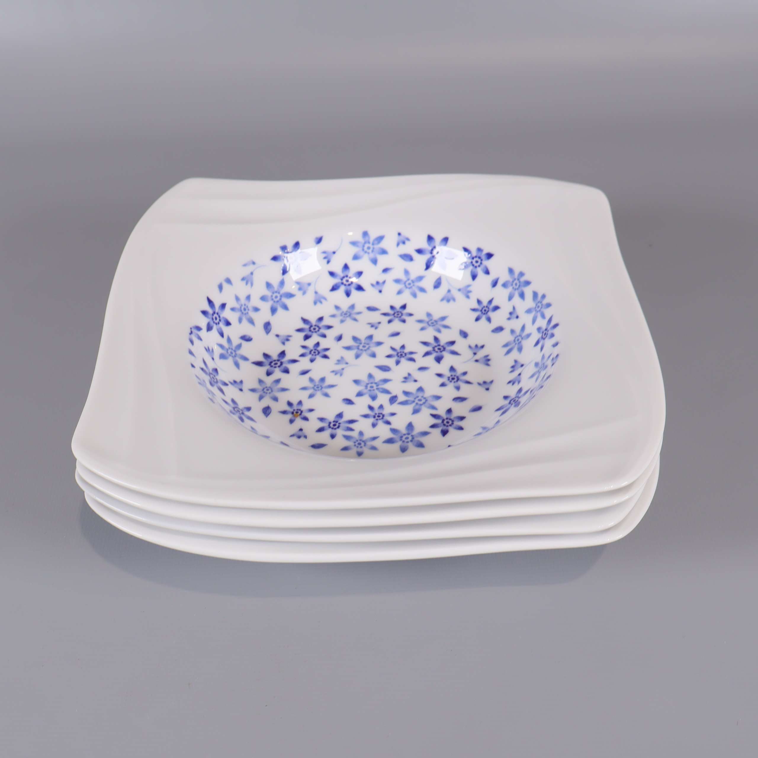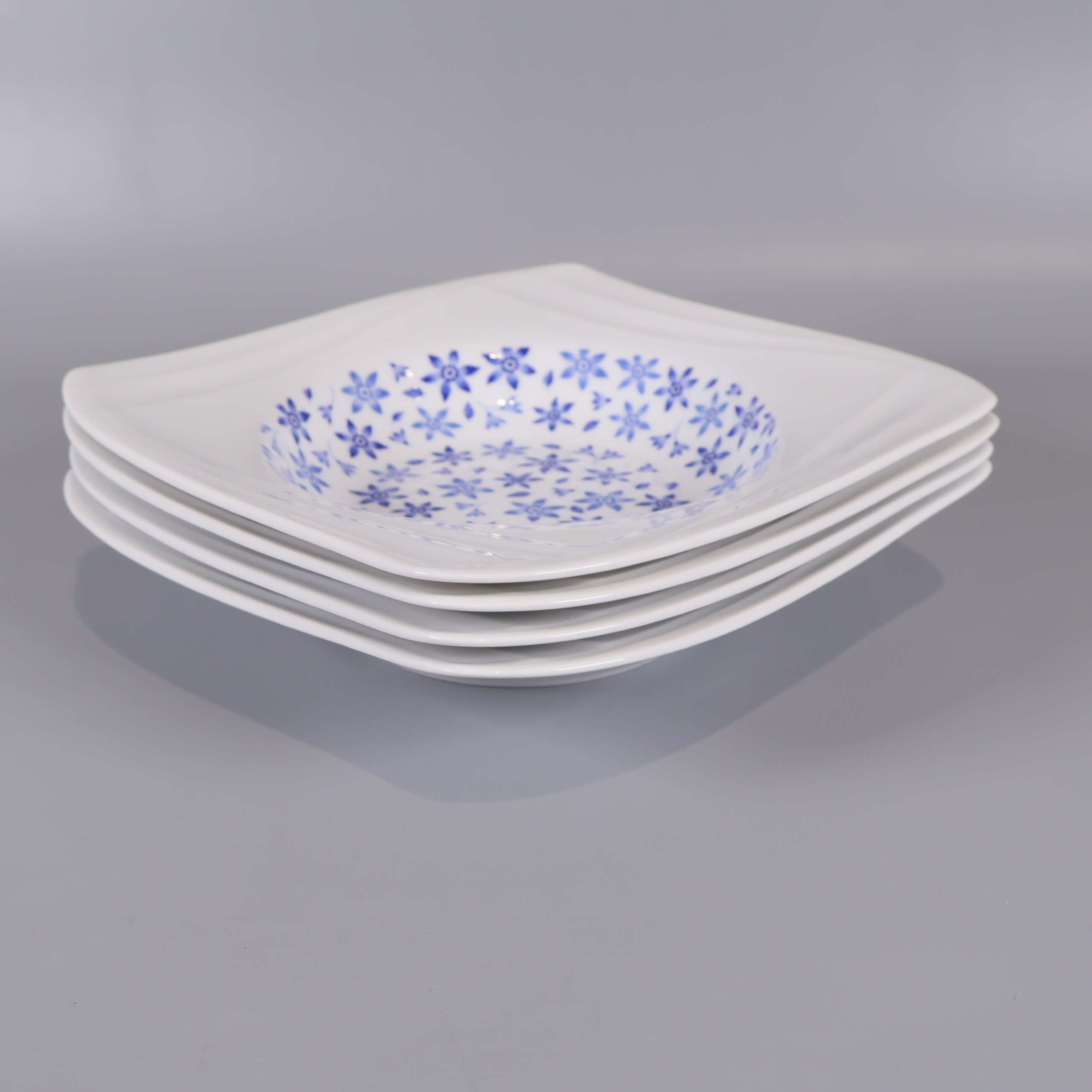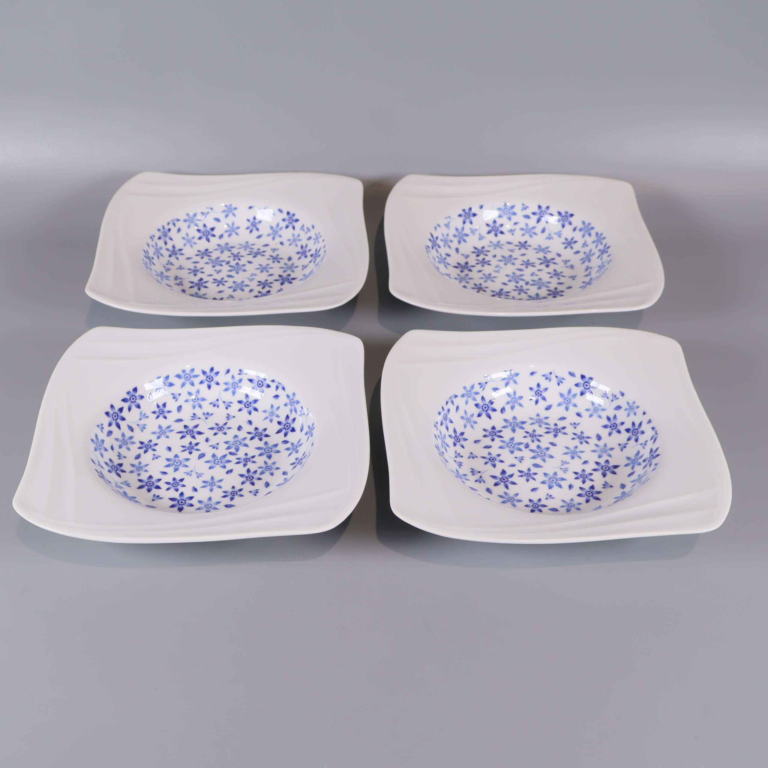 Fyra djupa tallrikar från Fyrklövern med modern fyrkantig form och blått blommönster. Klassisk vit bas med dekorativ detalj, designade för att sticka ut på middagsbordet.