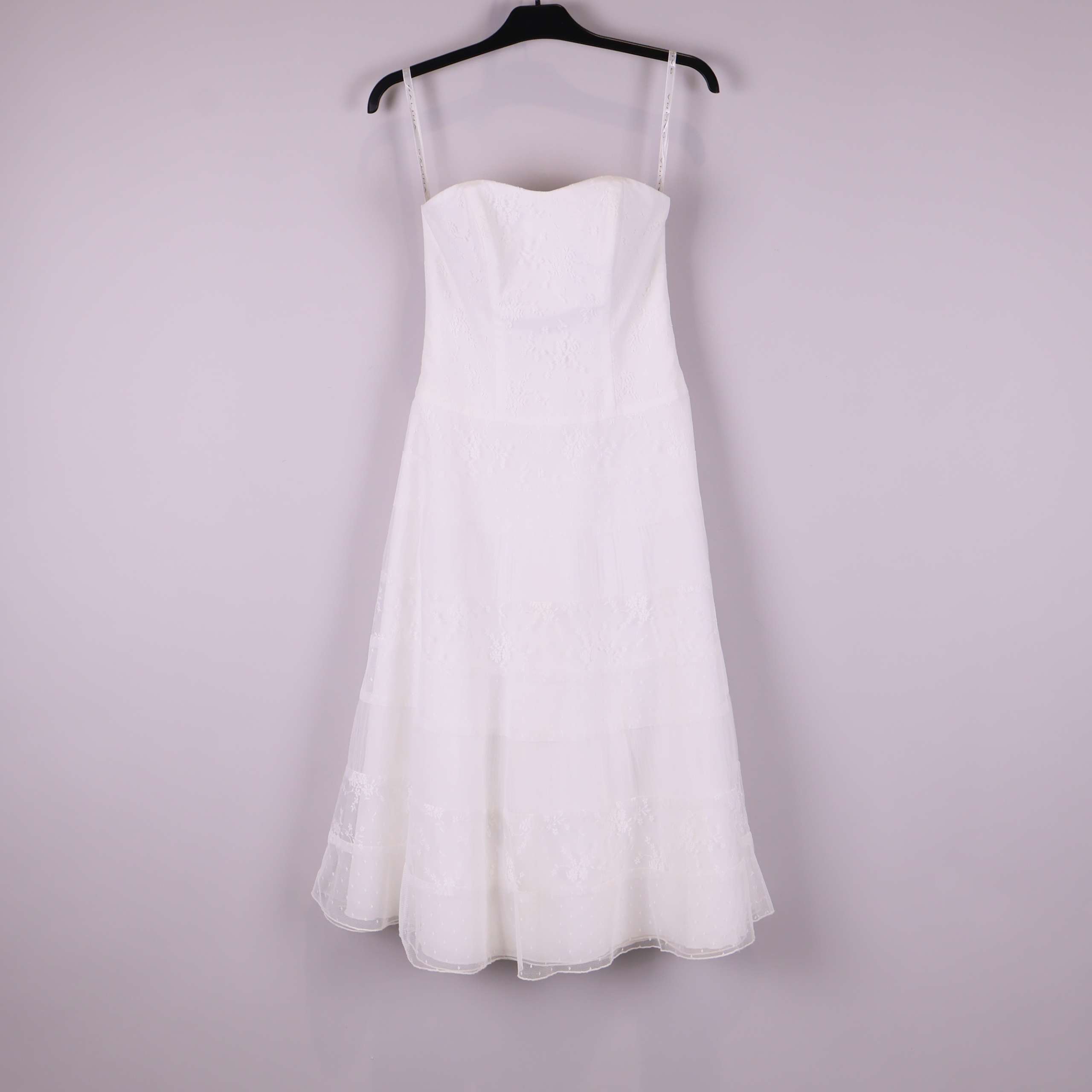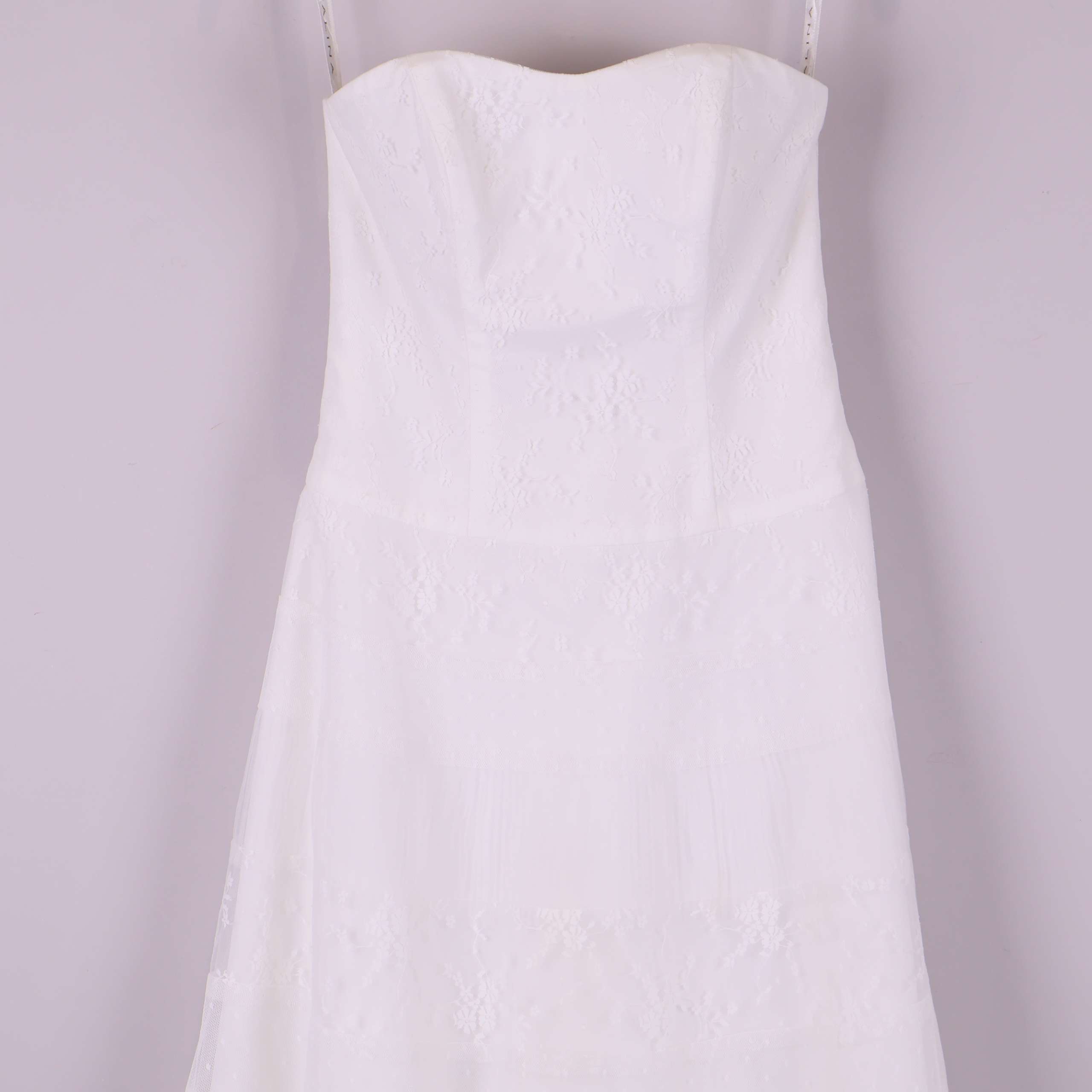 Den här axelbandslösa klänningen har en mjukt utsvängd siluett och vacker spetsdetalj i tyget, vilket ger en elegant och tidlös känsla. Lätt glans i materialet och tunna, avtagbara axelband. Fodrad för ökad komfort och med dolda sömmar för en stilren finish.