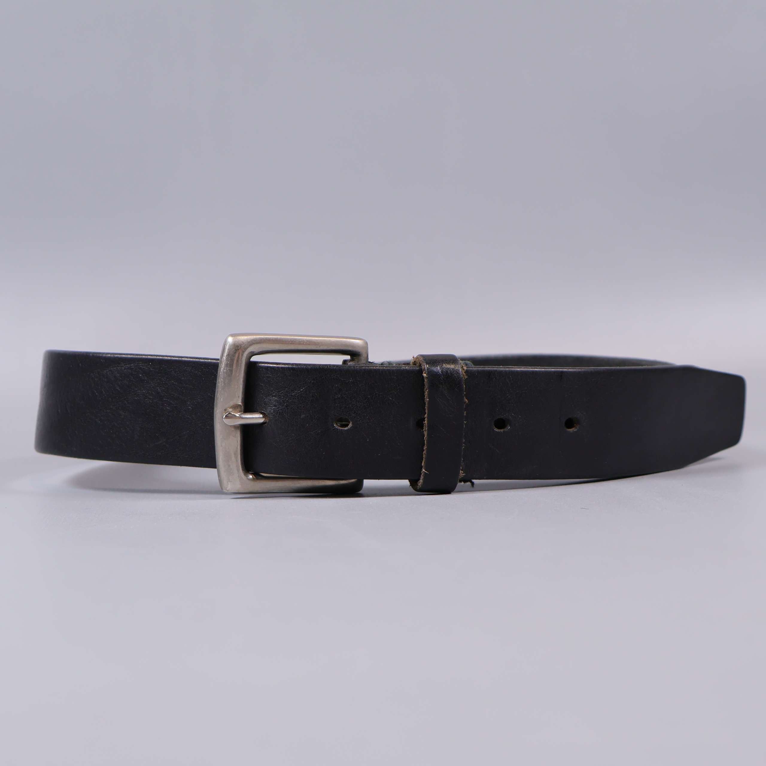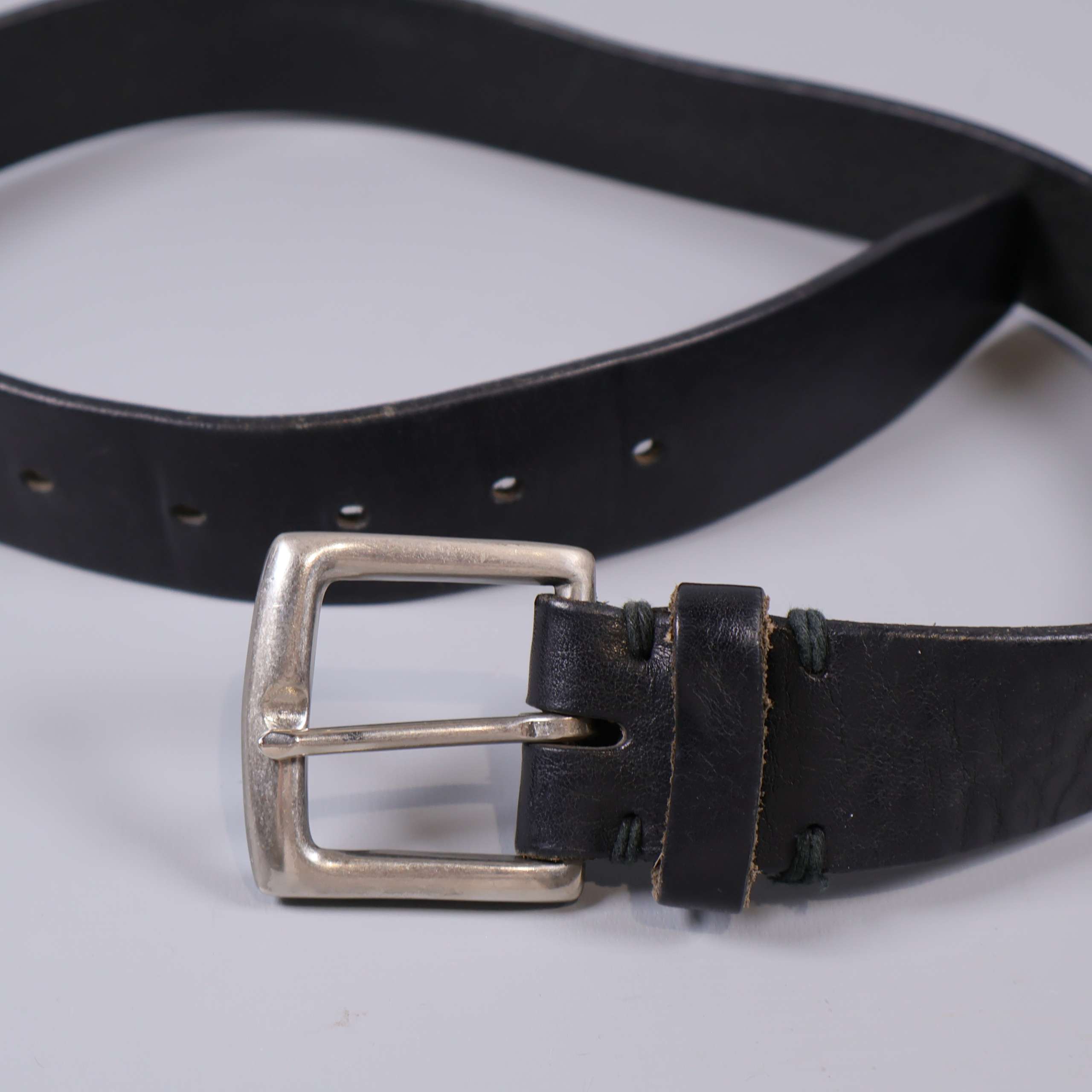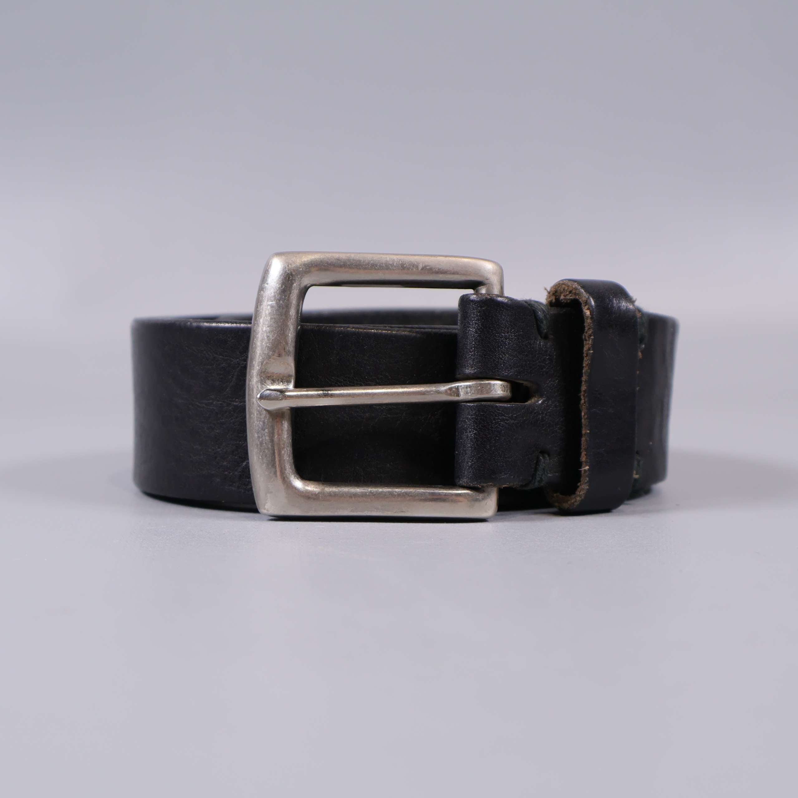 Klassiskt bälte i svart läder med kraftigt metallspänne och enkel, stilren design.