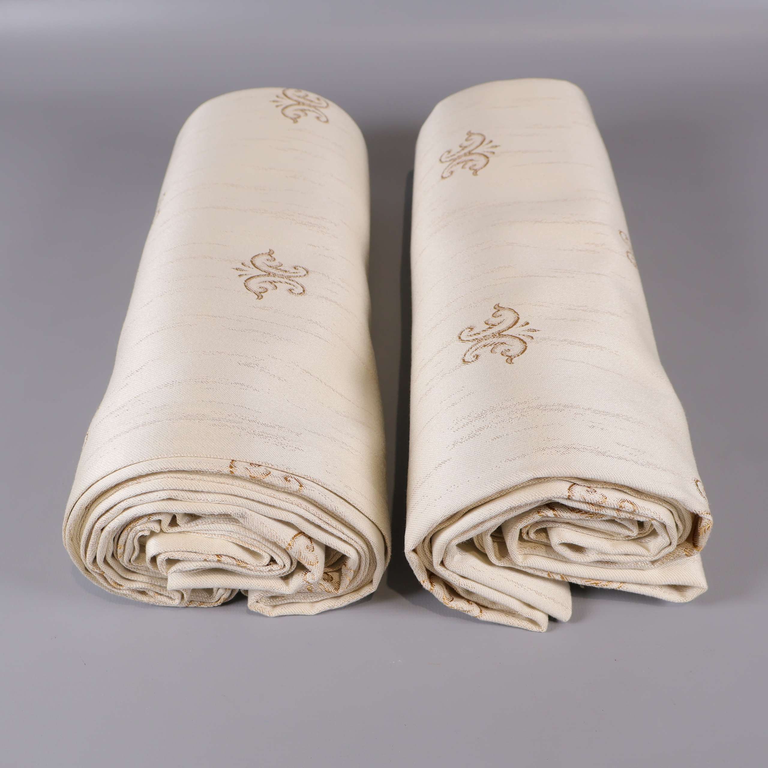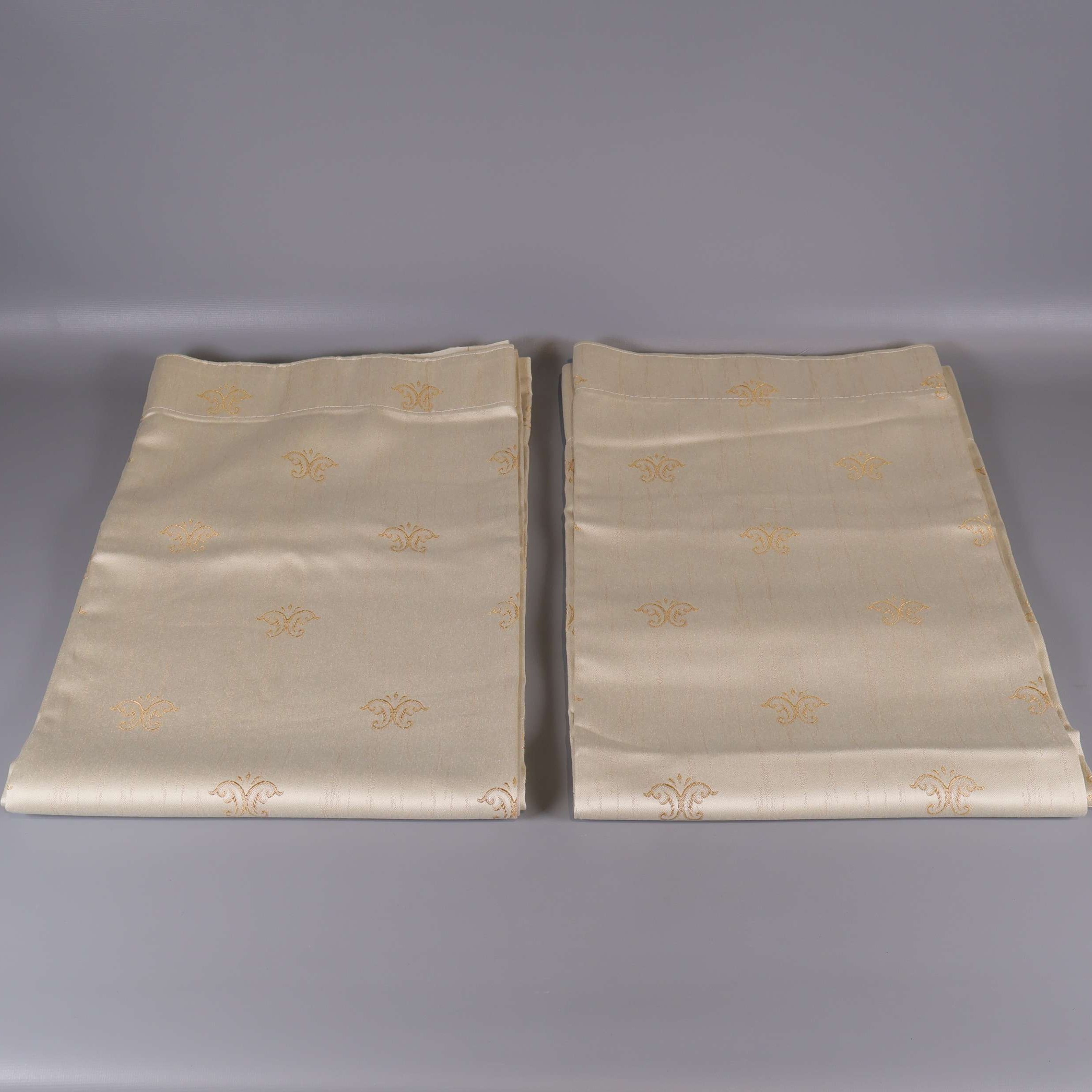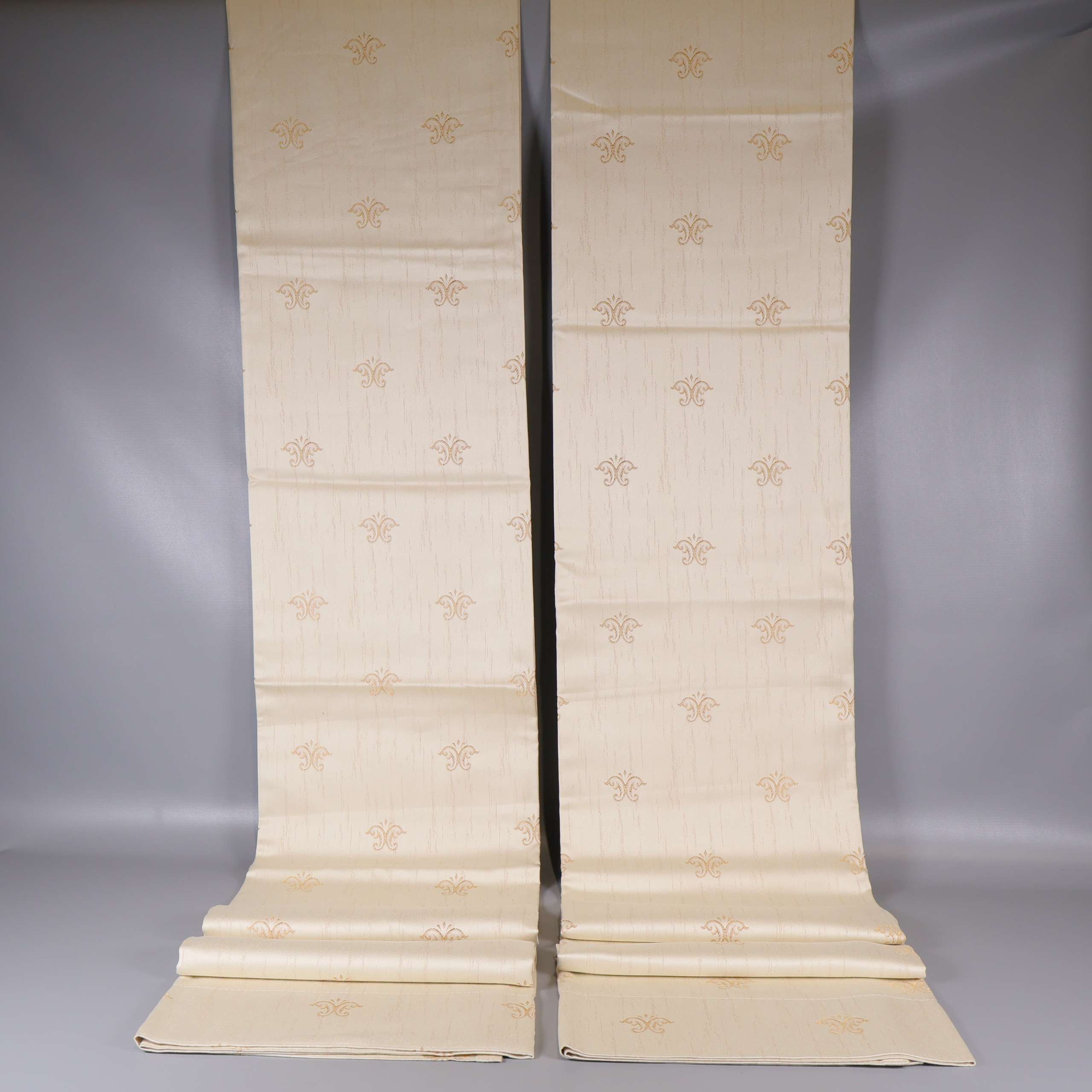 Två längder gardiner i en elegant, ljus krämfärgad ton med broderat diskret mönster ton i ton. Tyg med lätt glans och klassisk look, ger ett lyxigt och stilrent intryck både upprullat och upphängt.