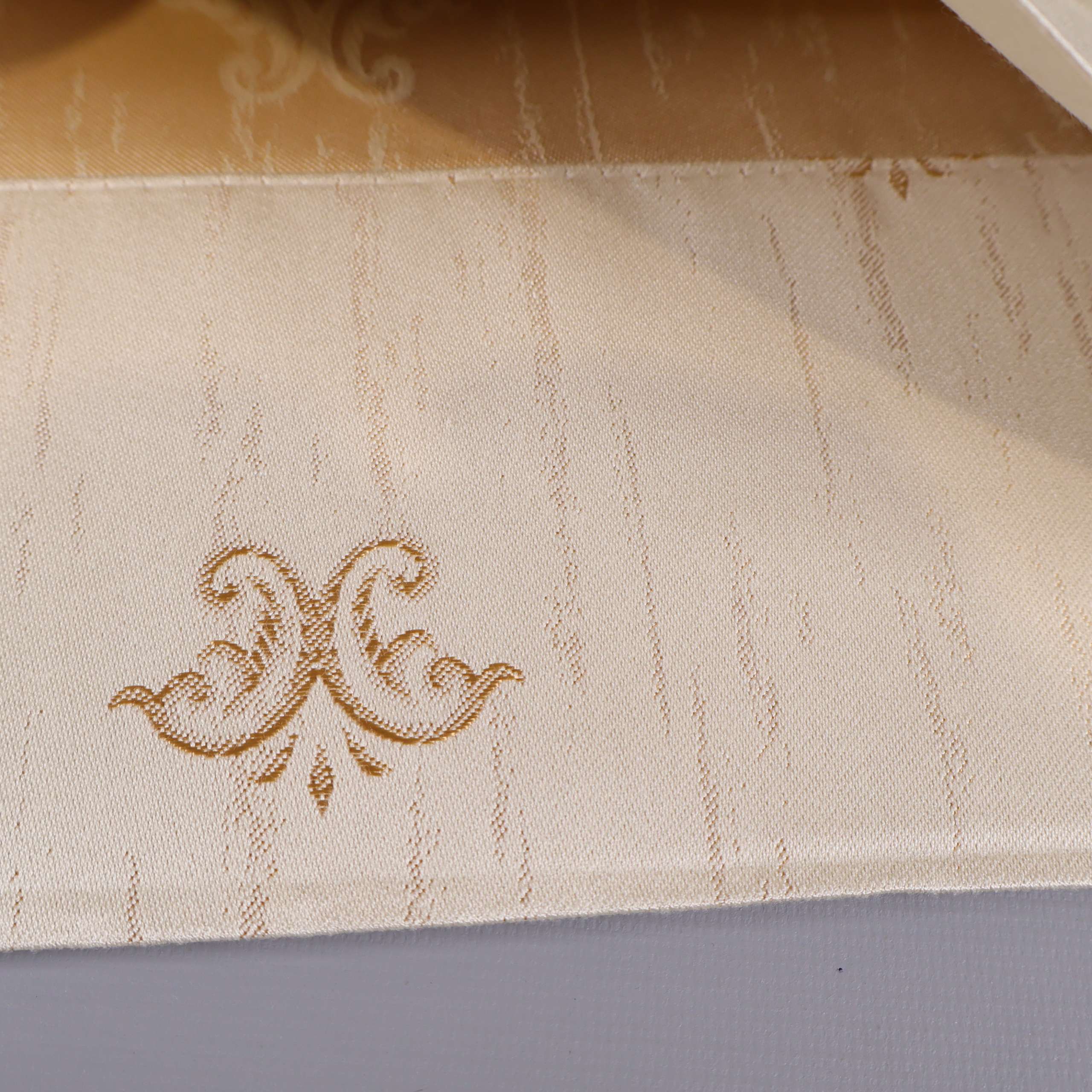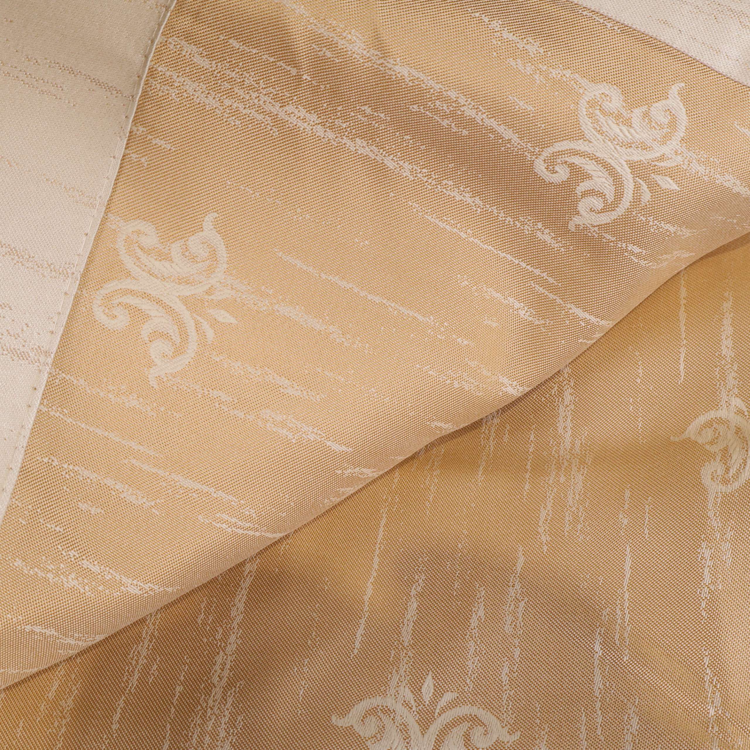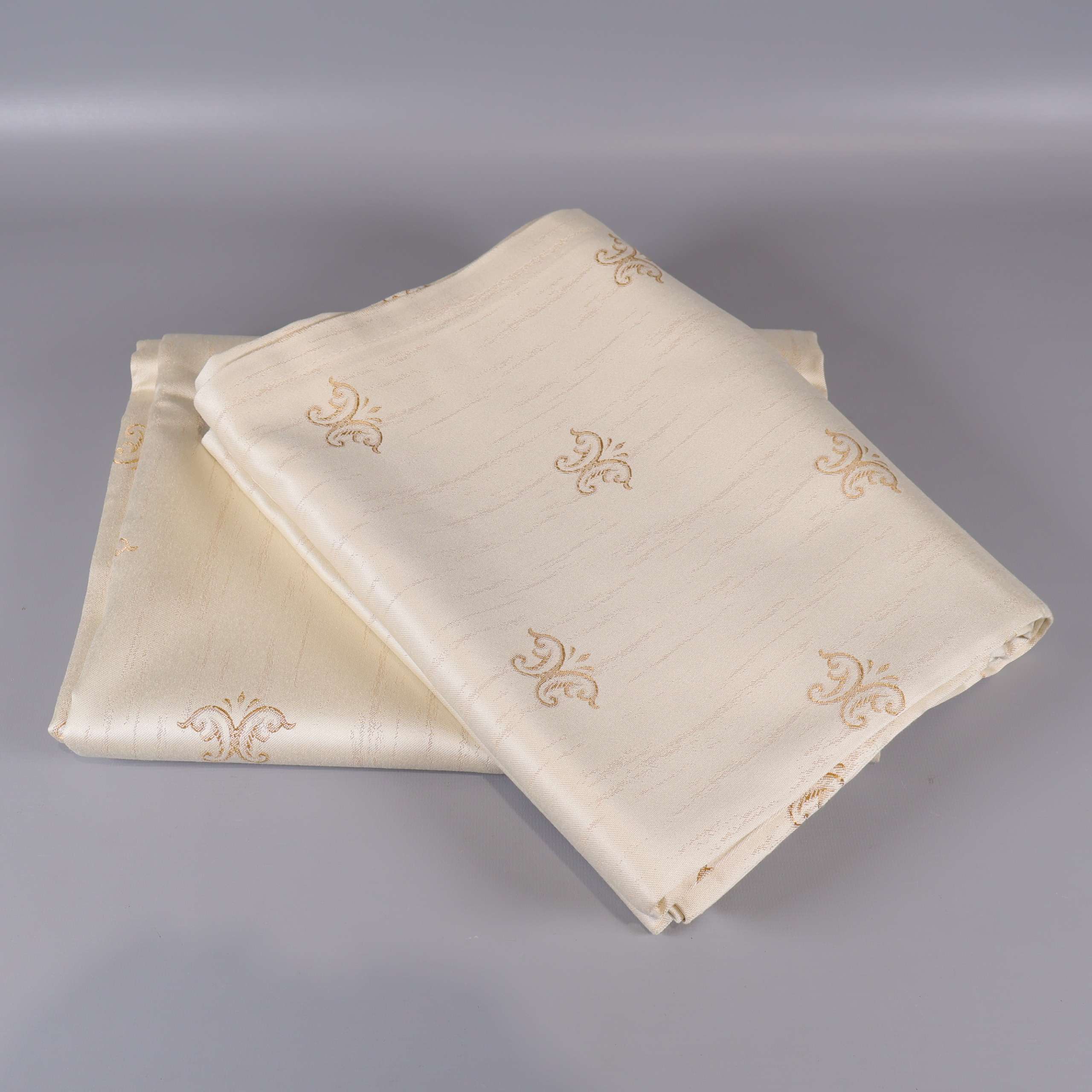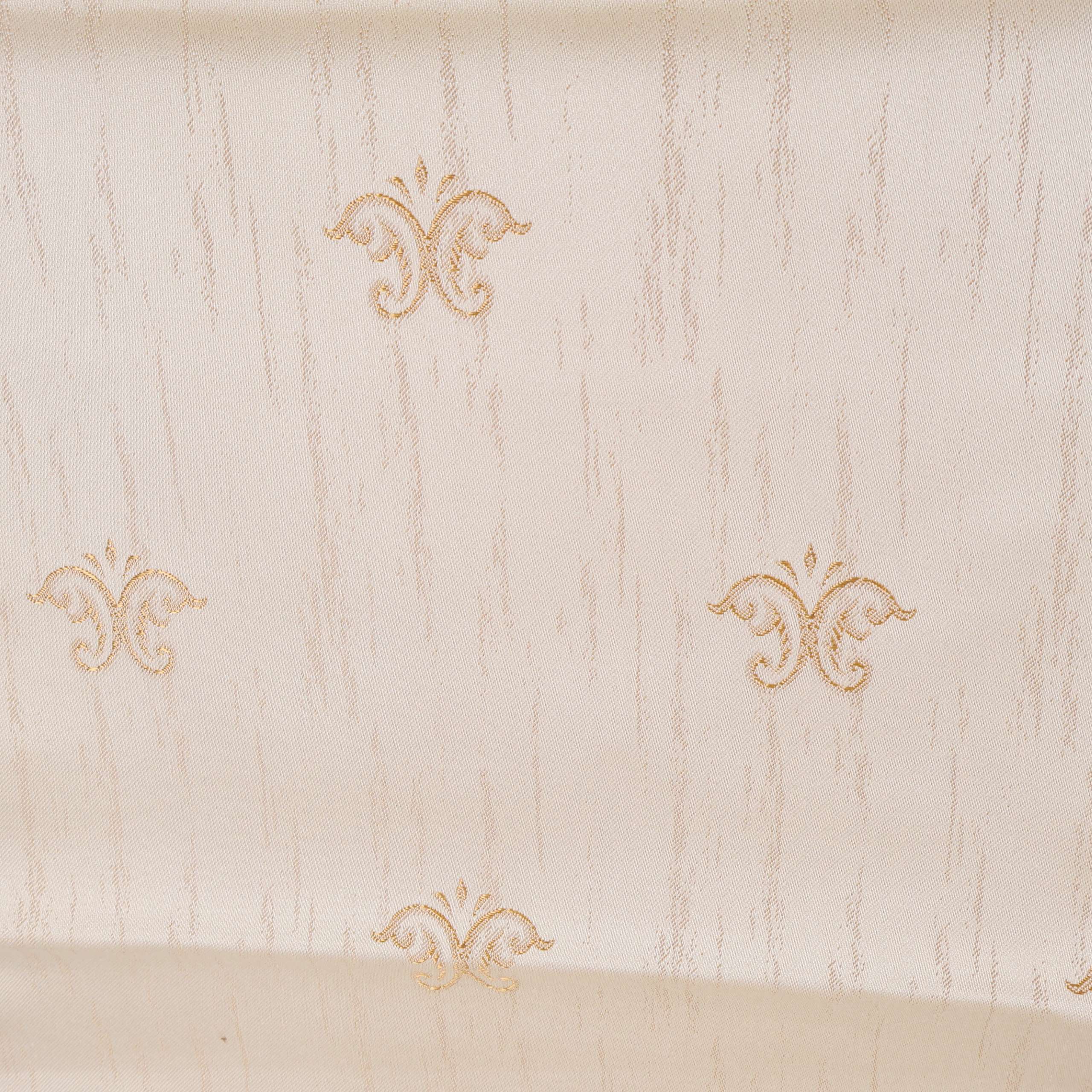 Två längder gardiner i en elegant, ljus krämfärgad ton med broderat diskret mönster ton i ton. Tyg med lätt glans och klassisk look, ger ett lyxigt och stilrent intryck både upprullat och upphängt.