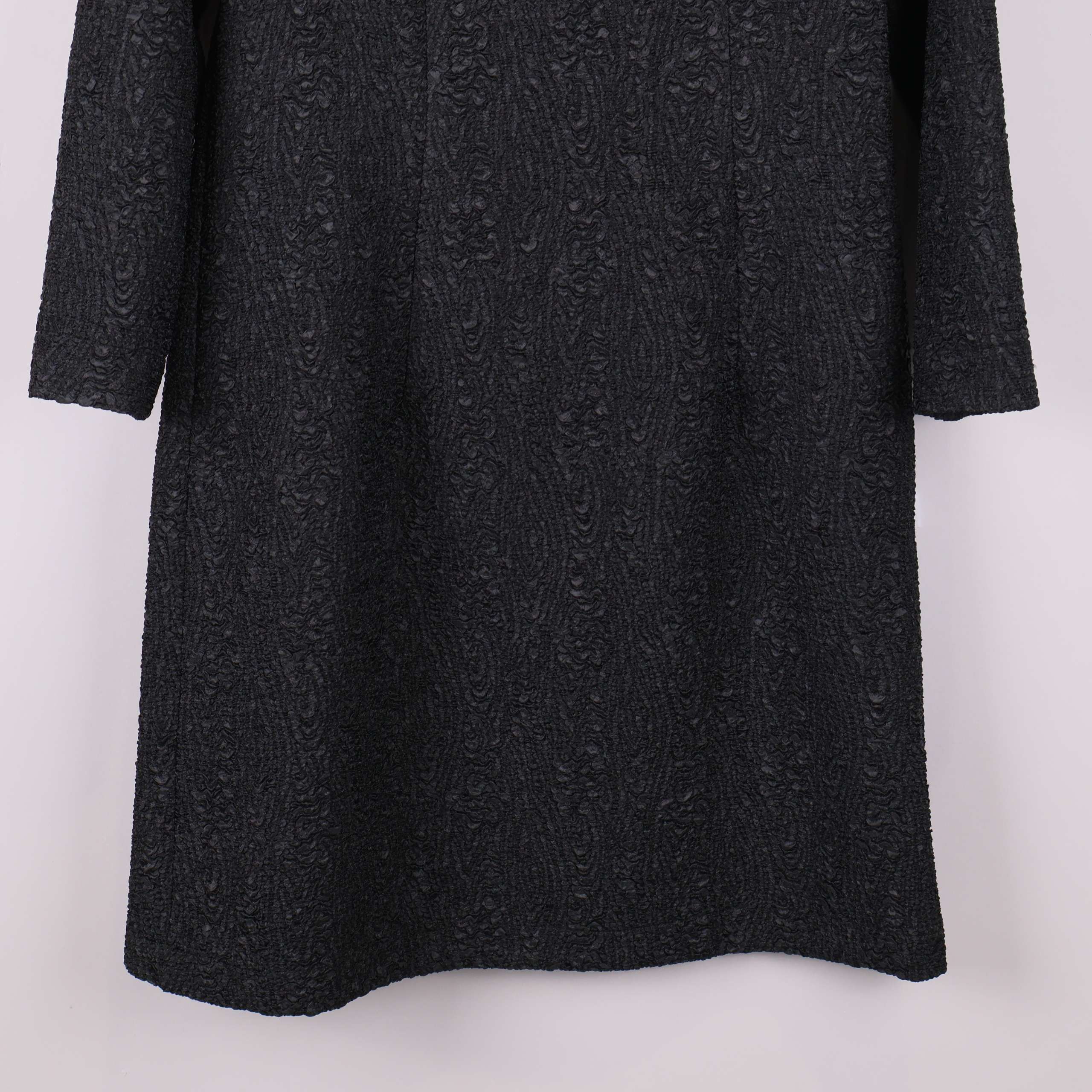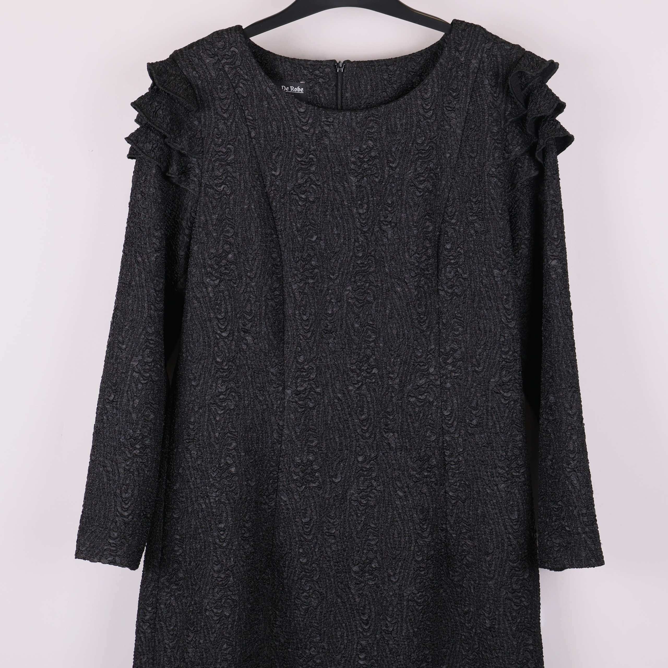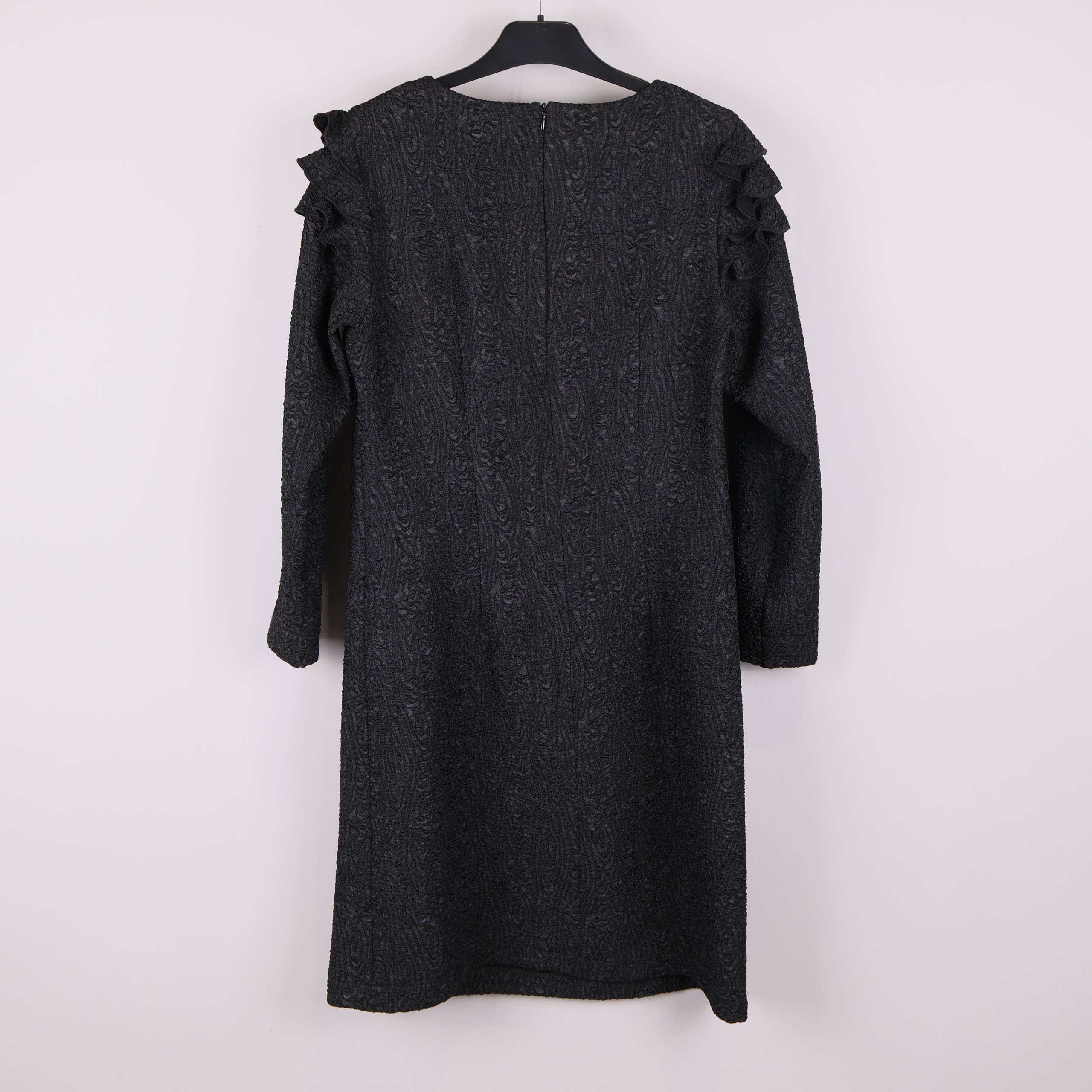 En stilren svart klänning med subtil struktur i tyget och långa ärmar. Volangdetaljer på axlarna ger en unik, trendig touch. Rak passform och enkel rund halsringning skapar en tidlös look som funkar till många tillfällen.