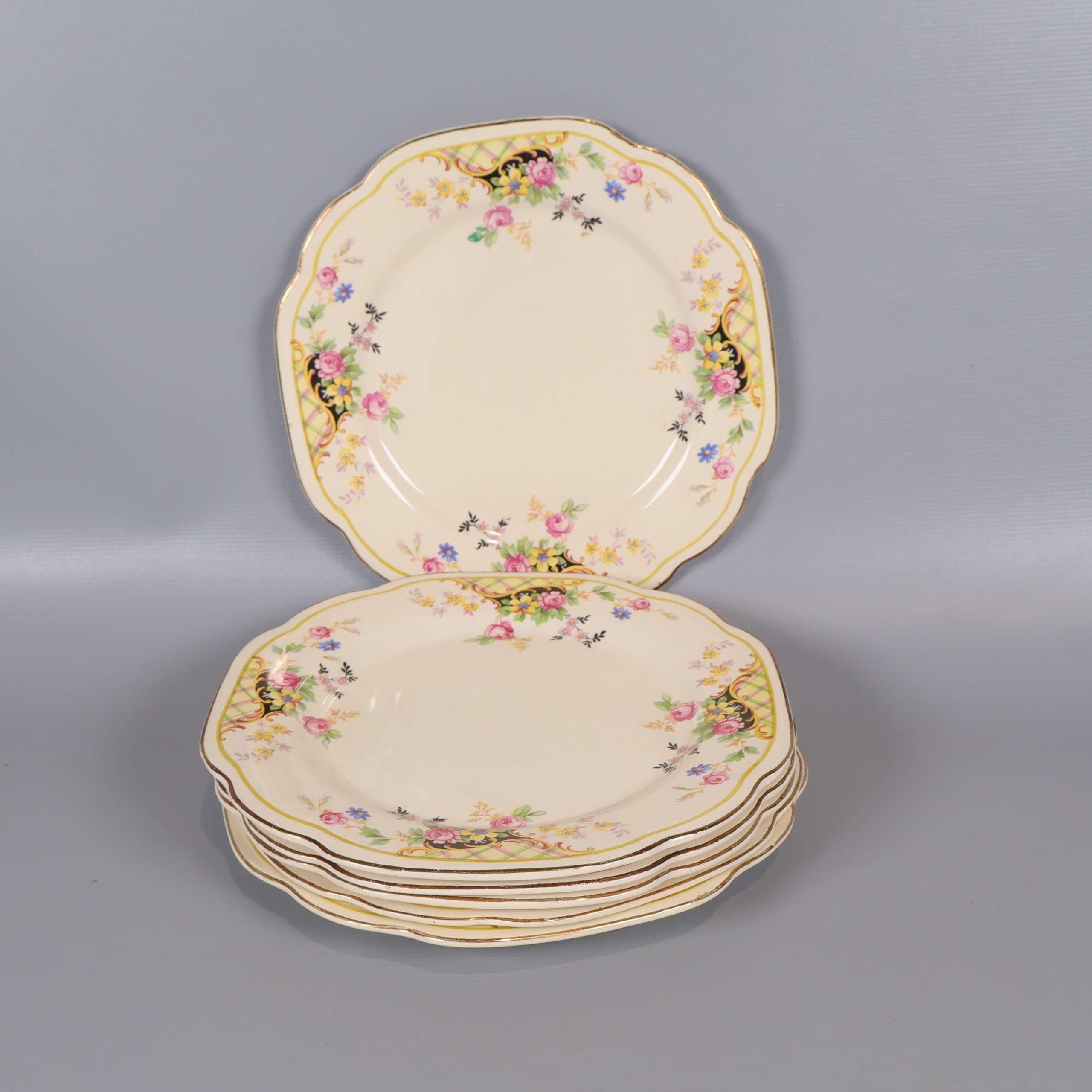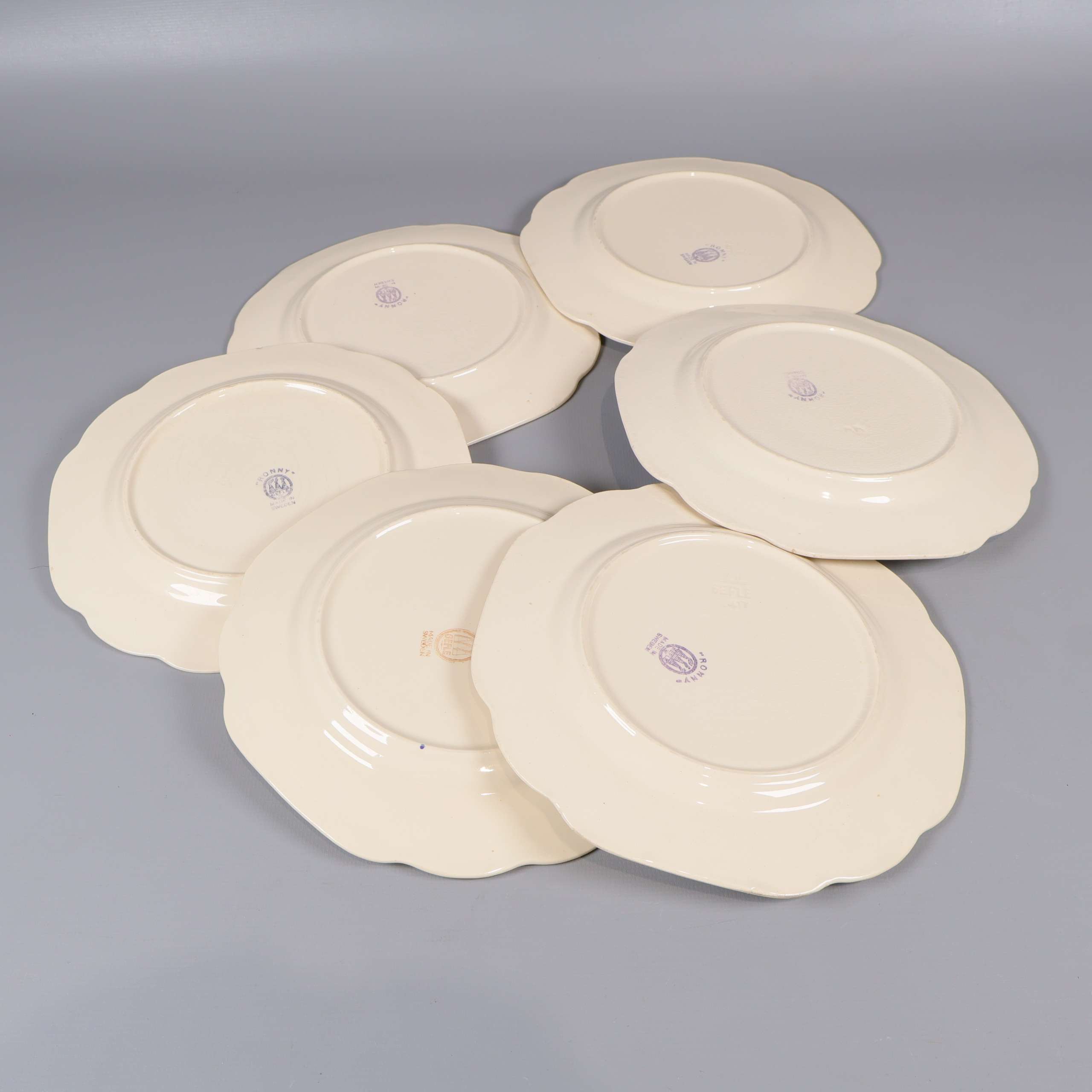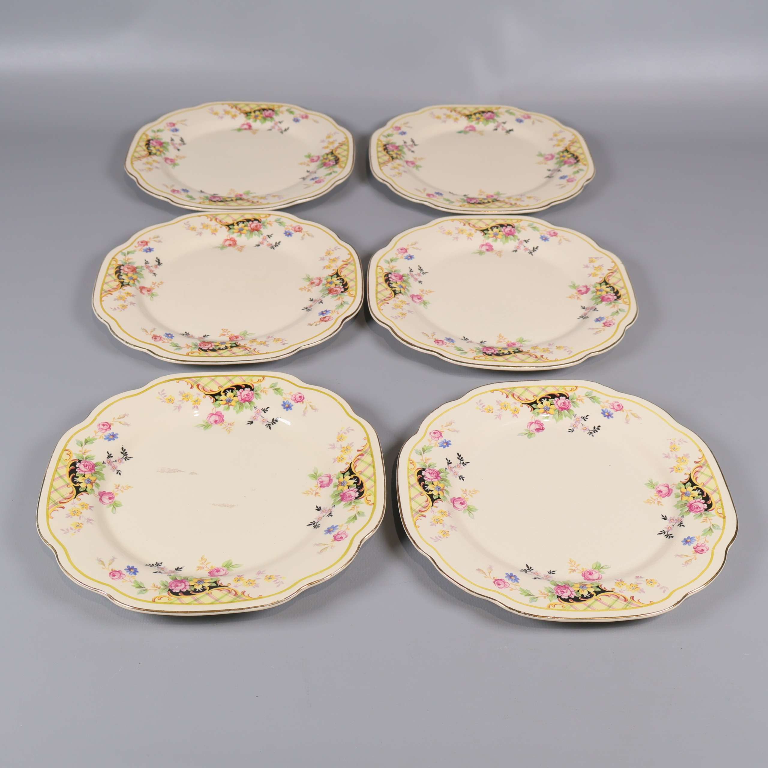 Sex assietter med mjukt vågiga kanter och klassiskt blommönster i olika färger. Tallrikarna har en cremevit ton med detaljer i gult, rosa och grönt som skapar en charmig och inbjudande känsla, perfekt för både vardag och fest.