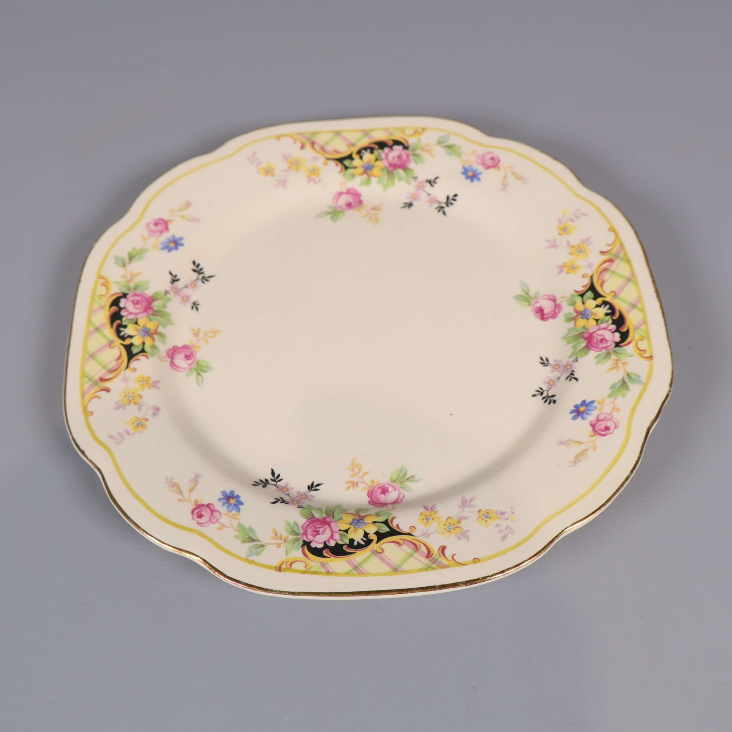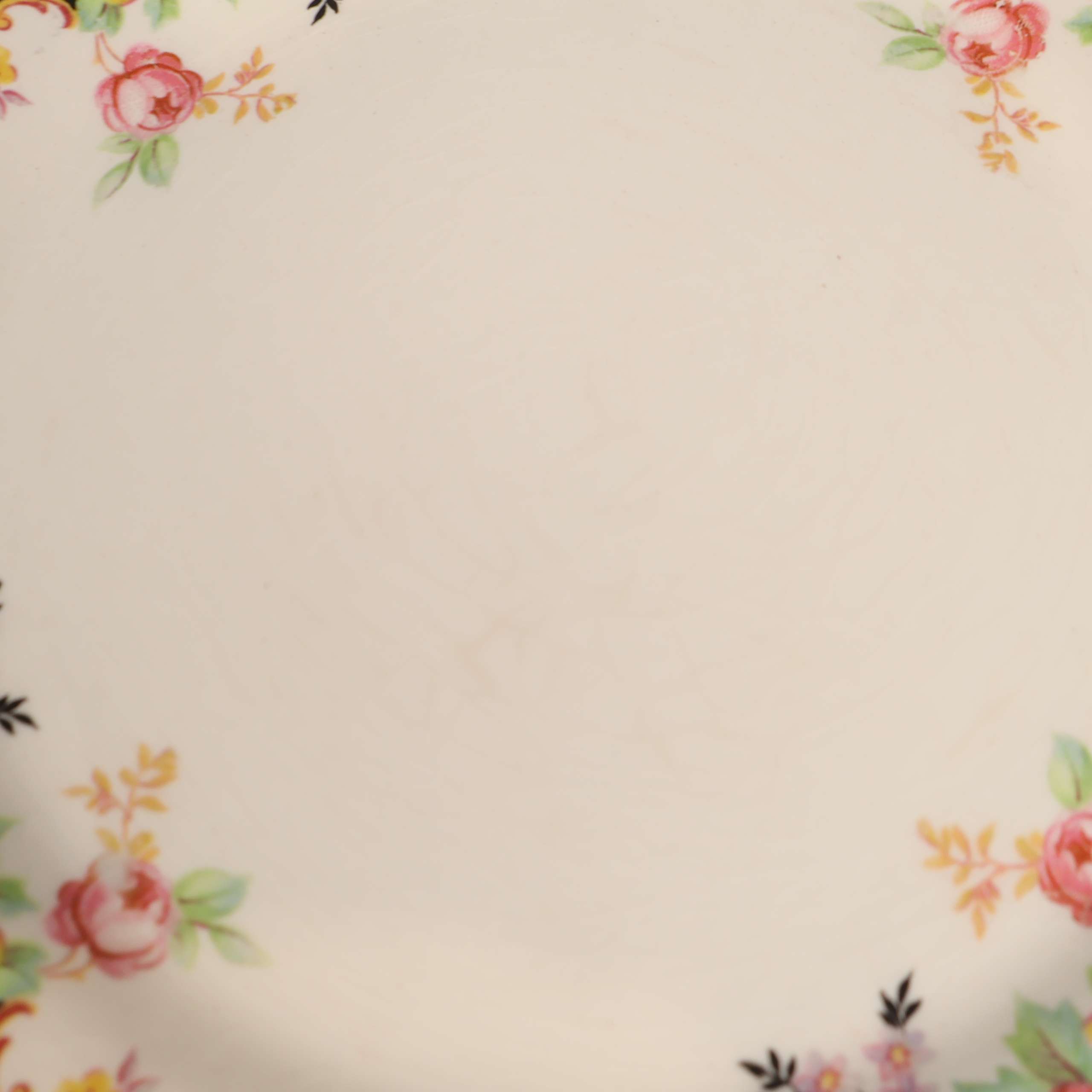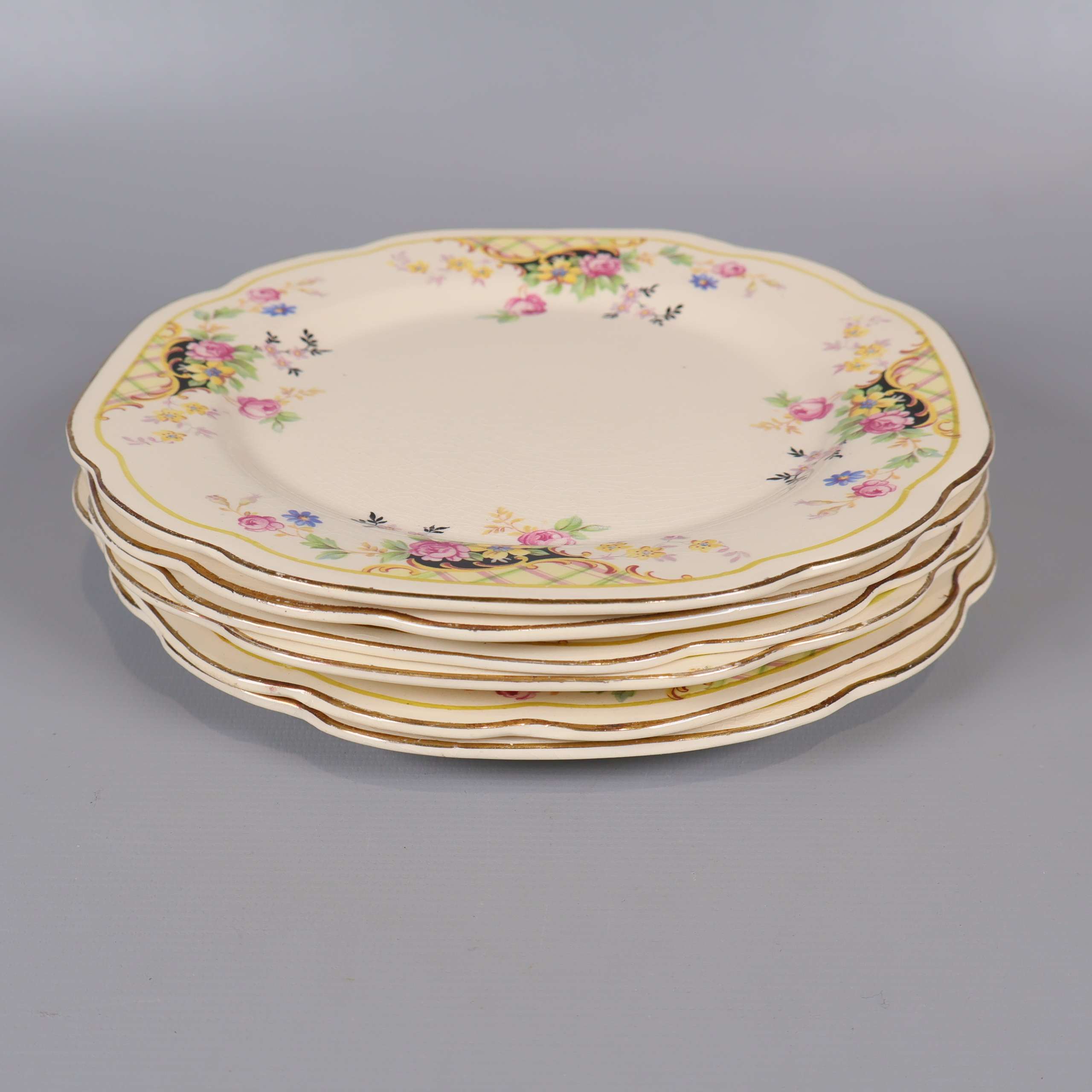 Sex assietter med mjukt vågiga kanter och klassiskt blommönster i olika färger. Tallrikarna har en cremevit ton med detaljer i gult, rosa och grönt som skapar en charmig och inbjudande känsla, perfekt för både vardag och fest.