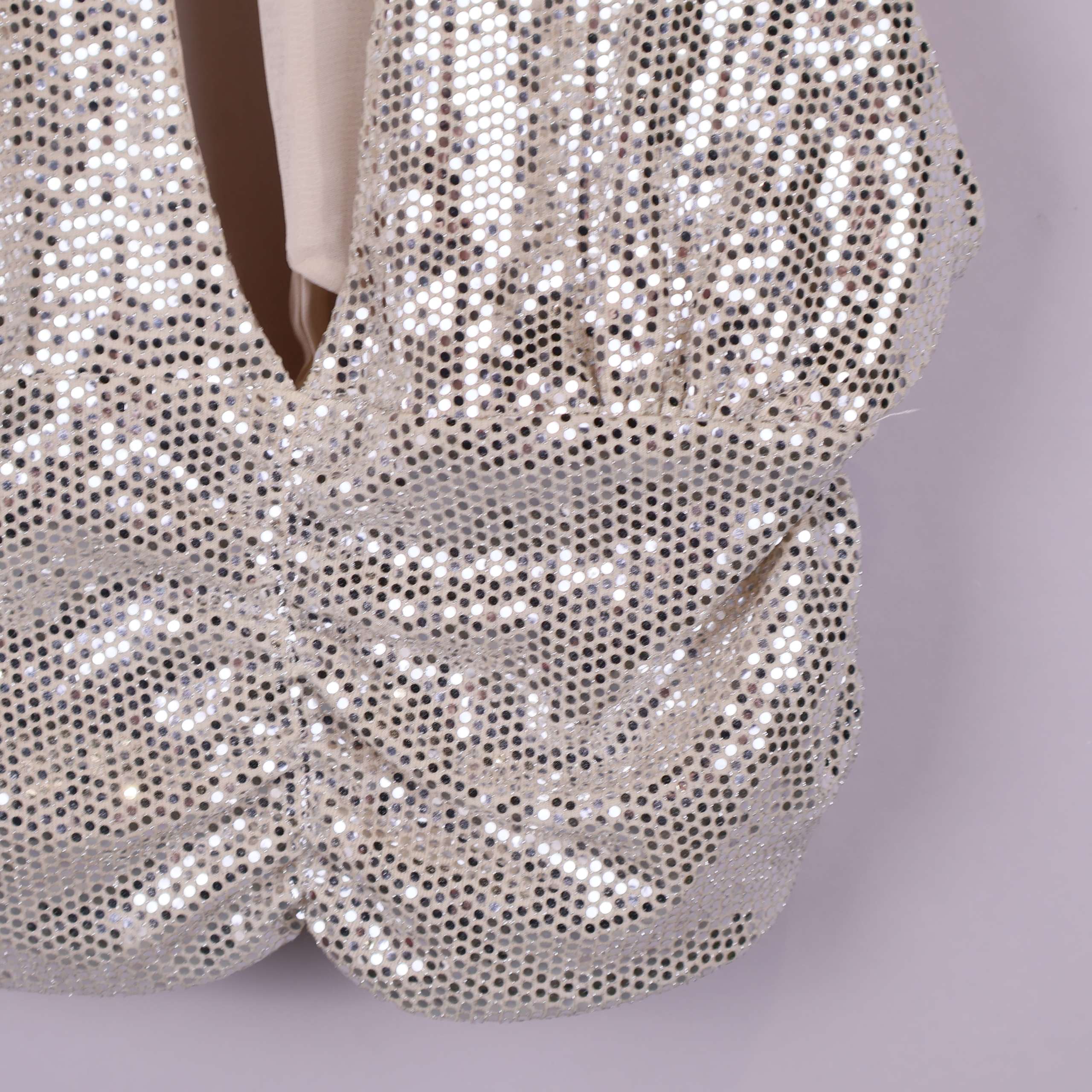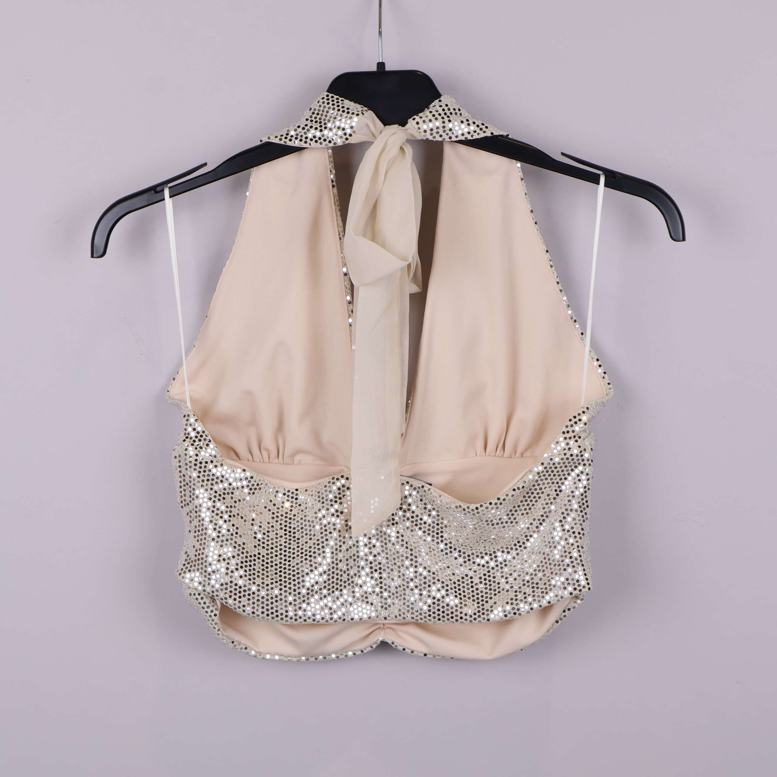 Festlig topp med halterneck och djup v-ringning, helt täckt av skimrande paljetter framtill och ett mjukt, beige tyg på baksidan. Knytning i nacken ger justerbar passform och en modern, lekfull look. Perfekt för dig som gillar en glittrig och iögonfallande stil.