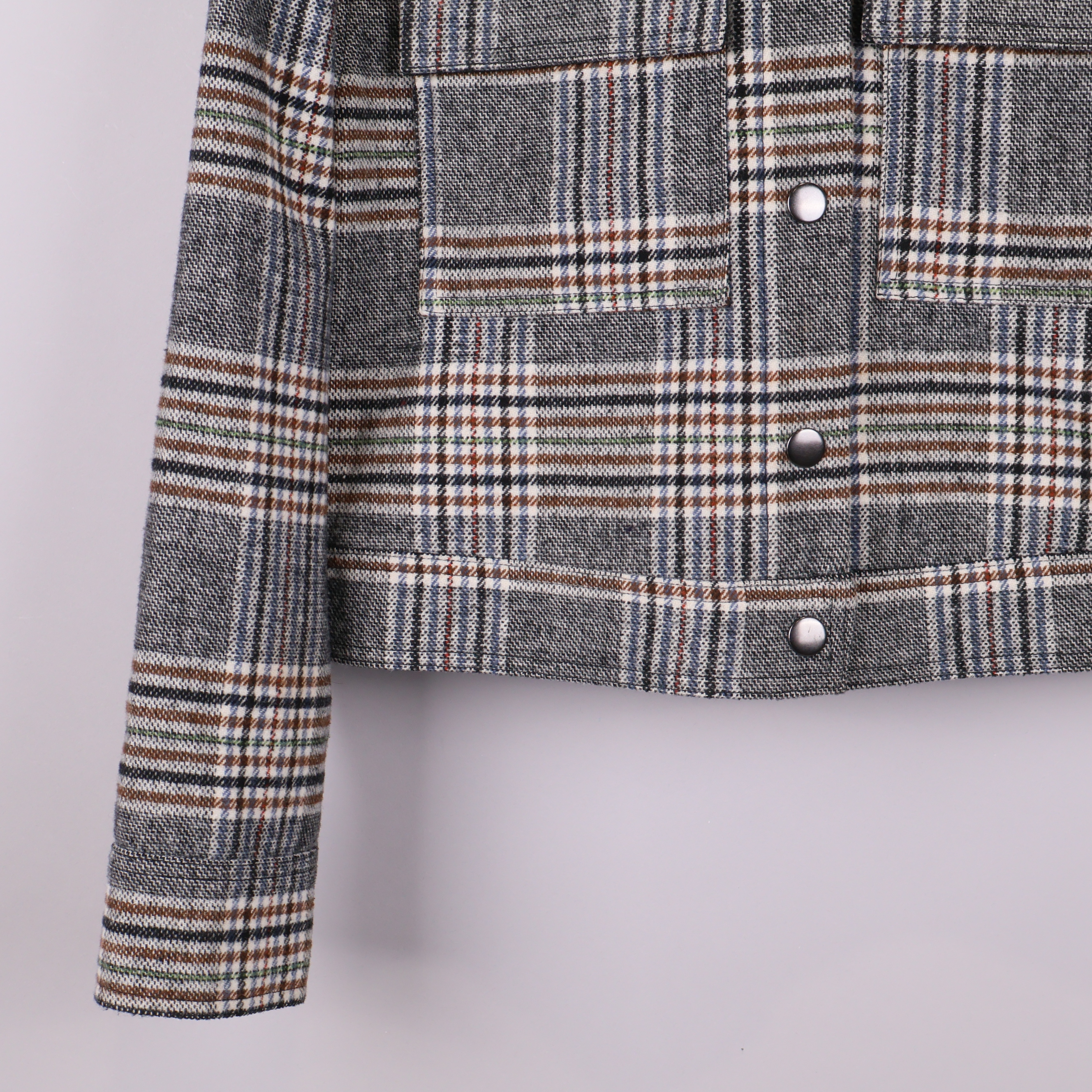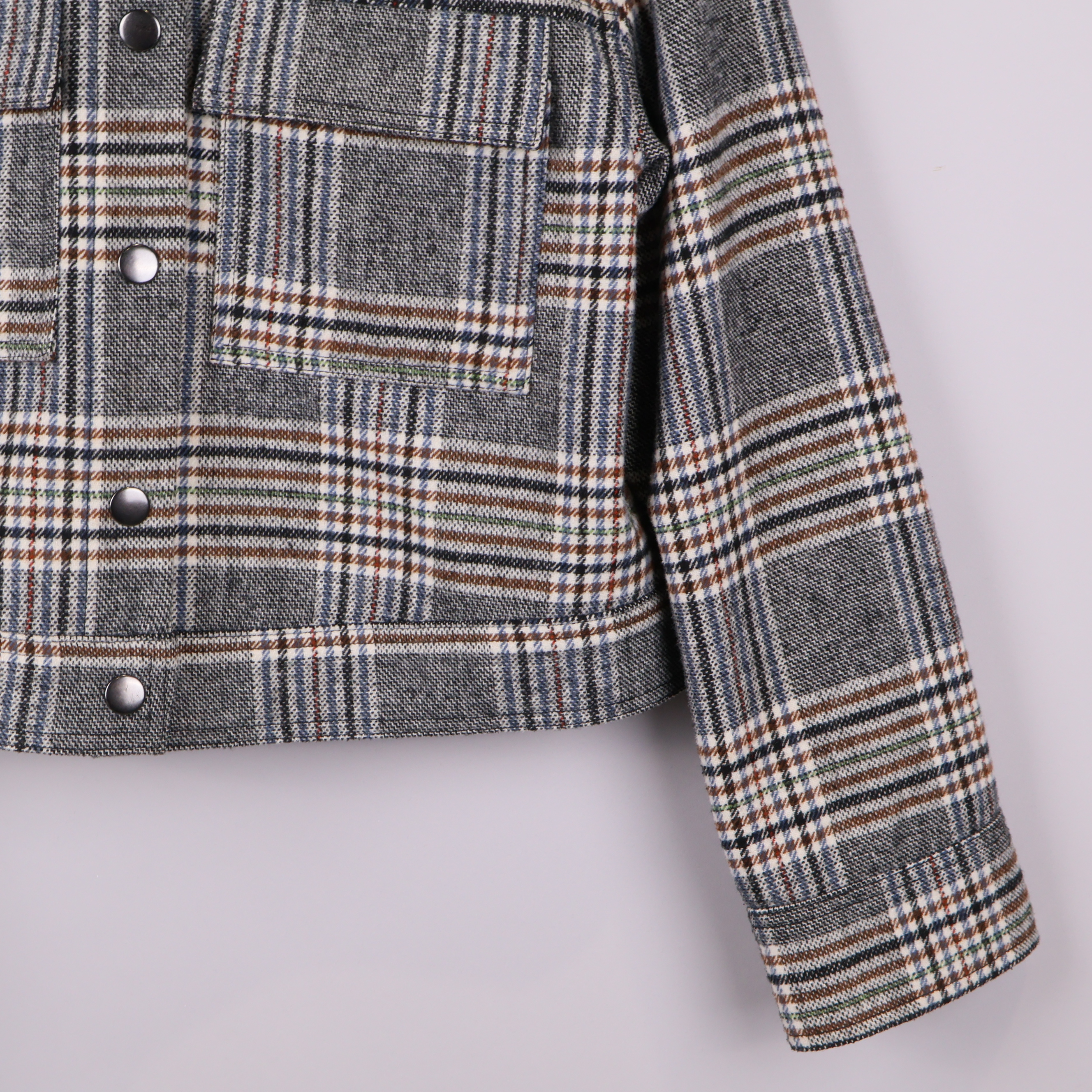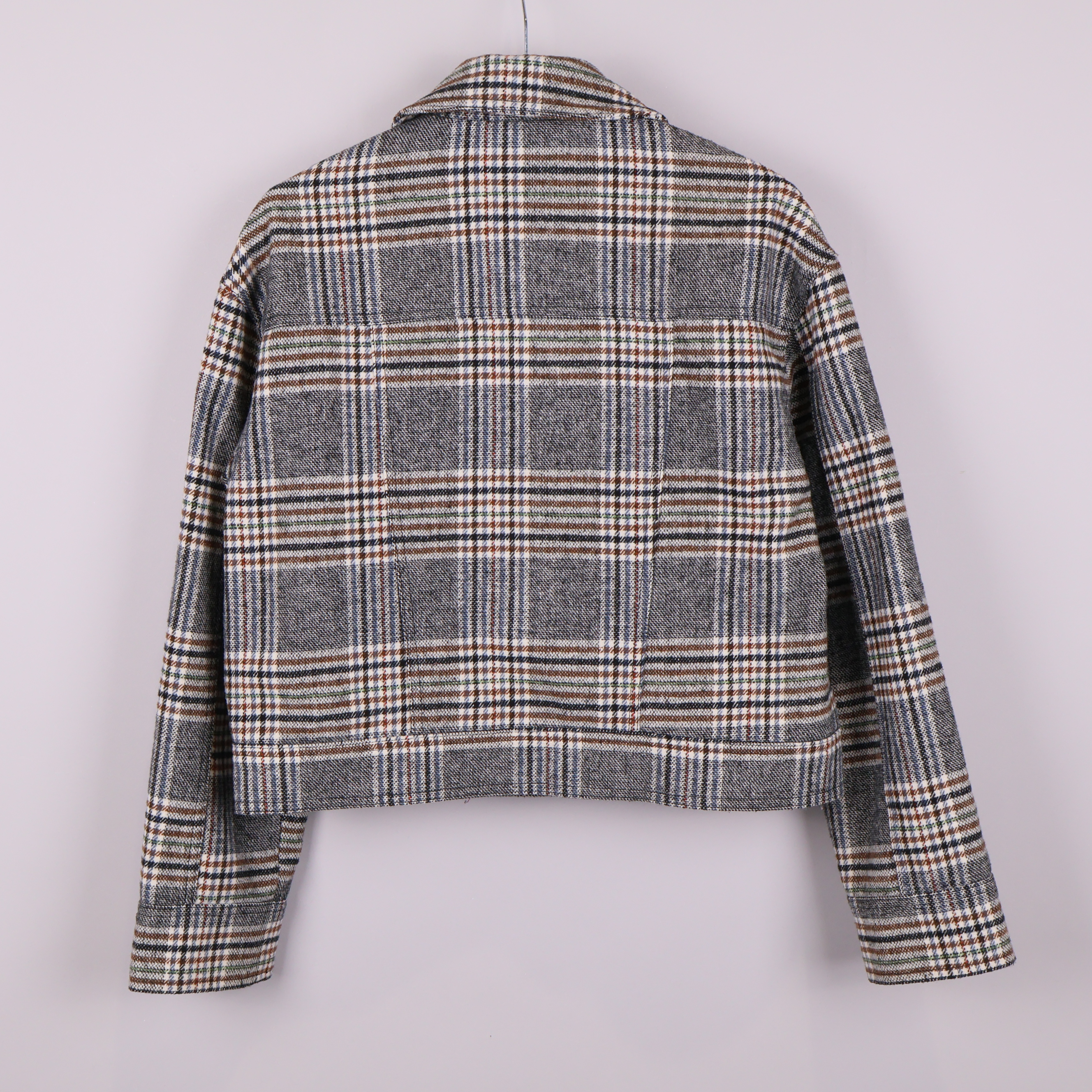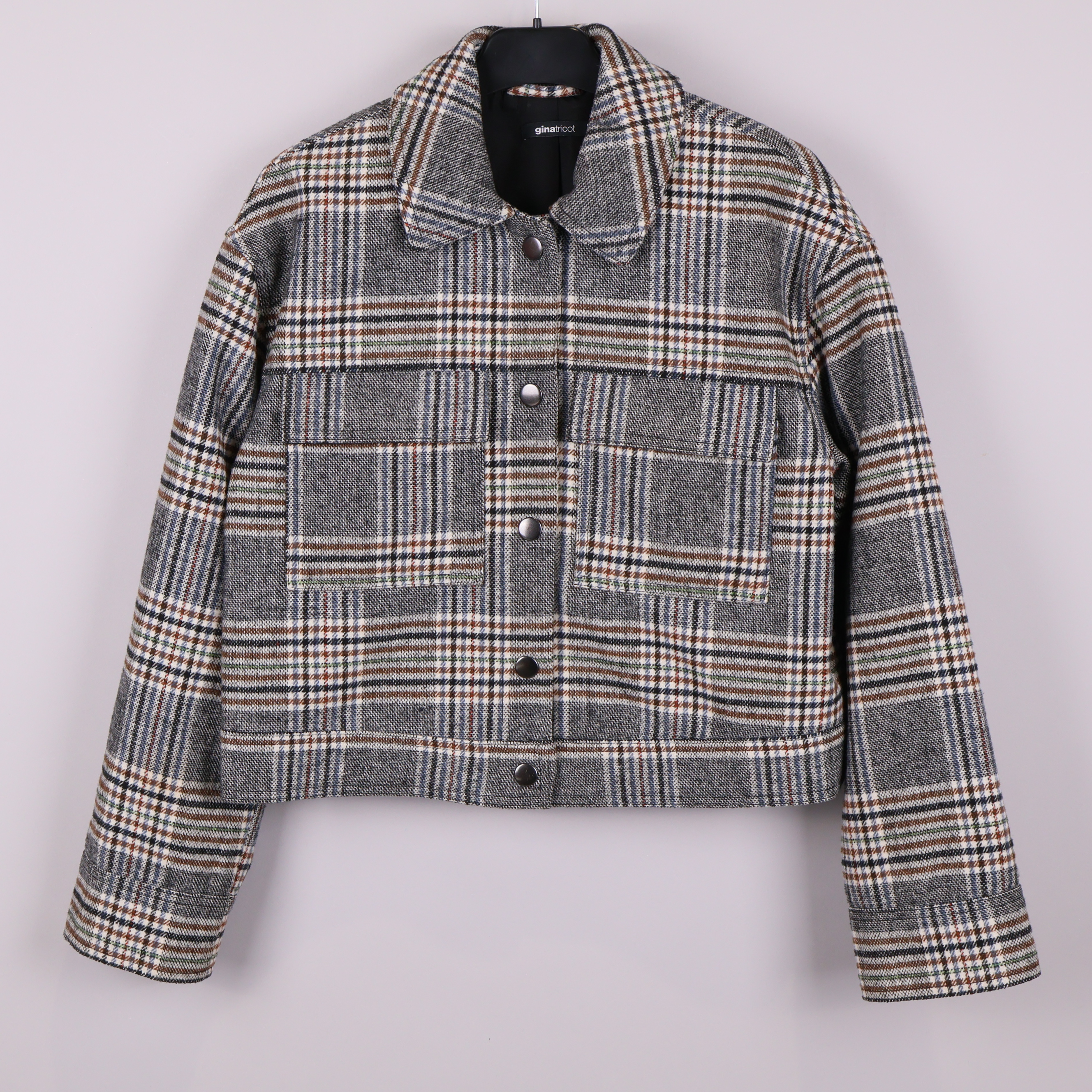 Modern jacka i rutigt mönster med markerad krage och tryckknappar framtill. Två stora framfickor ger både stil och funktion. Korta ärmar och avslappnad passform passar perfekt för en trendig vardagslook. Jackan har flera färgtoner i tyget för en levande känsla.