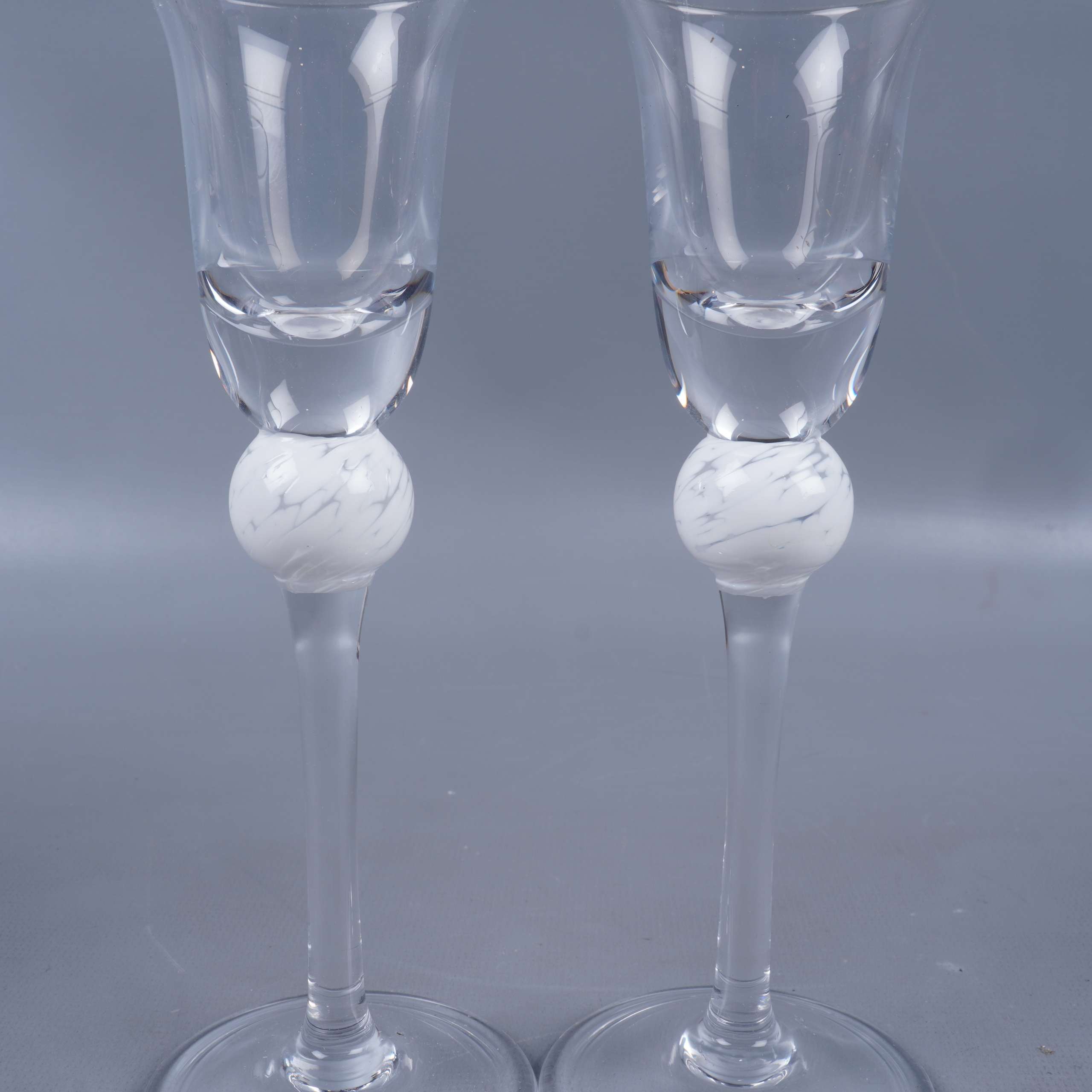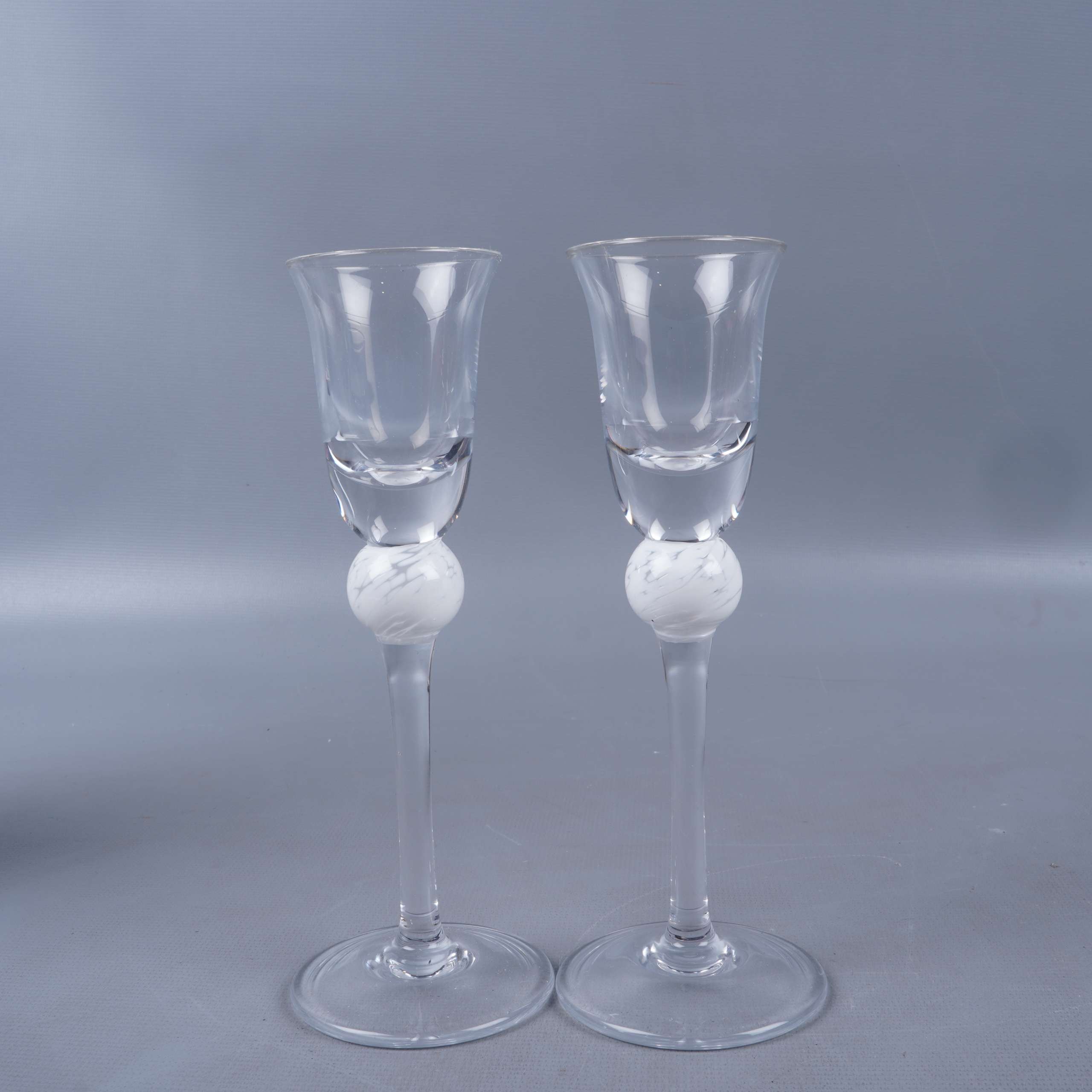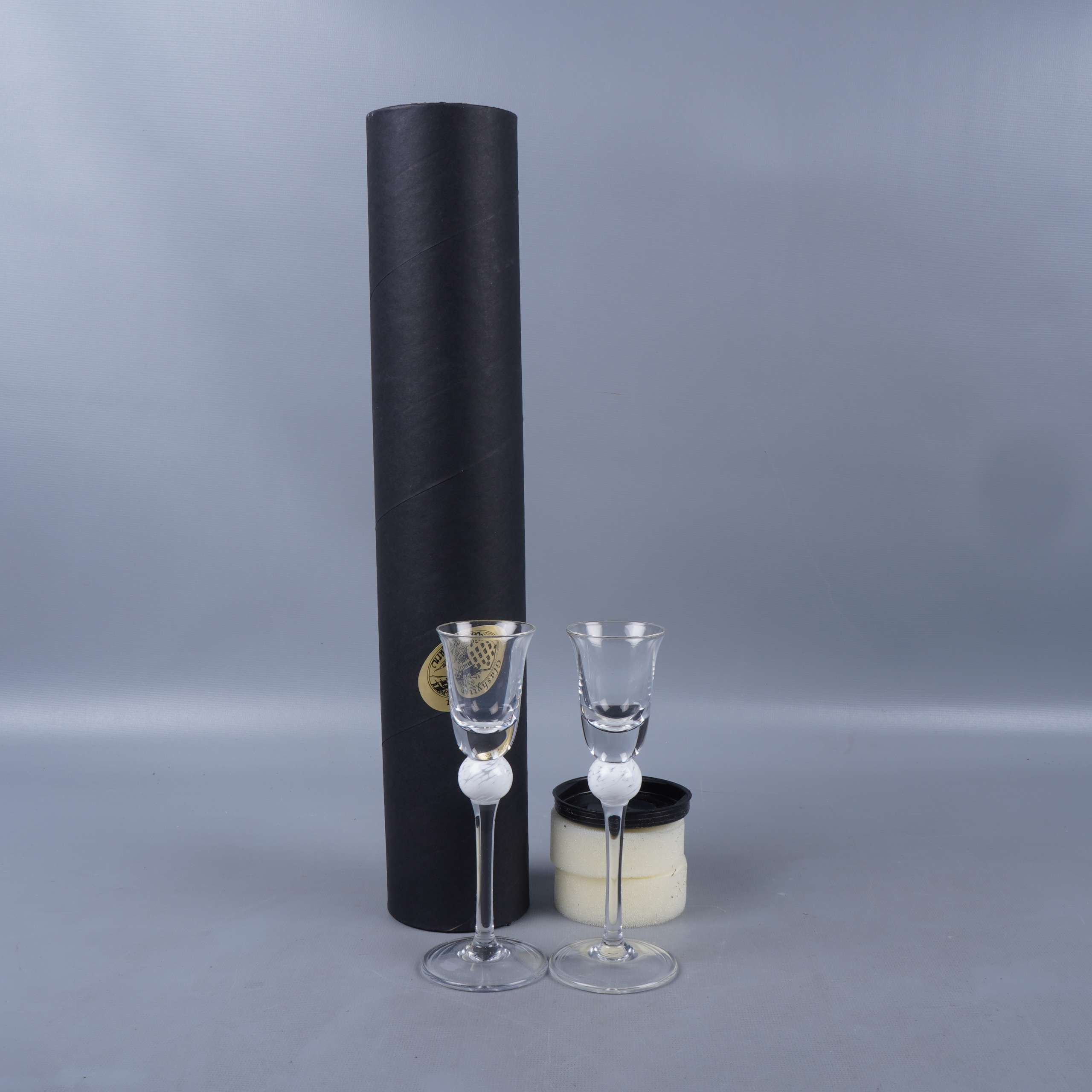 Två eleganta snapsglas med lång, smal fot och dekorativ vit kula, levereras i stilrent svart etui. Glaskroppen är klar och enkel, vilket ger ett modernt uttryck med en unik touch. Perfekta tillfällen för både vardag och fest.