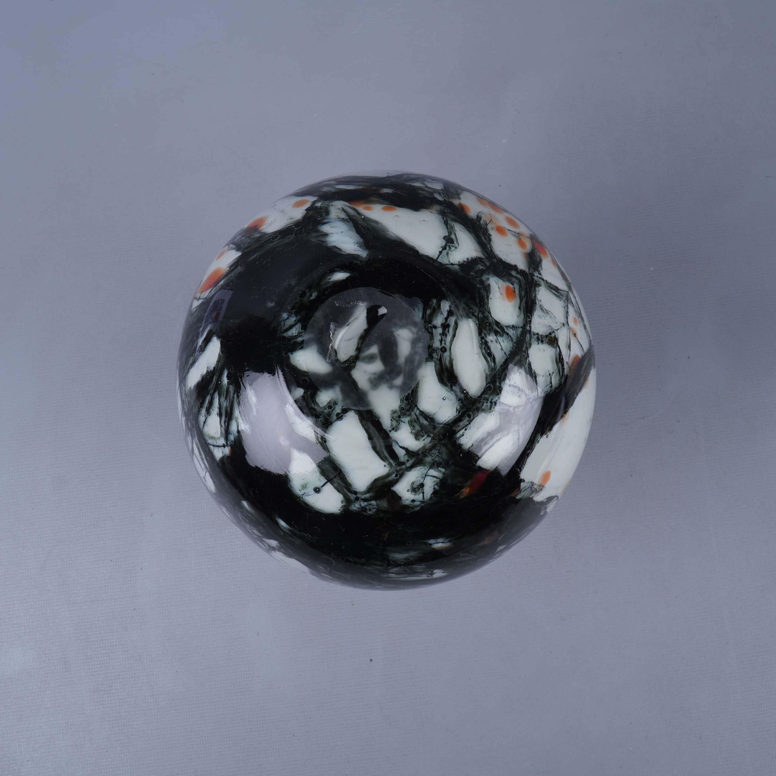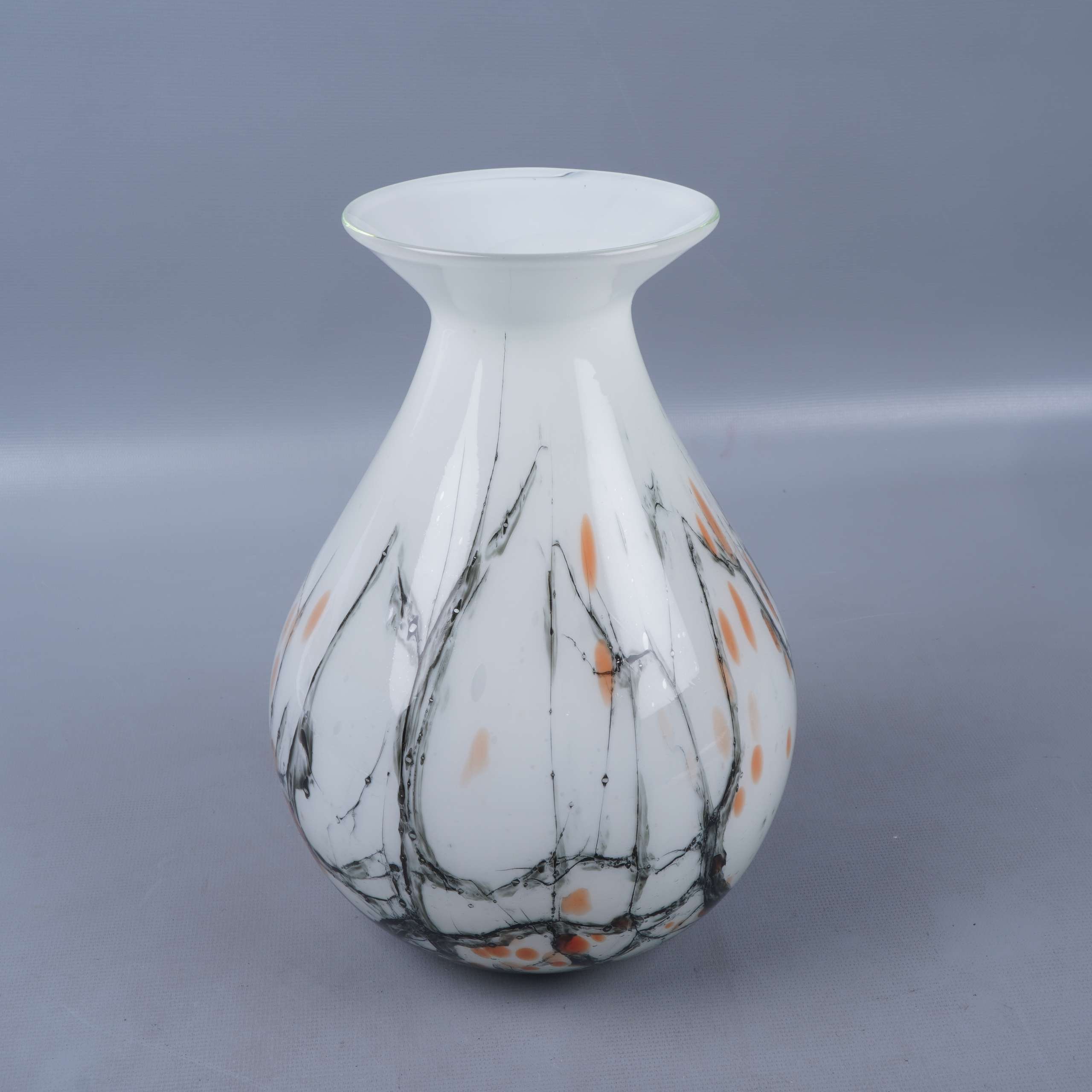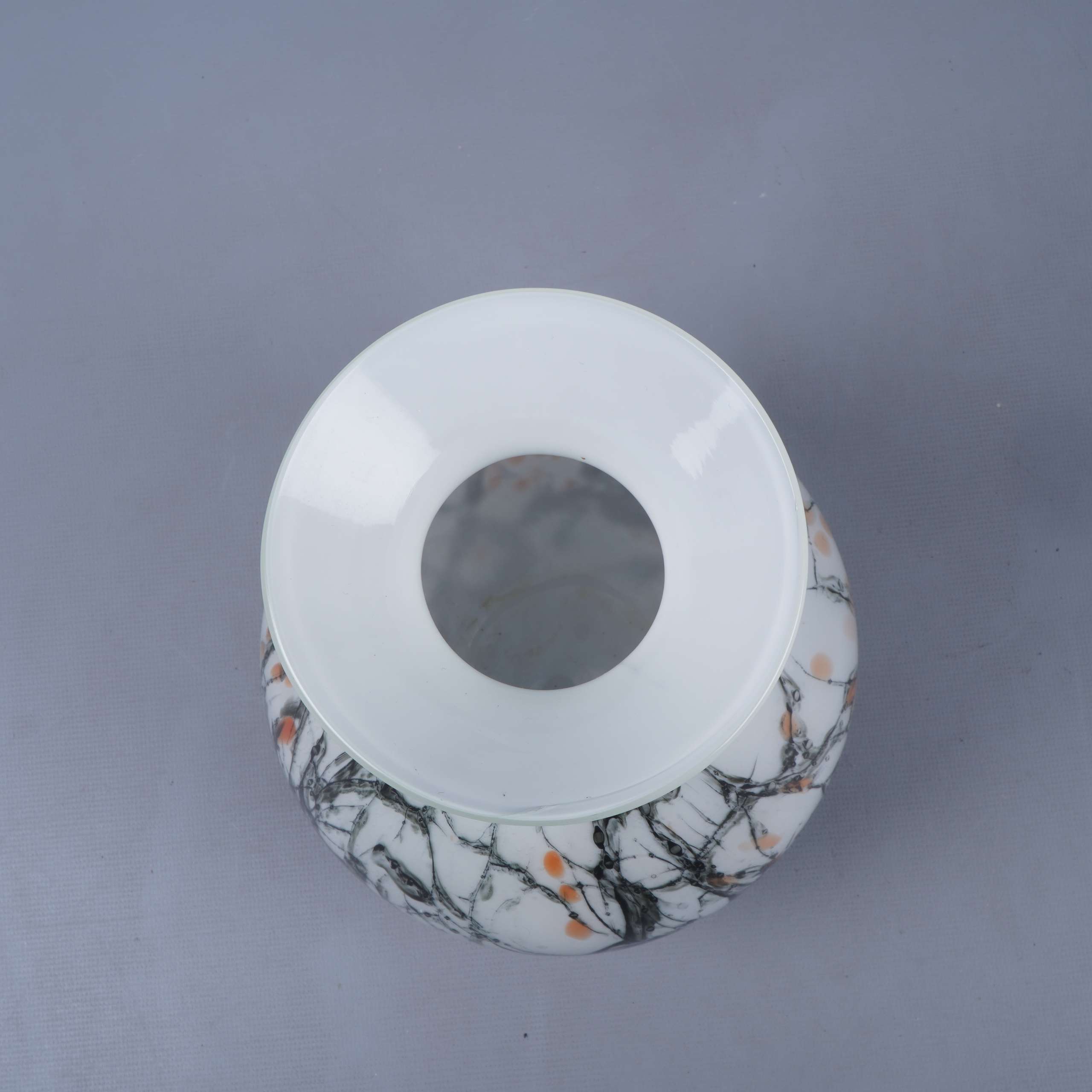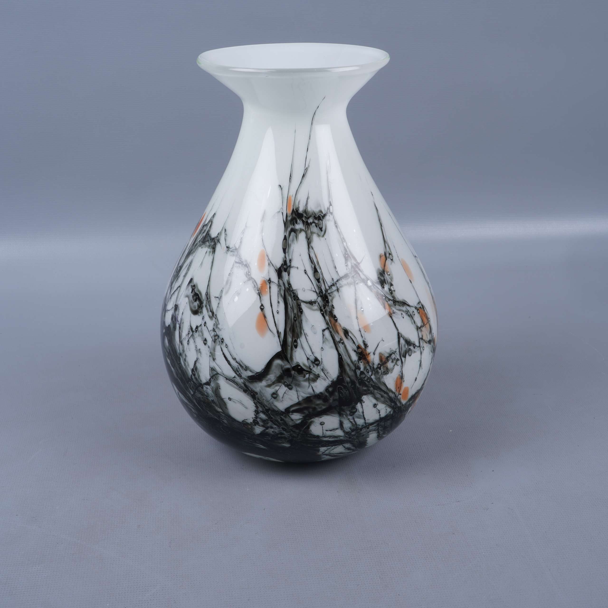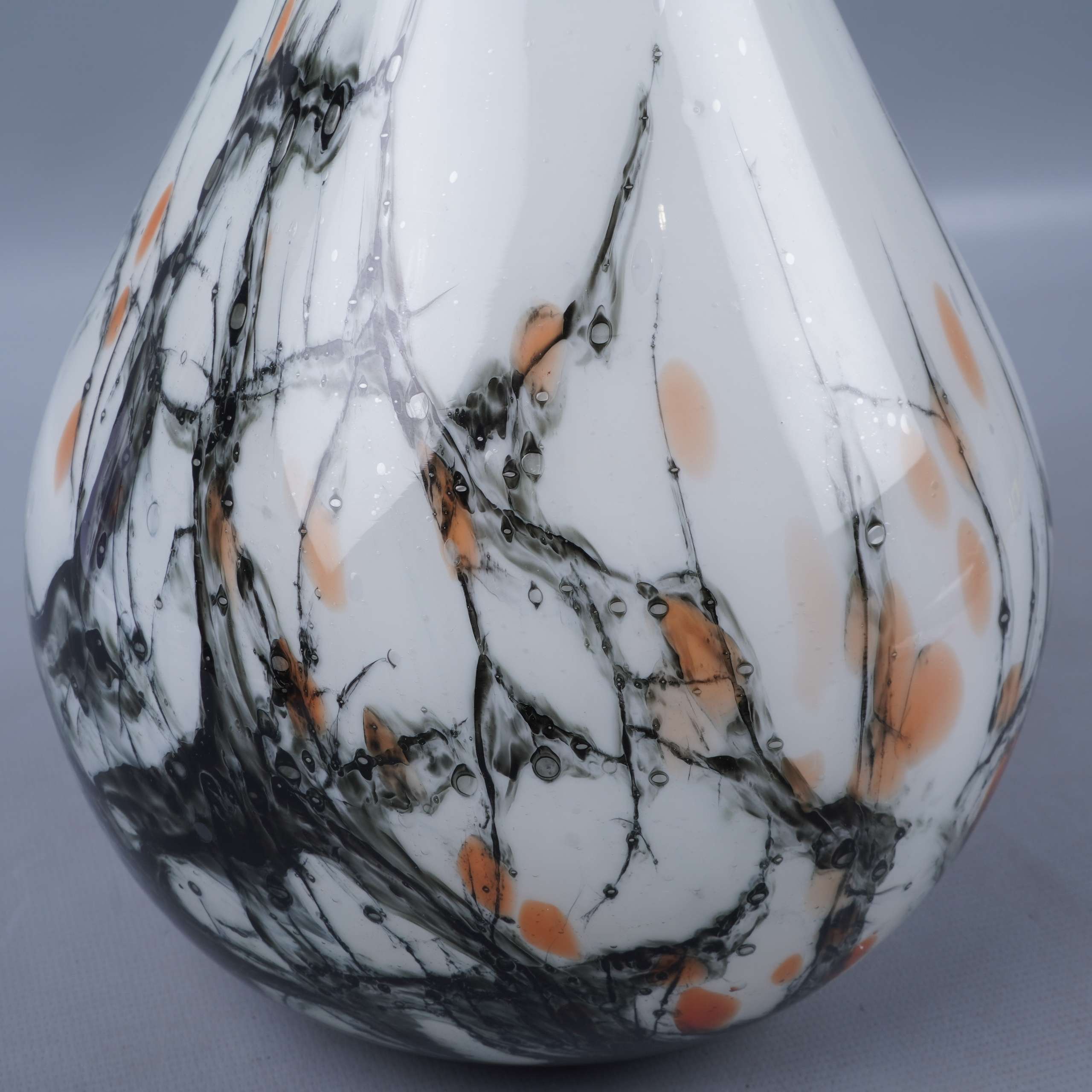 Stilren glasvas med vit bas och dekorativa marmorliknande svarta och orange detaljer som ger en unik look. Den rundade formen och breda öppningen gör att vasen passar snyggt för både blommor och som dekoration. Ger ett konstnärligt och modernt intryck.