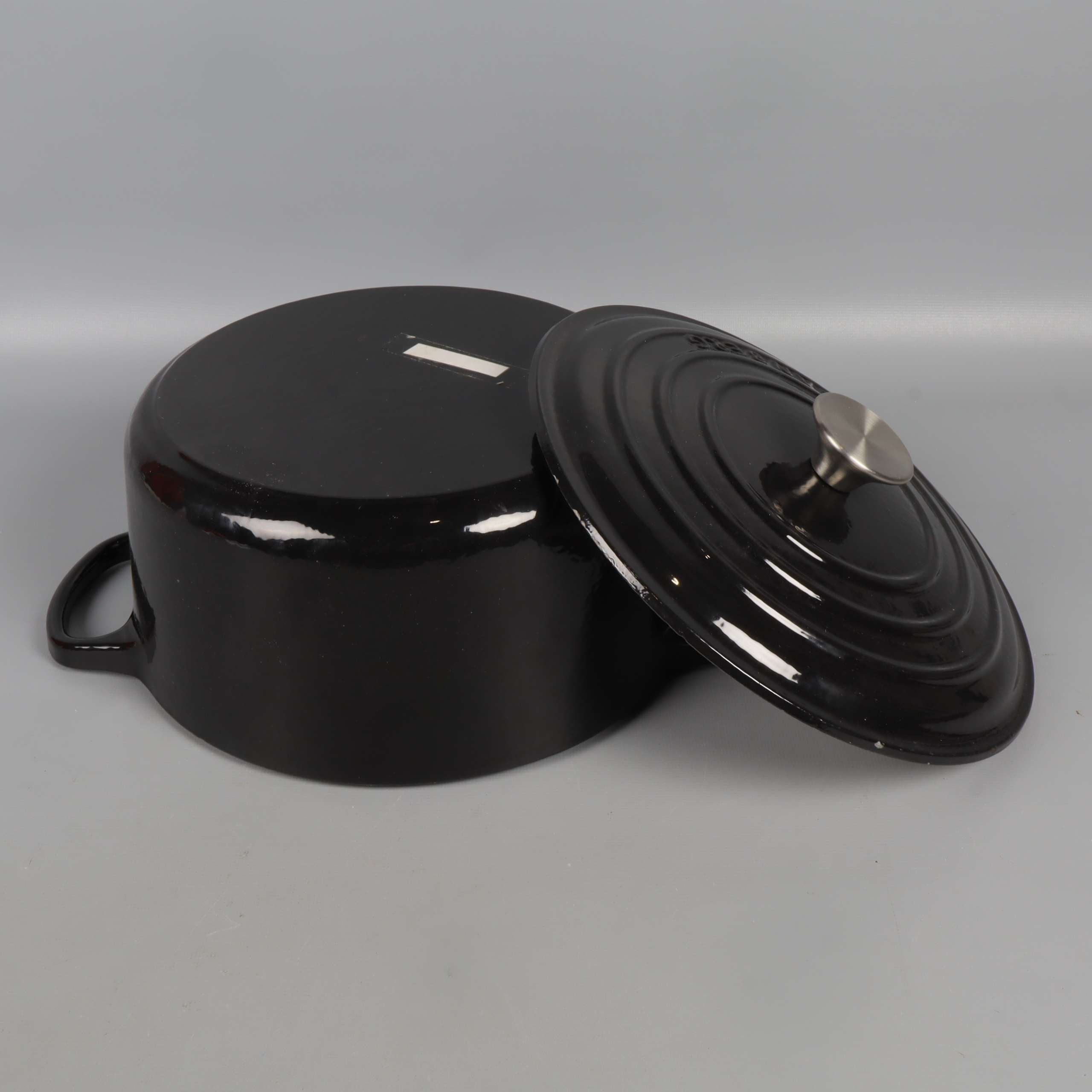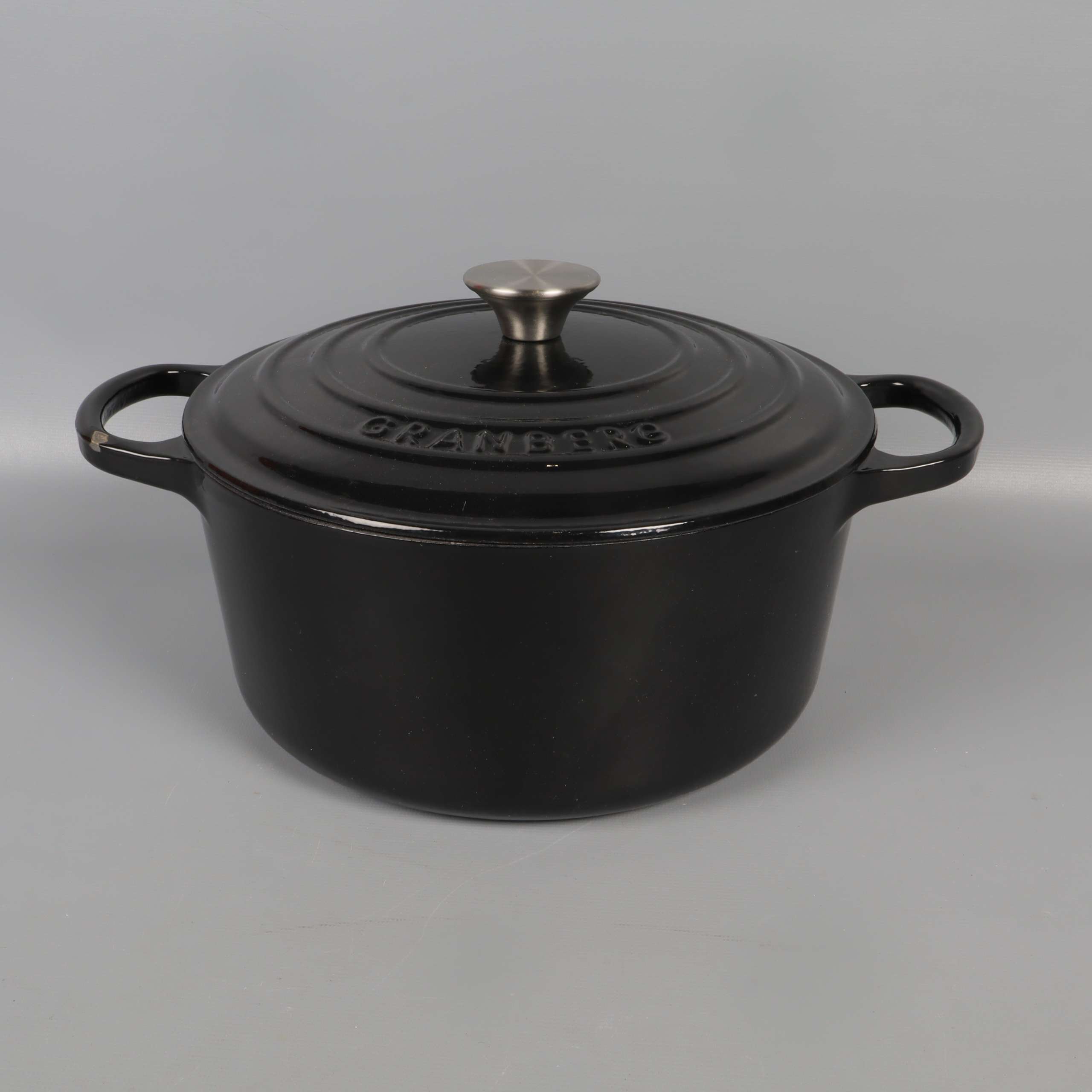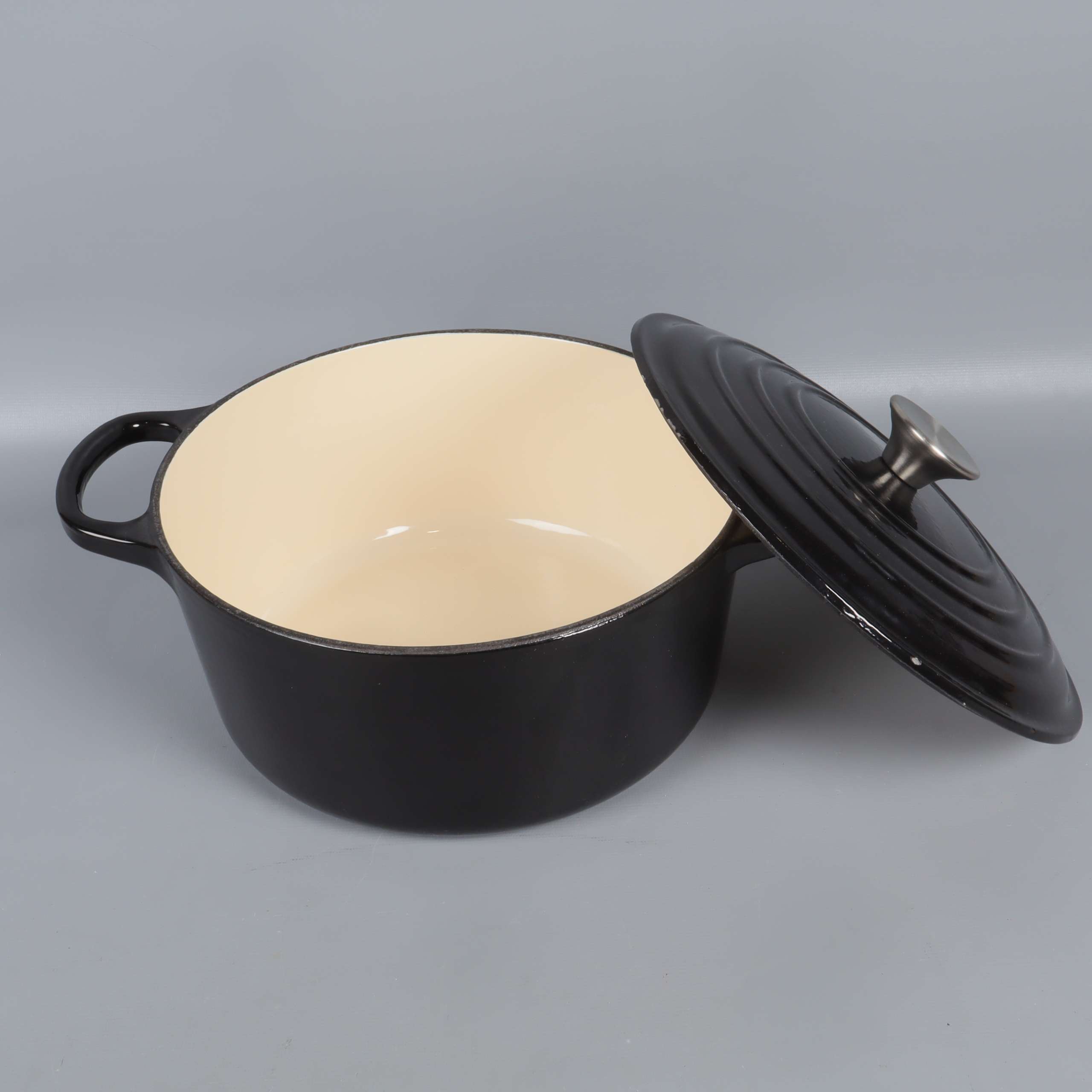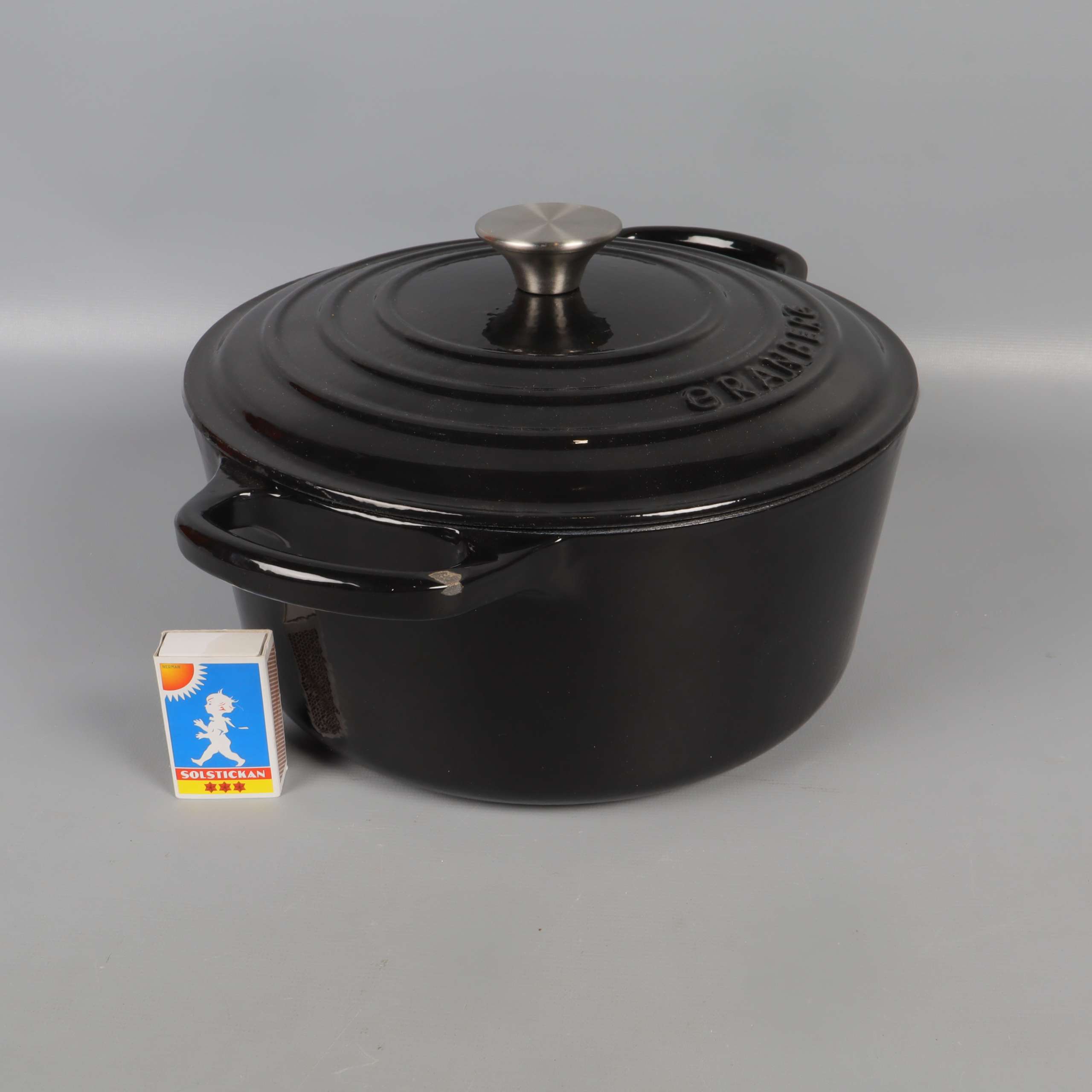 Rymlig gryta med klassisk design i svart gjutjärn och kontrasterande ljus insida. Locket har en elegant silverknopp och robusta handtag på sidorna gör grytan lätt att lyfta. Perfekt detalj för köket och ger en genuin känsla.