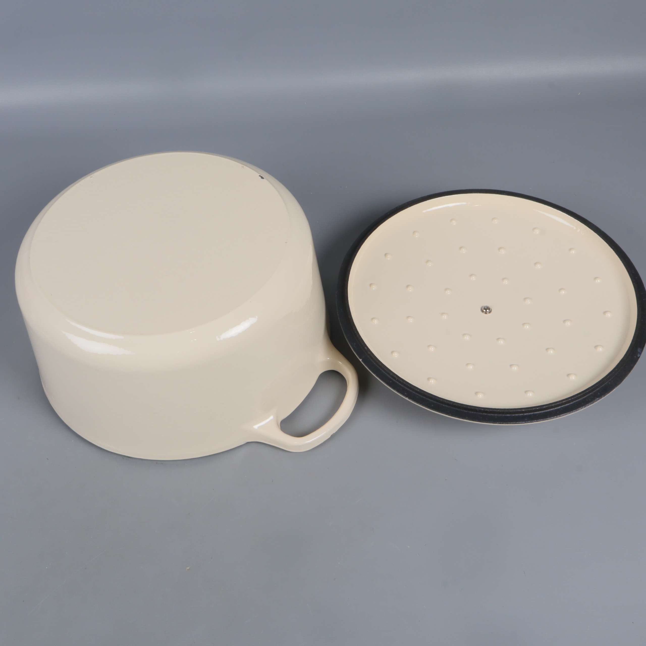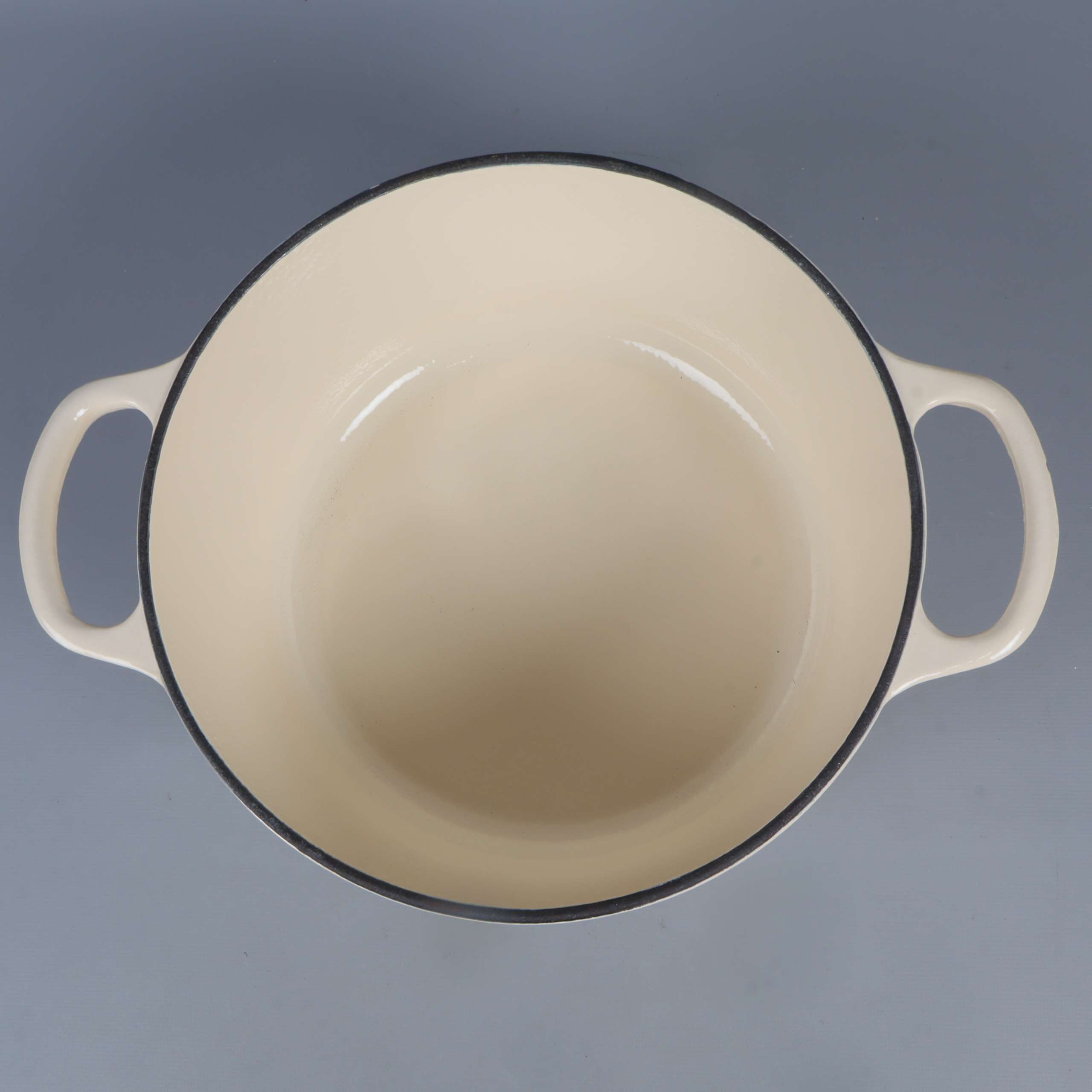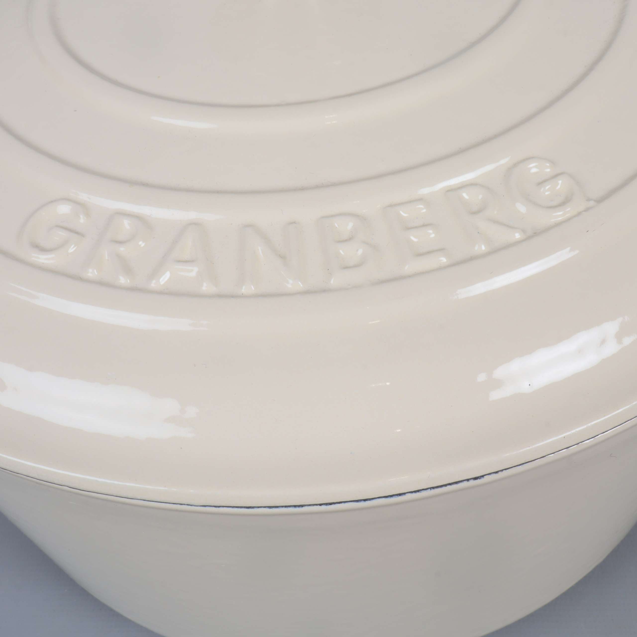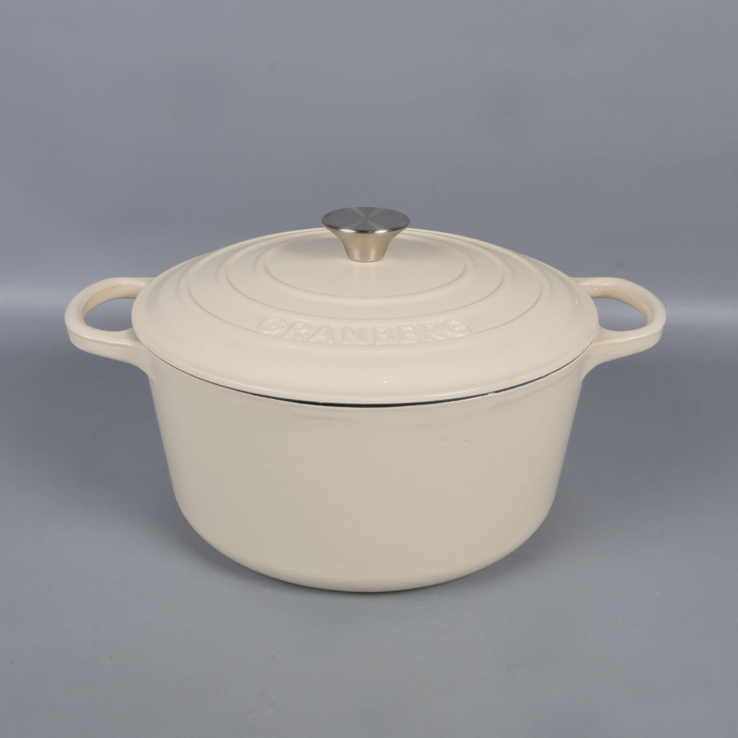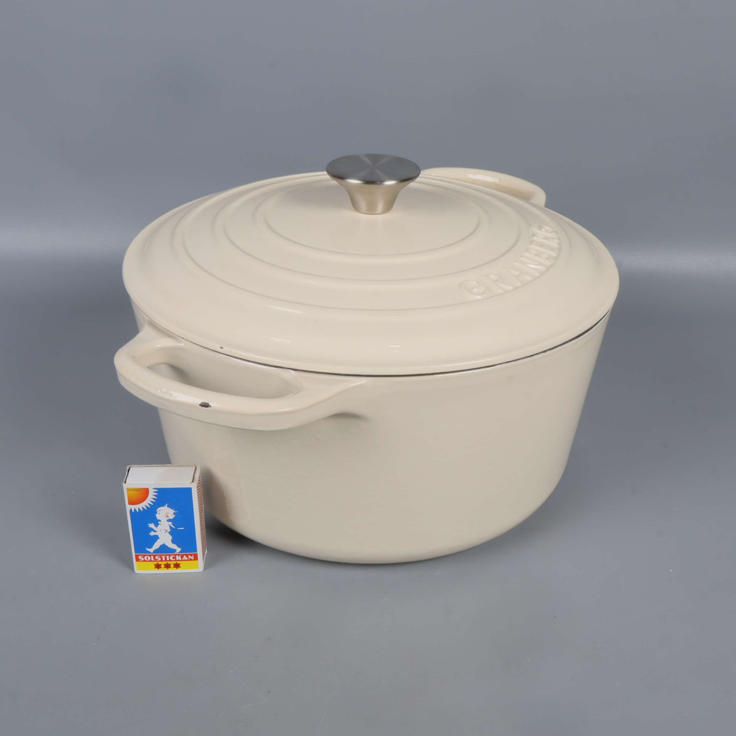 Klassisk gryta med lock i ljus nyans och stilren design. Sidor med rundade former, två rejäla handtag och diskret relief med märkesnamnet på locket. Matchar både moderna och retroinspirerade kök för en tidlös känsla.